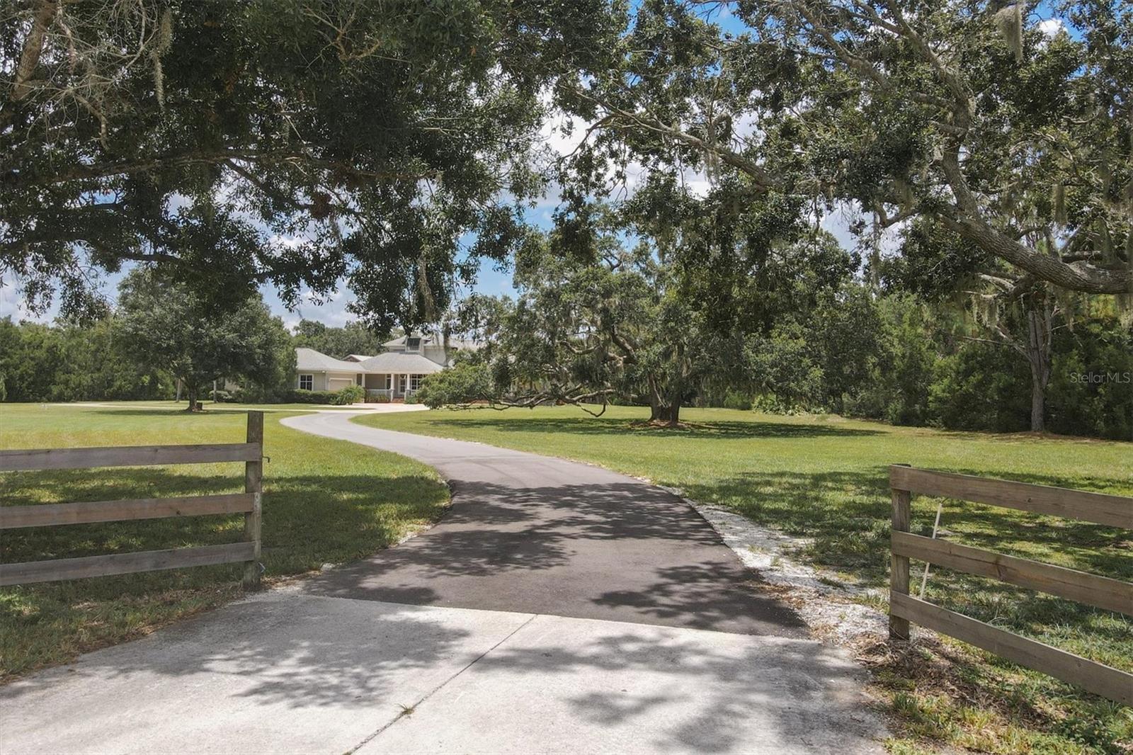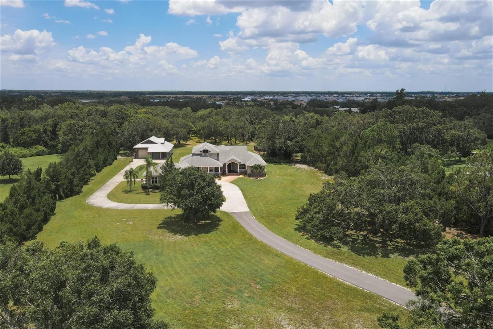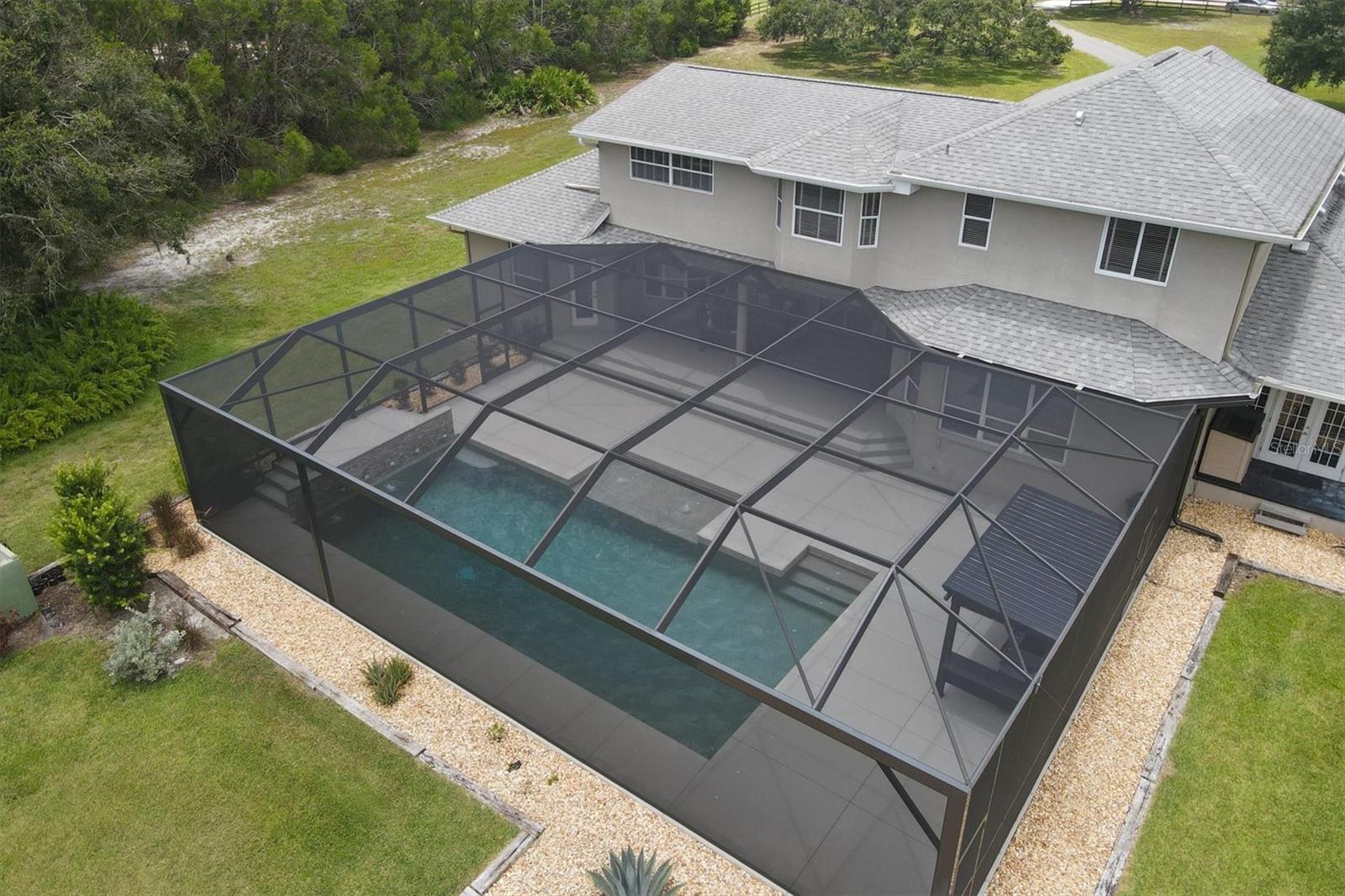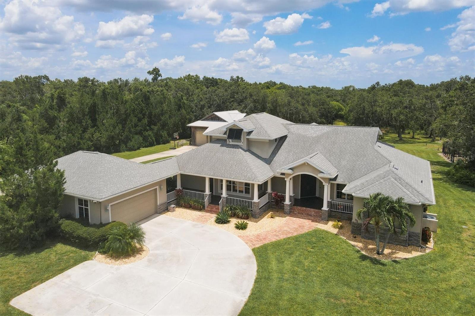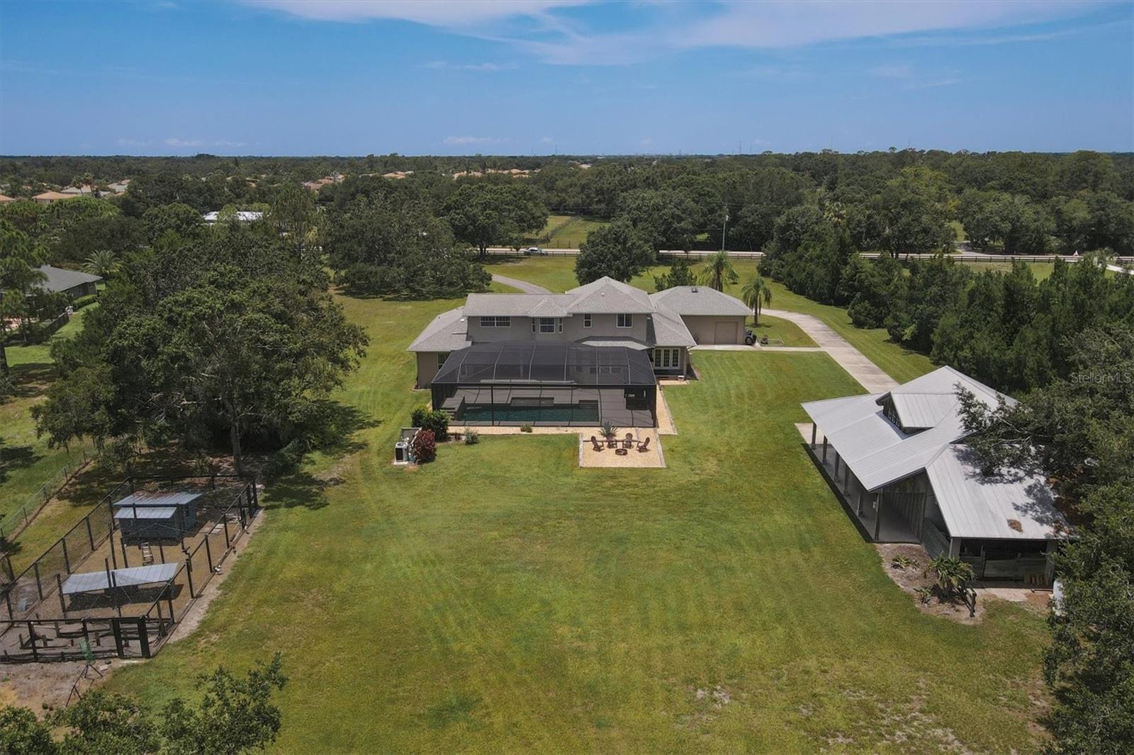 Private, Peaceful and Serene are three words to describe this picturesque Key West style home on 5.15 acres. A southern style porch greets you with an invitation to sit and stay a while. The home is very spacious and airy with 4 bedrooms, 3.5 baths and a flex room upstairs. The generous dining, kitchen and living area has beautiful views of the front and backyard pool bringing loads of light into the space. Moving outside to the expansive, covered patio, you'll see the large self cleaning, saltwater pool (2021) with panoramic screened enclosure (2022) perfect for entertaining on a warm day. Imagine yourself overlooking the pool while watching deer graze as you enjoy your morning coffee. Let's go inside...The owner's suite has easy access from the first floor through double doors and is roomy and comfortable. Plenty of storage and organization lines the walls of the main bedroom's walk in closet and continues to the en suite bath with built in drawers and shelving. The shower also has easy access and a separate soaker tub provides a private oasis to rest and relax. Coming from the owner's suite is an open living room area that's vaulted with a balcony and stair case to the second floor. Up the staircase you will find three bedrooms, the first with en suite bath updated in 2023 and an inviting window seat for guests to read and enjoy. Across the hall is another separate full bath also remodeled in 2022. Next door to the full bath, the second bedroom has a unique, elevated, built in desk area overlooking the front of the house and the third adjacent bedroom has a lovely view of the backyard and built in shelving. Walking down the hall and across the balcony you'll find a fourth room that could be a fifth bedroom, media room for movie nights, office or den. Mature trees adorn the property giving a quiet effect leading to a secluded space at the back of the property over a dry creek bed that flows during rainy season. The 31' x 40' block outbuilding is perfect to store your RV. Work benches and a half bath make the outbuilding a proper man cave! Available on separate contract or included for the right price is a Mahindra 2638 Tractor with approx. 200 hours, grapple and backhoe, a Gator all terrain vehicle with dump feature and John Deere zero turn mower to manage the property. Upstairs you'll find an air conditioned room adding extra usable square footage for your own private gym or tack room as this property is zoned for horses! Potential abounds as the all block outbuilding could also be made into a separate dwelling with modification. A 12' x 31' lean to at the back of the outbuilding is paved for easy animal care or storage. So much potential resides here and the heavy lifting has been done for you in the home with a newer roof (2018), 2 AC units with MERV 13 & UV lights (2020), landscaping (2021), new water heater (2023), new well pump (2023) Culligan water filtration system (2021), Rain Bird irrigation system (2023), asphalt driveway (2023), and new split AC unit for outbuilding (2022) . Ten minutes drive to State Road 75 and close to parks for recreation, exercise and fun this location is prime just 10 minutes drive to shopping and dining at the trendy University Town Center area and to Downtown Sarasota its a short 15 minute drive. With this property as your new home, you can have country privacy with a side of city!