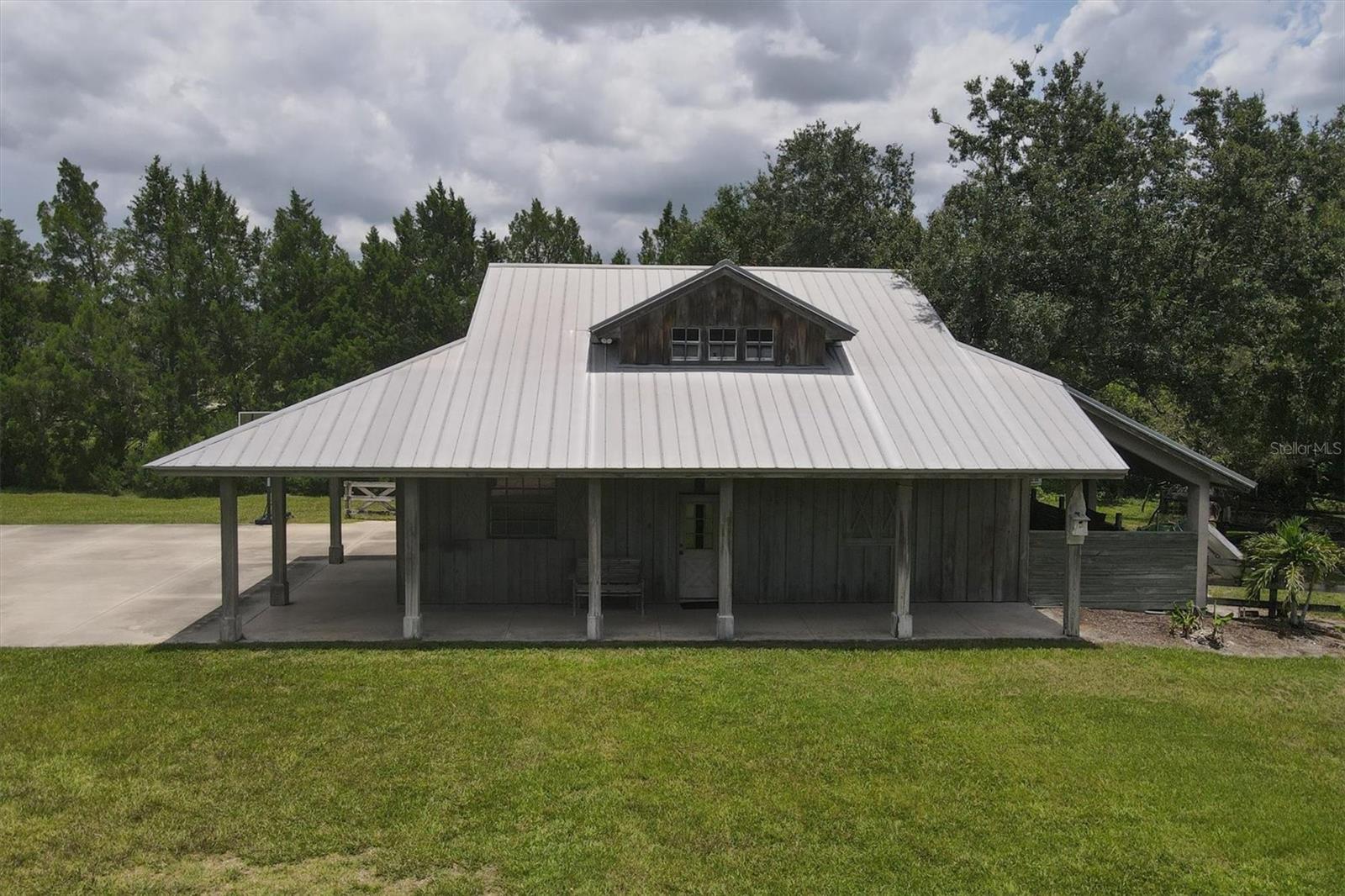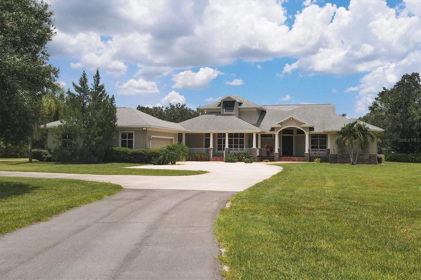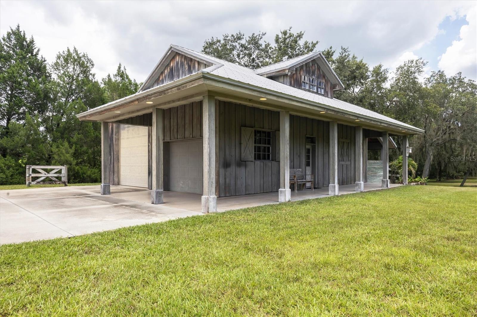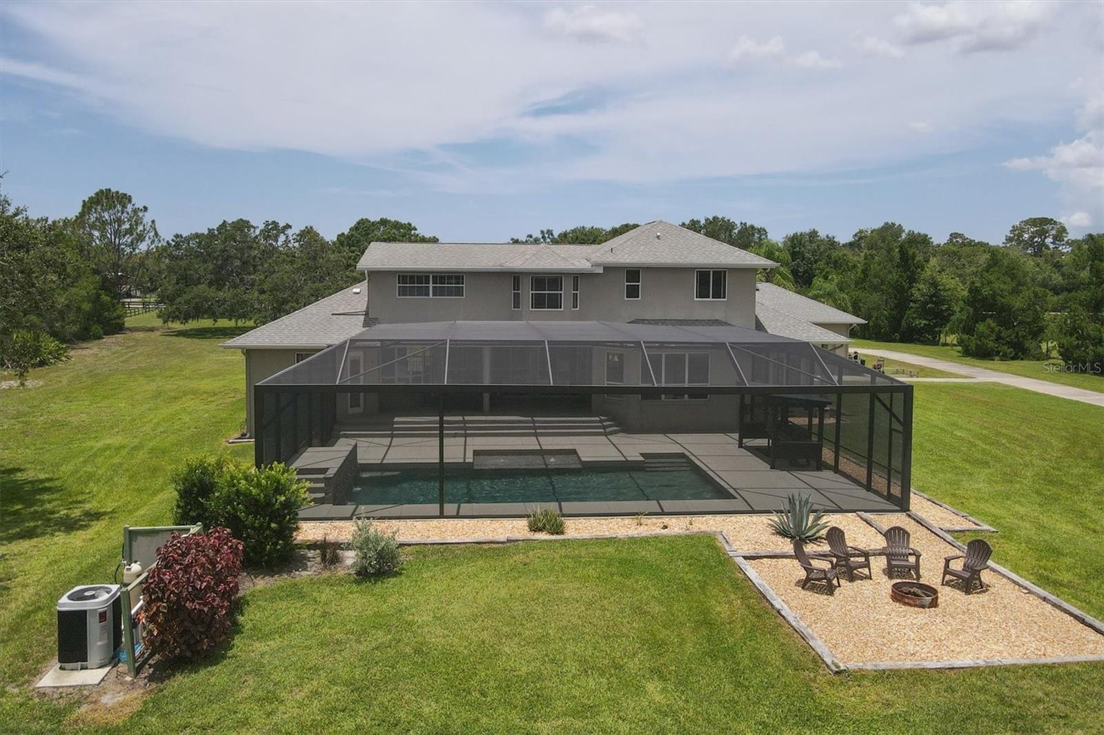 Private, Peaceful and Serene are three words to describe this picturesque Key West style home on 5.15 acres. A southern style porch greets you with an invitation to sit and stay a while. The home is very spacious and airy with 4 bedrooms, 3.5 baths and a flex room upstairs. The generous dining, kitchen and living area has beautiful views of the front and backyard pool bringing loads of light into the space. Moving outside to the expansive, covered patio, you'll see the large self cleaning, saltwater pool (2021) with panoramic screened enclosure (2022) perfect for entertaining on a warm day. Imagine yourself overlooking the pool while watching deer graze as you enjoy your morning coffee. Let's go inside...The owner's suite has easy access from the first floor through double doors and is roomy and comfortable. Plenty of storage and organization lines the walls of the main bedroom's walk in closet and continues to the en suite bath with built in drawers and shelving. The shower also has easy access and a separate soaker tub provides a private oasis to rest and relax. Coming from the owner's suite is an open living room area that's vaulted with a balcony and stair case to the second floor. Up the staircase you will find three bedrooms, the first with en suite bath updated in 2023 and an inviting window seat for guests to read and enjoy. Across the hall is another separate full bath also remodeled in 2022. Next door to the full bath, the second bedroom has a unique, elevated, built in desk area overlooking the front of the house and the third adjacent bedroom has a lovely view of the backyard and built in shelving. Walking down the hall and across the balcony you'll find a fourth room that could be a fifth bedroom, media room for movie nights, office or den. Mature trees adorn the property giving a quiet effect leading to a secluded space at the back of the property over a dry creek bed that flows during rainy season. The 31' x 40' block outbuilding is perfect to store your RV. Work benches and a half bath make the outbuilding a proper man cave! Available on separate contract or included for the right price is a Mahindra 2638 Tractor with approx. 200 hours, grapple and backhoe, a Gator all terrain vehicle with dump feature and John Deere zero turn mower to manage the property. Upstairs you'll find an air conditioned room adding extra usable square footage for your own private gym or tack room as this property is zoned for horses! Potential abounds as the all block outbuilding could also be made into a separate dwelling with modification. A 12' x 31' lean to at the back of the outbuilding is paved for easy animal care or storage. So much potential resides here and the heavy lifting has been done for you in the home with a newer roof (2018), 2 AC units with MERV 13 & UV lights (2020), landscaping (2021), new water heater (2023), new well pump (2023) Culligan water filtration system (2021), Rain Bird irrigation system (2023), asphalt driveway (2023), and new split AC unit for outbuilding (2022) . Ten minutes drive to State Road 75 and close to parks for recreation, exercise and fun this location is prime just 10 minutes drive to shopping and dining at the trendy University Town Center area and to Downtown Sarasota its a short 15 minute drive. With this property as your new home, you can have country privacy with a side of city!