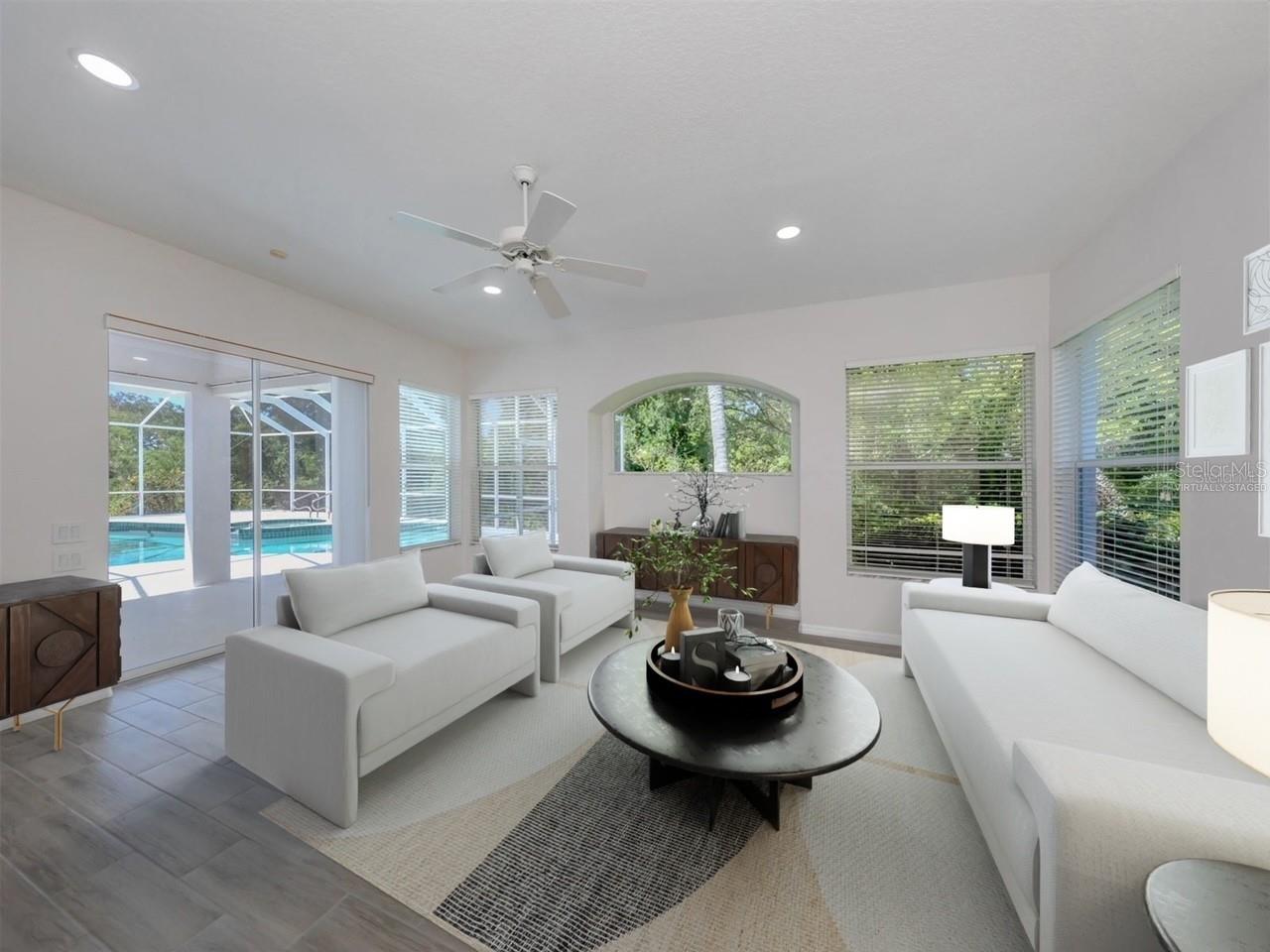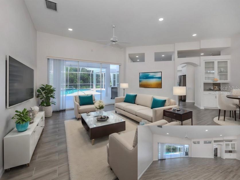 One or more photo(s) has been virtually staged. Recently updated three bedroom two bath plus den spacious home, located in a gated community at Calusa Lakes at the end of a quiet cul-de-sac. This beautiful home features high ceilings and oversized rooms that create an inviting atmosphere. Large screened in lanai with heated pool & spa overlooking preserve create a relaxing oasis for outdoor living. Kitchen offers lots of counter space, abundance of cabinets & storage and a dry bar. Oversized 3 car garage provides ample space for multiple cars or storage needs. Calusa Lakes offers semi-private golf club, tennis courts, low HOA fees, short drive to Nokomis Beach, no CDD fees, short distance to restaurants, shops and medical facilities, and so much more. A list of all recent updates is in the attachment.