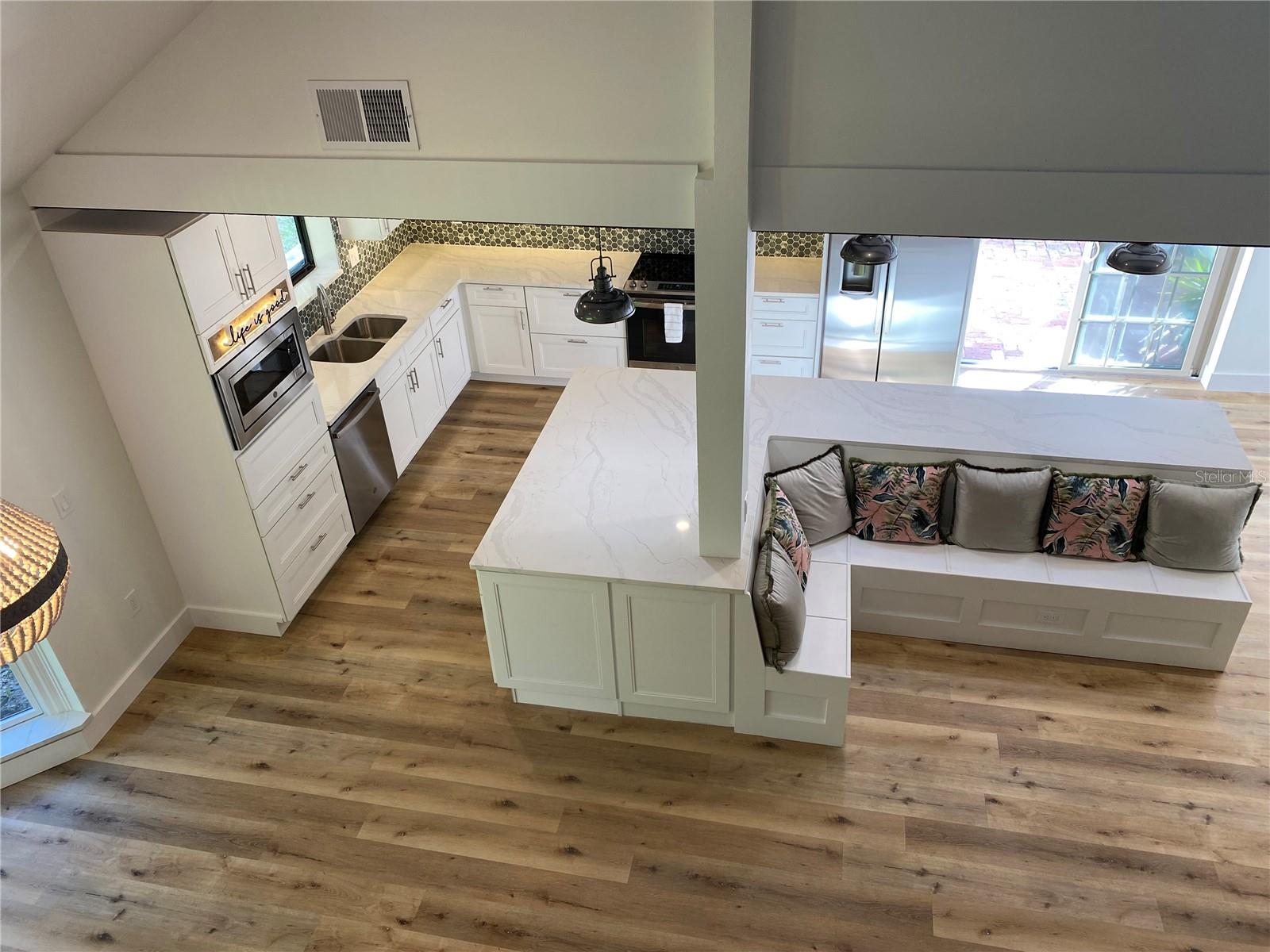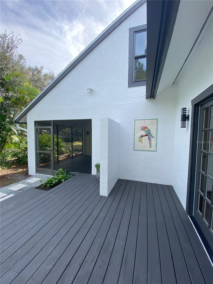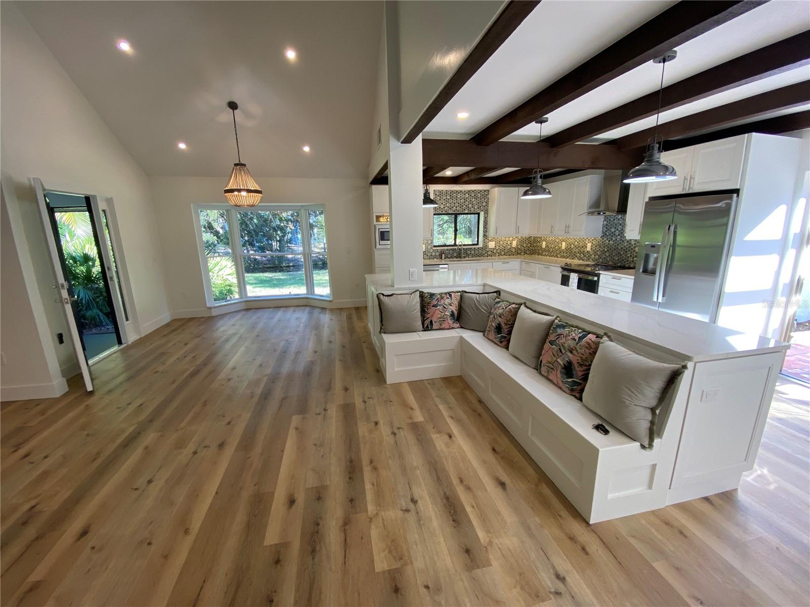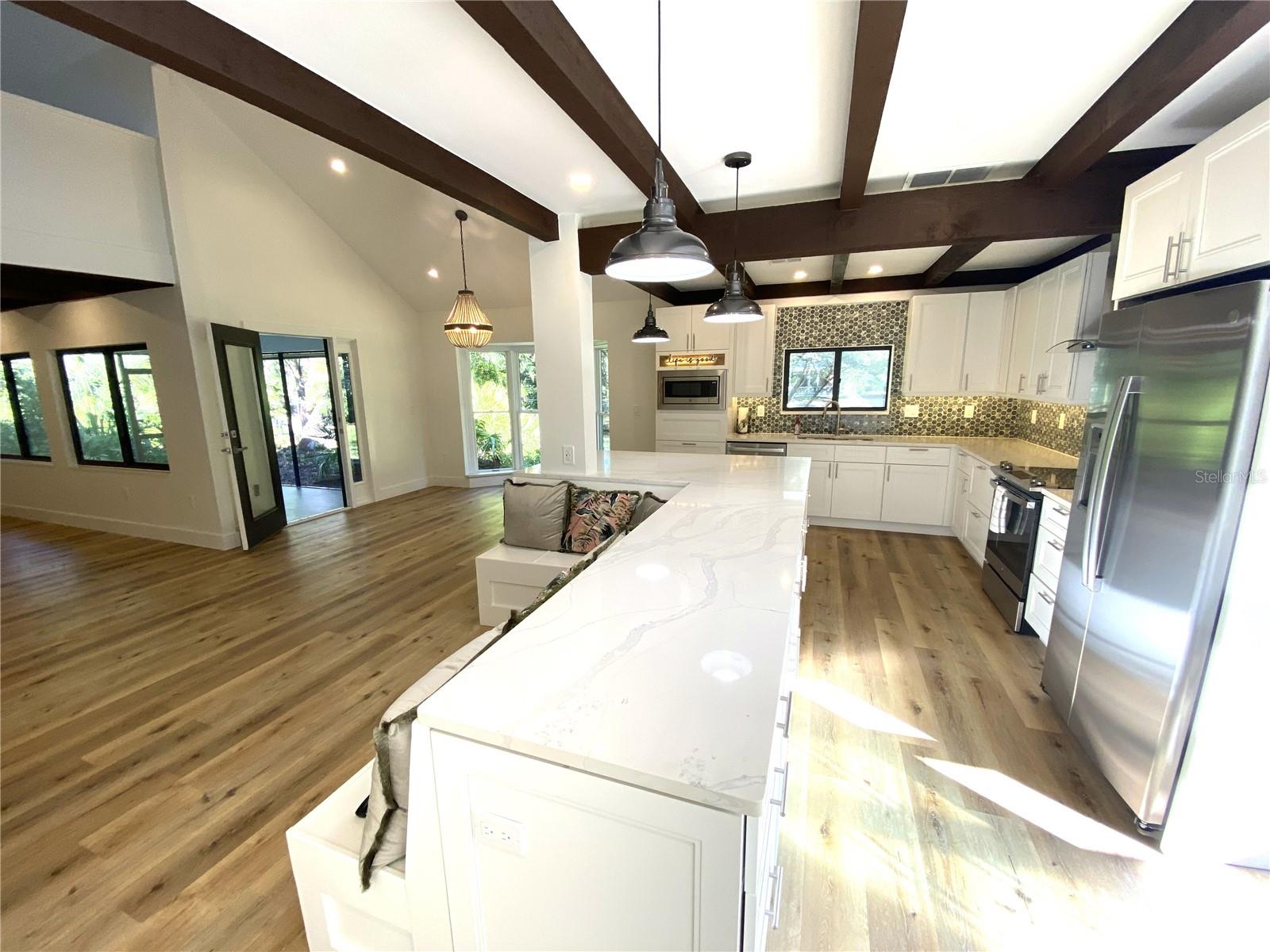 One or more photo(s) has been virtually staged. Welcome to this move-in ready custom home, located in a family friendly, established community. This stunning home has 4 bedrooms, 3 full baths and has been completely renovated from top to bottom. No room or fixture has been left untouched! Fantastic kitchen with extra-large island and cabinets galore, all with quiet closures. All new stainless steel GE matching appliances, Quartz countertops, built-in microwave wall oven, and new lighting throughout. Custom built-in banquette seating in the kitchen, plus room for a full dining table, as well as a screened-in lanai area off the kitchen for Al fresco dining plus a second lanai off kitchen, great for BBQ. Bonus wine storage space located under stairwell with LED lighting, enhance the open living space. Spacious primary bedroom with vaulted ceiling located on the main level with ensuite, spa-like bath, dual vanities and no-curb shower with glass enclosure, plus separate modern soaking tub, lighted mirrors and 2 walk-in closets. The primary bedroom also has French doors that lead to its own private deck for additional outdoor space that is quiet and peaceful next to the lake. A full laundry room located just outside the primary bedroom. The second bedroom is also located on the main floor separated from the primary and has an ensuite bathroom with walk-in shower, along with Quartz countertops. The third bedroom is located upstairs with vaulted ceiling and has easy access to the 3rd bathroom with a full walk-in shower. The upstairs loft area can also be a fourth bedroom, which includes vaulted ceiling with spacious closet. This open area could be used as a home office or media room. There's also a large outdoor space with plenty of room for the pool of your dreams on this spacious 16,000 square foot lot. New roof in 2022. A/C installed in 2017. Large garage with plenty of space for your SUV. Home is located on a very quiet circle drive in a well-established neighborhood with top A+ rated Sarasota schools and easy access to shopping, beaches and the Interstate via Bee Ridge or Clark Road. Schedule your viewing today!