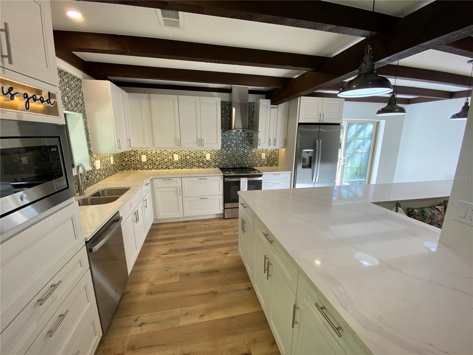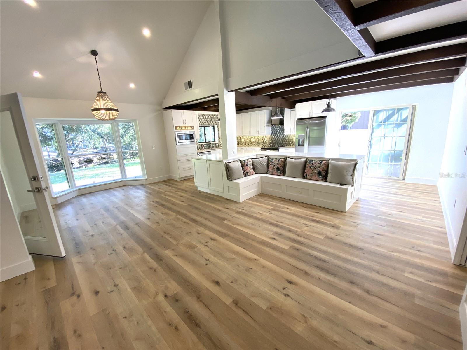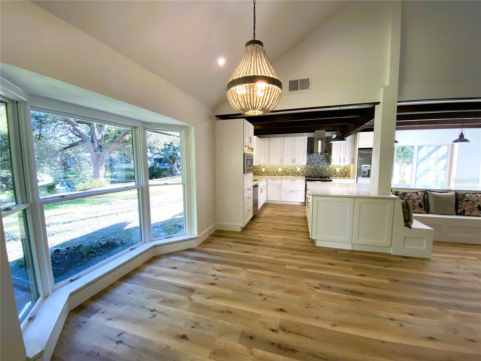 One or more photo(s) has been virtually staged. Welcome to this move-in ready custom home, located in a family friendly, established community. This stunning home has 4 bedrooms, 3 full baths and has been completely renovated from top to bottom. No room or fixture has been left untouched! Fantastic kitchen with extra-large island and cabinets galore, all with quiet closures. All new stainless steel GE matching appliances, Quartz countertops, built-in microwave wall oven, and new lighting throughout. Custom built-in banquette seating in the kitchen, plus room for a full dining table, as well as a screened-in lanai area off the kitchen for Al fresco dining plus a second lanai off kitchen, great for BBQ. Bonus wine storage space located under stairwell with LED lighting, enhance the open living space. Spacious primary bedroom with vaulted ceiling located on the main level with ensuite, spa-like bath, dual vanities and no-curb shower with glass enclosure, plus separate modern soaking tub, lighted mirrors and 2 walk-in closets. The primary bedroom also has French doors that lead to its own private deck for additional outdoor space that is quiet and peaceful next to the lake. A full laundry room located just outside the primary bedroom. The second bedroom is also located on the main floor separated from the primary and has an ensuite bathroom with walk-in shower, along with Quartz countertops. The third bedroom is located upstairs with vaulted ceiling and has easy access to the 3rd bathroom with a full walk-in shower. The upstairs loft area can also be a fourth bedroom, which includes vaulted ceiling with spacious closet. This open area could be used as a home office or media room. There's also a large outdoor space with plenty of room for the pool of your dreams on this spacious 16,000 square foot lot. New roof in 2022. A/C installed in 2017. Large garage with plenty of space for your SUV. Home is located on a very quiet circle drive in a well-established neighborhood with top A+ rated Sarasota schools and easy access to shopping, beaches and the Interstate via Bee Ridge or Clark Road. Schedule your viewing today!
