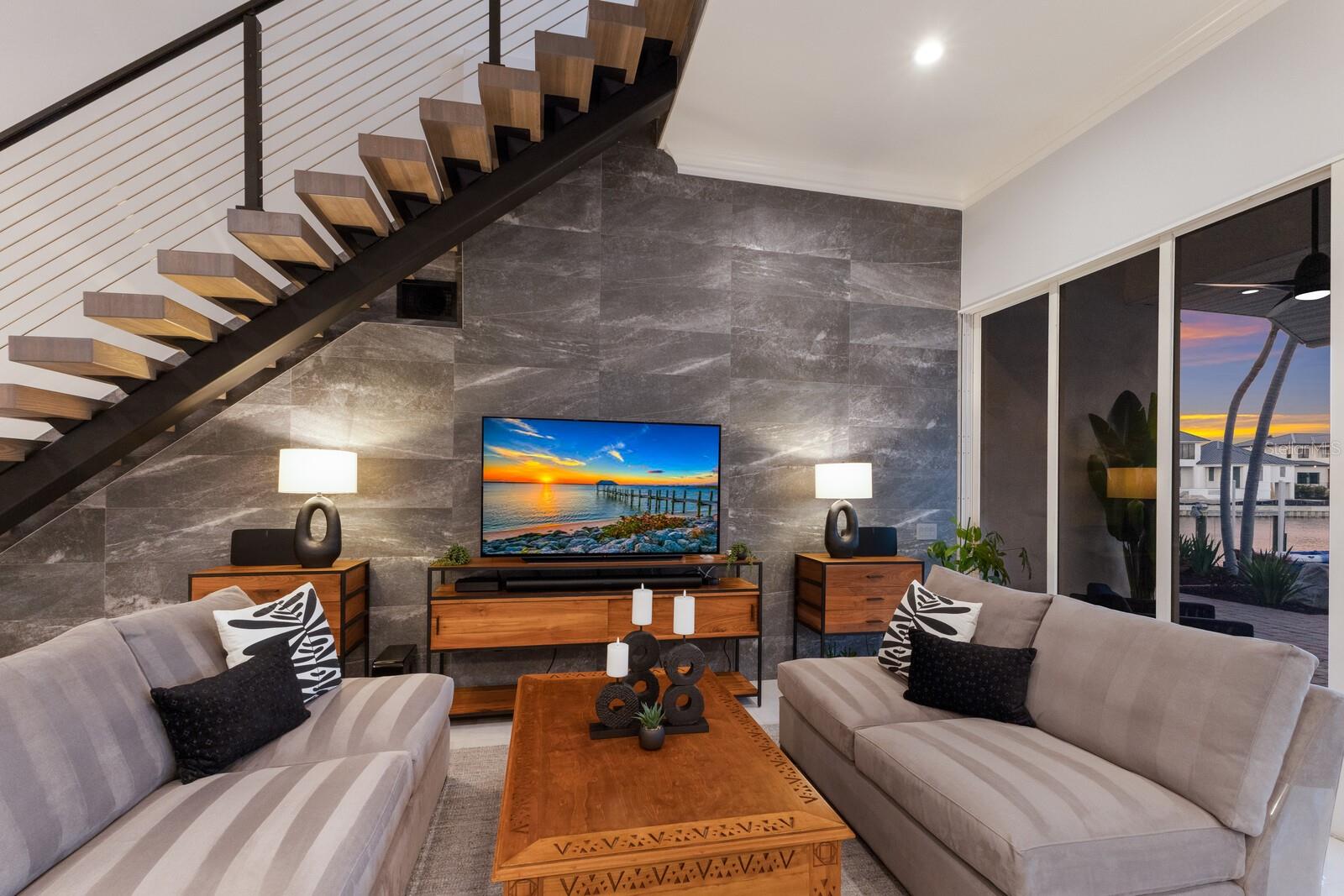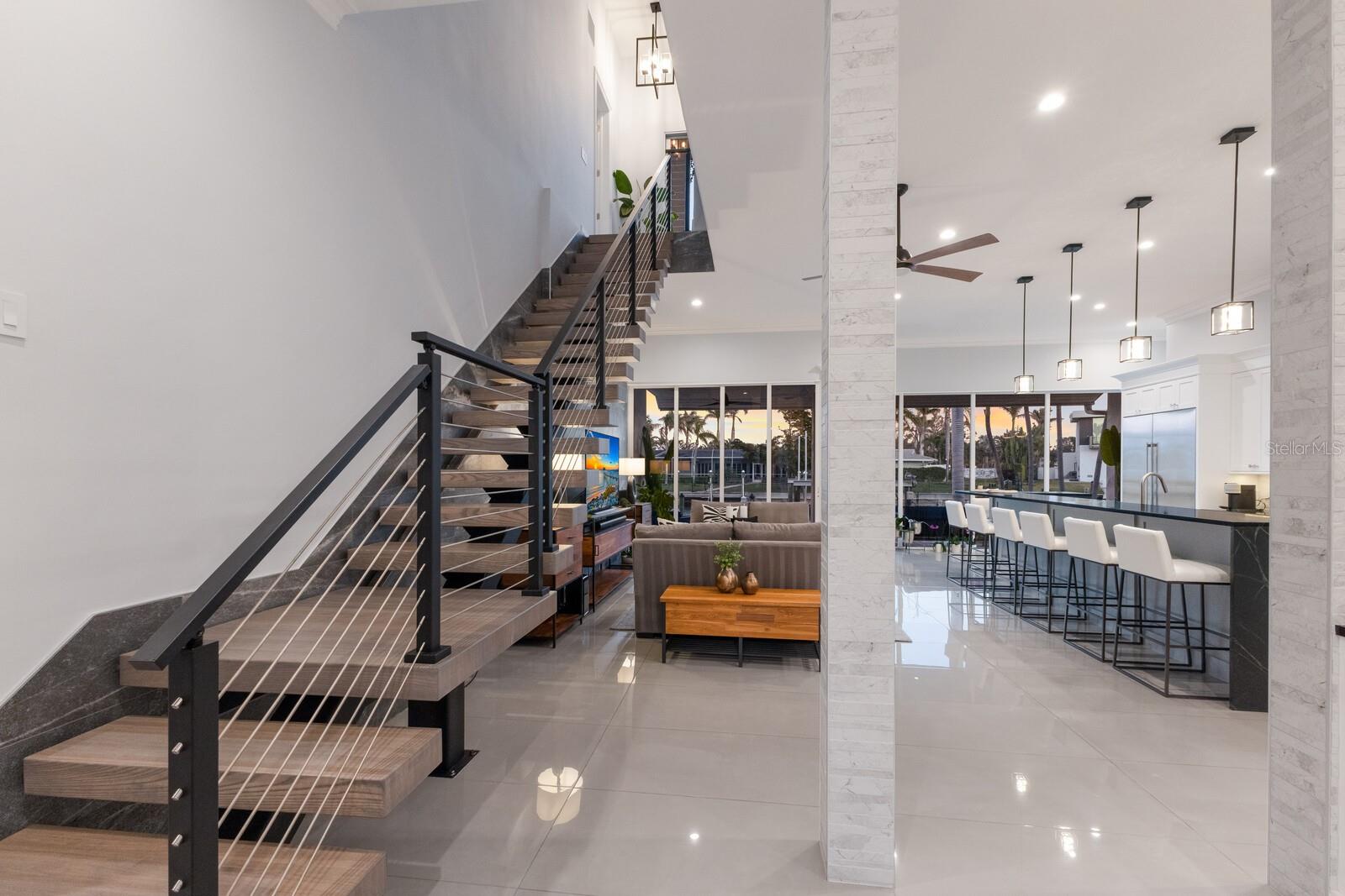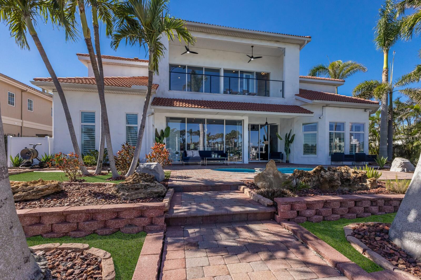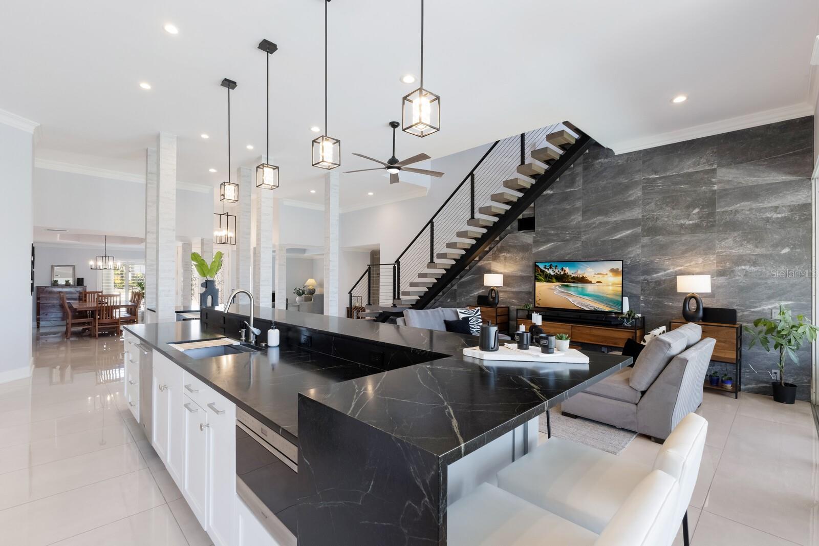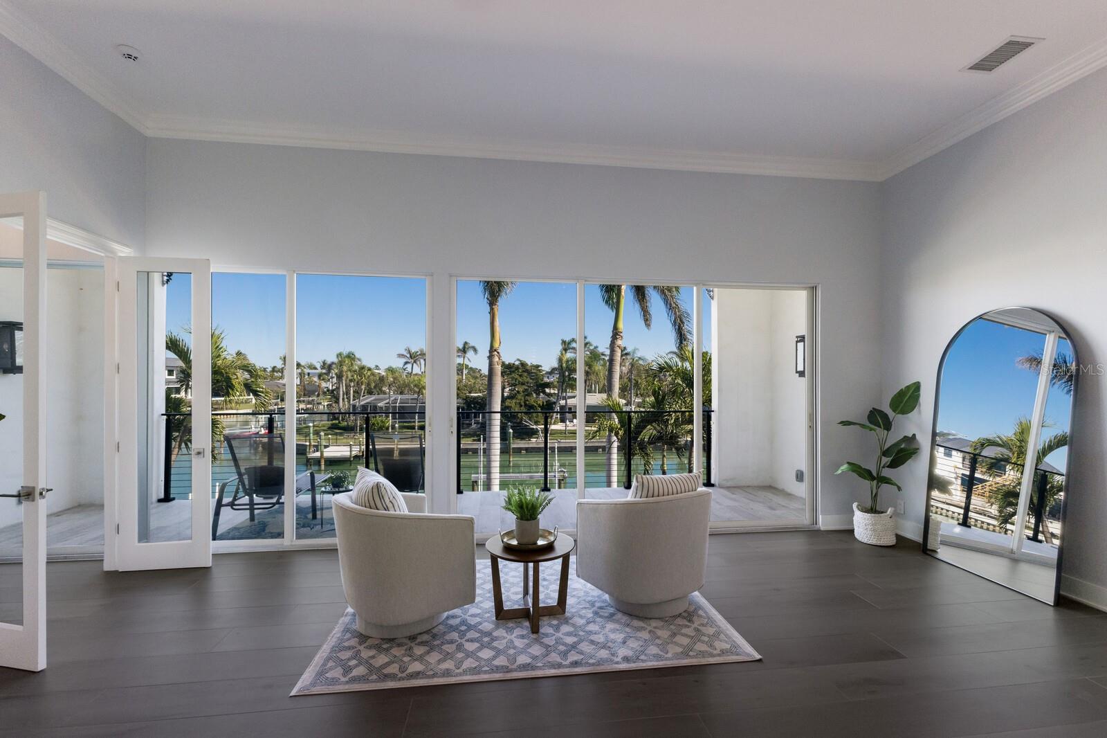 LOWEST PRICE PER SQ FT FOR WATERFRONT PROPERTY ON BIRD KEY! A magnificent sanctuary, 12' above sea level, perfectly positioned on the coveted West end of Dolphin Waterway, this home provides unmatched privacy and serenity, framed by 100 feet of SAILBOAT WATER FRONTAGE on Bird Key's DEEPEST AND WIDEST CANAL. BRAND NEW FLAT TILE ROOF was completed August 2025. Home was completely unscathed during the storms. Newly renovated 5,257 square feet of luxury, this architectural marvel features four bedrooms with two primary suites, one on the main and one on the second level, a yoga/media room, and four full baths. Upon entering, you'll be welcomed by an atmosphere of modern elegance with soaring ceilings and stunning 2' x 4' porcelain tile flooring. As you climb the luxurious custom modern floating metal staircase, uncover an awe-inspiring second primary suite and enter an expansive 33' x 23' retreat. This versatile space includes a full bath; two walk-in closets; sitting area, and access to a private balcony overlooking the sun-drenched pool area, DolphinWaterway, palm trees, and occasional pelican sighting perched on one of your TWO NEW DOCKS, one with a 20,000lb lift and one personal watercraft 4500lb lift with space for two jet skis or kayaks. The grand entrance effortlessly flows into the open dining and living rooms. An expansive redesigned contemporary kitchen is at the heart of the home, a chef's dream outfitted with stainless steel Wolf Pro Series appliances, including a dual-fed six-burner natural gas stove with an electric oven, vent, and a sleek drawer microwave. A Sub-Zero Designer Series refrigerator/freezer, Sub Zero dual-controlled refrigerators, and a Cove dishwasher famous for its whisper-quiet operation enhance your culinary experience. The soapstone waterfall island with seating for eight is highlighted by a luxurious Brazilian Marble backsplash, and solid wood Campbell cabinetry adds a touch of timeless elegance. A custom-designed kitchen pantry room and storage or prep area perfect for private parties provide all the extra space needed to keep your kitchen organized, efficient, and clutter-free. The open kitchen and family rooms make this the perfect space for entertaining guests and watching your favorite movie or sporting event. Highlighted by a warm tile accent wall and crown molding, you can enjoy the sweeping waterfront views and stunning skies from this inviting space. Retreat to the private main floor suite through double doors into a water-view sanctuary with a primary bath featuring beautiful porcelain wood texture tile, contemporary lighting, soapstone counters, dual sinks, and a spacious glass-enclosed shower. A custom-built walk-in closet further enhances this suite. Two additional bedrooms and two resort-style baths are situated on the opposite side of this split plan. An additional flex space on the second level is perfect for a theater room, yoga room, or office. Situated on a secluded cul-de-sac with two side-load garages and space for four cars. This exquisite, gated residence offers immediate access to the pristine waters of Sarasota Bay and the Gulf. Perfectly situated near St. Armands Circle, Bird Key Yacht Club, and vibrant downtown Sarasota, you will enjoy coastal living and the Bird Key lifestyle all year round. Paradise is found in this exceptional Sarasota sanctuary. Make this coastal haven your new home!