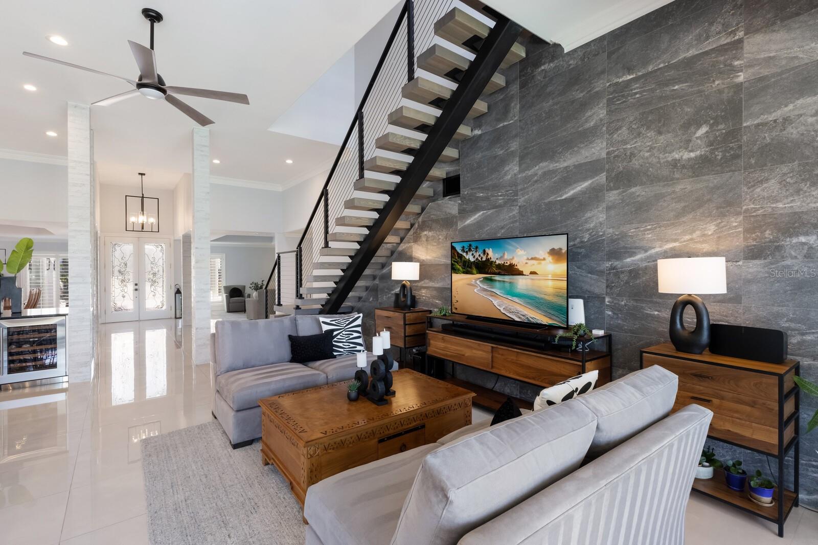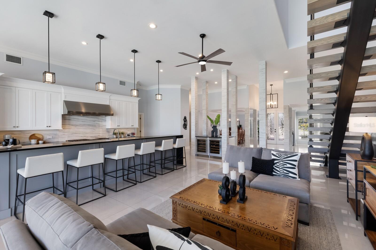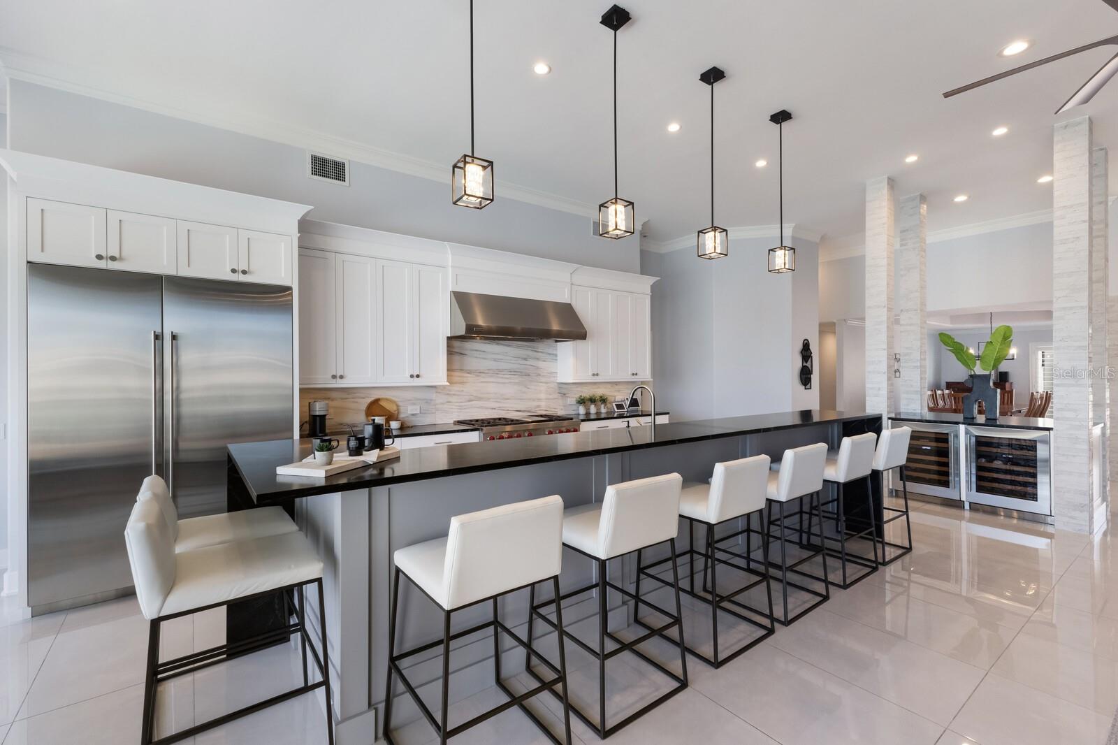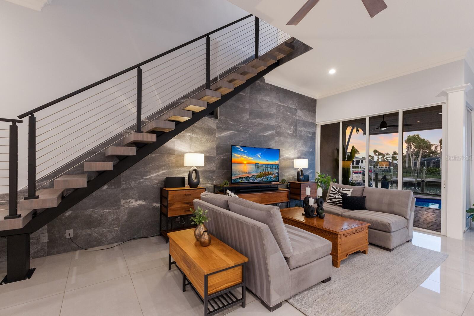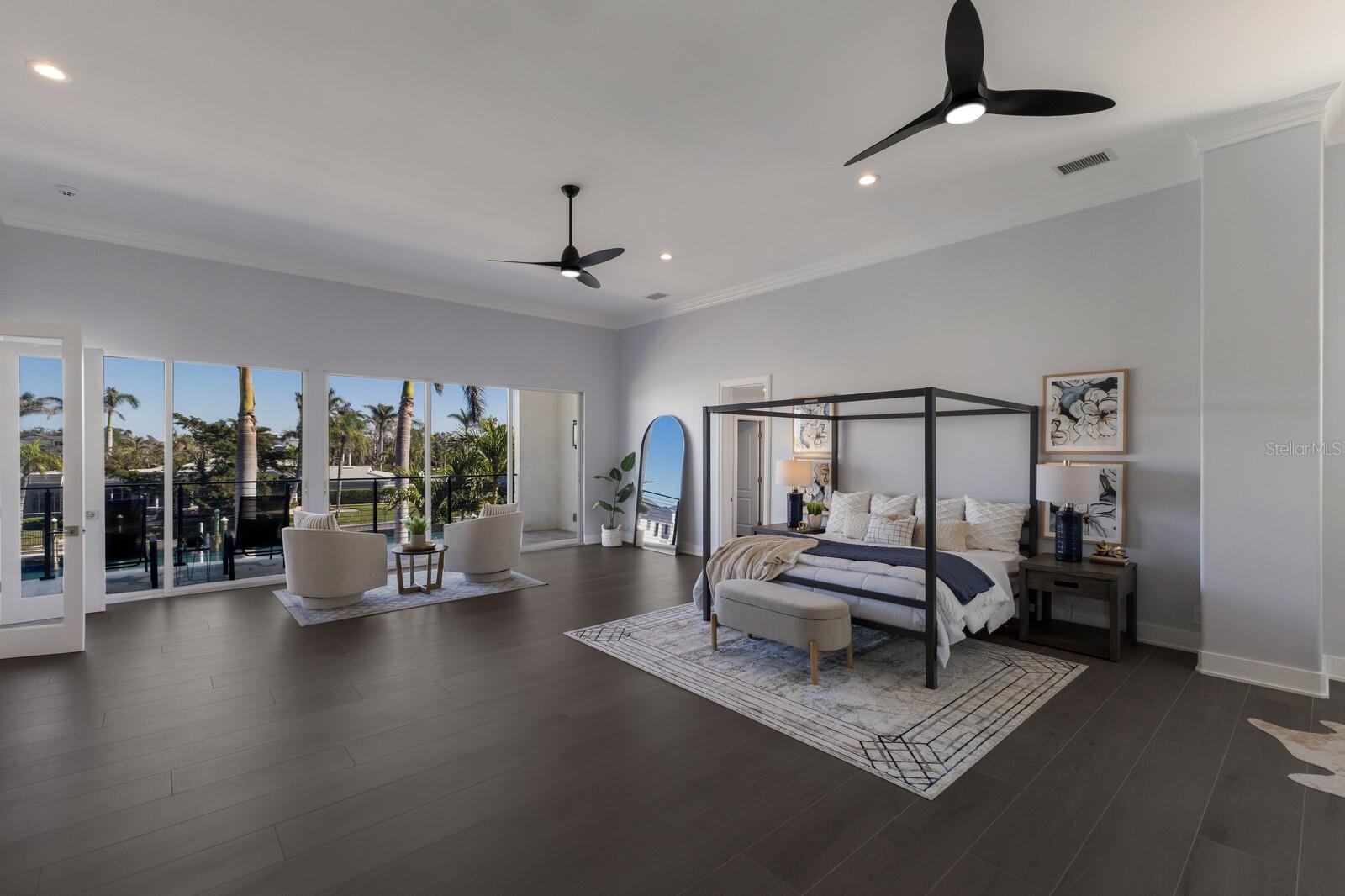 LOWEST PRICE PER SQ FT FOR WATERFRONT PROPERTY ON BIRD KEY! A magnificent sanctuary, 12' above sea level, perfectly positioned on the coveted West end of Dolphin Waterway, this home provides unmatched privacy and serenity, framed by 100 feet of SAILBOAT WATER FRONTAGE on Bird Key's DEEPEST AND WIDEST CANAL. BRAND NEW FLAT TILE ROOF was completed August 2025. Home was completely unscathed during the storms. Newly renovated 5,257 square feet of luxury, this architectural marvel features four bedrooms with two primary suites, one on the main and one on the second level, a yoga/media room, and four full baths. Upon entering, you'll be welcomed by an atmosphere of modern elegance with soaring ceilings and stunning 2' x 4' porcelain tile flooring. As you climb the luxurious custom modern floating metal staircase, uncover an awe-inspiring second primary suite and enter an expansive 33' x 23' retreat. This versatile space includes a full bath; two walk-in closets; sitting area, and access to a private balcony overlooking the sun-drenched pool area, DolphinWaterway, palm trees, and occasional pelican sighting perched on one of your TWO NEW DOCKS, one with a 20,000lb lift and one personal watercraft 4500lb lift with space for two jet skis or kayaks. The grand entrance effortlessly flows into the open dining and living rooms. An expansive redesigned contemporary kitchen is at the heart of the home, a chef's dream outfitted with stainless steel Wolf Pro Series appliances, including a dual-fed six-burner natural gas stove with an electric oven, vent, and a sleek drawer microwave. A Sub-Zero Designer Series refrigerator/freezer, Sub Zero dual-controlled refrigerators, and a Cove dishwasher famous for its whisper-quiet operation enhance your culinary experience. The soapstone waterfall island with seating for eight is highlighted by a luxurious Brazilian Marble backsplash, and solid wood Campbell cabinetry adds a touch of timeless elegance. A custom-designed kitchen pantry room and storage or prep area perfect for private parties provide all the extra space needed to keep your kitchen organized, efficient, and clutter-free. The open kitchen and family rooms make this the perfect space for entertaining guests and watching your favorite movie or sporting event. Highlighted by a warm tile accent wall and crown molding, you can enjoy the sweeping waterfront views and stunning skies from this inviting space. Retreat to the private main floor suite through double doors into a water-view sanctuary with a primary bath featuring beautiful porcelain wood texture tile, contemporary lighting, soapstone counters, dual sinks, and a spacious glass-enclosed shower. A custom-built walk-in closet further enhances this suite. Two additional bedrooms and two resort-style baths are situated on the opposite side of this split plan. An additional flex space on the second level is perfect for a theater room, yoga room, or office. Situated on a secluded cul-de-sac with two side-load garages and space for four cars. This exquisite, gated residence offers immediate access to the pristine waters of Sarasota Bay and the Gulf. Perfectly situated near St. Armands Circle, Bird Key Yacht Club, and vibrant downtown Sarasota, you will enjoy coastal living and the Bird Key lifestyle all year round. Paradise is found in this exceptional Sarasota sanctuary. Make this coastal haven your new home!