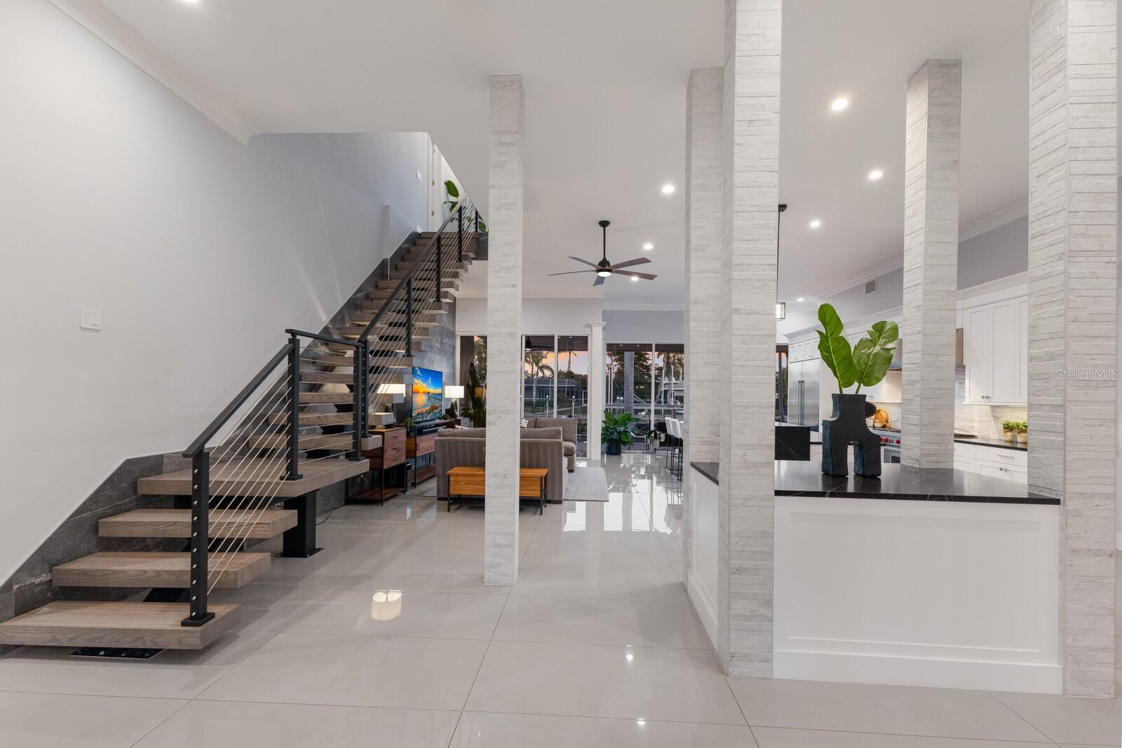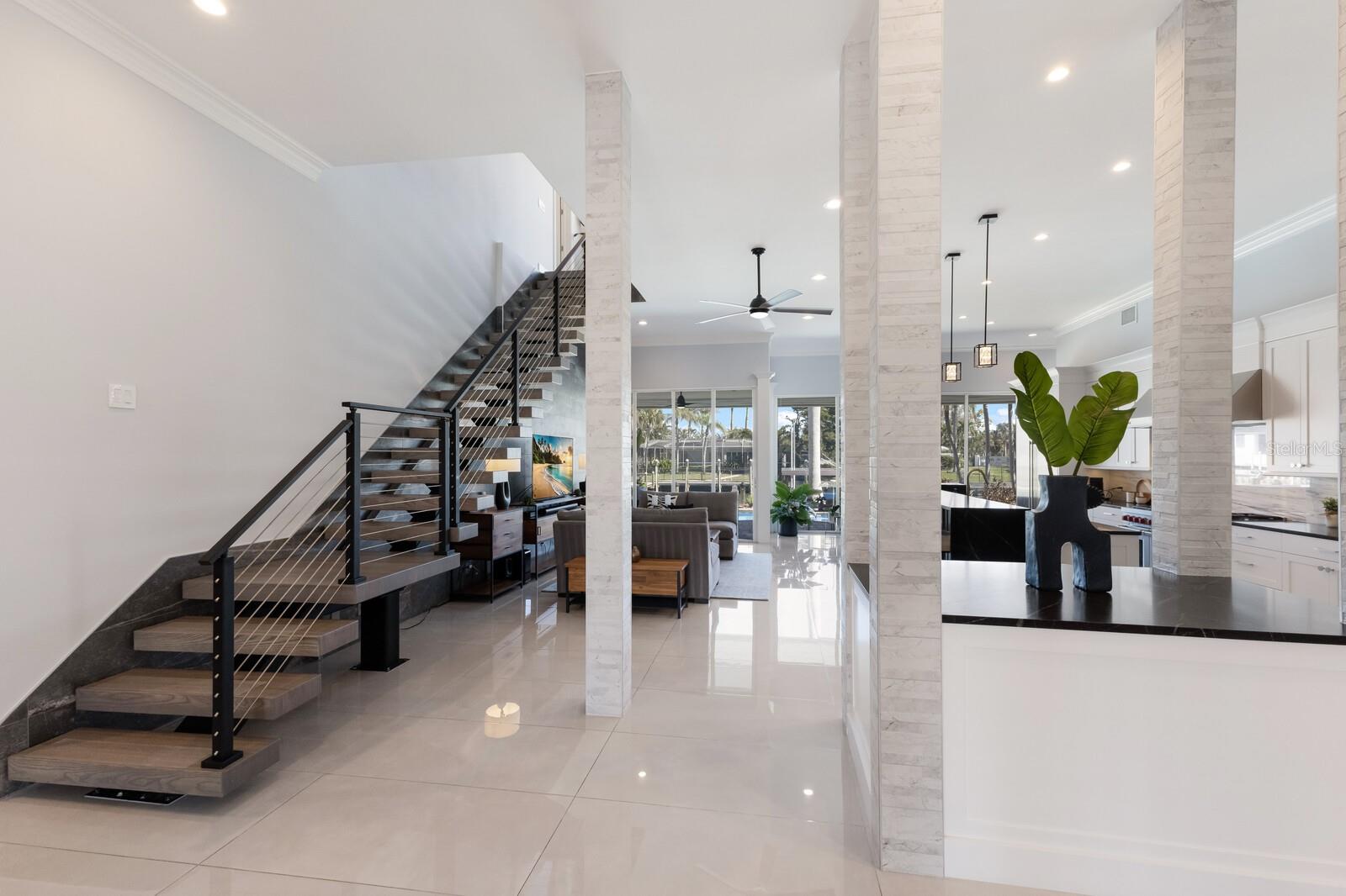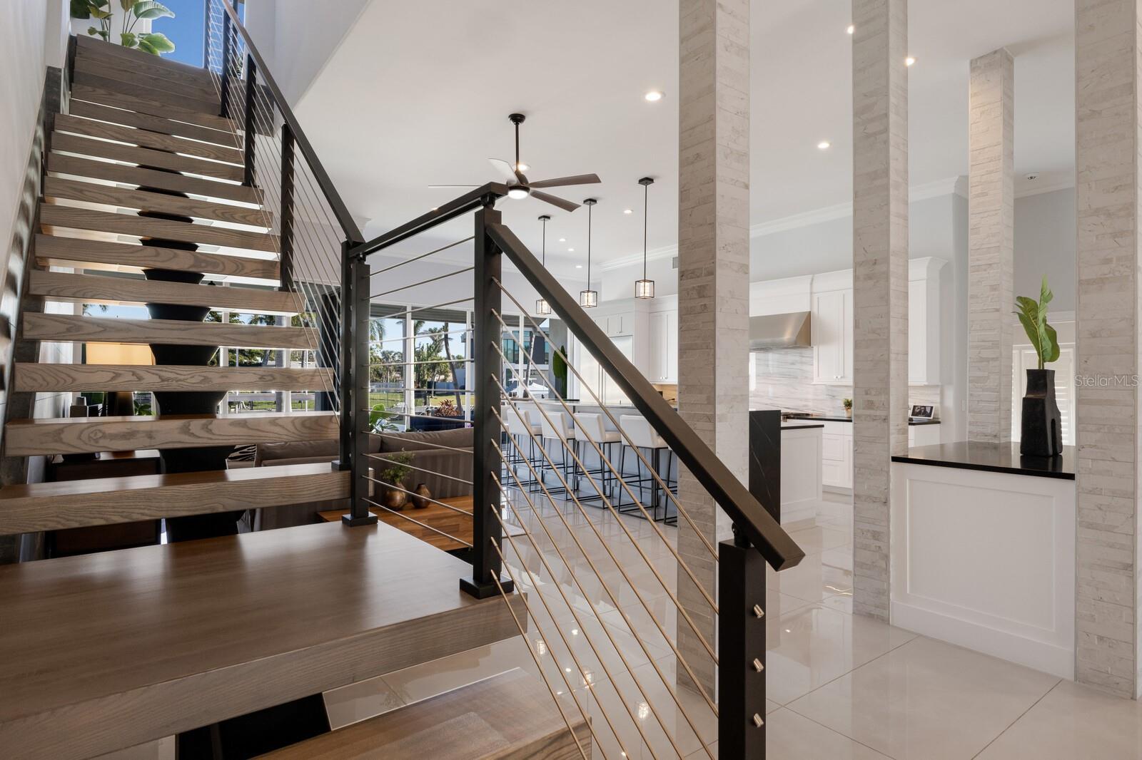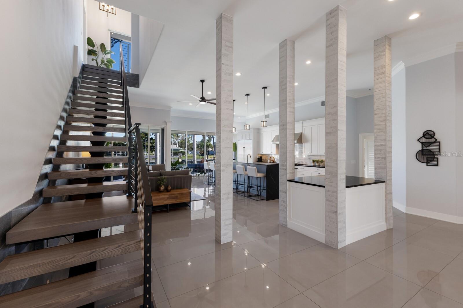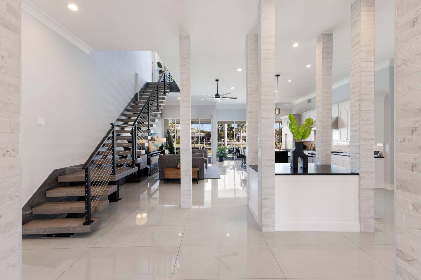LOWEST PRICE PER SQ FT FOR WATERFRONT PROPERTY ON BIRD KEY! A magnificent sanctuary, 12' above sea level, perfectly positioned on the coveted West end of Dolphin Waterway, this home provides unmatched privacy and serenity, framed by 100 feet of SAILBOAT WATER FRONTAGE on Bird Key's DEEPEST AND WIDEST CANAL. BRAND NEW FLAT TILE ROOF was completed August 2025. Home was completely unscathed during the storms. Newly renovated 5,257 square feet of luxury, this architectural marvel features four bedrooms with two primary suites, one on the main and one on the second level, a yoga/media room, and four full baths. Upon entering, you'll be welcomed by an atmosphere of modern elegance with soaring ceilings and stunning 2' x 4' porcelain tile flooring. As you climb the luxurious custom modern floating metal staircase, uncover an awe-inspiring second primary suite and enter an expansive 33' x 23' retreat. This versatile space includes a full bath; two walk-in closets; sitting area, and access to a private balcony overlooking the sun-drenched pool area, DolphinWaterway, palm trees, and occasional pelican sighting perched on one of your TWO NEW DOCKS, one with a 20,000lb lift and one personal watercraft 4500lb lift with space for two jet skis or kayaks. The grand entrance effortlessly flows into the open dining and living rooms. An expansive redesigned contemporary kitchen is at the heart of the home, a chef's dream outfitted with stainless steel Wolf Pro Series appliances, including a dual-fed six-burner natural gas stove with an electric oven, vent, and a sleek drawer microwave. A Sub-Zero Designer Series refrigerator/freezer, Sub Zero dual-controlled refrigerators, and a Cove dishwasher famous for its whisper-quiet operation enhance your culinary experience. The soapstone waterfall island with seating for eight is highlighted by a luxurious Brazilian Marble backsplash, and solid wood Campbell cabinetry adds a touch of timeless elegance. A custom-designed kitchen pantry room and storage or prep area perfect for private parties provide all the extra space needed to keep your kitchen organized, efficient, and clutter-free. The open kitchen and family rooms make this the perfect space for entertaining guests and watching your favorite movie or sporting event. Highlighted by a warm tile accent wall and crown molding, you can enjoy the sweeping waterfront views and stunning skies from this inviting space. Retreat to the private main floor suite through double doors into a water-view sanctuary with a primary bath featuring beautiful porcelain wood texture tile, contemporary lighting, soapstone counters, dual sinks, and a spacious glass-enclosed shower. A custom-built walk-in closet further enhances this suite. Two additional bedrooms and two resort-style baths are situated on the opposite side of this split plan. An additional flex space on the second level is perfect for a theater room, yoga room, or office. Situated on a secluded cul-de-sac with two side-load garages and space for four cars. This exquisite, gated residence offers immediate access to the pristine waters of Sarasota Bay and the Gulf. Perfectly situated near St. Armands Circle, Bird Key Yacht Club, and vibrant downtown Sarasota, you will enjoy coastal living and the Bird Key lifestyle all year round. Paradise is found in this exceptional Sarasota sanctuary. Make this coastal haven your new home!