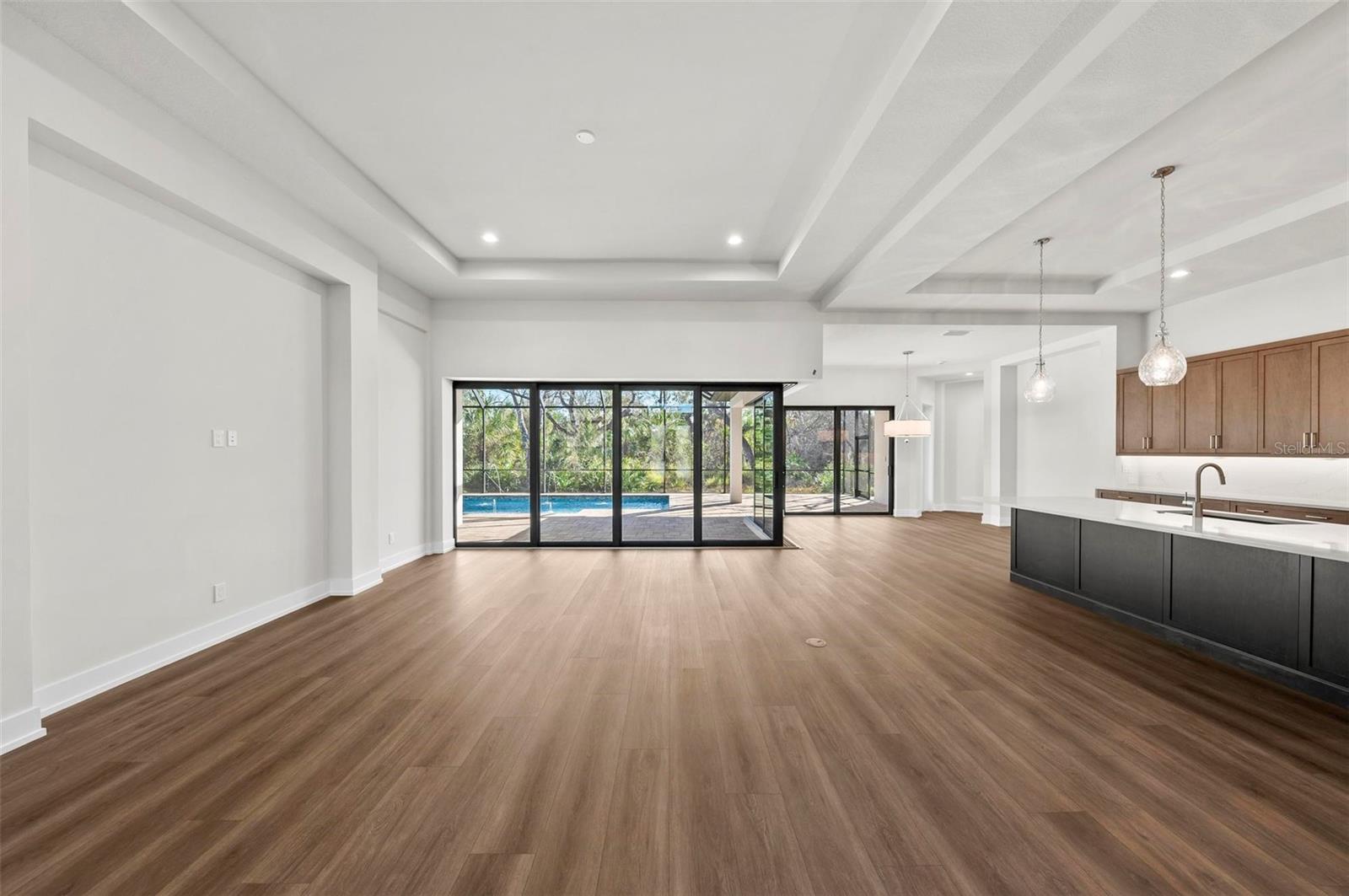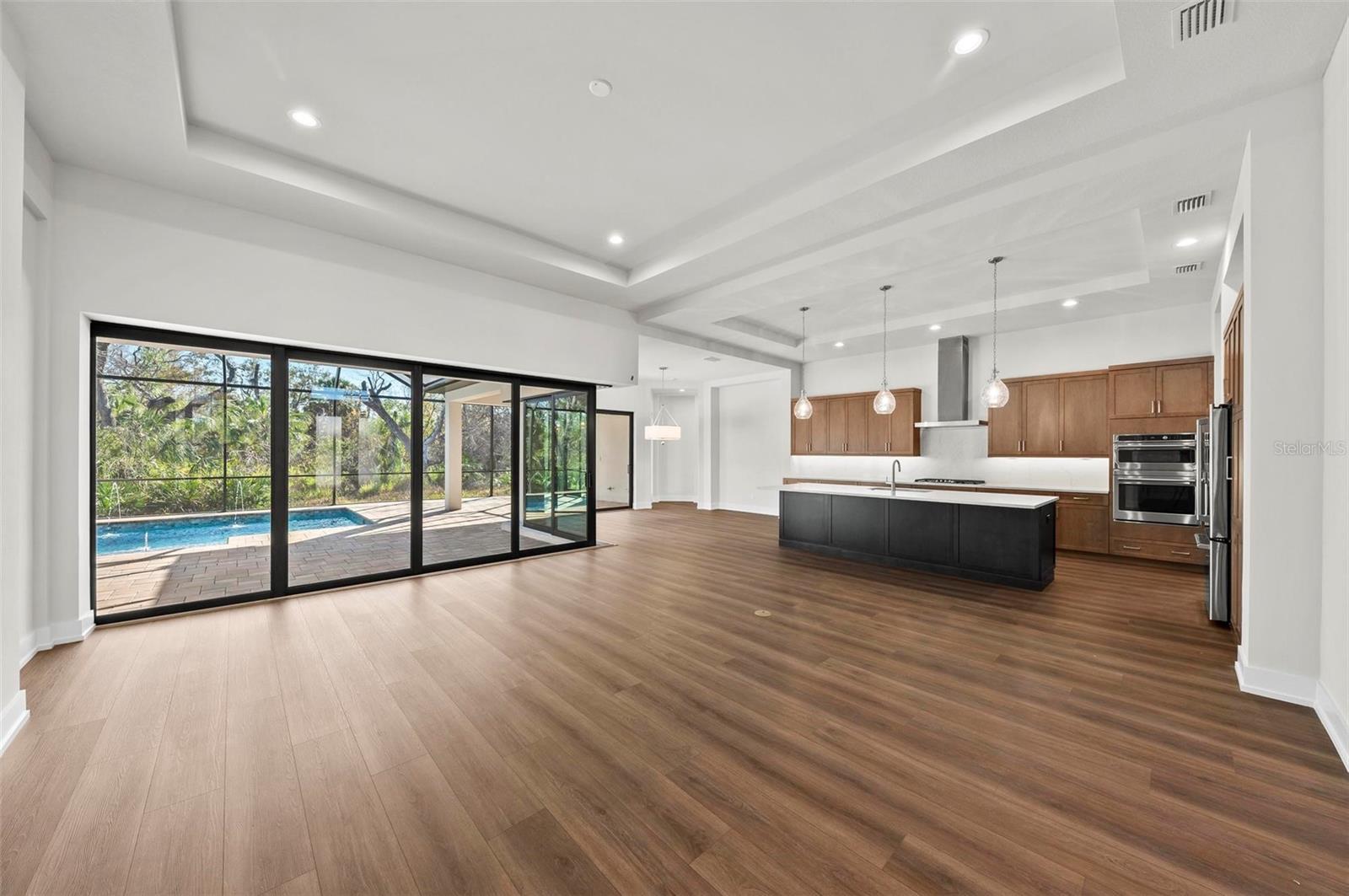 This custom-built Lee Wetherington home offers exceptional design and luxury in Lakewood Ranch's Summerfield Bluffs neighborhood. Situated on a beautiful private, wooded lot in this mature settled area, this home combines style, comfort, and high-end finishes throughout. The open-concept floor plan includes 4 bedrooms, 3 bathrooms and a spacious study. The 4th bedroom could also serve as a bonus room for a more casual living space and fun movie nights. The 12-ft ceilings in the expansive living room and dining room create a sense of openness, while the pocketing sliding glass doors with a disappearing corner seamlessly connect the interior to the covered outdoor living, outdoor dining, summer kitchen, and heated saltwater pool--perfect for entertaining.The chef's kitchen features soft-close cabinetry, Cambria quartz countertops, a large island with pendant lighting, GE Caf Stainless Steel Appliances, and a huge hidden walk-in pantry. The luxurious primary suite includes two walk-in closets and a spa-like bathroom with a soaking tub, walk-in shower with two showering stations, and double vanity. The additional guest bedrooms offer privacy and comfort for guests. The bonus room is ideal for movie nights or a 4th bedroom.Additional features include luxury vinyl flooring throughout the living areas, primary suite and bedroom 4, tile in all bathrooms and laundry room, carpet in bedroom 2 & 3, tray ceilings, washer and dryer, impact windows and doors throughout, and a 3-car garage with epoxy flooring. With a low HOA fee of only $96 per year, this home provides excellent value, along with a two-year Builders Warranty and ten-year structural warranty for added peace of mind. Don't miss this unique opportunity to experience the Lee Wetherington difference in the heart of Lakewood Ranch--schedule your private showing today!