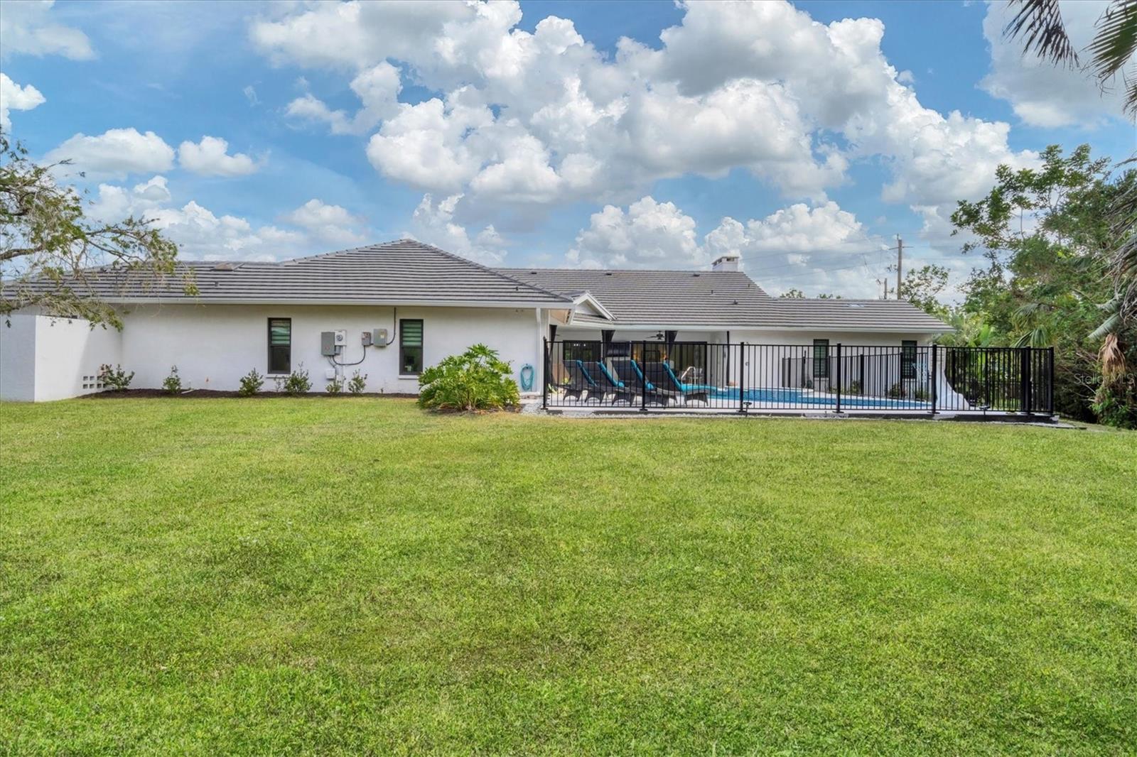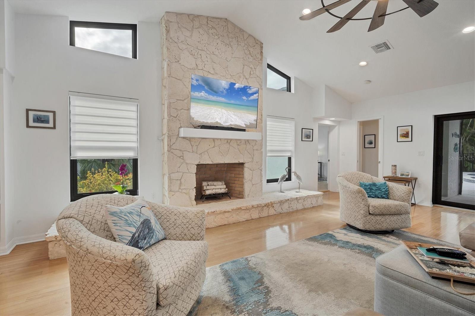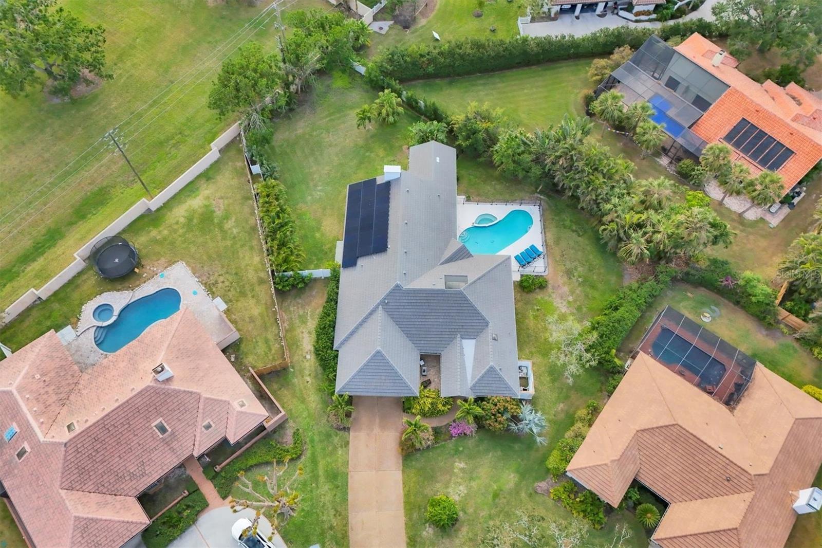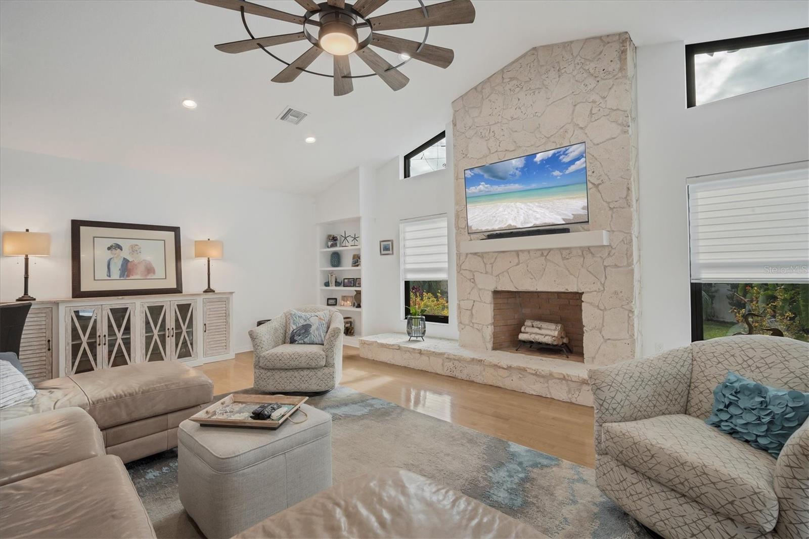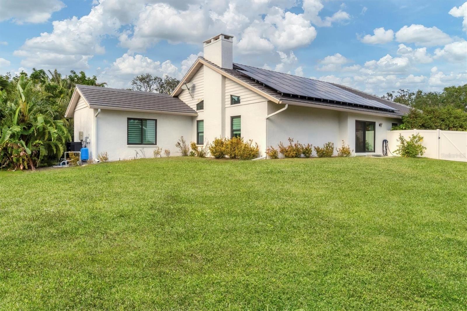 SELLERS ARE MOTIVATED!This home is not a drive-by! It's so much larger than it looks from the curb. Nestled onto a large lot in The Landings; the most sought-after neighborhood West Of The Trail in Sarasota. Spanning over 3000 square feet, it features 4 large bedrooms, (2 with en-suite bathrooms) and an open floor plan with multiple pocket doors for flexibility. The 4th Bedroom is being used as an Office, would also make a nice Den or Music Room. Lots of glass allows the Florida sunshine to bathe the home in light. The primary suite has a large walk-in closet, double vanities, a spa-like bath with a beautiful soaking tub and a step-in shower; sliders that lead out to the sundeck and pool. An open kitchen is the heart of the home & features numerous white cabinets, stainless steel appliances, an island, planning desk and breakfast counter that flows into the dining area where glass sliders lead out to the lanai. A vaulted ceiling and high windows accentuate a wood-burning fireplace with a unique shell/fossil chimney and hearth; making the living room a relaxing oasis where you and your guests will love to gather. Multiple glass sliders open from several rooms to the gorgeous outdoor living space. The sitting area has a wall-mounted TV and drapery screens that can be drawn tight to keep insects away; the dining area has a serving center with a sink & refrigerator. Several loungers will fit around the pool, and there's also an outdoor shower. The sparkling saltwater pool and spa are heated for year-round enjoyment. Residents of The Landings love the stately oaks that line the winding roads; 24-hour guarded gates and the nature trail, fishing pier and kayak launch. Optional membership in the Racquet Club includes tennis, pickle ball, a swimming pool, fitness center, pro shop and scheduled social activities.This sturdy block home has new lighting and ceiling fans; updated bathrooms; new high-impact windows; a new roof; new AC system, an upgraded irrigation system with a well; new pool heater; new fence; an EV charger in the garage and SOLAR PANELS THAT PROVIDE POWER TO THE ENTIRE HOUSE, REDUCING THE ELECTRIC BILL TO $27.00/MONTH!