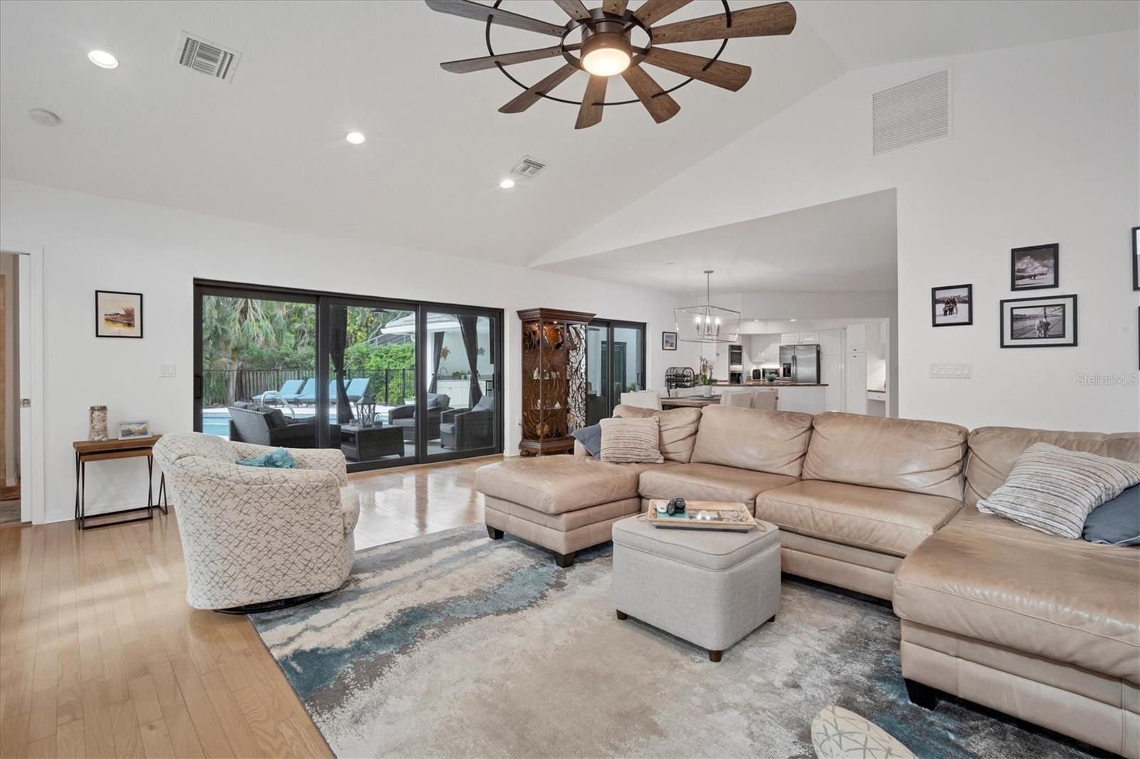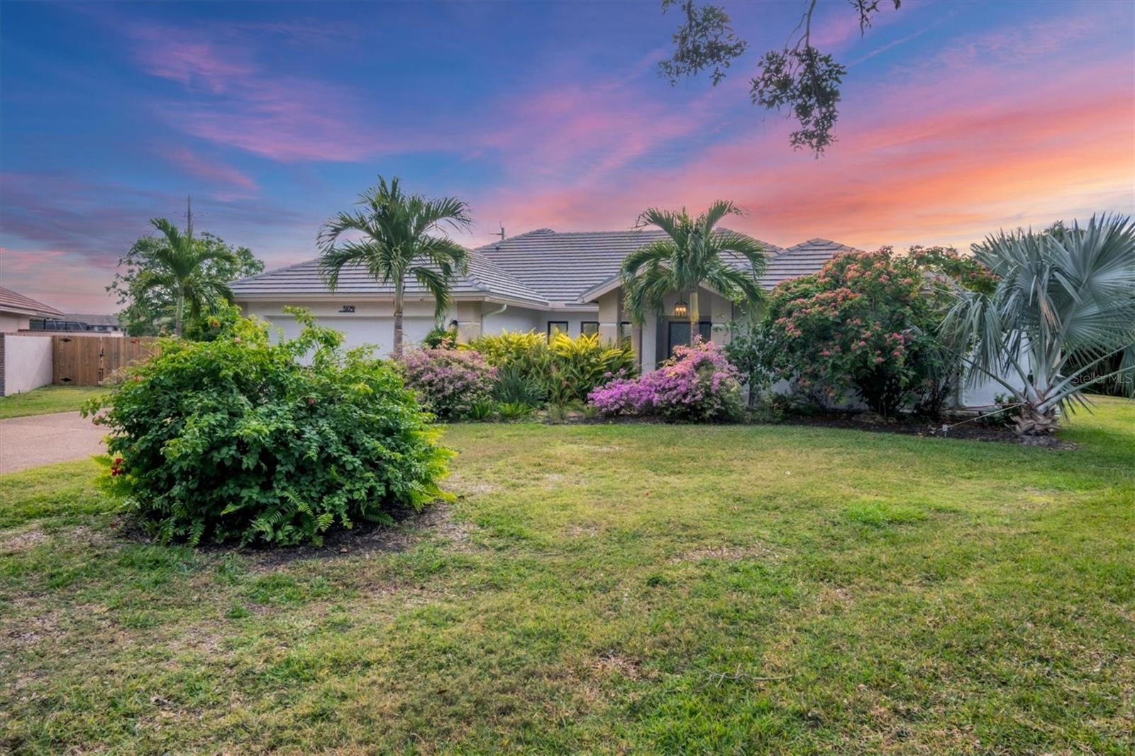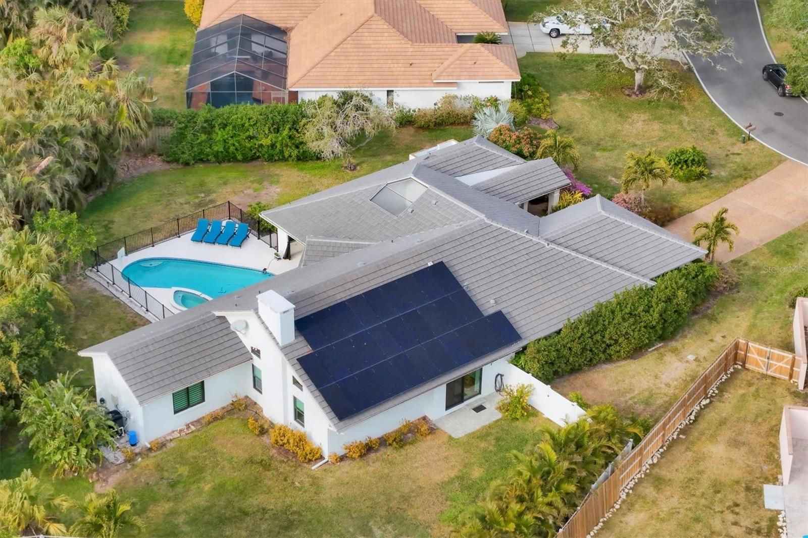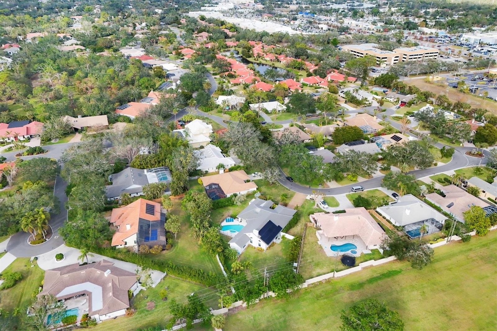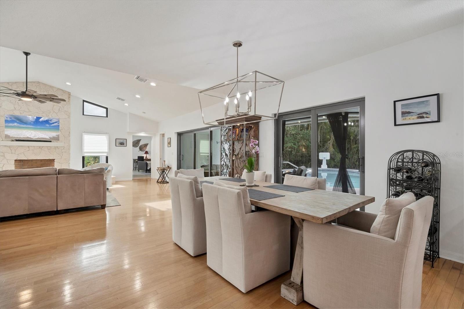 SELLERS ARE MOTIVATED!This home is not a drive-by! It's so much larger than it looks from the curb. Nestled onto a large lot in The Landings; the most sought-after neighborhood West Of The Trail in Sarasota. Spanning over 3000 square feet, it features 4 large bedrooms, (2 with en-suite bathrooms) and an open floor plan with multiple pocket doors for flexibility. The 4th Bedroom is being used as an Office, would also make a nice Den or Music Room. Lots of glass allows the Florida sunshine to bathe the home in light. The primary suite has a large walk-in closet, double vanities, a spa-like bath with a beautiful soaking tub and a step-in shower; sliders that lead out to the sundeck and pool. An open kitchen is the heart of the home & features numerous white cabinets, stainless steel appliances, an island, planning desk and breakfast counter that flows into the dining area where glass sliders lead out to the lanai. A vaulted ceiling and high windows accentuate a wood-burning fireplace with a unique shell/fossil chimney and hearth; making the living room a relaxing oasis where you and your guests will love to gather. Multiple glass sliders open from several rooms to the gorgeous outdoor living space. The sitting area has a wall-mounted TV and drapery screens that can be drawn tight to keep insects away; the dining area has a serving center with a sink & refrigerator. Several loungers will fit around the pool, and there's also an outdoor shower. The sparkling saltwater pool and spa are heated for year-round enjoyment. Residents of The Landings love the stately oaks that line the winding roads; 24-hour guarded gates and the nature trail, fishing pier and kayak launch. Optional membership in the Racquet Club includes tennis, pickle ball, a swimming pool, fitness center, pro shop and scheduled social activities.This sturdy block home has new lighting and ceiling fans; updated bathrooms; new high-impact windows; a new roof; new AC system, an upgraded irrigation system with a well; new pool heater; new fence; an EV charger in the garage and SOLAR PANELS THAT PROVIDE POWER TO THE ENTIRE HOUSE, REDUCING THE ELECTRIC BILL TO $27.00/MONTH!