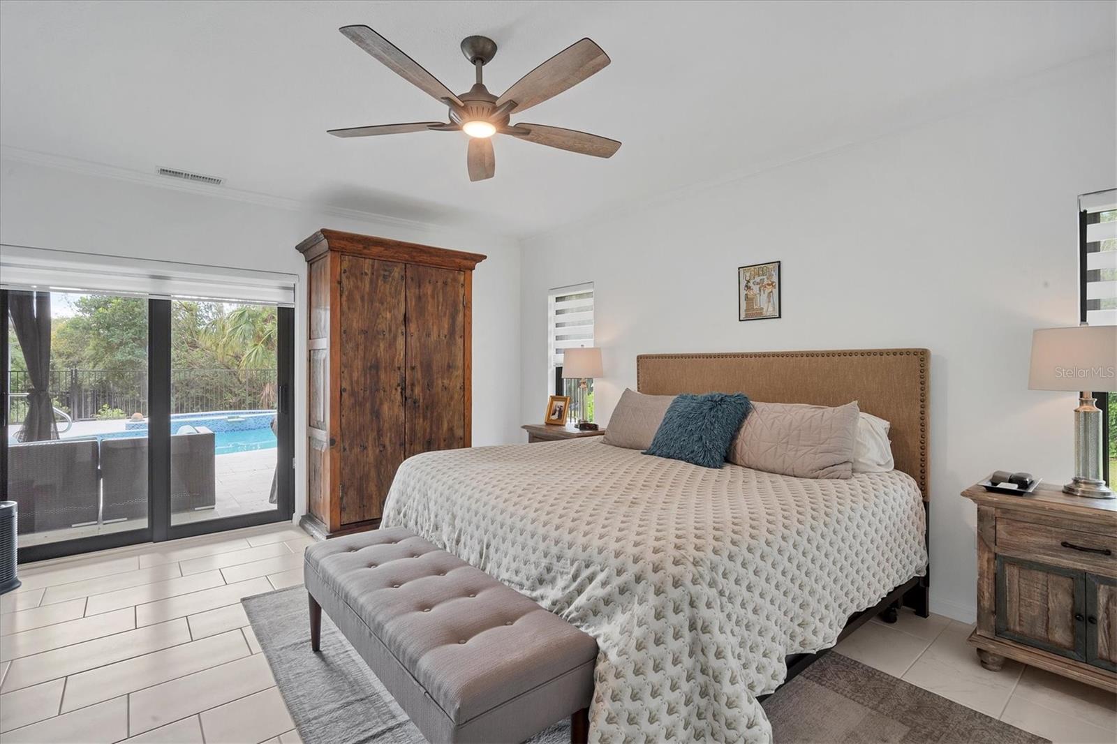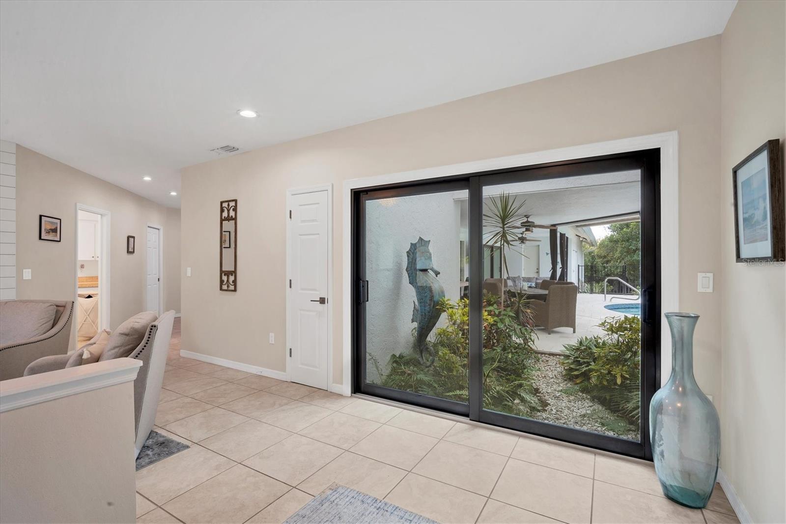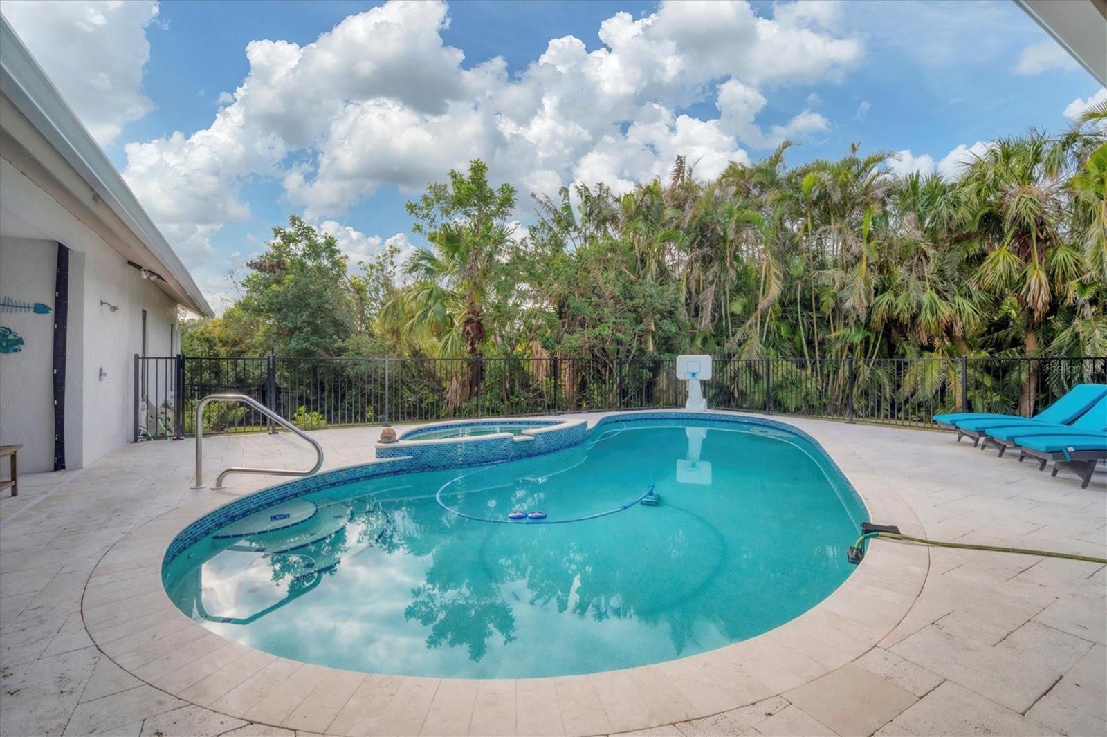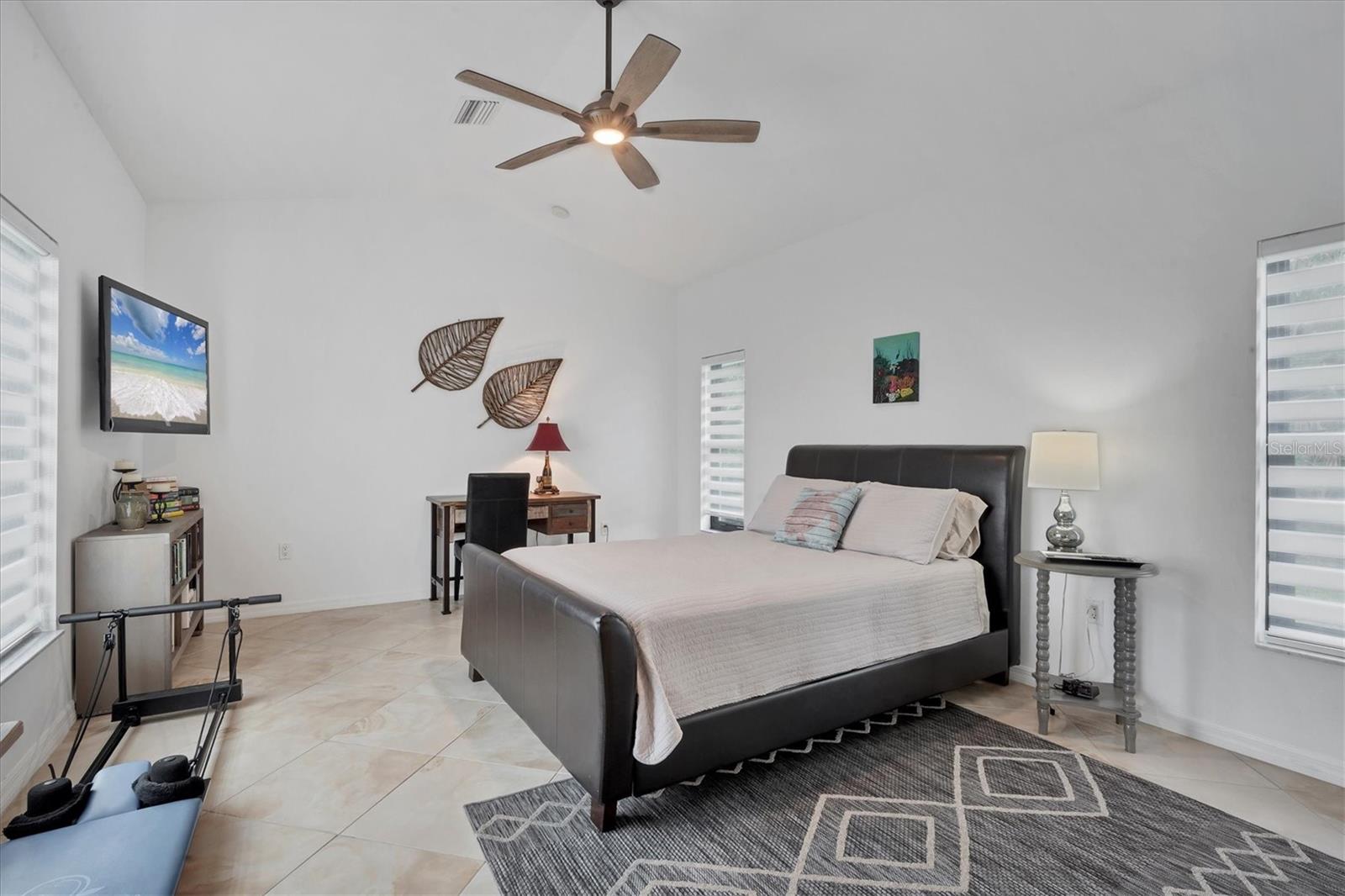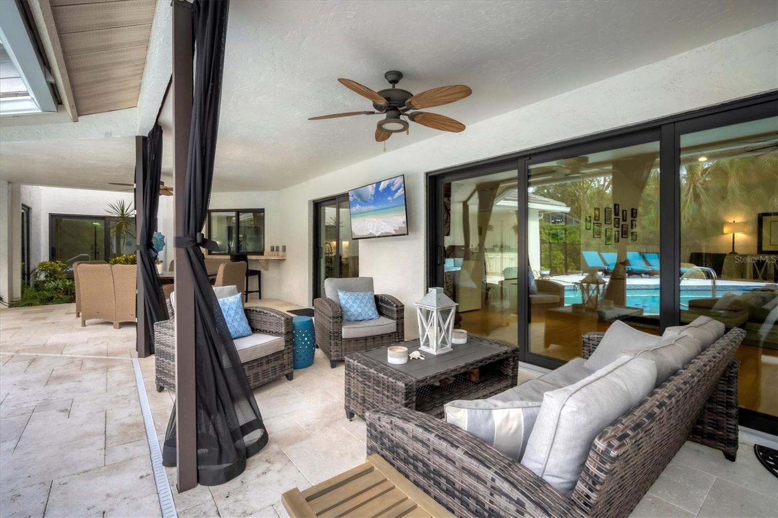 SELLERS ARE MOTIVATED!This home is not a drive-by! It's so much larger than it looks from the curb. Nestled onto a large lot in The Landings; the most sought-after neighborhood West Of The Trail in Sarasota. Spanning over 3000 square feet, it features 4 large bedrooms, (2 with en-suite bathrooms) and an open floor plan with multiple pocket doors for flexibility. The 4th Bedroom is being used as an Office, would also make a nice Den or Music Room. Lots of glass allows the Florida sunshine to bathe the home in light. The primary suite has a large walk-in closet, double vanities, a spa-like bath with a beautiful soaking tub and a step-in shower; sliders that lead out to the sundeck and pool. An open kitchen is the heart of the home & features numerous white cabinets, stainless steel appliances, an island, planning desk and breakfast counter that flows into the dining area where glass sliders lead out to the lanai. A vaulted ceiling and high windows accentuate a wood-burning fireplace with a unique shell/fossil chimney and hearth; making the living room a relaxing oasis where you and your guests will love to gather. Multiple glass sliders open from several rooms to the gorgeous outdoor living space. The sitting area has a wall-mounted TV and drapery screens that can be drawn tight to keep insects away; the dining area has a serving center with a sink & refrigerator. Several loungers will fit around the pool, and there's also an outdoor shower. The sparkling saltwater pool and spa are heated for year-round enjoyment. Residents of The Landings love the stately oaks that line the winding roads; 24-hour guarded gates and the nature trail, fishing pier and kayak launch. Optional membership in the Racquet Club includes tennis, pickle ball, a swimming pool, fitness center, pro shop and scheduled social activities.This sturdy block home has new lighting and ceiling fans; updated bathrooms; new high-impact windows; a new roof; new AC system, an upgraded irrigation system with a well; new pool heater; new fence; an EV charger in the garage and SOLAR PANELS THAT PROVIDE POWER TO THE ENTIRE HOUSE, REDUCING THE ELECTRIC BILL TO $27.00/MONTH!