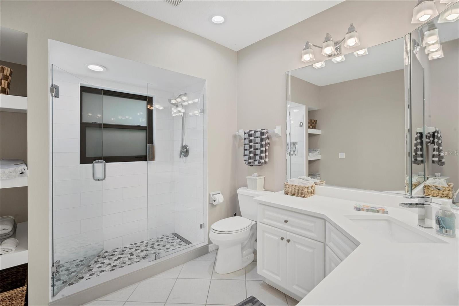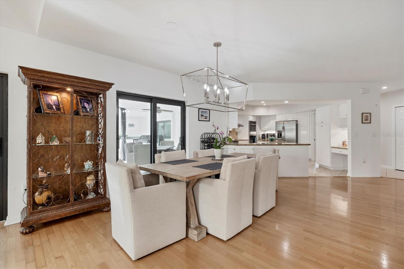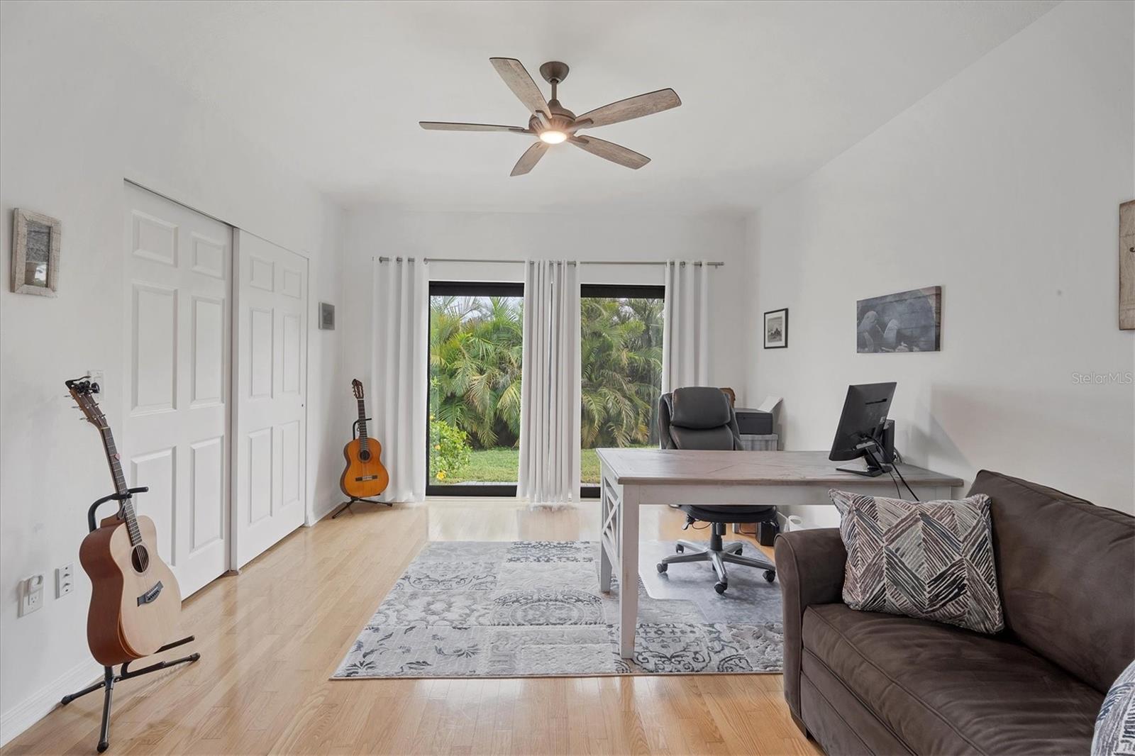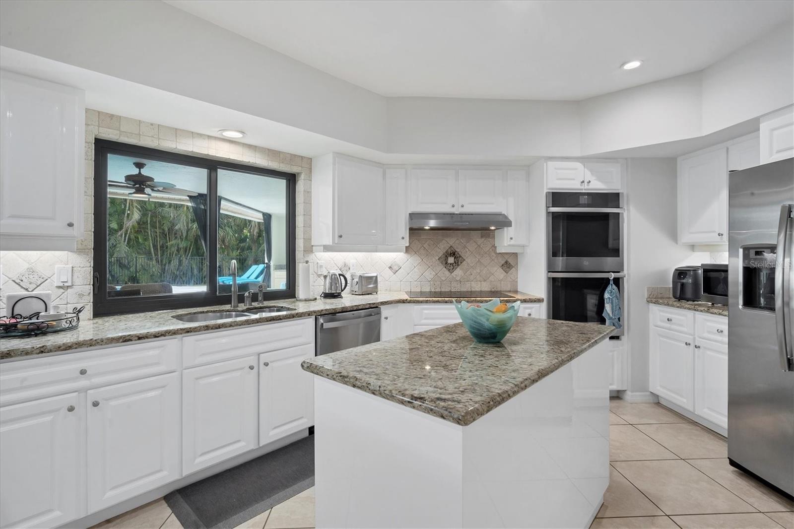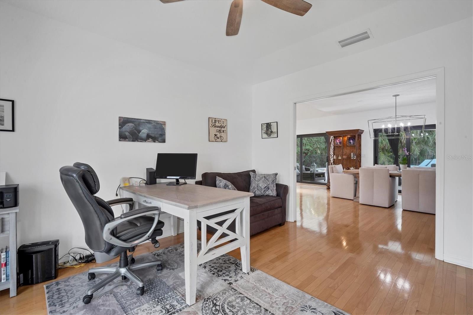 SELLERS ARE MOTIVATED!This home is not a drive-by! It's so much larger than it looks from the curb. Nestled onto a large lot in The Landings; the most sought-after neighborhood West Of The Trail in Sarasota. Spanning over 3000 square feet, it features 4 large bedrooms, (2 with en-suite bathrooms) and an open floor plan with multiple pocket doors for flexibility. The 4th Bedroom is being used as an Office, would also make a nice Den or Music Room. Lots of glass allows the Florida sunshine to bathe the home in light. The primary suite has a large walk-in closet, double vanities, a spa-like bath with a beautiful soaking tub and a step-in shower; sliders that lead out to the sundeck and pool. An open kitchen is the heart of the home & features numerous white cabinets, stainless steel appliances, an island, planning desk and breakfast counter that flows into the dining area where glass sliders lead out to the lanai. A vaulted ceiling and high windows accentuate a wood-burning fireplace with a unique shell/fossil chimney and hearth; making the living room a relaxing oasis where you and your guests will love to gather. Multiple glass sliders open from several rooms to the gorgeous outdoor living space. The sitting area has a wall-mounted TV and drapery screens that can be drawn tight to keep insects away; the dining area has a serving center with a sink & refrigerator. Several loungers will fit around the pool, and there's also an outdoor shower. The sparkling saltwater pool and spa are heated for year-round enjoyment. Residents of The Landings love the stately oaks that line the winding roads; 24-hour guarded gates and the nature trail, fishing pier and kayak launch. Optional membership in the Racquet Club includes tennis, pickle ball, a swimming pool, fitness center, pro shop and scheduled social activities.This sturdy block home has new lighting and ceiling fans; updated bathrooms; new high-impact windows; a new roof; new AC system, an upgraded irrigation system with a well; new pool heater; new fence; an EV charger in the garage and SOLAR PANELS THAT PROVIDE POWER TO THE ENTIRE HOUSE, REDUCING THE ELECTRIC BILL TO $27.00/MONTH!