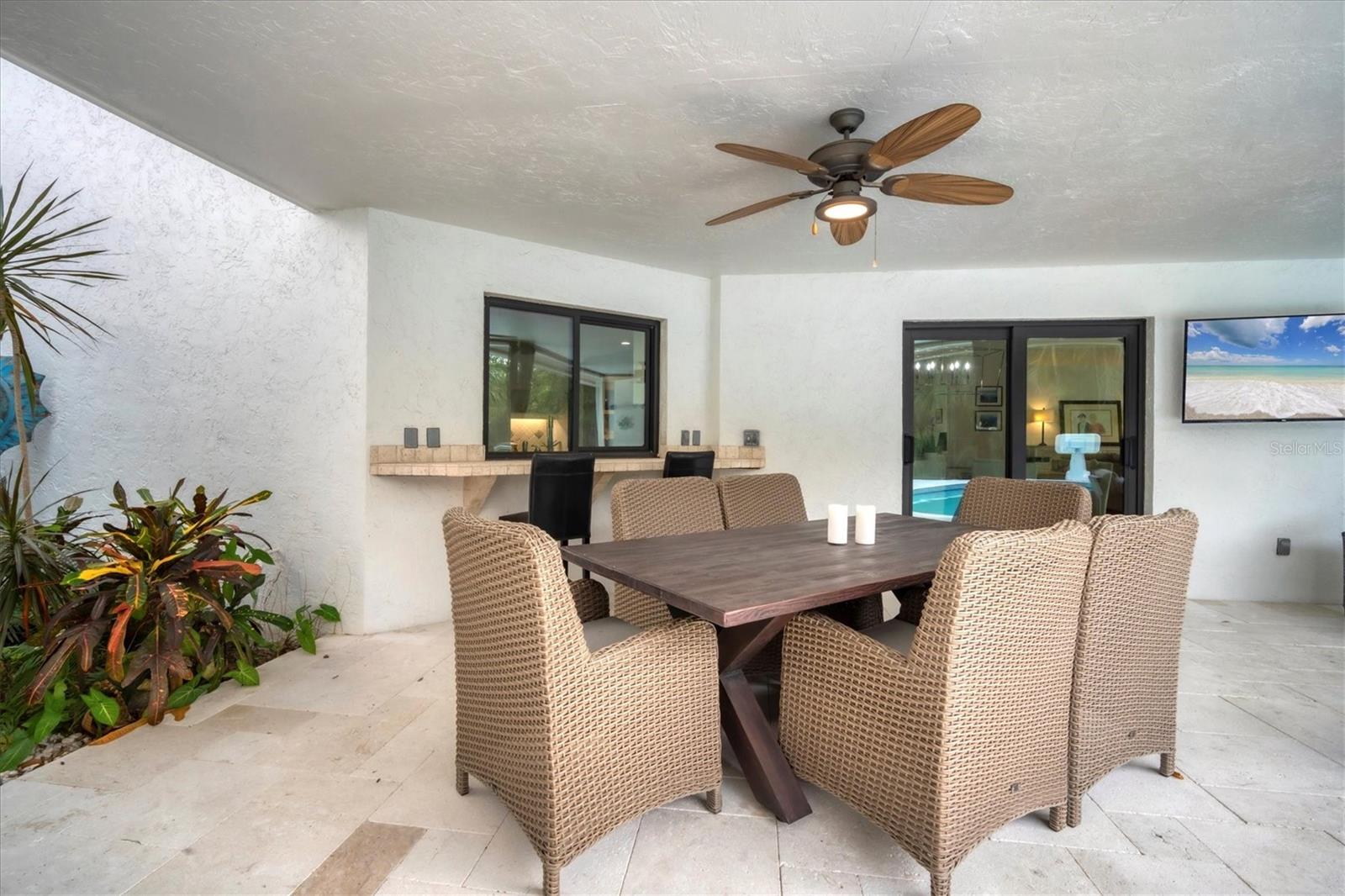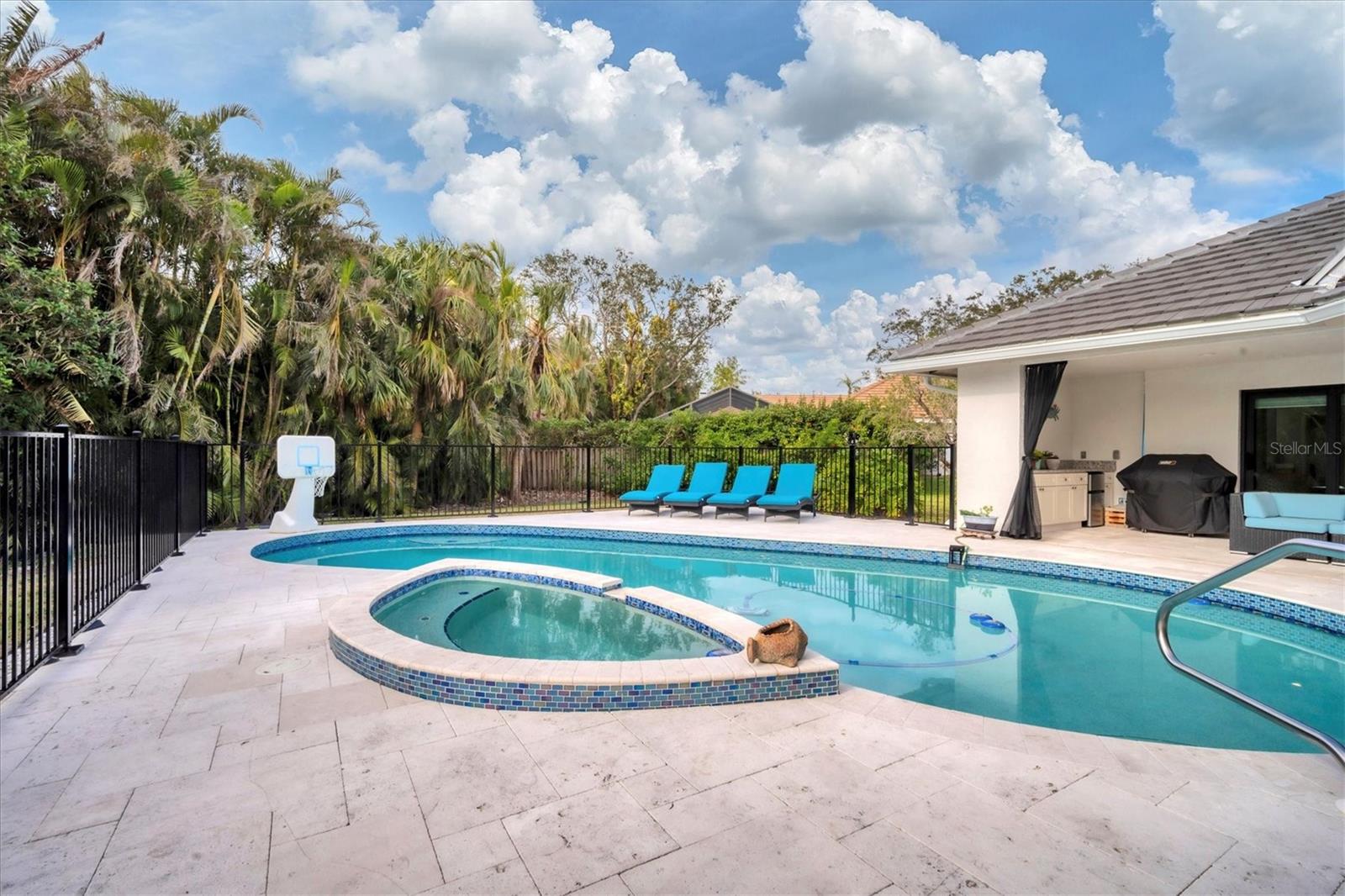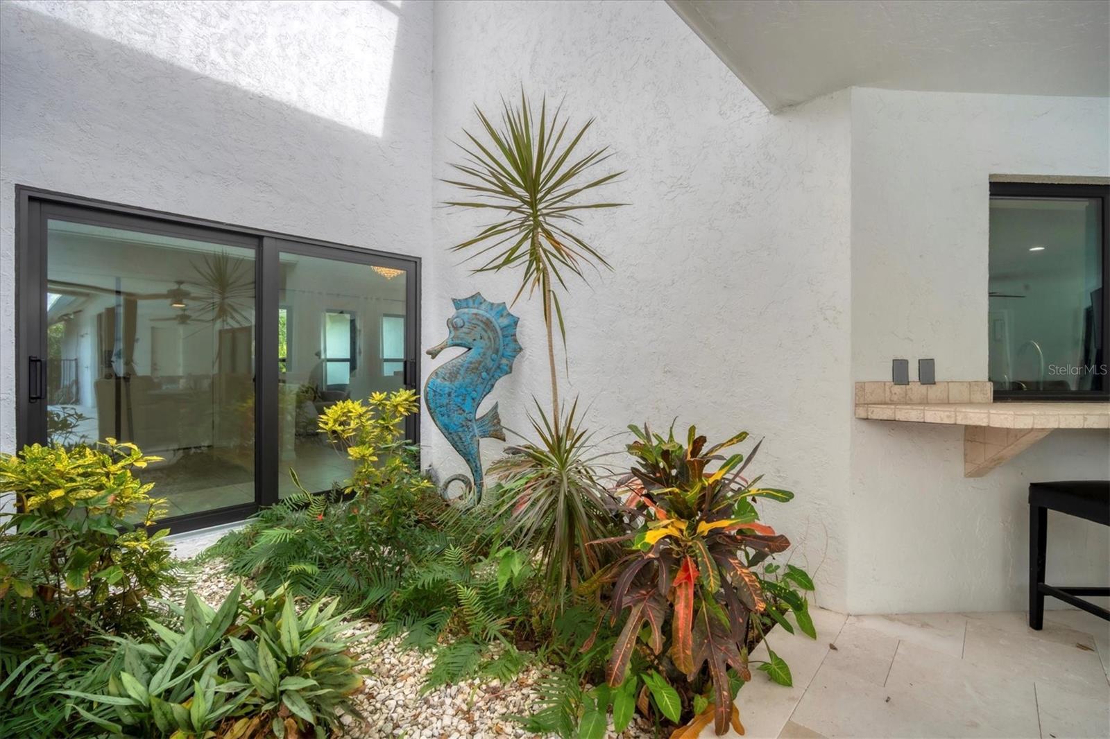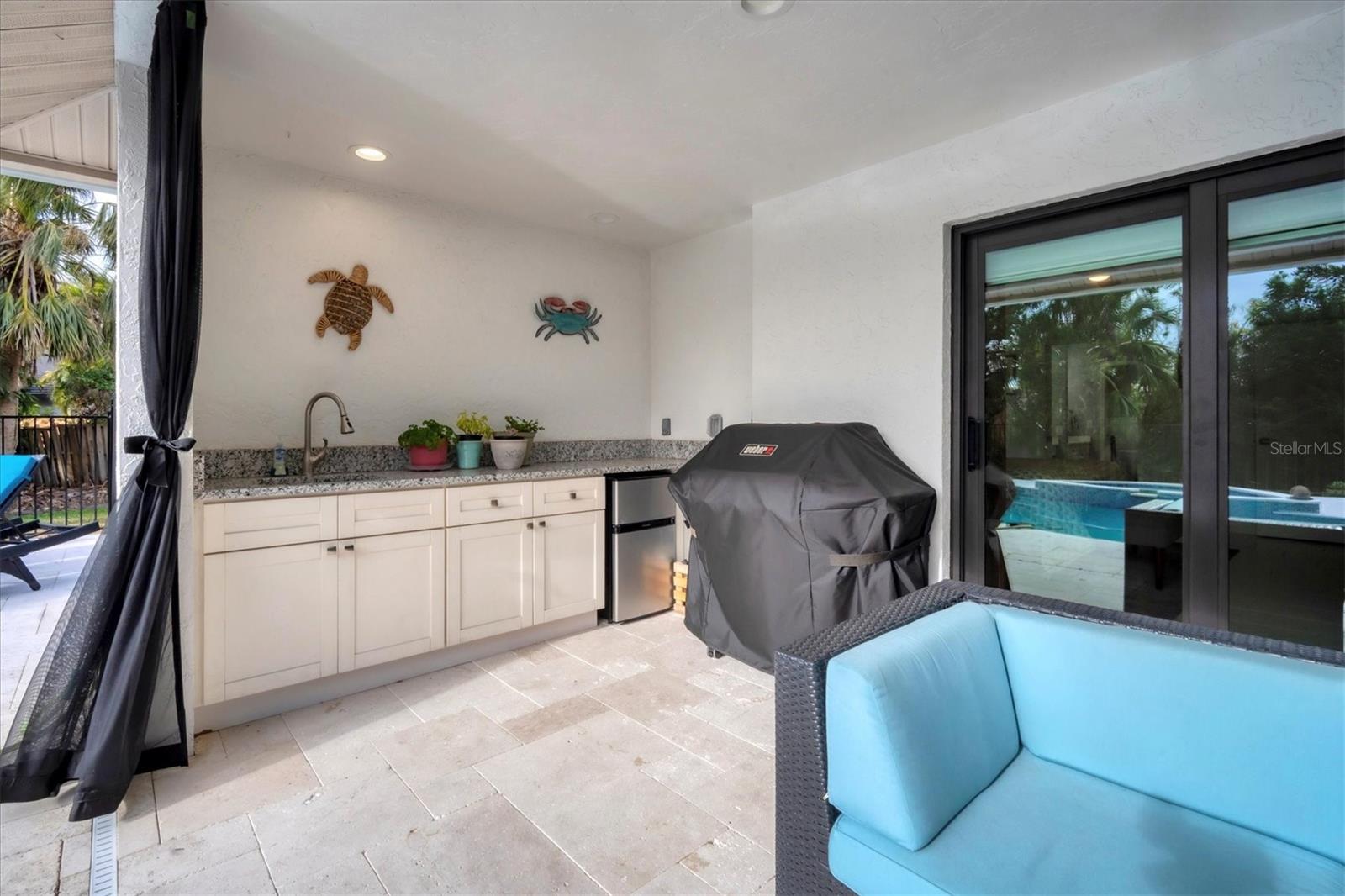 - Exterior: Outdoor Kitchen, Outdoor Shower, Private Mailbox, Rain Gutters, Sliding Doors