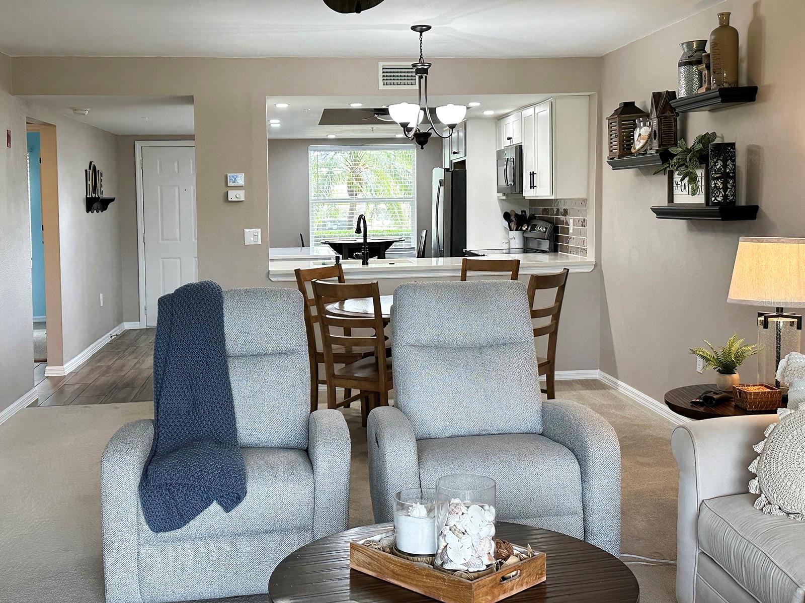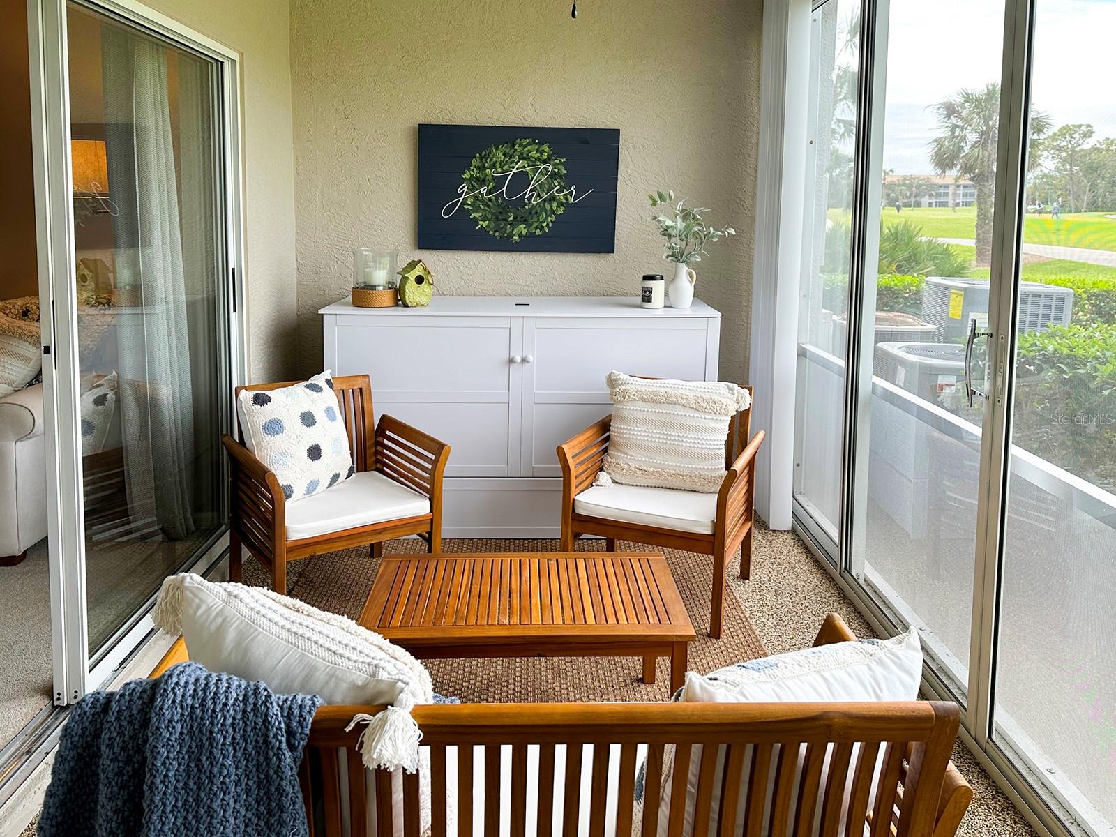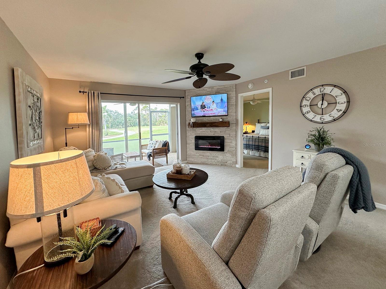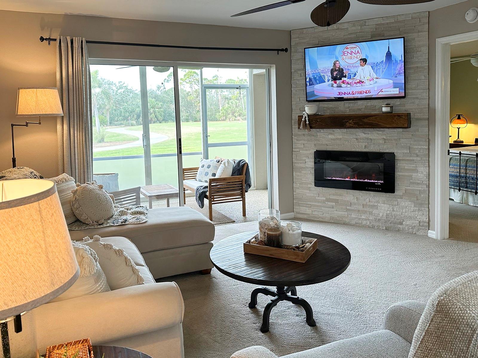 Your dream lifestyle awaits at Stoneybrook Golf and Country! Discover the perfect blend of comfort, convenience and community with this stunning 2 bedroom, 2 bath condo, ideally located on the first floor - no stairs to navigate! Tastefully furnished, this thoughtfully designed home offers a spacious living area featuring a serene, custom corner fireplace, perfect for relaxing evenings. Enjoy breathtaking, long views of the golf course and pond, all from a glass enclosed lanai with a bonus storage area. The redesigned kitchen is a chef's delight with the center island, abundance of quartz countertops and cabinets, enhanced by a clever wall removal for an open, modern feel. The master suite retreat has an updated bath with a large walk-in shower, vanity and generous walk-in closet. The guest ready second bedroom is ideal for hosting, while the attractive laundry rooms adds extra storage and convenience. Murphy bed on lanai for extra guests. The community perks, included with your purchase, are beyond compare! Stoneybrook offers an exceptional array of amenities to enrich your lifestyle. Whether you are a sports enthusiast or enjoy social gatherings, you will find something for everyone. The recreational facilities include golf (totally renovated and redesigned), tennis, pickleball, bocce, swimming, and a state-of-the-art fitness center. The active social calendar has monthly Bingo, Trivia, Mahjong, yoga, book clubs, movie nights and more. You will dine in style at the full-service restaurant or join one of many events. Nestled within 500+ acres of natural beauty, Stoneybrook is a sanctuary for wildlife, including birds and other native species. Whether you are seeking a year-round residence or a smart investment property with a liberal rental policy, this condo is your gateway to resort-style living at its finest.