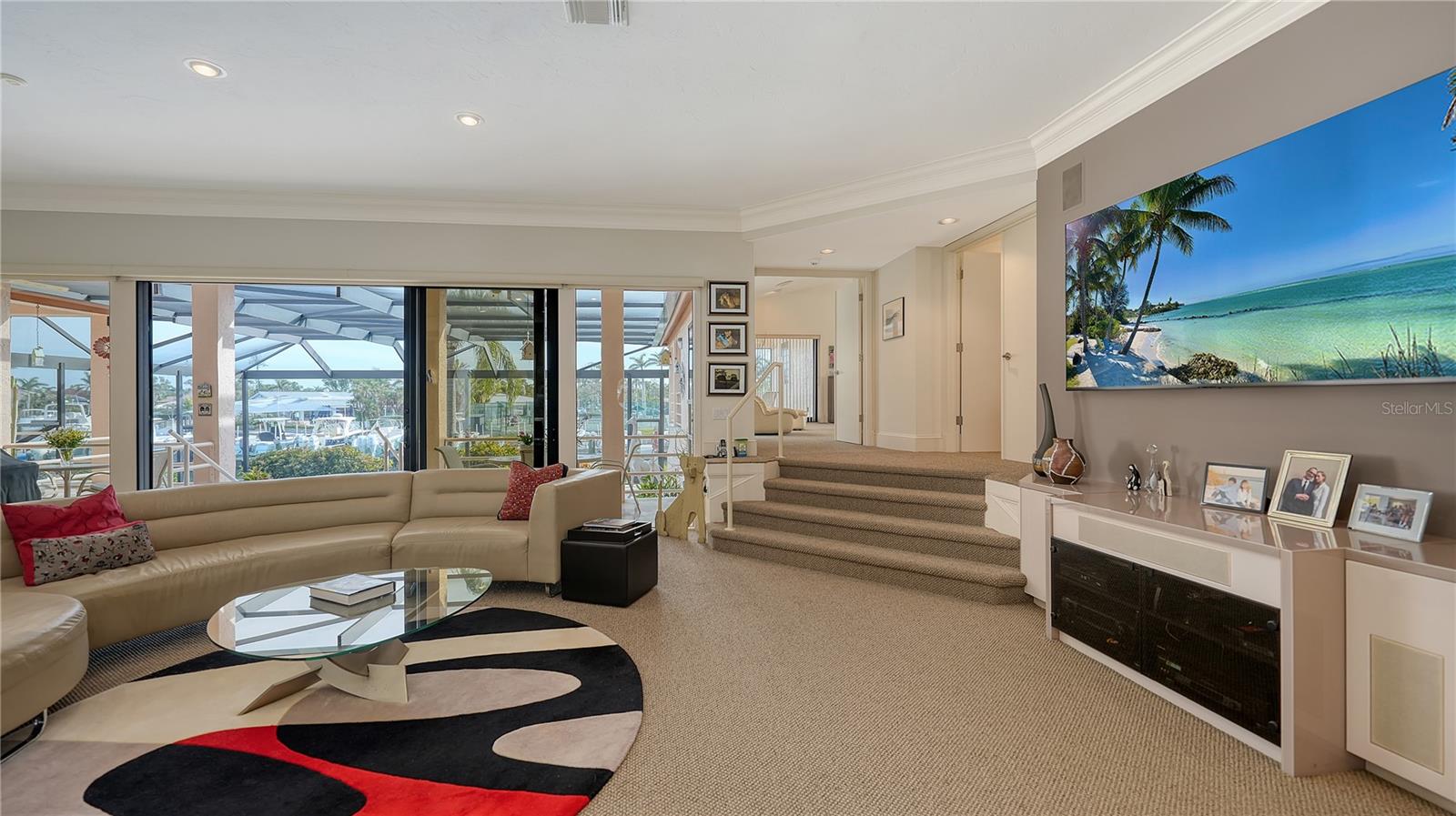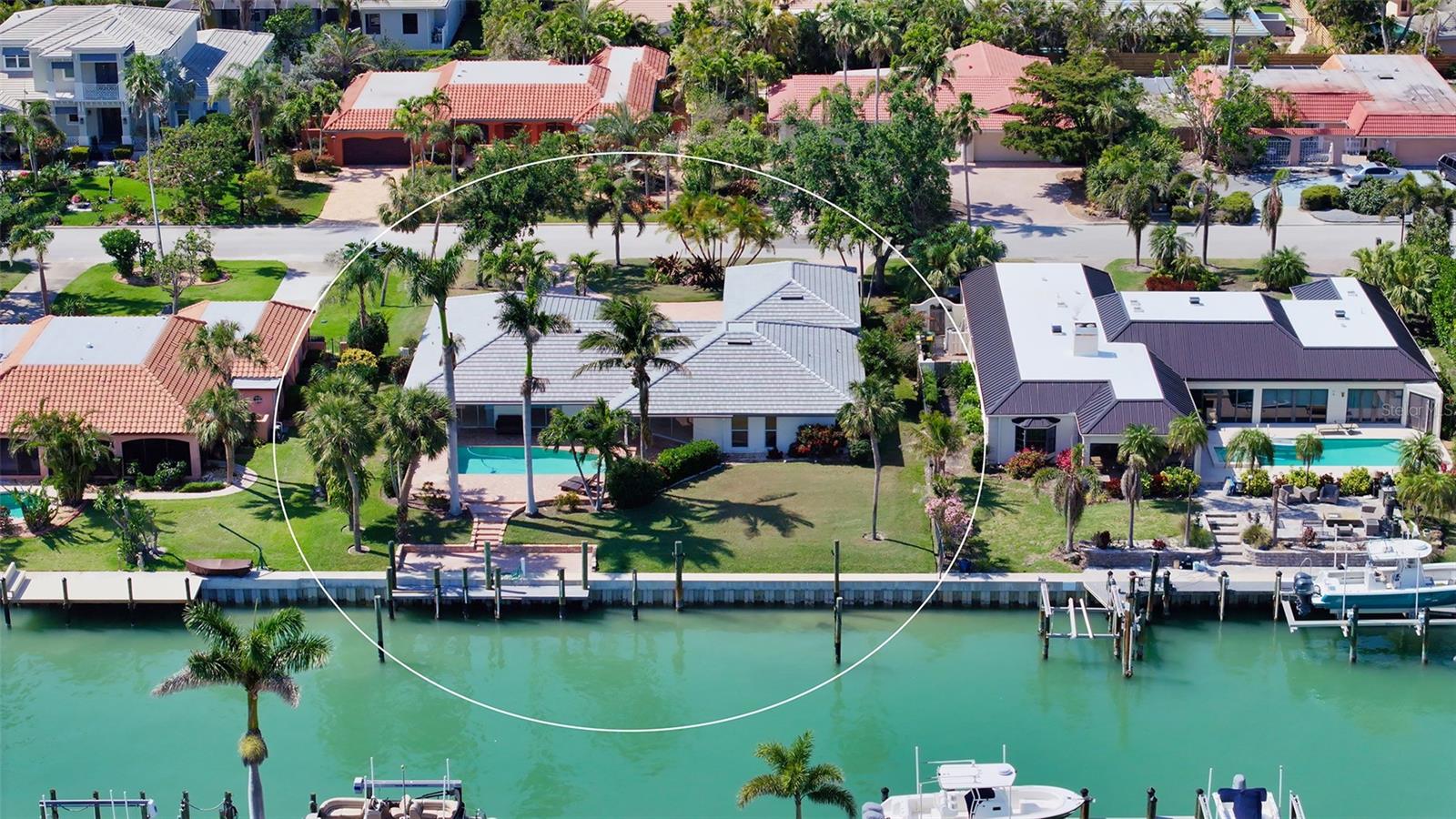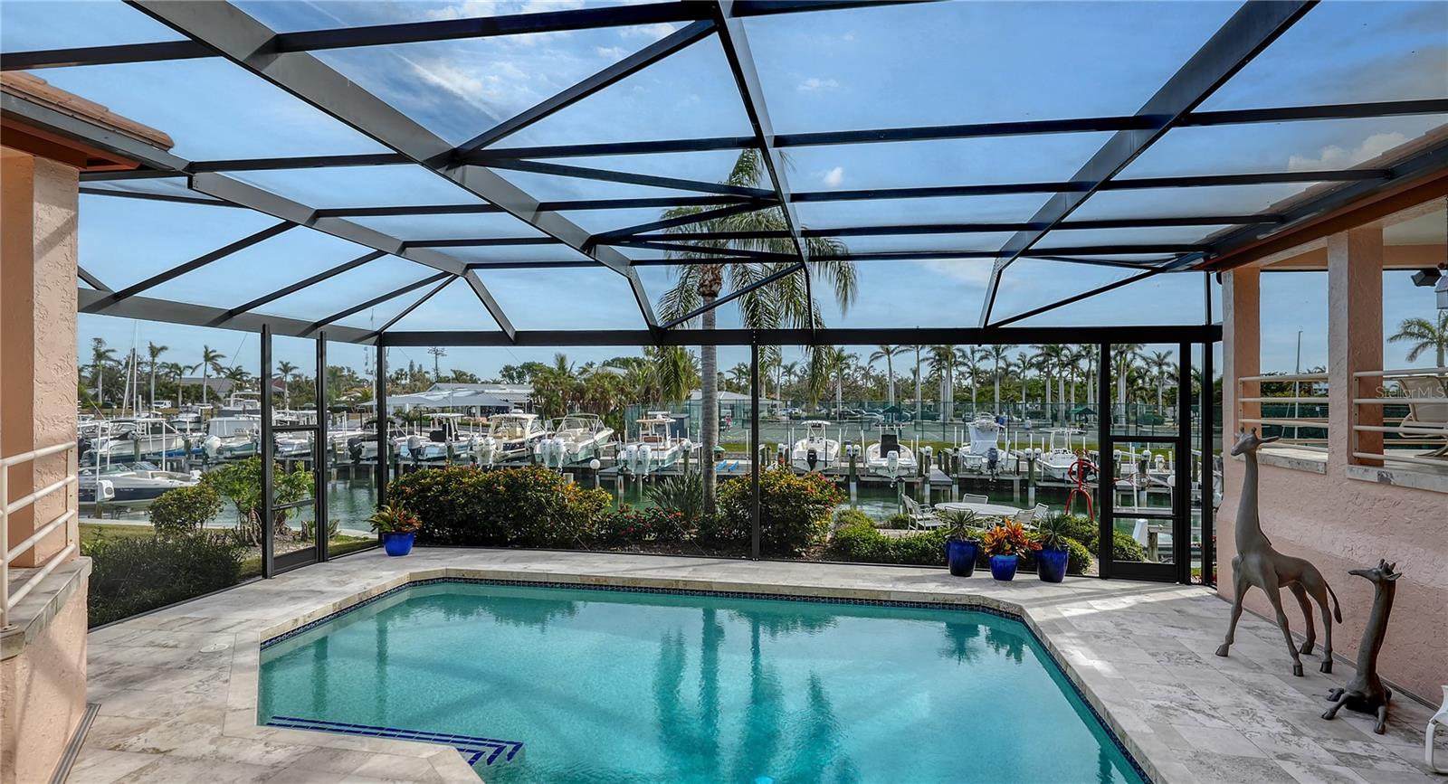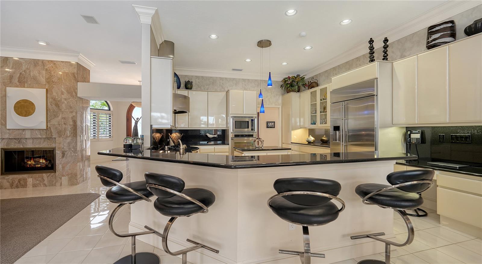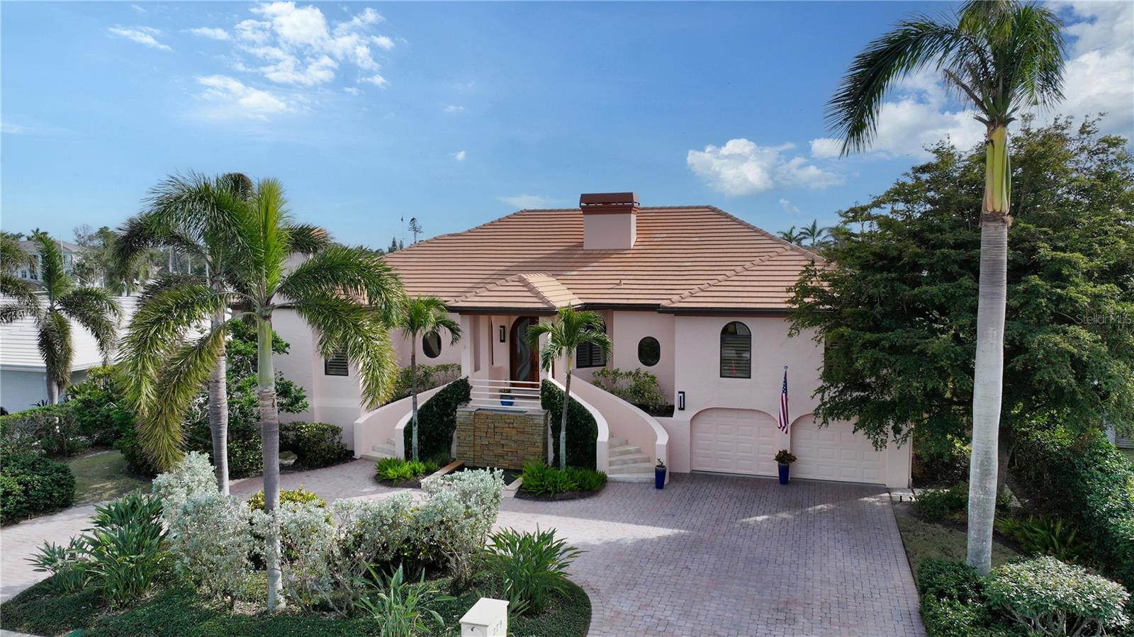 This impeccably maintained waterfront home is nestled in the exclusive Bird Key community, offering an extraordinary blend of privacy and direct, deep-water boating access. Spanning nearly 4,000 square feet, this elevated three-bedroom plus den and family room residence is designed to maximize its marina views, creating a seamless connection between indoor and outdoor living. A grand entryway welcomes you into a thoughtfully designed interior filled with natural light, soaring ceilings, multiple fireplaces, and expansive glass sliders that frame the picturesque waterfront. The open-concept living and dining areas create an effortless flow, while the gourmet kitchen is equipped with sleek countertops, custom cabinetry, island, breakfast bar, and built-in desk. A cozy breakfast nook overlooks the water, providing a serene space to start your day. The split-bedroom floor plan ensures privacy for both residents and guests. The primary suite is an oversized luxurious retreat, featuring private access to the waterfront pool deck, walk-in closets, and lovely en-suite bathroom with dual vanities, soaking tub, and walk-in shower. The guest suites are equally inviting, each offering a sunny ambiance and ample space. A highlight of this home is the dedicated office/library with walls of built-ins, perfect for working from home or enjoying a private reading space. Additional features include a custom wet bar room with temperature-controlled wine storage and abundant storage throughout. Outdoor living is a dream with a screened-in lanai, heated pool, and multiple seating areas designed for relaxation and entertaining. The property also includes a 12,000-pound boat lift with direct access to Sarasota Bay and the Gulf of Mexico, making it ideal for boating enthusiasts. Bird Key is one of Sarasota's most coveted waterfront neighborhoods, known for its prime location and exceptional amenities. Residents enjoy proximity to the Bird Key Yacht Club, with its dining, tennis, and marina facilities. Just minutes away, St. Armands Circle offers boutique shopping, fine dining, and cultural attractions, while downtown Sarasota boasts world-class theaters, galleries, and entertainment venues. This waterfront sanctuary combines an unparalleled lifestyle with the best of coastal living.