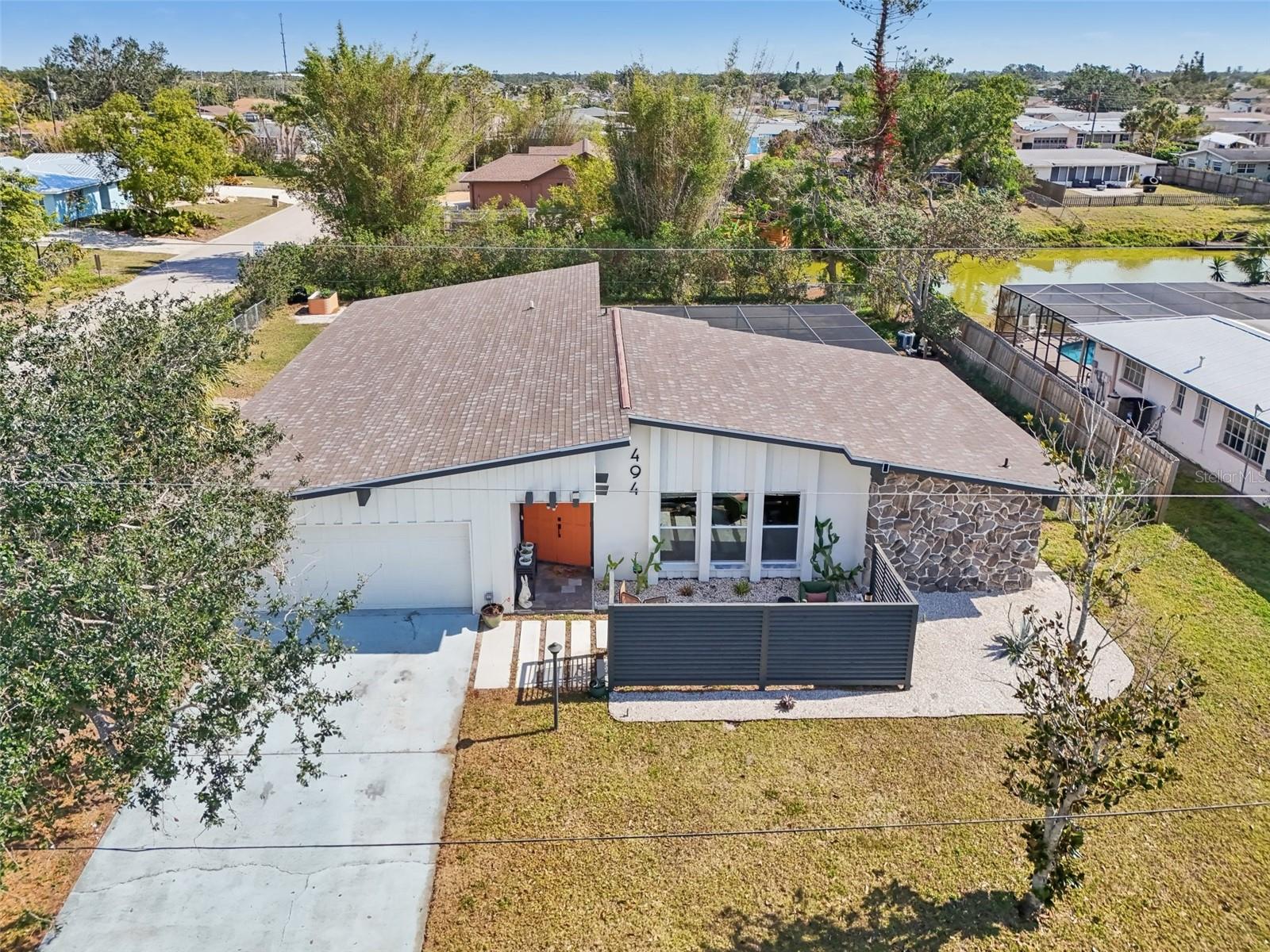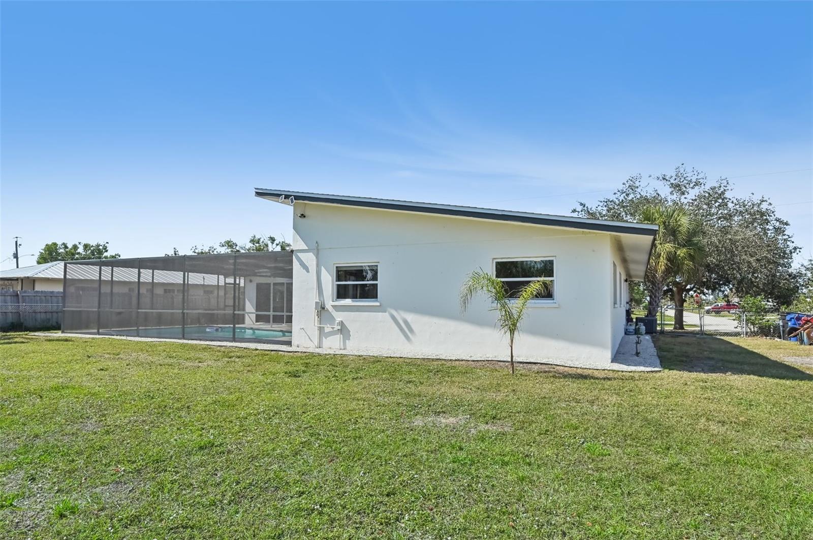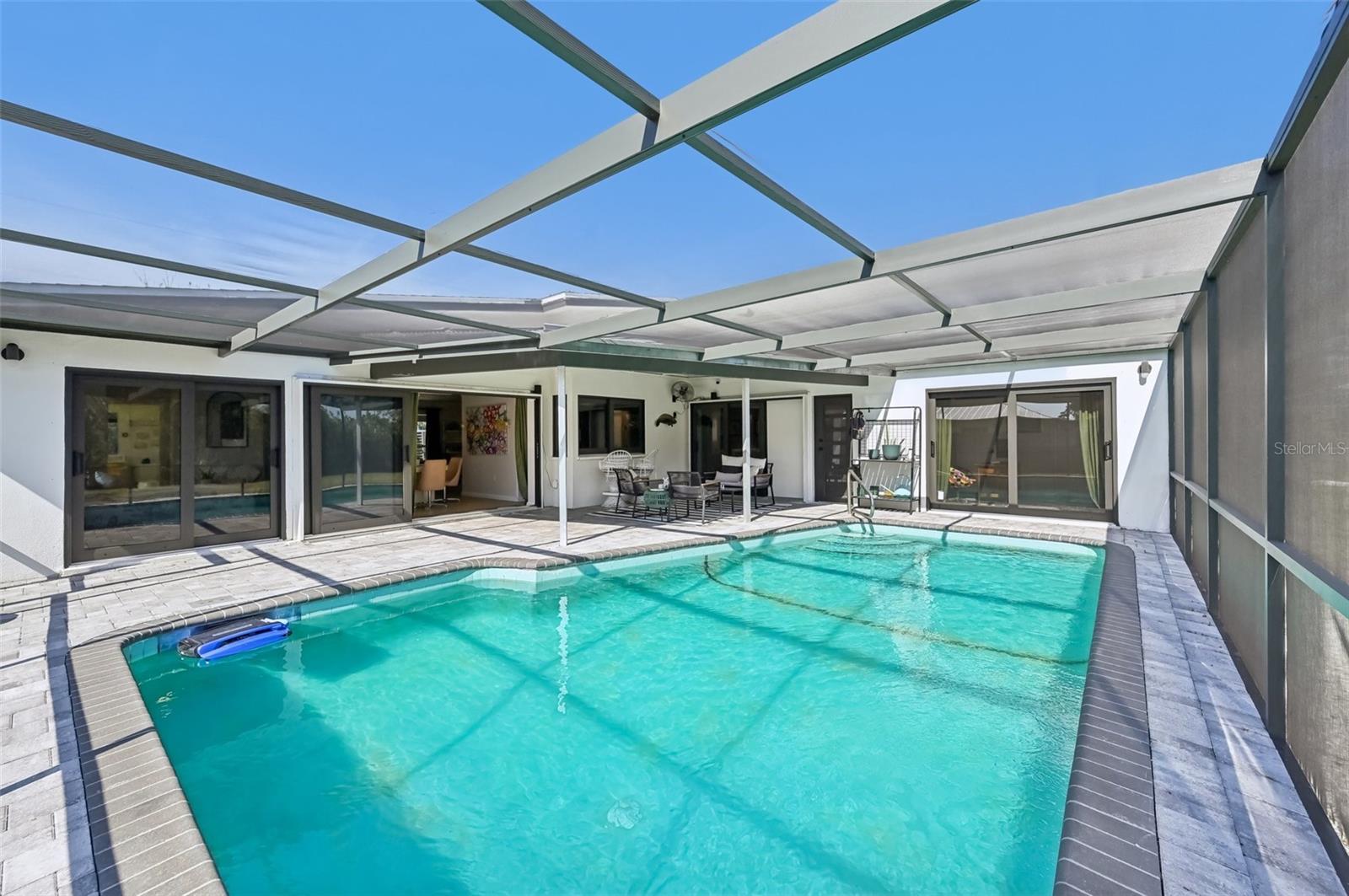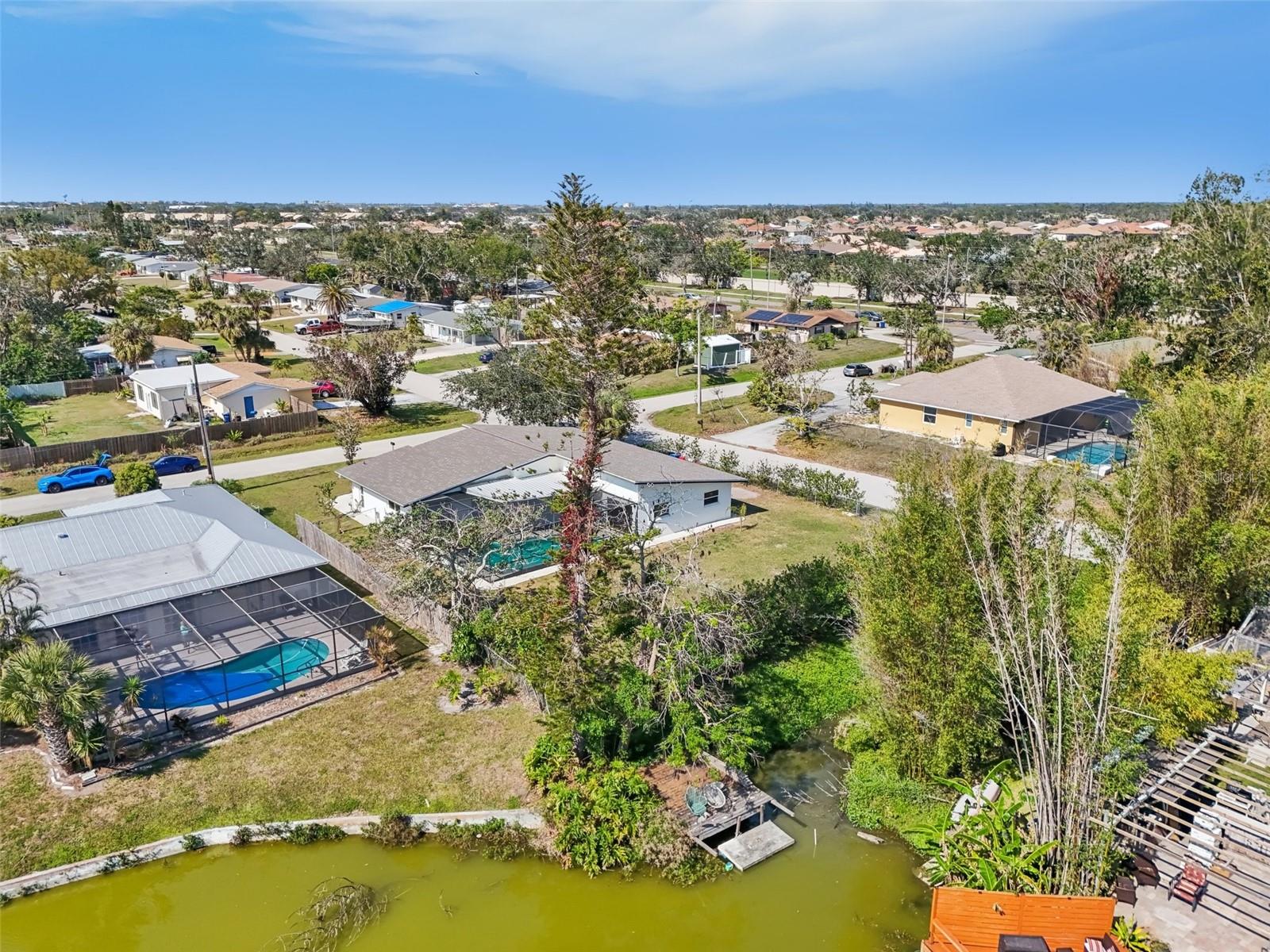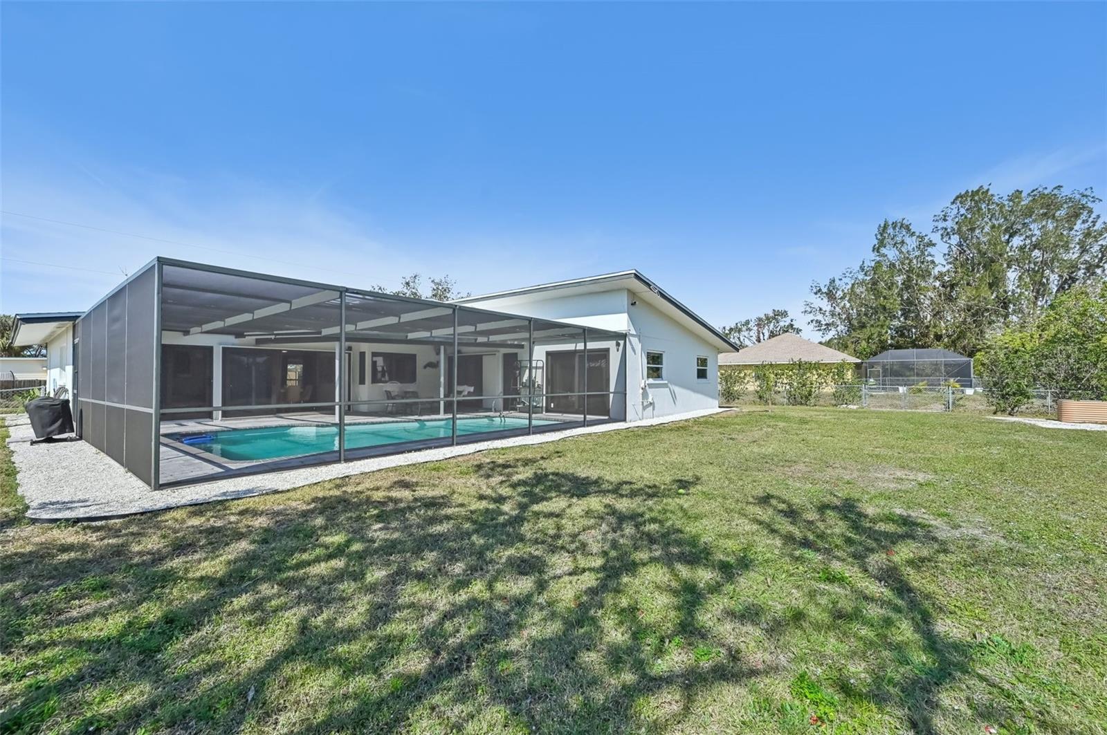 Stunning Lakefront Home with Pool & Countless Upgrades. This four-bedroom two-bath home is situated on an oversized corner lot in the heart of Venice. This spacious and meticulously maintained residence features a private front patio with pavers and a bright, inviting living room with newer floor-to-ceiling windows. The desirable split floor plan offers privacy, with the primary suite positioned to the right of the kitchen, featuring his-and-her walk-in closets and an en-suite bath. On the left side of the home, a cozy eat-in area with additional sliders to the lanai and a built-in desk/bar leads to a versatile bonus room, ideal for a home office. Down the hall, three spacious guest bedrooms offer ample closet space, including one with direct pool access, while the second bathroom conveniently features an exterior door to the pool area. At the center of the home, the beautifully updated kitchen boasts cherry cabinets, stainless steel appliances, a breakfast bar, and a passthrough window to the lanai, making it perfect for entertaining. Adjacent to the kitchen, the dining area opens to the lanai through sliding glass doors, seamlessly blending indoor and outdoor living. The outdoor space is a true retreat, designed for relaxation and entertaining. A large screened lanai with updated pavers (2022) overlooks the heated pool and fully fenced backyard, which leads to a private deck with lake access. Lush custom desert landscaping enhances the tranquil setting. This home has been thoughtfully updated with a new roof (2020), hurricane-impact sliders and pool lanai door (2024), new windows (2021) with N60 heat-control film, a 200-amp electrical service and panel (2021), a whole-home surge protector, and a complete SimpliSafe security system ($4,000). Additional updates include a refrigerator and dishwasher (2022), a Wi-Fi-enabled hot water heater (2022), a generator/RV hookup, and an updated A/C system (2017). With no HOA restrictions, this property provides exceptional flexibility for boat or RV owners. Ideally located in central Venice, residents enjoy easy access to top-rated restaurants, shopping, recreation, and Venice Island's beautiful beaches. Optional membership in the Venice Gardens Civic Association offers access to a community pool, park, playground, and events for just $165 annually. Best of all, this home is NOT in a flood zone. Don't miss this rare gem--schedule your showing today!