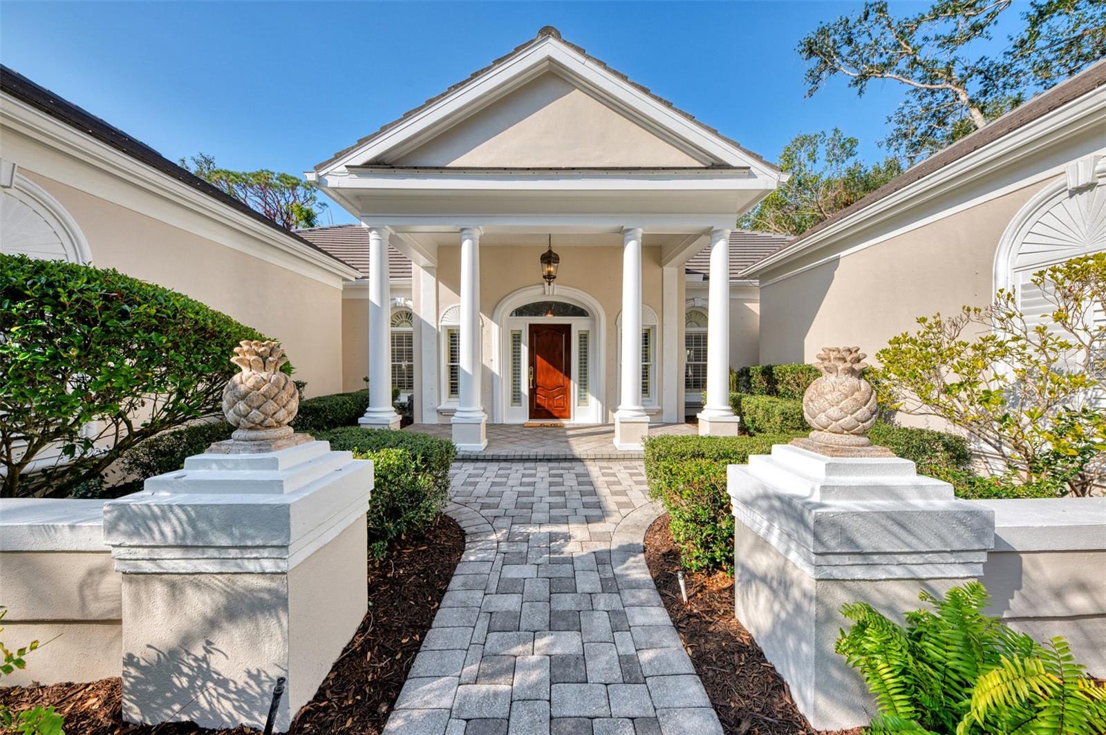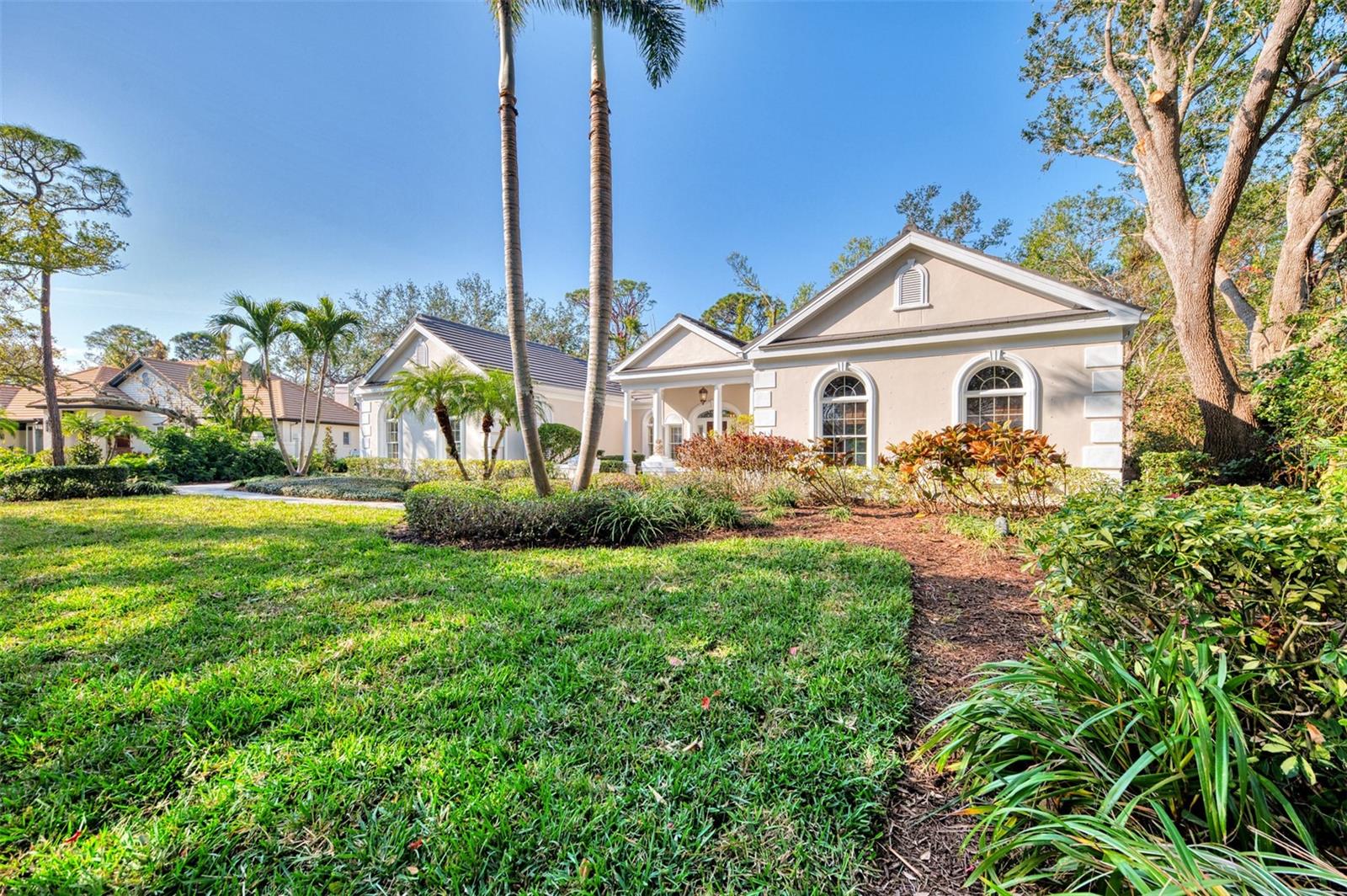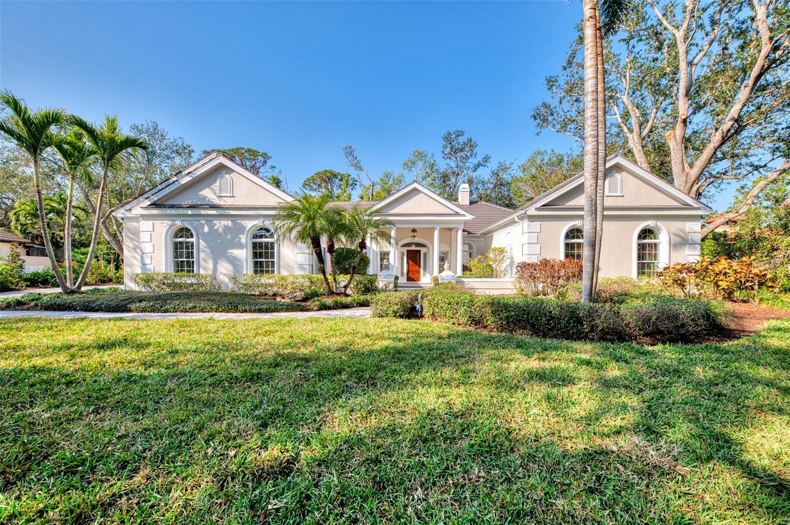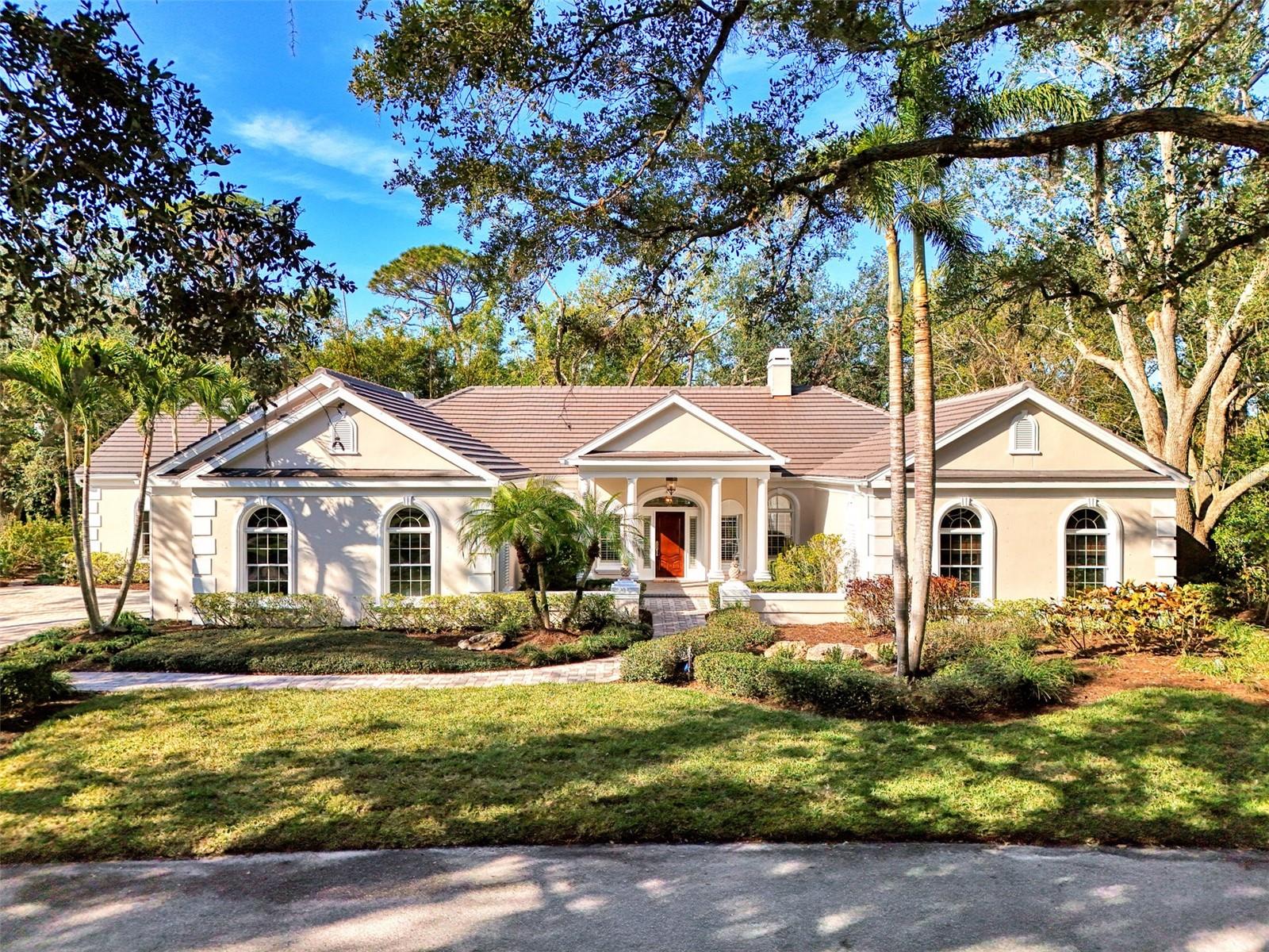 This is your rare chance to claim a spectacular estate in Sarasota's premier golf and country club community THE OAKS. This elegant home seamlessly blends timeless architecture with resort-style living. Beyond the private gates, step into over 4,000 square feet of refined interiors featuring dramatic ceilings, architectural columns, and panoramic views. The expansive layout includes 4 bedrooms, 5 bathrooms, formal and casual living spaces, and an executive Office/Den/Bourbon Tasting Room.The gourmet kitchen is perfectly equipped for culinary entertainment, with custom cabinetry, premium appliances, and a spacious island that flows into the family room. A luxurious owner's suite provides a private sanctuary with jetted bath, 3 walk-in closets, and direct access to the pool terrace.Outdoors, your personal retreat awaits: a heated pool and spa, covered dining and lounge areas, separate firepit area, and tropical landscaping. Membership to The Oaks Country Club is mandatory. You can decide on a Social Membership or a Full Golf Equity Membership. Details attached. Club amenities include: 36 holes of golf, tennis, pickleball, croquet, 3 dining options, fitness, community pool/spa. Situated minutes from world-class beaches, fine dining, and downtown Sarasota's cultural attractions. Make this your new home in Paradise!Crypto currency offers considered. Call for more information.