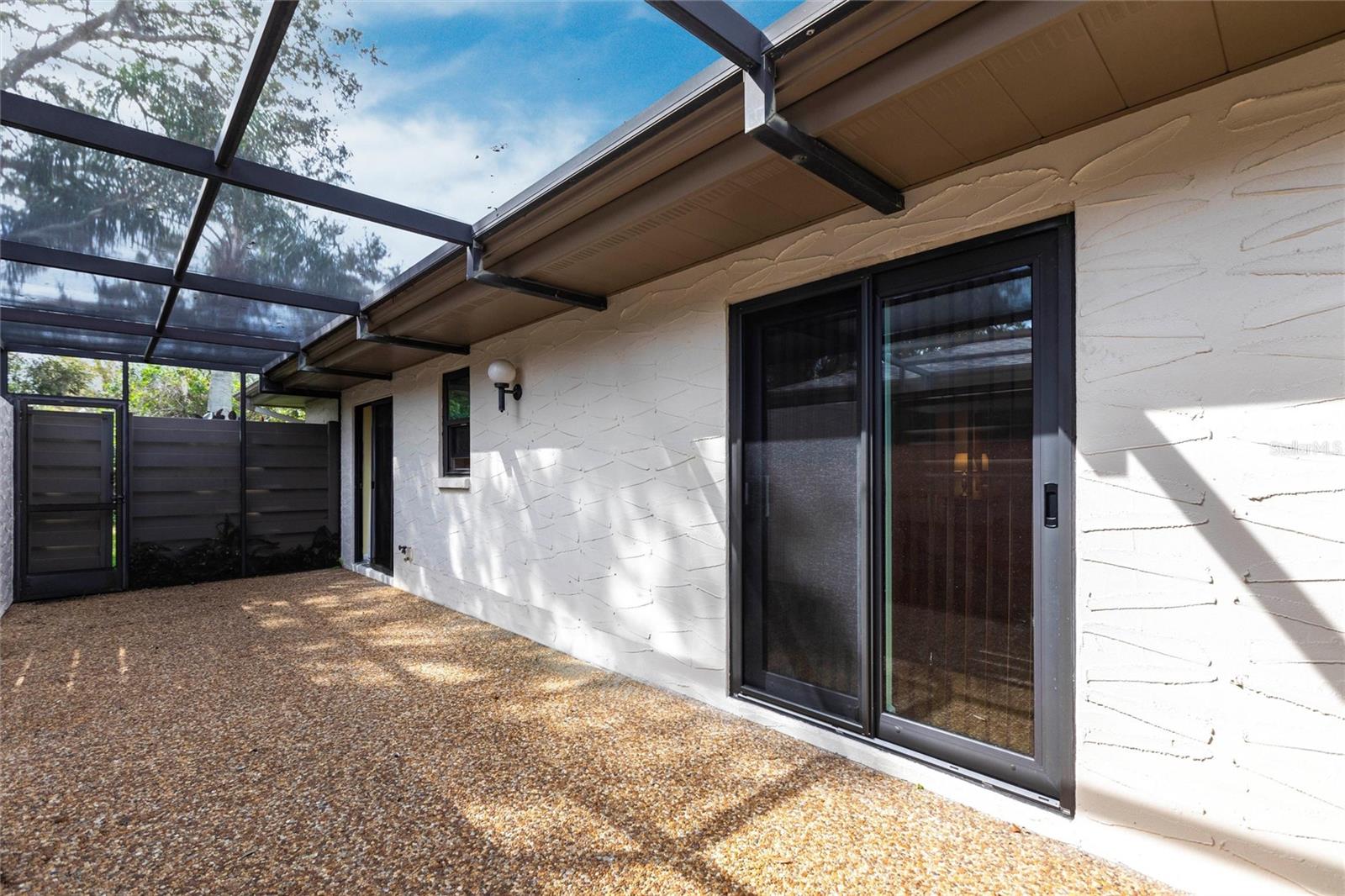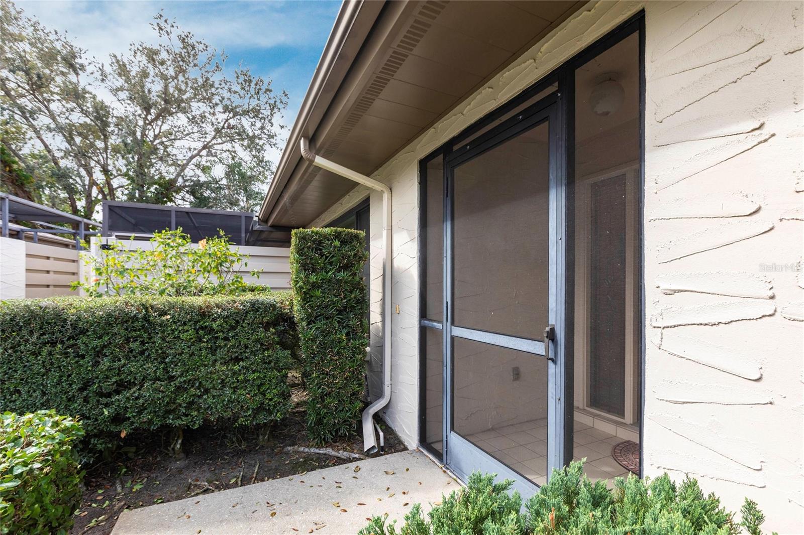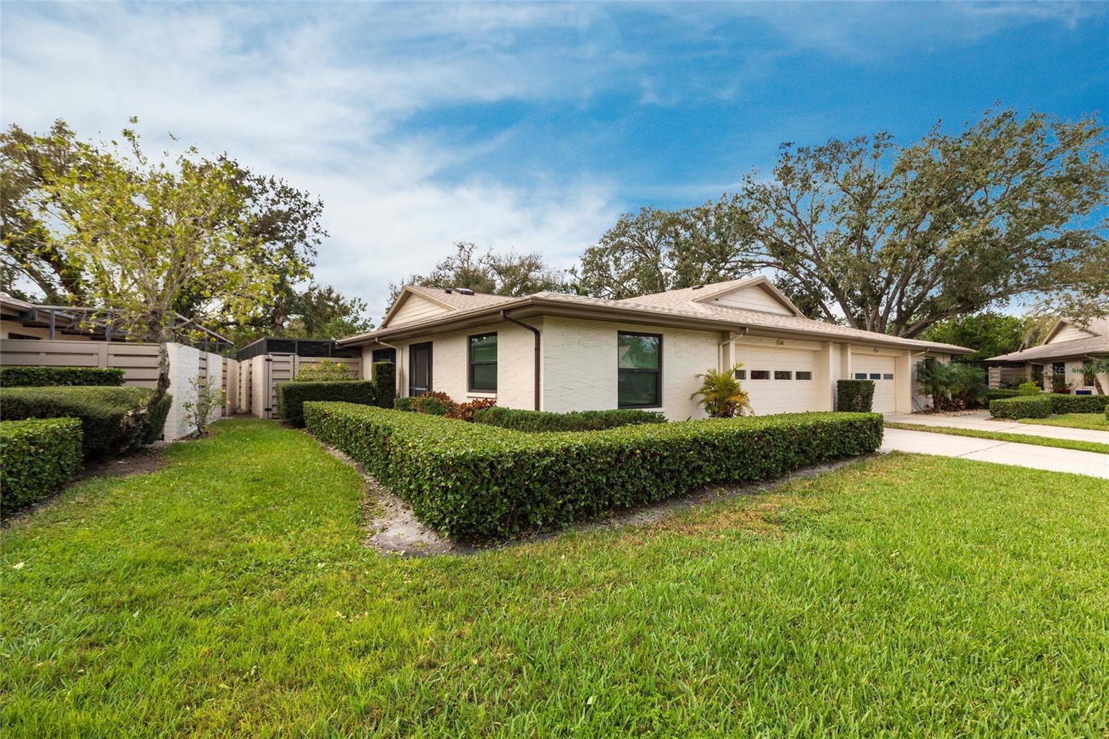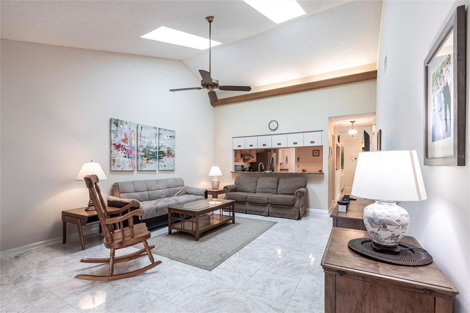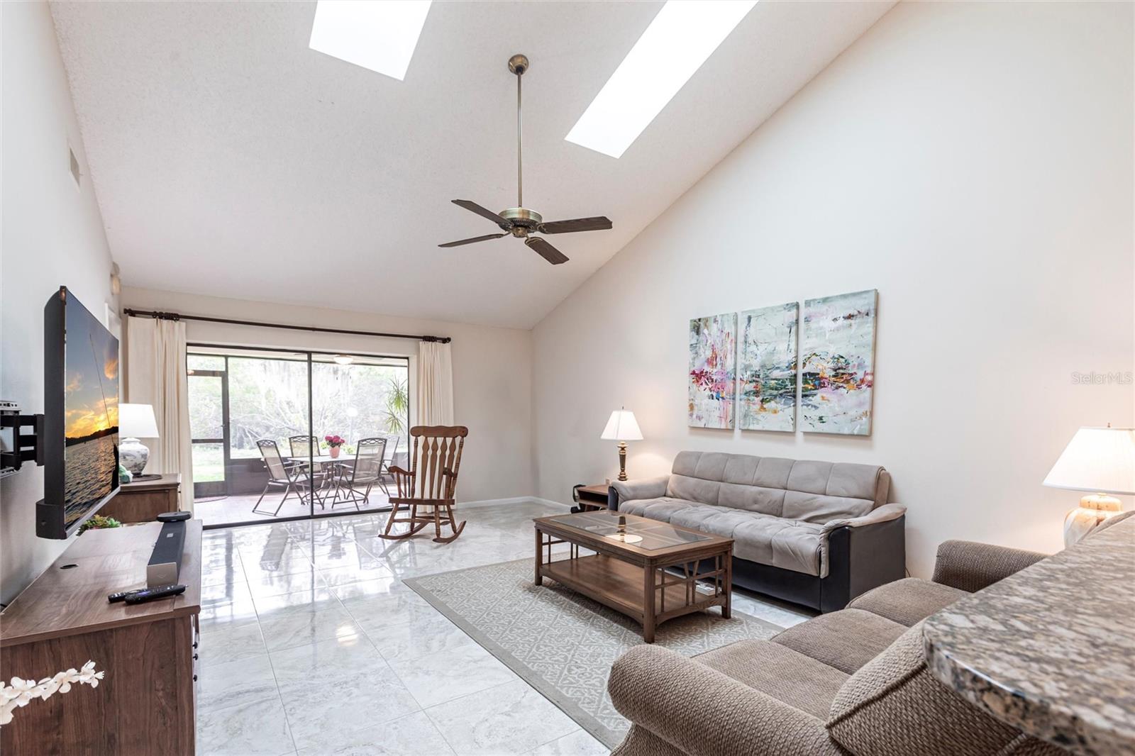 Lovingly updated and maintained, this is an incredible opportunity in Center Gate Estates with over 2000 sq ft of living space, located on a quiet cul-de-sac and close to the community pool. You'll have peace of mind with a new roof, hurricane windows, slider, and garage door. The kitchen was opened with pass-throughs to bring in natural light and ease of entertaining, while it also features updated appliances. The expansive primary suite features a walk-in closet, an ensuite bathroom with a double vanity, separate water closet with a bidet, and a sliding glass door to a private patio. The second bedroom is located conveniently next to the hall bathroom and has access to the patio via the sliding glass doors. French doors open into the third bedroom, which is currently used as a home office. The living room has a dining area, located handily beside the kitchen, and features a large picture window. The spacious family room has vaulted ceilings and skylights were added to welcome even more natural light. Relax on the screened porch with views of the lush greenspace, or open the sliding doors to expand your living area seamlessly. The laundry room features built-in cabinetry and is located off the two-car garage. Take advantage of maintenance-free living in Center Gate Estates, which is located close to shopping, restaurants, and just minutes to I-75.