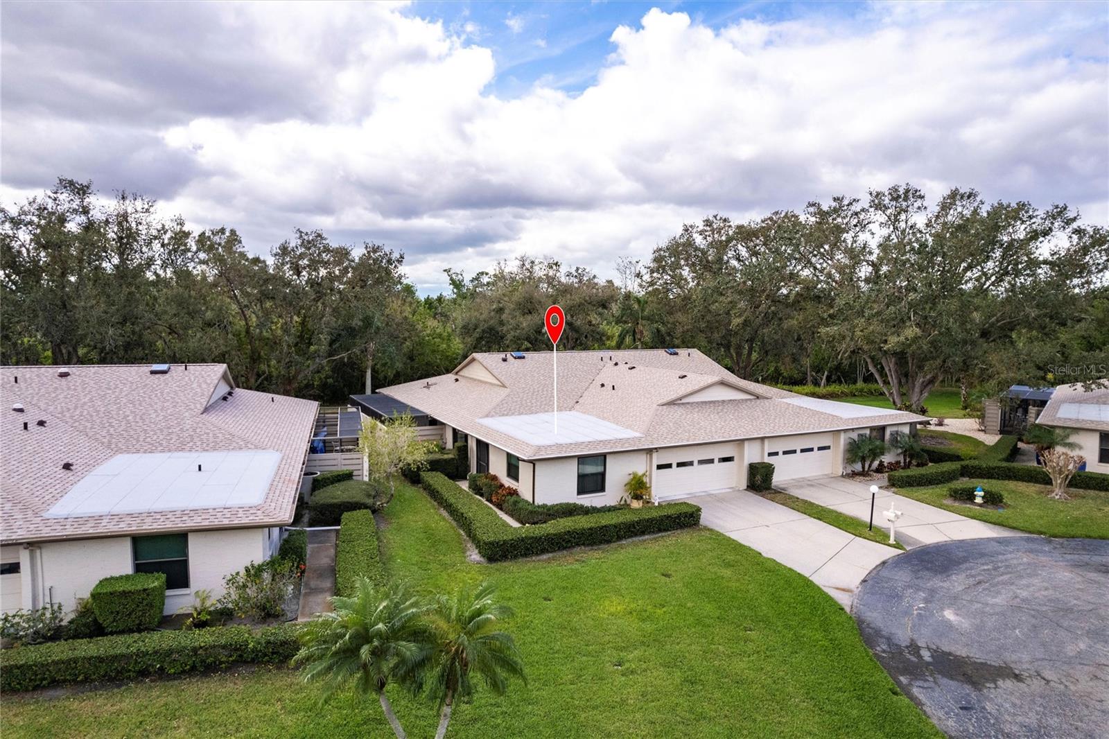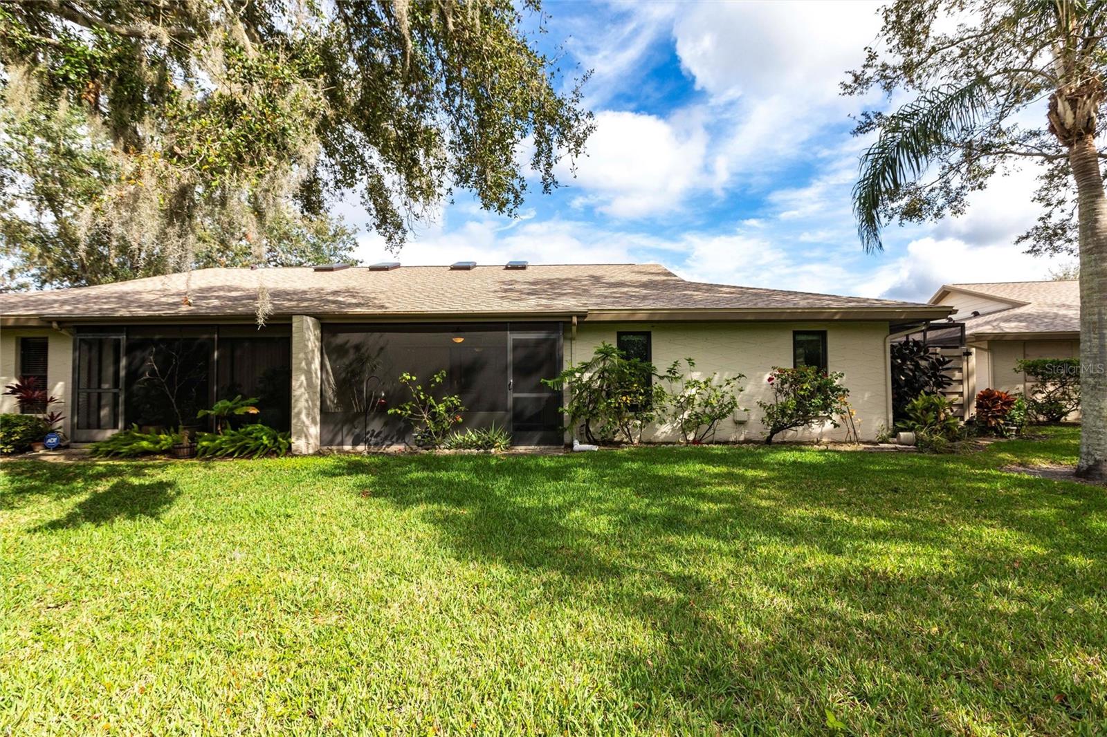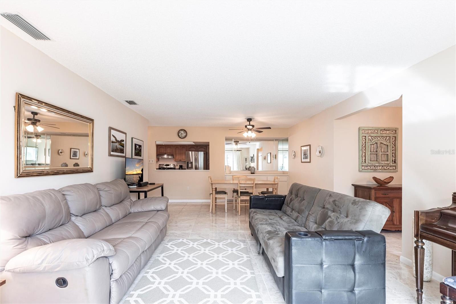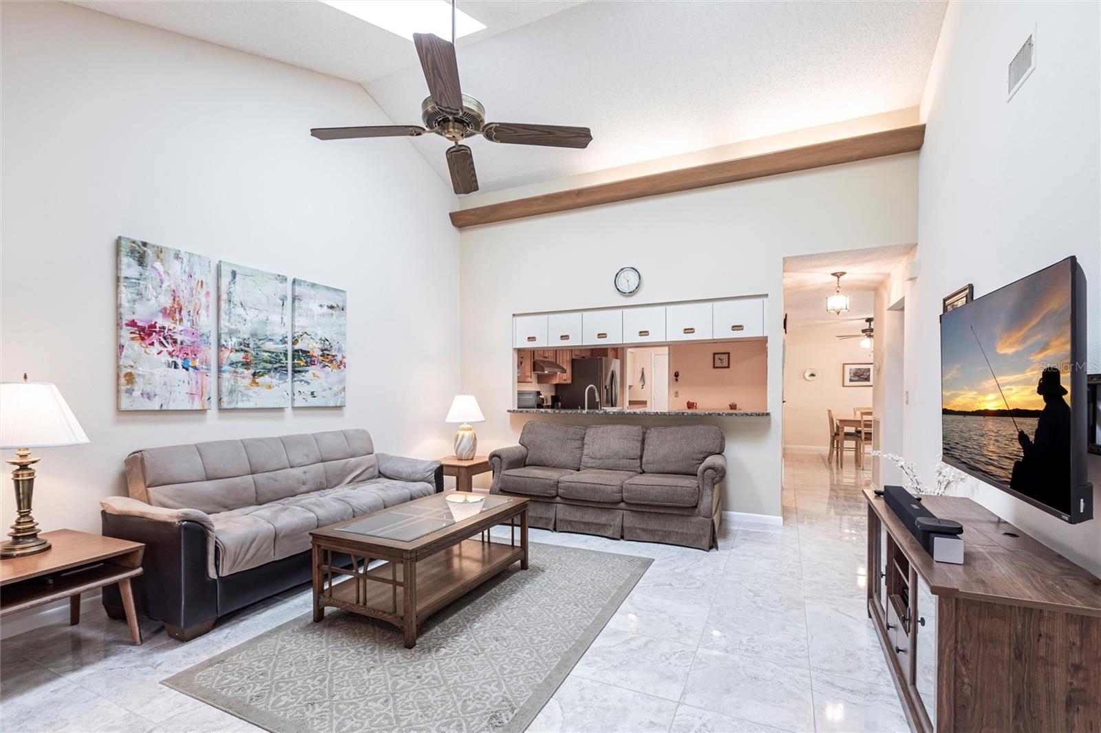 Lovingly updated and maintained, this is an incredible opportunity in Center Gate Estates with over 2000 sq ft of living space, located on a quiet cul-de-sac and close to the community pool. You'll have peace of mind with a new roof, hurricane windows, slider, and garage door. The kitchen was opened with pass-throughs to bring in natural light and ease of entertaining, while it also features updated appliances. The expansive primary suite features a walk-in closet, an ensuite bathroom with a double vanity, separate water closet with a bidet, and a sliding glass door to a private patio. The second bedroom is located conveniently next to the hall bathroom and has access to the patio via the sliding glass doors. French doors open into the third bedroom, which is currently used as a home office. The living room has a dining area, located handily beside the kitchen, and features a large picture window. The spacious family room has vaulted ceilings and skylights were added to welcome even more natural light. Relax on the screened porch with views of the lush greenspace, or open the sliding doors to expand your living area seamlessly. The laundry room features built-in cabinetry and is located off the two-car garage. Take advantage of maintenance-free living in Center Gate Estates, which is located close to shopping, restaurants, and just minutes to I-75.