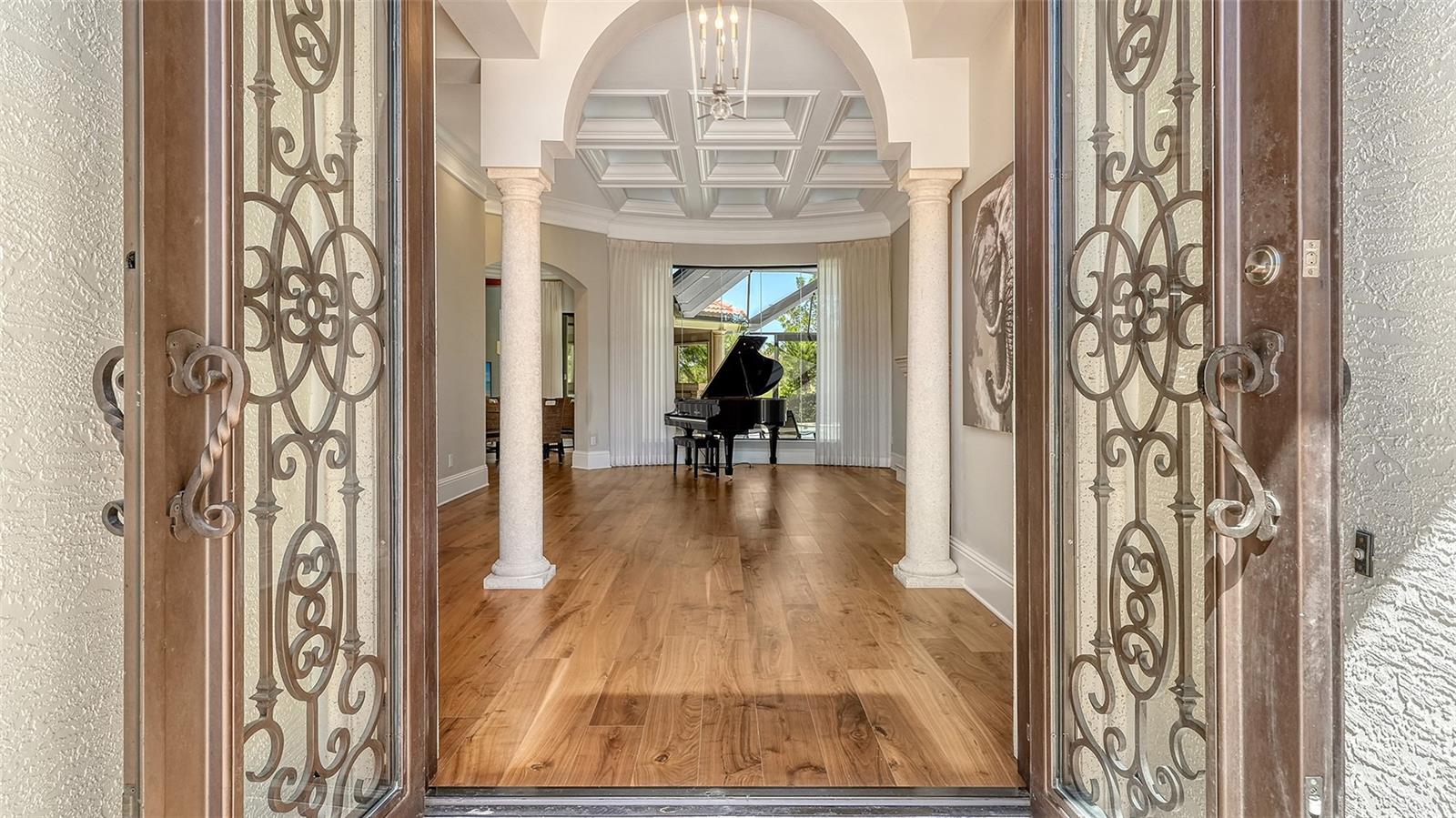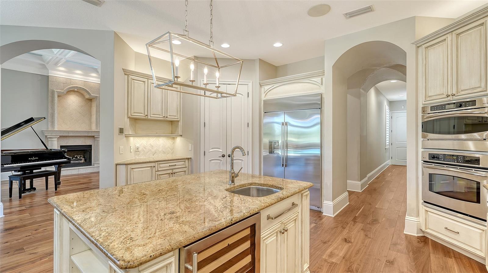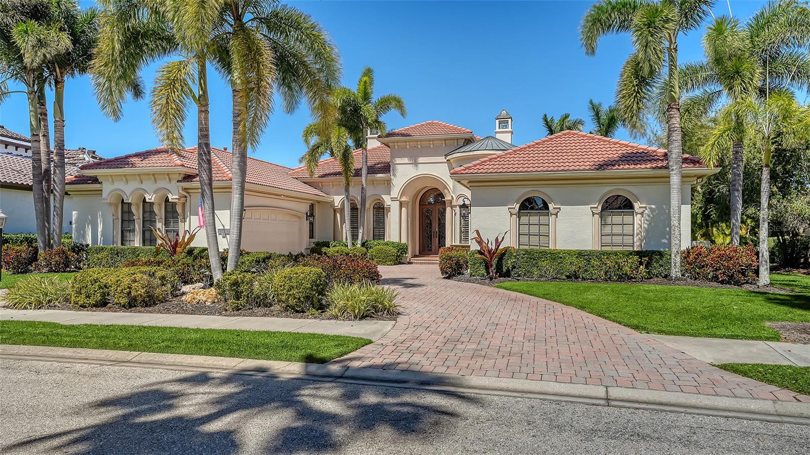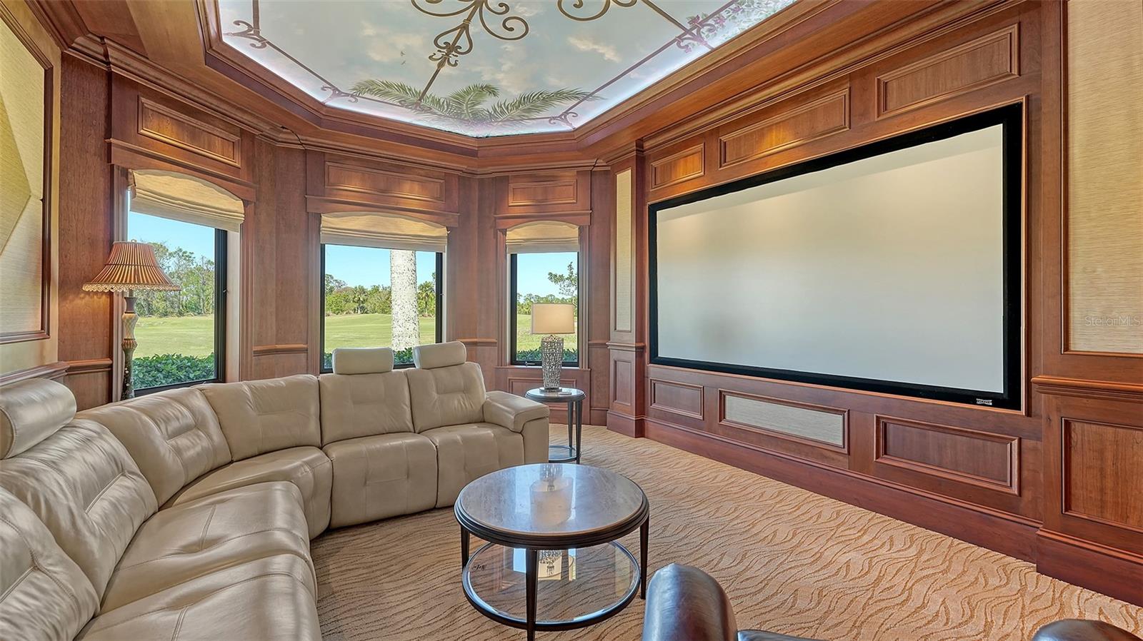 Unparalleled elegance and design on a stunning golf course setting! Perfectly positioned on one of Lakewood Ranch Country Club's premier homesites this tastefully updated Lee Wetherington home offers unobstructed lake and golf course views of the 14th fairway on the King's Dunes Course. Upon entering the massive iron and glass double doors you will notice the soaring coffered ceilings, beautiful aquarium windows framing picturesque views of the pool and golf course, warm walnut hardwood flooring throughout the main living areas, and elegant cast stone fireplace adorning the living room. The great room boasts high ceiling with wood timber beams and provides abundant space and natural light for hosting family and friends. Massive, disappearing sliding-glass, impact rated doors bring the outdoors in, providing open access to the amazing pool and outdoor entertaining spaces! Sharing this space is the large gourmet kitchen showcasing refinished cabinetry with under and over-cabinet lighting, a floating island, warm granite countertops, a discrete walk-in pantry, a GE Monogram gas 6 burner cooktop, a beverage cooler and a new oversized GE Monogram refrigerator. Beyond the great room you will find huge solid wood doors that lead to the state of the art, sound engineered movie theatre with remote blackout shades, wood paneling from floor to ceiling, plus an artful ceiling detail with custom lighting. The 3 incredibly sized additional guest bedrooms provide a quiet domain for family visits while ensuring privacy from the main house. The owner's suite boasts amazing views to the lanai, pool and golf course while disappearing sliding doors bring in an abundance light and beautiful Florida breezes. The primary suit also offers 2 spacious walk-in closets with custom built-ins, a spa-like bath, including dual vanities, a soaking tub and a walk-in shower, all recently renovated. A soothing garden shower brings in natural light and offers beauty and privacy for those thrilling outdoor showers.The enormous lanai displays design perfection complete with abundant space to relish the perfect outdoor setting. Travertine pavers adorn the entire lanai, and the glass enclosed outdoor entertaining space offers a fully equipped outdoor kitchen, with an ice maker, stainless steel Lynx gas grill, beverage refrigerator and sink. The refreshing saltwater pool and a spa are framed by the panoramic screening to enjoy the obstructed gorgeous golf course, lake and preserve views. This amazing home also features double 2-car garages with additional storage, 2 gas hot water heaters, and the added bonus of air-conditioning for one of the garages. ** This home is being sold with furnishings presented, as a convenience to the Seller at no added value, except the recliner in the movie theater. **Lakewood Ranch Country Club offers the ultimate Florida lifestyle with a private country club with 3 luxurious clubhouses, 4 golf courses, 18 Hard-Tru lighted tennis courts, pickleball courts, state of the art fitness center, aquatic center, parks, walking trails and so much more. Membership is optional and no waitlist. All within minutes of the UTC Mall, fabulous dining and shops, Lakewood Ranch Main Street, polo fields, Benderson Park, and the much-anticipated new home for Mote Marine Aquarium. Plus, don't forget you're only a short drive to the world's top-rated beaches! This is truly luxury at its finest, schedule your private showing today.