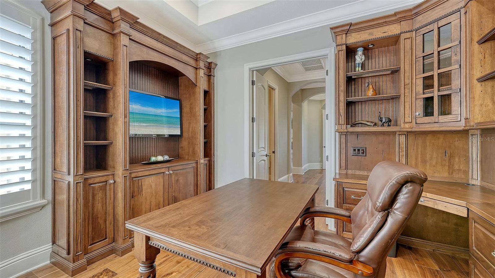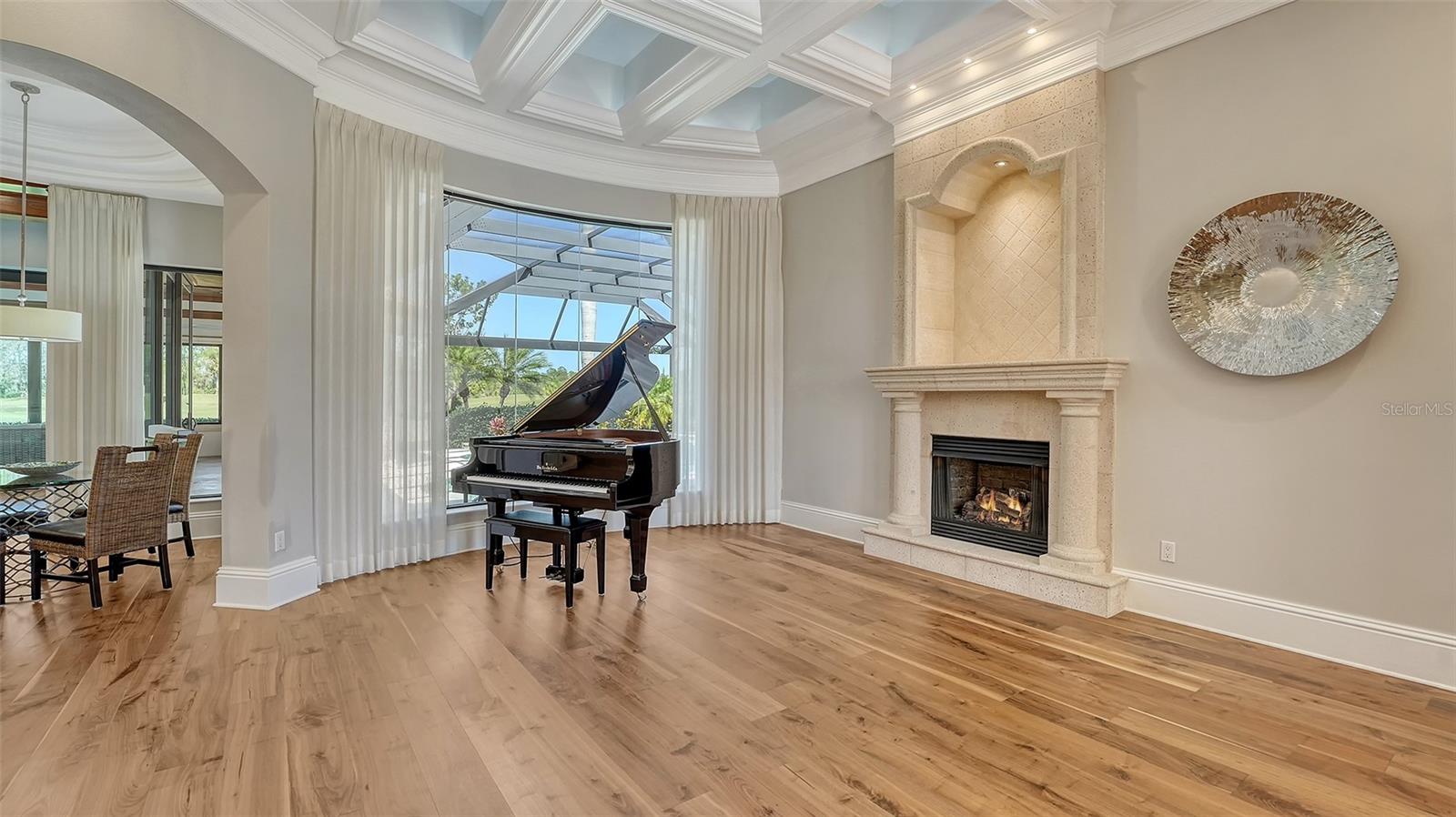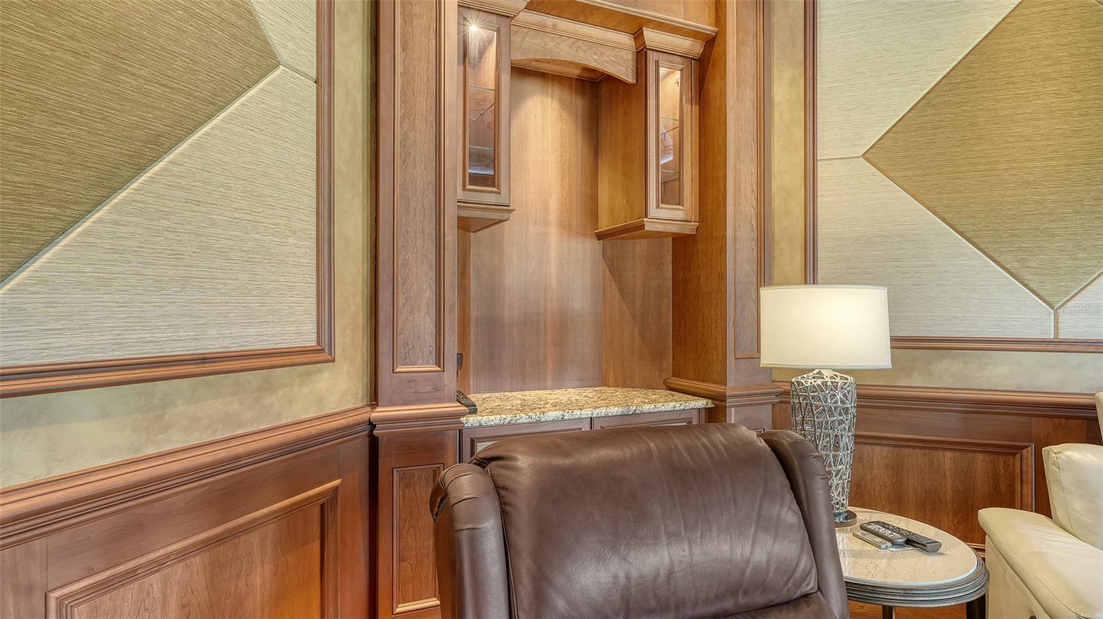 Unparalleled elegance and design on a stunning golf course setting! Perfectly positioned on one of Lakewood Ranch Country Club's premier homesites this tastefully updated Lee Wetherington home offers unobstructed lake and golf course views of the 14th fairway on the King's Dunes Course. Upon entering the massive iron and glass double doors you will notice the soaring coffered ceilings, beautiful aquarium windows framing picturesque views of the pool and golf course, warm walnut hardwood flooring throughout the main living areas, and elegant cast stone fireplace adorning the living room. The great room boasts high ceiling with wood timber beams and provides abundant space and natural light for hosting family and friends. Massive, disappearing sliding-glass, impact rated doors bring the outdoors in, providing open access to the amazing pool and outdoor entertaining spaces! Sharing this space is the large gourmet kitchen showcasing refinished cabinetry with under and over-cabinet lighting, a floating island, warm granite countertops, a discrete walk-in pantry, a GE Monogram gas 6 burner cooktop, a beverage cooler and a new oversized GE Monogram refrigerator. Beyond the great room you will find huge solid wood doors that lead to the state of the art, sound engineered movie theatre with remote blackout shades, wood paneling from floor to ceiling, plus an artful ceiling detail with custom lighting. The 3 incredibly sized additional guest bedrooms provide a quiet domain for family visits while ensuring privacy from the main house. The owner's suite boasts amazing views to the lanai, pool and golf course while disappearing sliding doors bring in an abundance light and beautiful Florida breezes. The primary suit also offers 2 spacious walk-in closets with custom built-ins, a spa-like bath, including dual vanities, a soaking tub and a walk-in shower, all recently renovated. A soothing garden shower brings in natural light and offers beauty and privacy for those thrilling outdoor showers.The enormous lanai displays design perfection complete with abundant space to relish the perfect outdoor setting. Travertine pavers adorn the entire lanai, and the glass enclosed outdoor entertaining space offers a fully equipped outdoor kitchen, with an ice maker, stainless steel Lynx gas grill, beverage refrigerator and sink. The refreshing saltwater pool and a spa are framed by the panoramic screening to enjoy the obstructed gorgeous golf course, lake and preserve views. This amazing home also features double 2-car garages with additional storage, 2 gas hot water heaters, and the added bonus of air-conditioning for one of the garages. ** This home is being sold with furnishings presented, as a convenience to the Seller at no added value, except the recliner in the movie theater. **Lakewood Ranch Country Club offers the ultimate Florida lifestyle with a private country club with 3 luxurious clubhouses, 4 golf courses, 18 Hard-Tru lighted tennis courts, pickleball courts, state of the art fitness center, aquatic center, parks, walking trails and so much more. Membership is optional and no waitlist. All within minutes of the UTC Mall, fabulous dining and shops, Lakewood Ranch Main Street, polo fields, Benderson Park, and the much-anticipated new home for Mote Marine Aquarium. Plus, don't forget you're only a short drive to the world's top-rated beaches! This is truly luxury at its finest, schedule your private showing today.