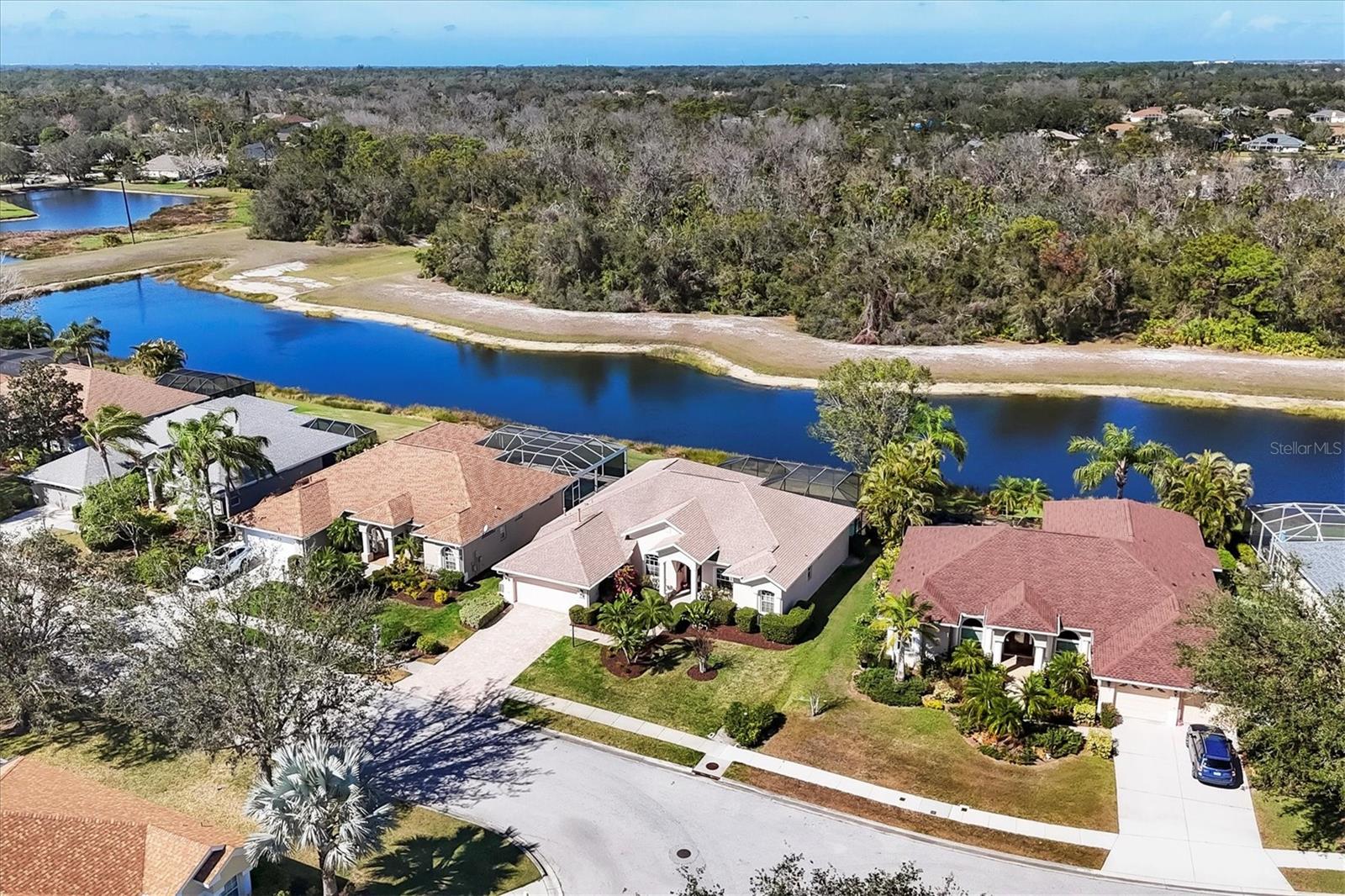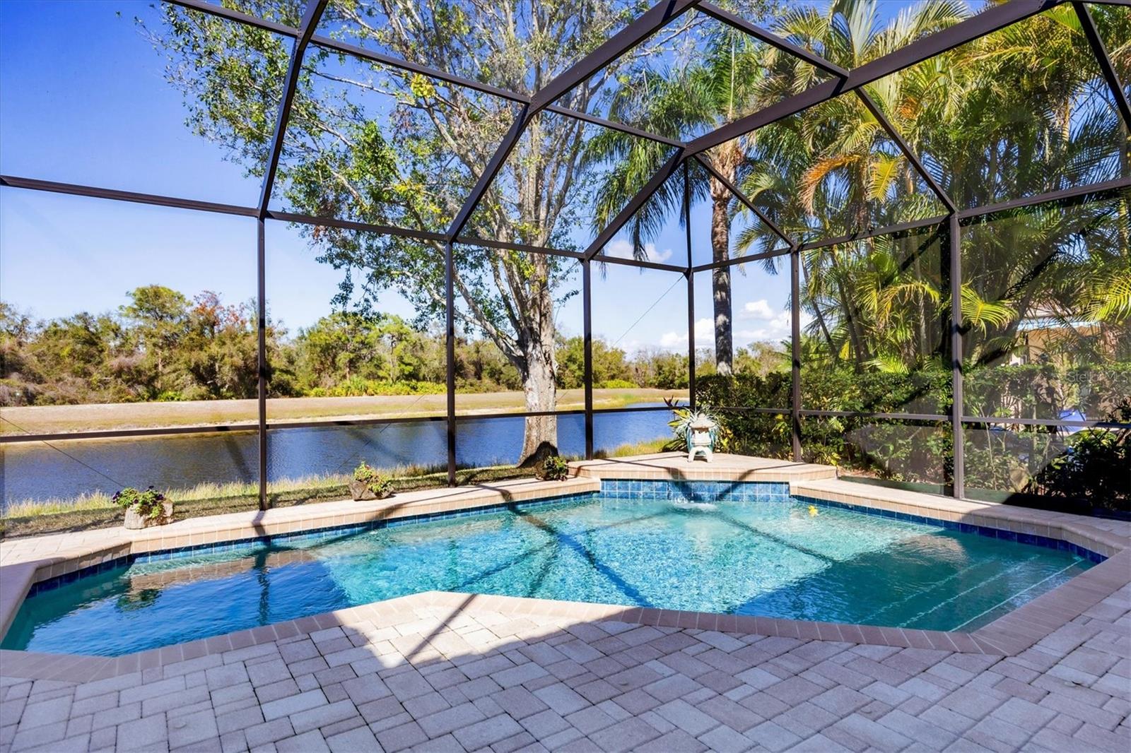 Nestled on a peaceful street in the coveted Riverwalk Hammock community of Lakewood Ranch, this exceptional residence offers the perfect blend of privacy and serene lake and preserve views. Thoughtfully designed with soaring high ceilings, expansive room sizes, and an open-concept floor plan, this home seamlessly blends indoor and outdoor living with large banks of windows and sliding glass doors. Recent upgrades enhance both comfort and convenience, including a natural gas generator, a new paver driveway, walkway, and lanai, a newer roof, an electric-powered awning, motion-activated security lights, a new hot water heater, a new pool heater, and elegant wood flooring. Just beyond the welcoming foyer, the spacious living and dining areas create a warm and inviting atmosphere, ideal for entertaining. The kitchen features rich wood cabinetry, stainless steel appliances, stone countertops, and bar seating that flows effortlessly into the family room. Step outside to your private screened-in outdoor retreat, accessible from the living room, family room, and primary suite. With covered and uncovered seating areas and a sparkling heated pool, this is the ultimate space for relaxation and entertaining. The primary suite is a tranquil escape, boasting a cozy sitting area, a walk-in closet, and a spa-like ensuite bathroom. On the opposite side of the home, two generously sized bedrooms share a well-appointed bathroom. A dedicated office, a spacious laundry room, and a two-car garage complete this remarkable home. Located in the heart of Lakewood Ranch, this home places you just minutes from UTC Mall, Lakewood Ranch Main Street, Waterside Place, scenic walking and biking trails, world-class golf courses, top-rated schools, dog parks, and more. Experience the best of Florida living in this stunning home--schedule your private showing today!