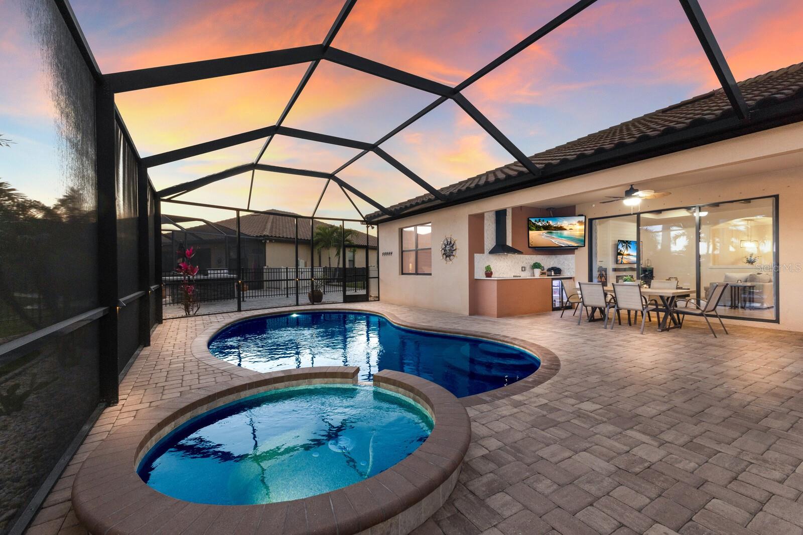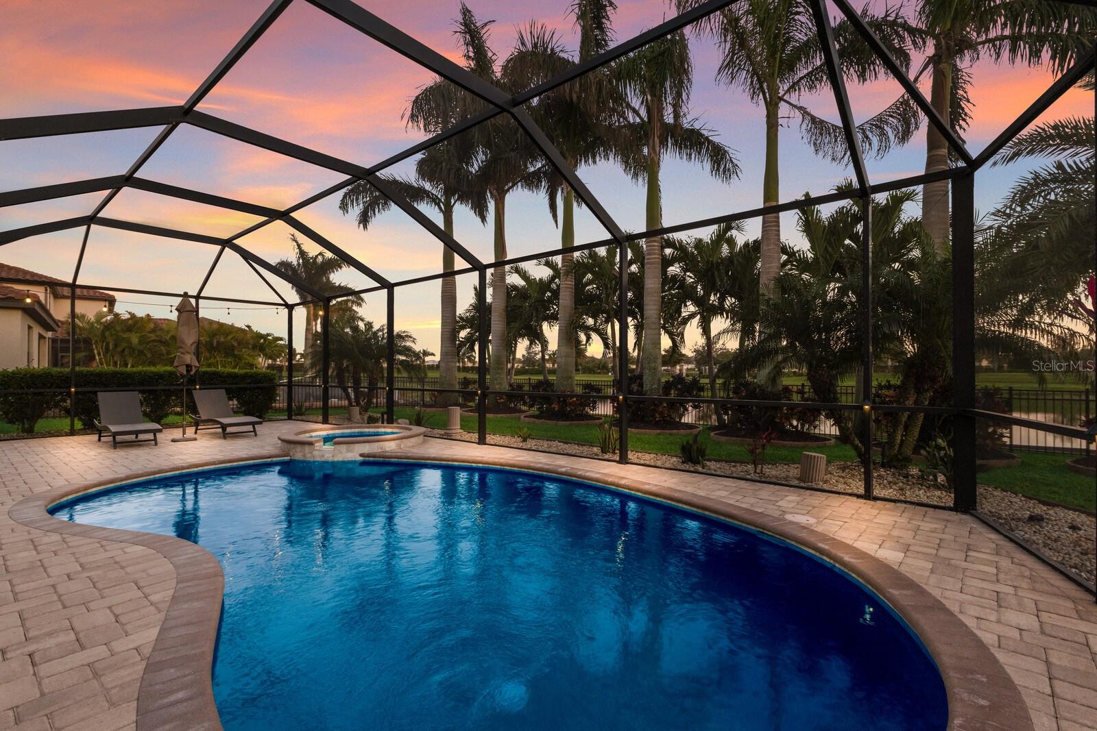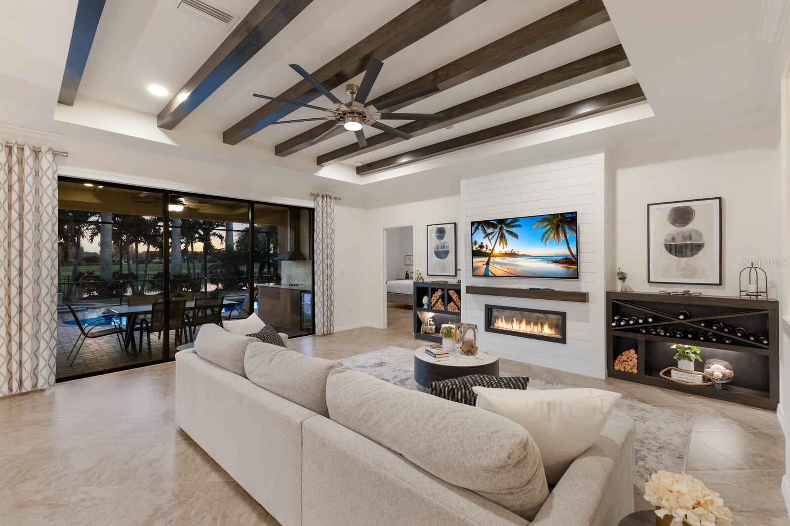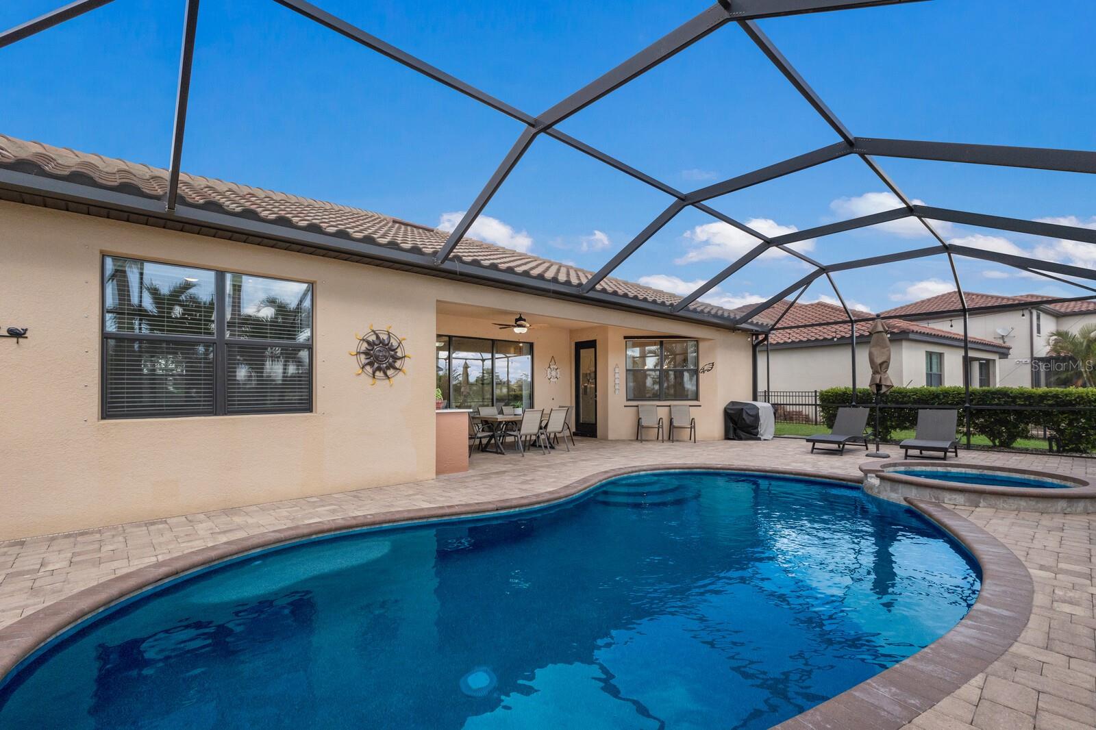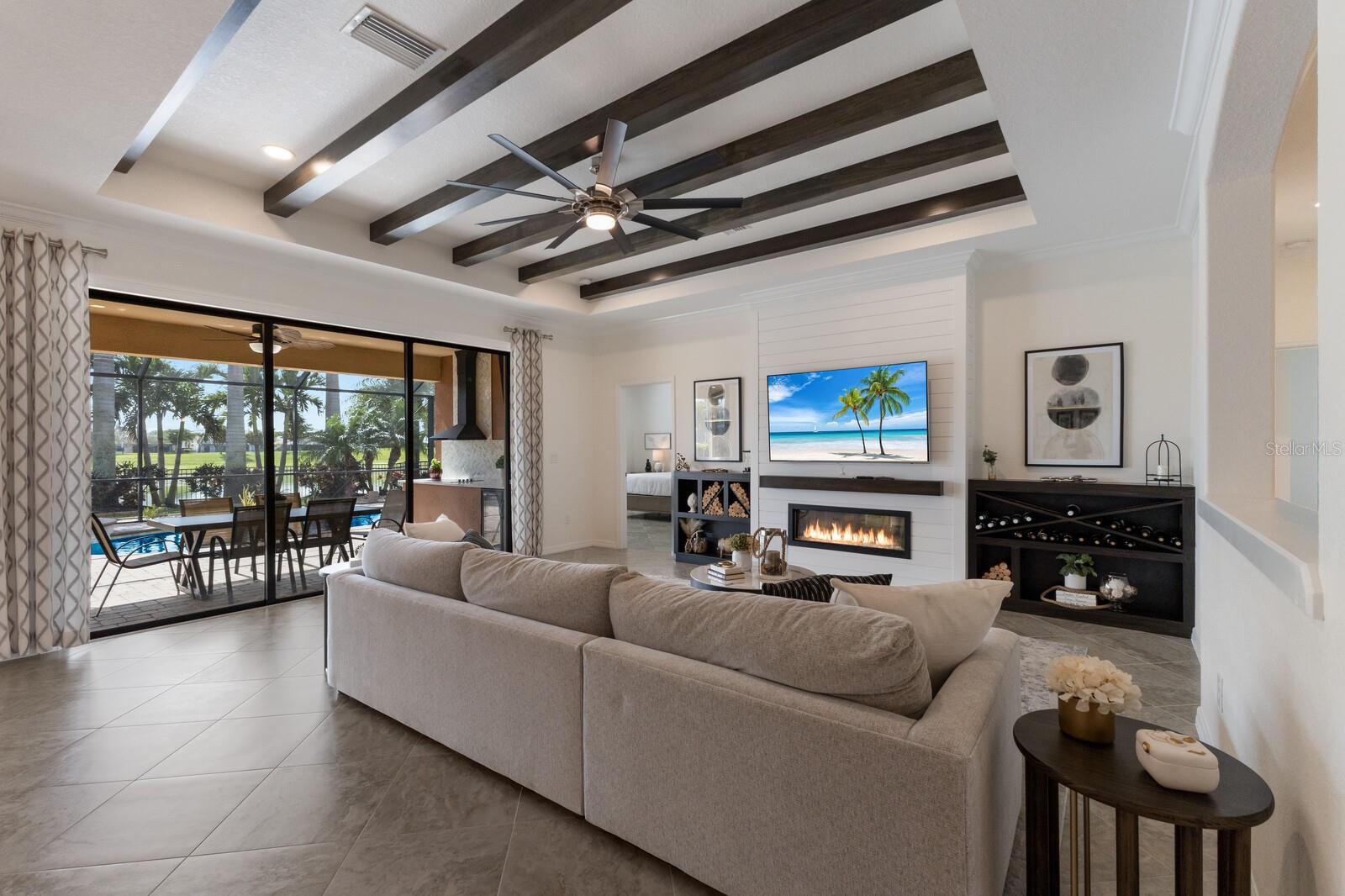 Absolutely STUNNING and FULLY FURNISHED!!! This 4 bedroom, 2 bath, 3 car garage POOL home by Lennar is nestled in the highly sought after community of Savanna in Lakewood Ranch!! This BEAUTIFUL home offers an open floor plan filled with upgrades and CUSTOM details throughout. As you step inside, you are greeted by elegant archways leading into the dining room, creating a warm and inviting ambiance. The kitchen is a chef's dream, featuring wood cabinetry with UPGRATED molding, a stylish tile backsplash, granite countertops, stainless steel appliances, and shiplap decorative wood accents. A large island with eat in space seamlessly flows into the spacious living room, where wood beams highlight the tray ceiling, and a decorative electric fireplace entertainment center provides the perfect setting for cozy movie nights. Large sliding doors open to the expansive lanai, offering breathtaking views of the pool and lake. The LUXURIOUS master bedroom features a tray ceiling, a walk in closet, and an ensuite bath complete with dual sinks, a garden tub, and a walk in tiled glass shower. For added privacy, three additional bedrooms are situated on the opposite side of the home, sharing a full bath with a tub/shower combo. The laundry room offers custom cabinetry and a sink for extra storage and convenience. Throughout the home, you'll find large tile flooring, tray ceilings, and ELEGANT crown molding. Step outside to your private outdoor oasis, where a screened in lanai with pavers surrounds a heated, saltwater pool and spa. The MODERN outdoor kitchen, complete with an electric cooktop, hood, and bar fridge, makes entertaining effortless. Enjoy serene lake views and stunning sunsets from your beautifully landscaped backyard, which features massive palm trees, rock borders, and an EXTENDED fenced in paver patio, which is perfect for children and pets to play safely. This home is a true gem in one of Lakewood Ranch's most desirable communities. Savanna offers LOW HOA resort-style amenities such as a clubhouse, swimming pool, state-of-the-art fitness center, basketball courts, playground, dog park and numerous walking paths. Lakewood Ranch is known for their A+ rated school system and is perfectly located just a short ride to downtown Sarasota, St. Pete, world class shopping, fine dining and the FAMOUS Gulf beaches! Don't wait to make this your home and begin your FLORIDA Lifestyle!