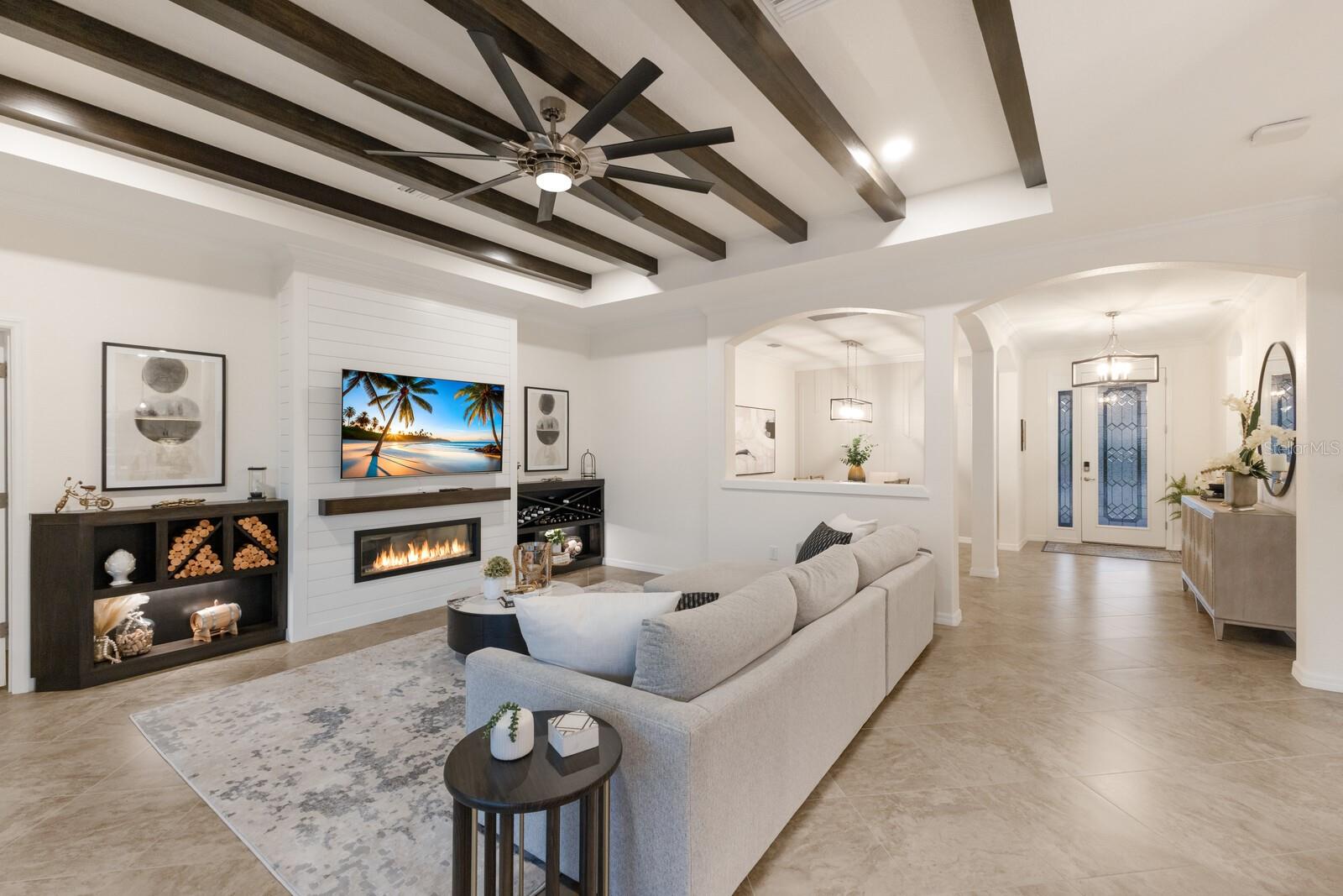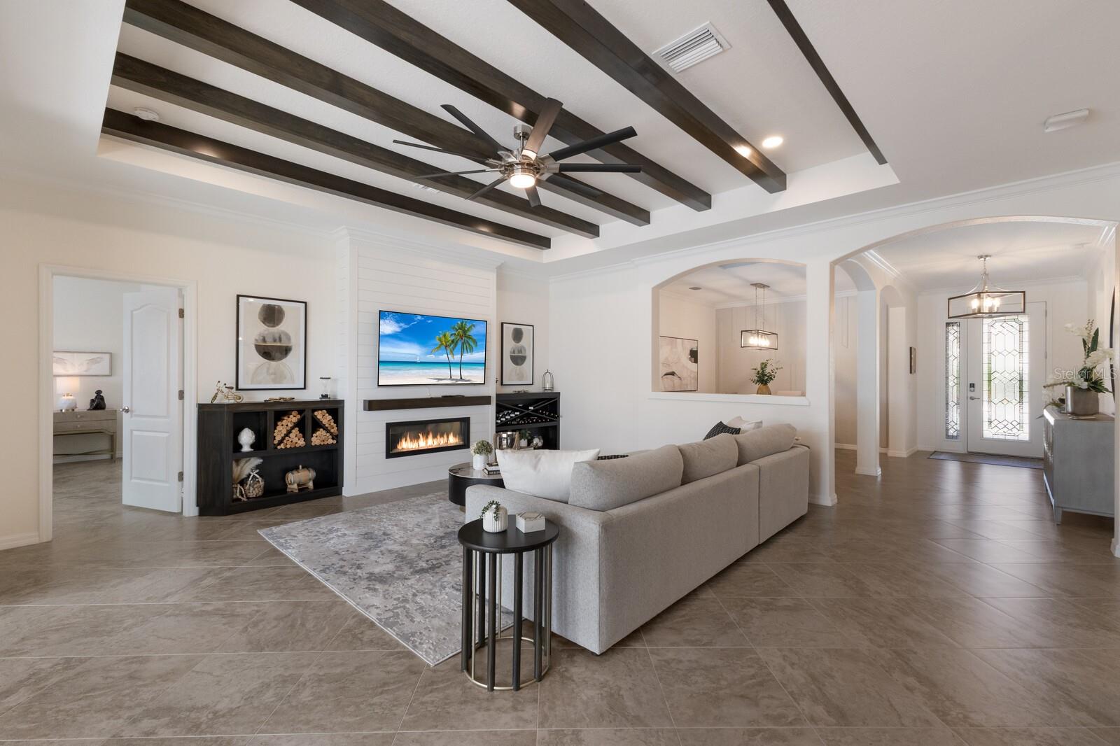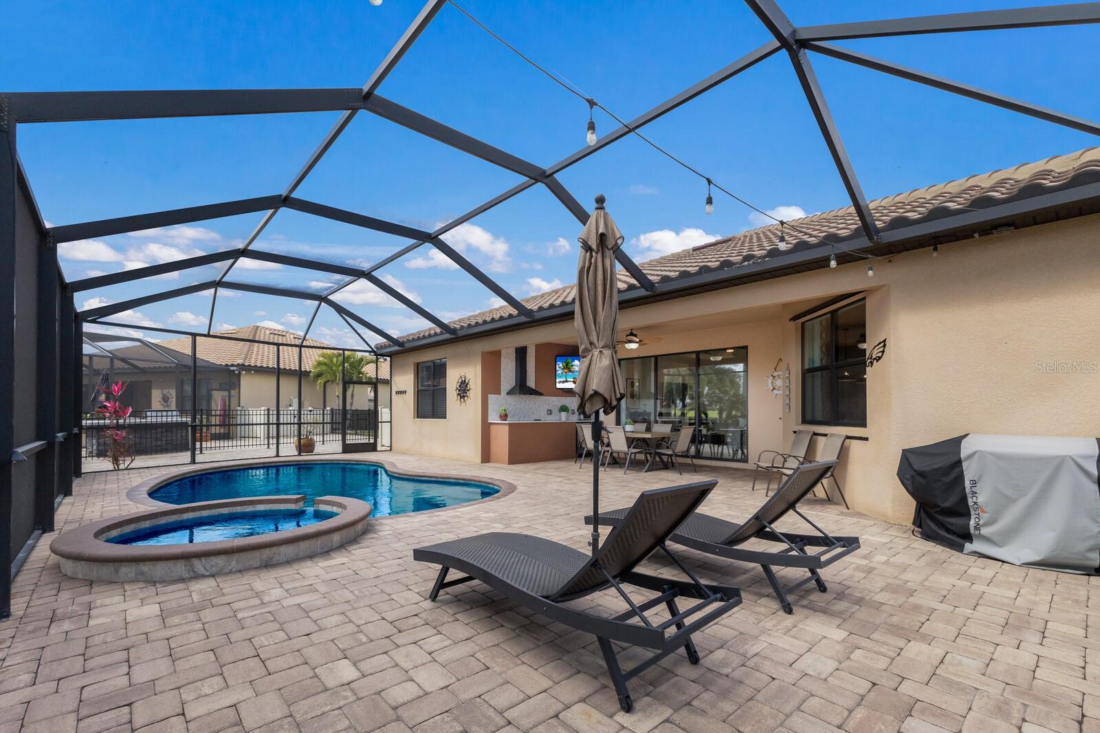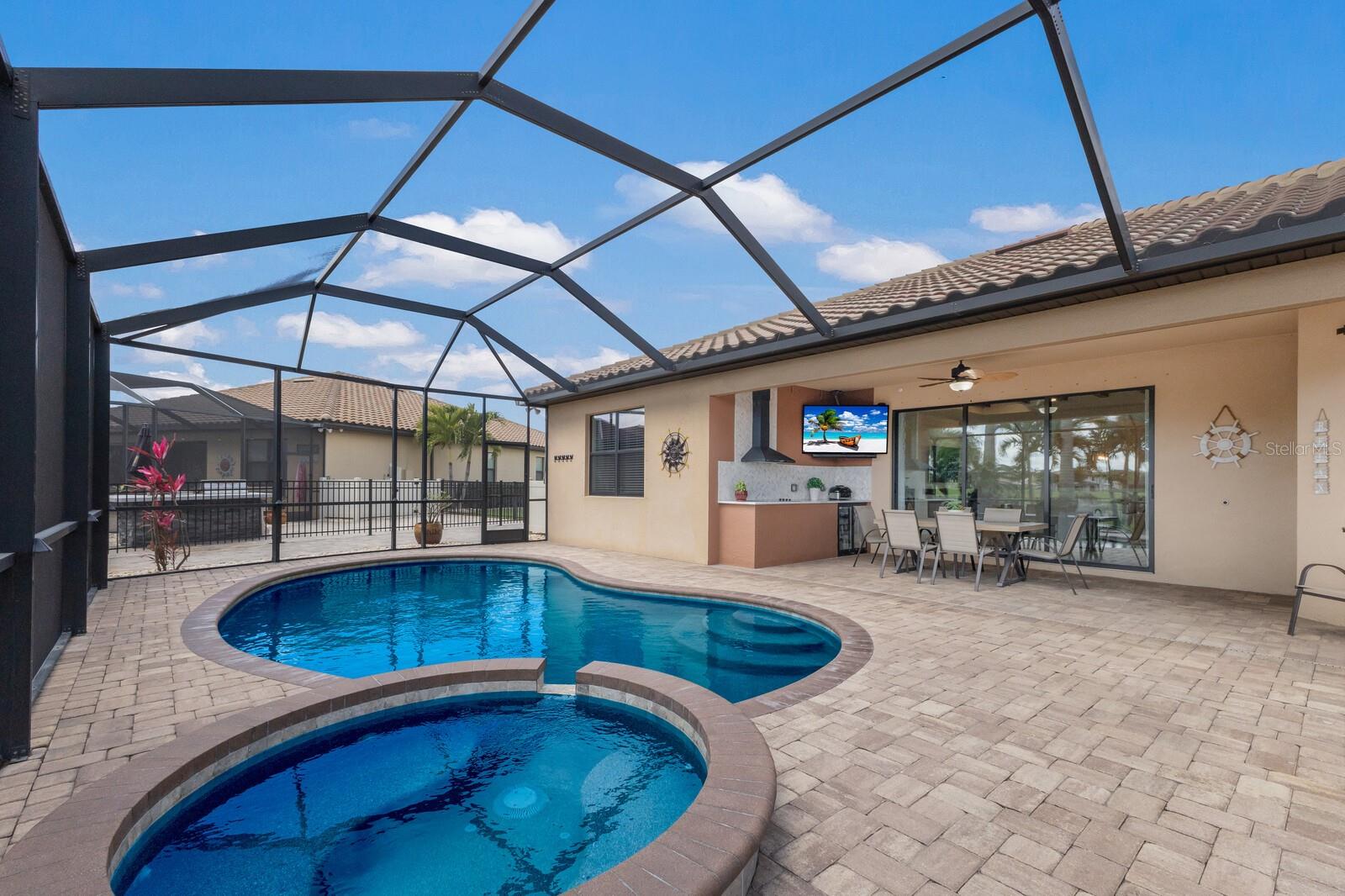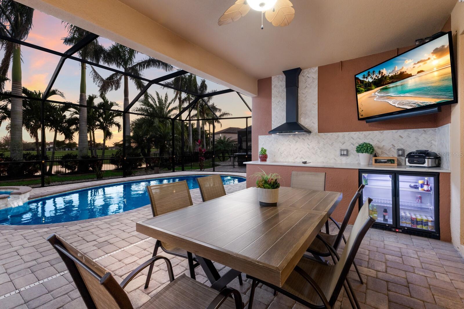 Absolutely STUNNING and FULLY FURNISHED!!! This 4 bedroom, 2 bath, 3 car garage POOL home by Lennar is nestled in the highly sought after community of Savanna in Lakewood Ranch!! This BEAUTIFUL home offers an open floor plan filled with upgrades and CUSTOM details throughout. As you step inside, you are greeted by elegant archways leading into the dining room, creating a warm and inviting ambiance. The kitchen is a chef's dream, featuring wood cabinetry with UPGRATED molding, a stylish tile backsplash, granite countertops, stainless steel appliances, and shiplap decorative wood accents. A large island with eat in space seamlessly flows into the spacious living room, where wood beams highlight the tray ceiling, and a decorative electric fireplace entertainment center provides the perfect setting for cozy movie nights. Large sliding doors open to the expansive lanai, offering breathtaking views of the pool and lake. The LUXURIOUS master bedroom features a tray ceiling, a walk in closet, and an ensuite bath complete with dual sinks, a garden tub, and a walk in tiled glass shower. For added privacy, three additional bedrooms are situated on the opposite side of the home, sharing a full bath with a tub/shower combo. The laundry room offers custom cabinetry and a sink for extra storage and convenience. Throughout the home, you'll find large tile flooring, tray ceilings, and ELEGANT crown molding. Step outside to your private outdoor oasis, where a screened in lanai with pavers surrounds a heated, saltwater pool and spa. The MODERN outdoor kitchen, complete with an electric cooktop, hood, and bar fridge, makes entertaining effortless. Enjoy serene lake views and stunning sunsets from your beautifully landscaped backyard, which features massive palm trees, rock borders, and an EXTENDED fenced in paver patio, which is perfect for children and pets to play safely. This home is a true gem in one of Lakewood Ranch's most desirable communities. Savanna offers LOW HOA resort-style amenities such as a clubhouse, swimming pool, state-of-the-art fitness center, basketball courts, playground, dog park and numerous walking paths. Lakewood Ranch is known for their A+ rated school system and is perfectly located just a short ride to downtown Sarasota, St. Pete, world class shopping, fine dining and the FAMOUS Gulf beaches! Don't wait to make this your home and begin your FLORIDA Lifestyle!