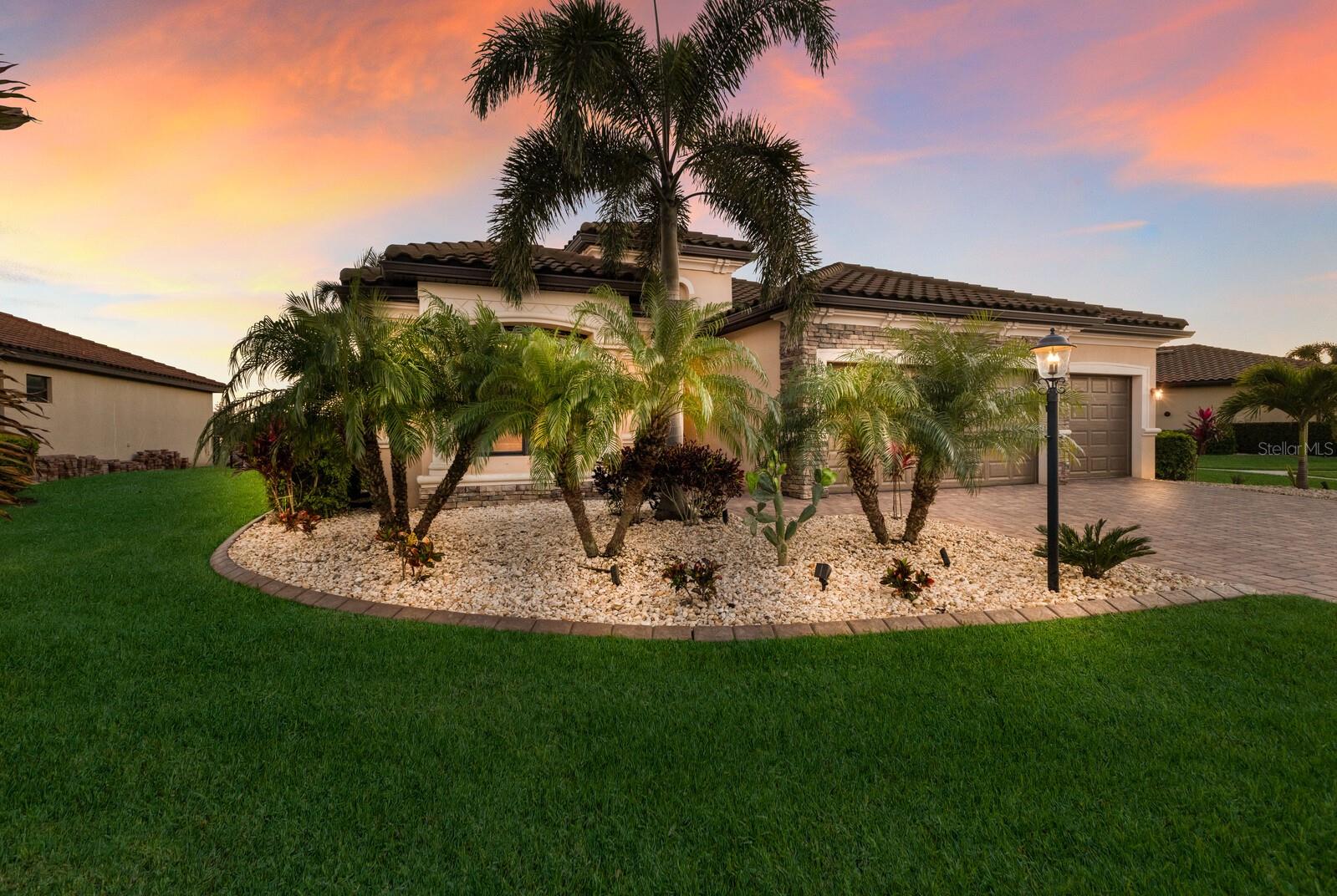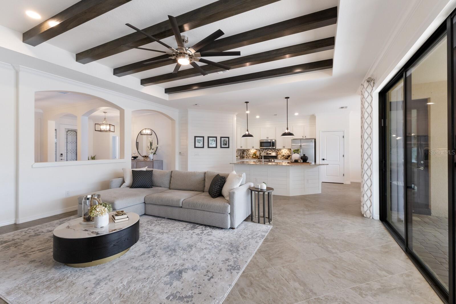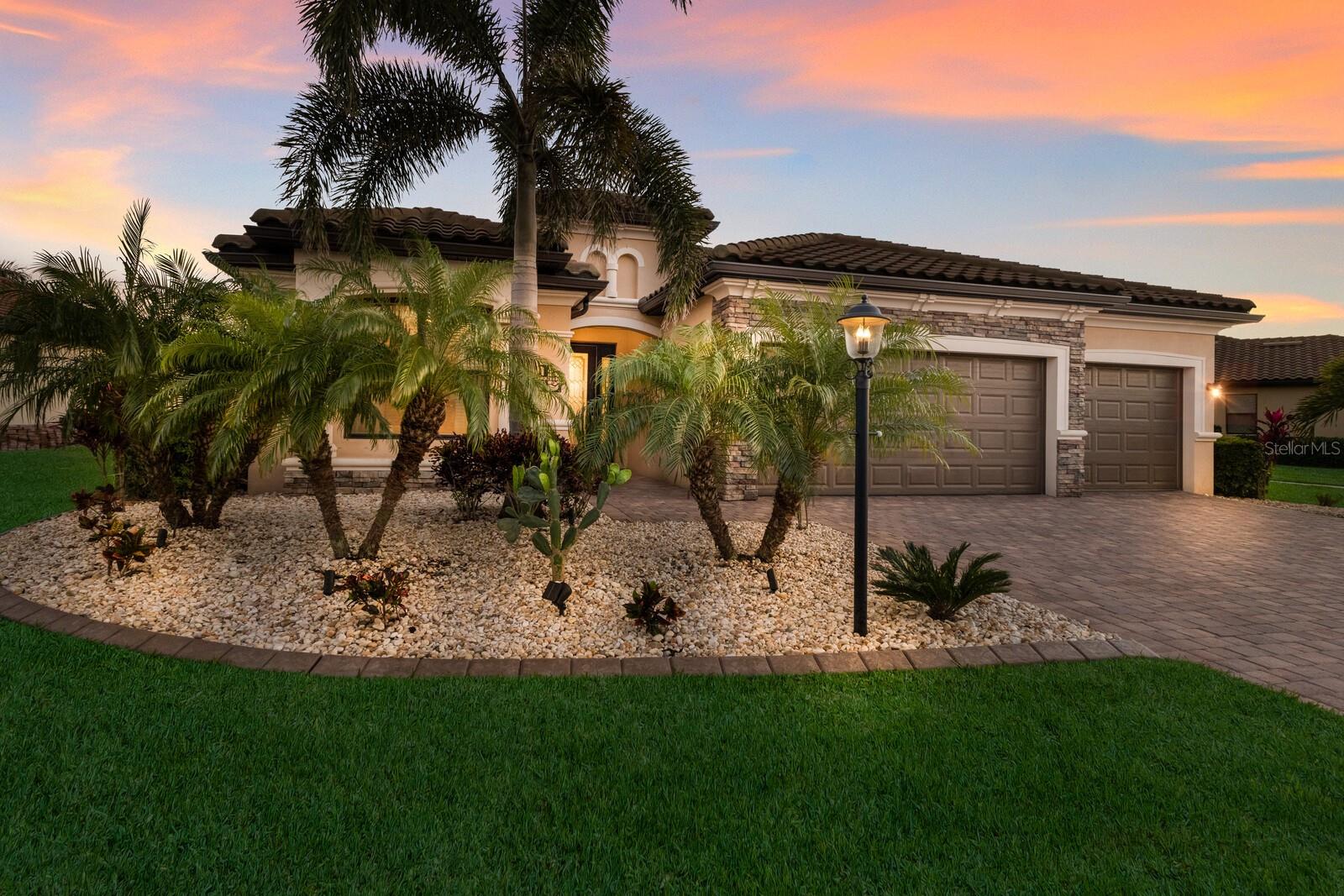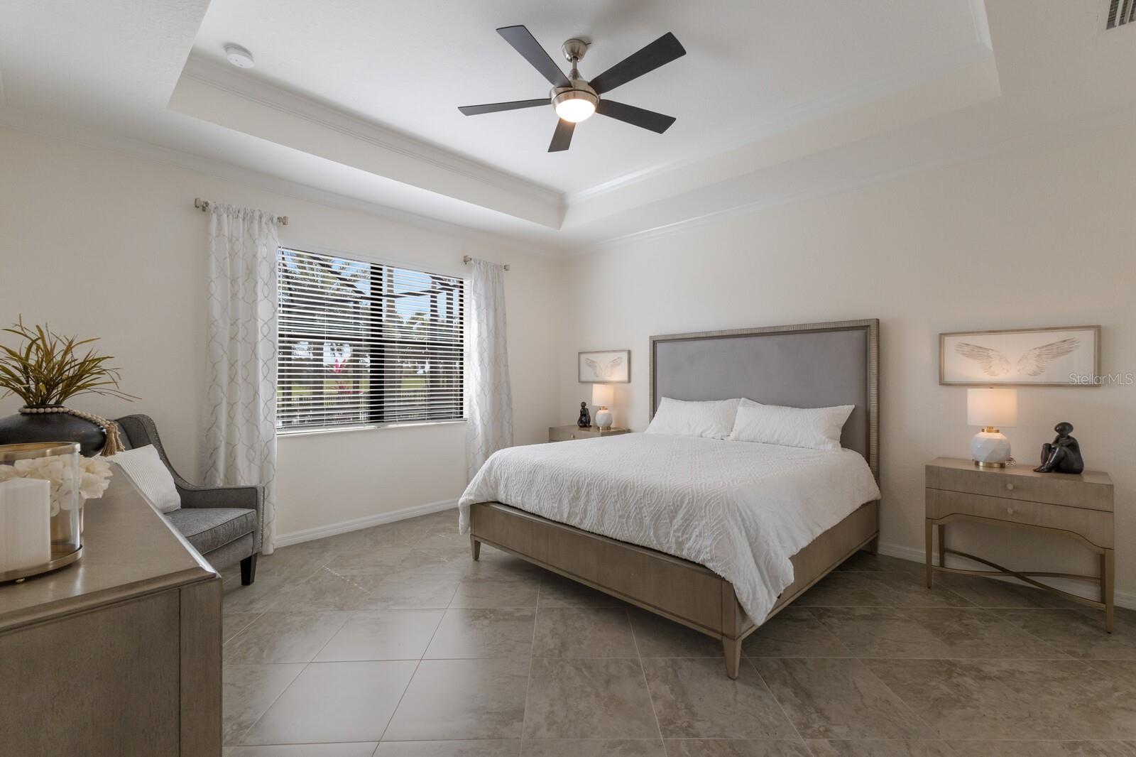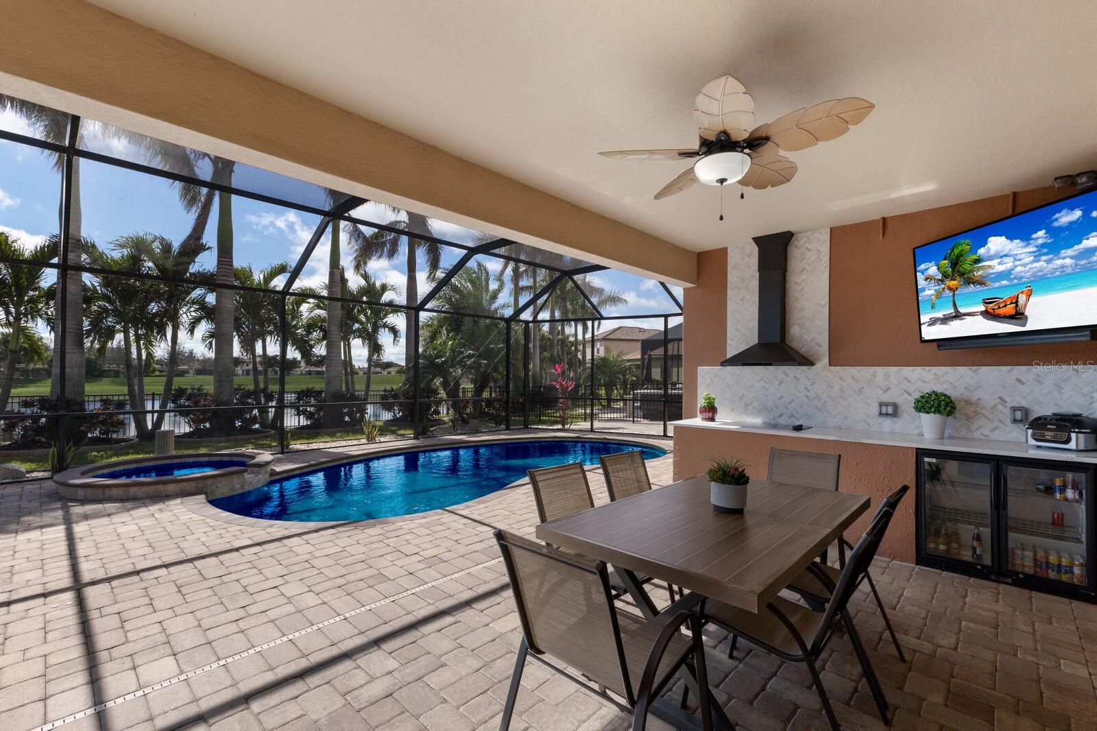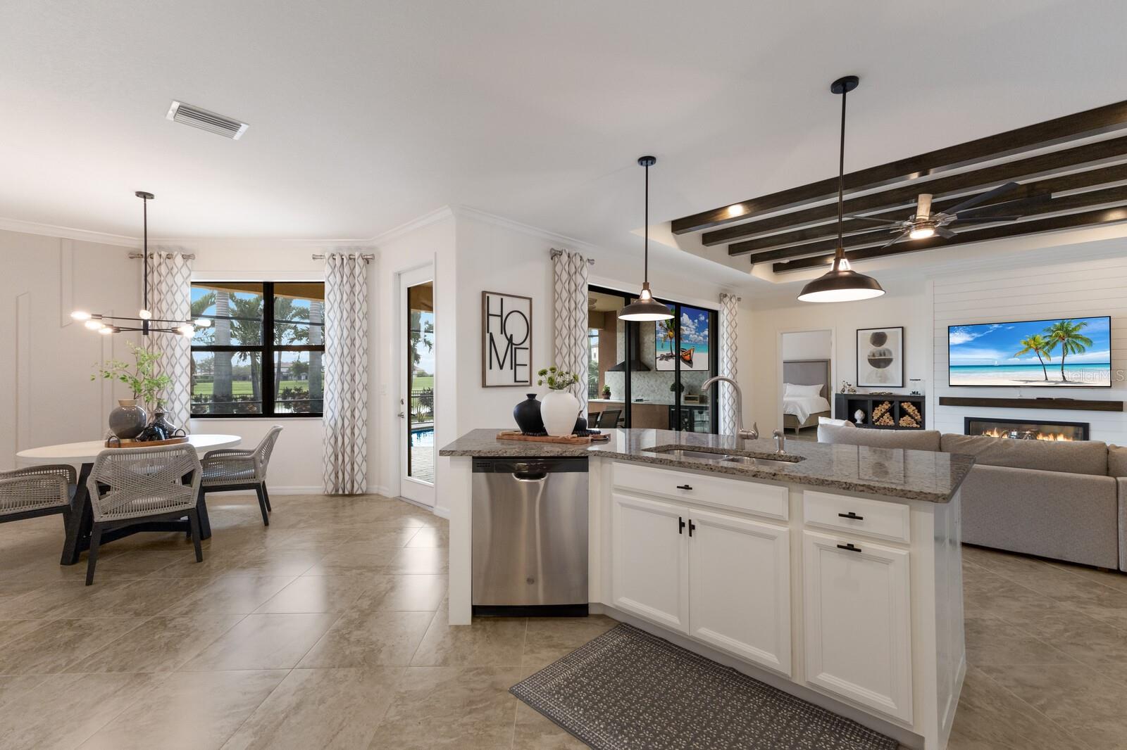 Absolutely STUNNING and FULLY FURNISHED!!! This 4 bedroom, 2 bath, 3 car garage POOL home by Lennar is nestled in the highly sought after community of Savanna in Lakewood Ranch!! This BEAUTIFUL home offers an open floor plan filled with upgrades and CUSTOM details throughout. As you step inside, you are greeted by elegant archways leading into the dining room, creating a warm and inviting ambiance. The kitchen is a chef's dream, featuring wood cabinetry with UPGRATED molding, a stylish tile backsplash, granite countertops, stainless steel appliances, and shiplap decorative wood accents. A large island with eat in space seamlessly flows into the spacious living room, where wood beams highlight the tray ceiling, and a decorative electric fireplace entertainment center provides the perfect setting for cozy movie nights. Large sliding doors open to the expansive lanai, offering breathtaking views of the pool and lake. The LUXURIOUS master bedroom features a tray ceiling, a walk in closet, and an ensuite bath complete with dual sinks, a garden tub, and a walk in tiled glass shower. For added privacy, three additional bedrooms are situated on the opposite side of the home, sharing a full bath with a tub/shower combo. The laundry room offers custom cabinetry and a sink for extra storage and convenience. Throughout the home, you'll find large tile flooring, tray ceilings, and ELEGANT crown molding. Step outside to your private outdoor oasis, where a screened in lanai with pavers surrounds a heated, saltwater pool and spa. The MODERN outdoor kitchen, complete with an electric cooktop, hood, and bar fridge, makes entertaining effortless. Enjoy serene lake views and stunning sunsets from your beautifully landscaped backyard, which features massive palm trees, rock borders, and an EXTENDED fenced in paver patio, which is perfect for children and pets to play safely. This home is a true gem in one of Lakewood Ranch's most desirable communities. Savanna offers LOW HOA resort-style amenities such as a clubhouse, swimming pool, state-of-the-art fitness center, basketball courts, playground, dog park and numerous walking paths. Lakewood Ranch is known for their A+ rated school system and is perfectly located just a short ride to downtown Sarasota, St. Pete, world class shopping, fine dining and the FAMOUS Gulf beaches! Don't wait to make this your home and begin your FLORIDA Lifestyle!