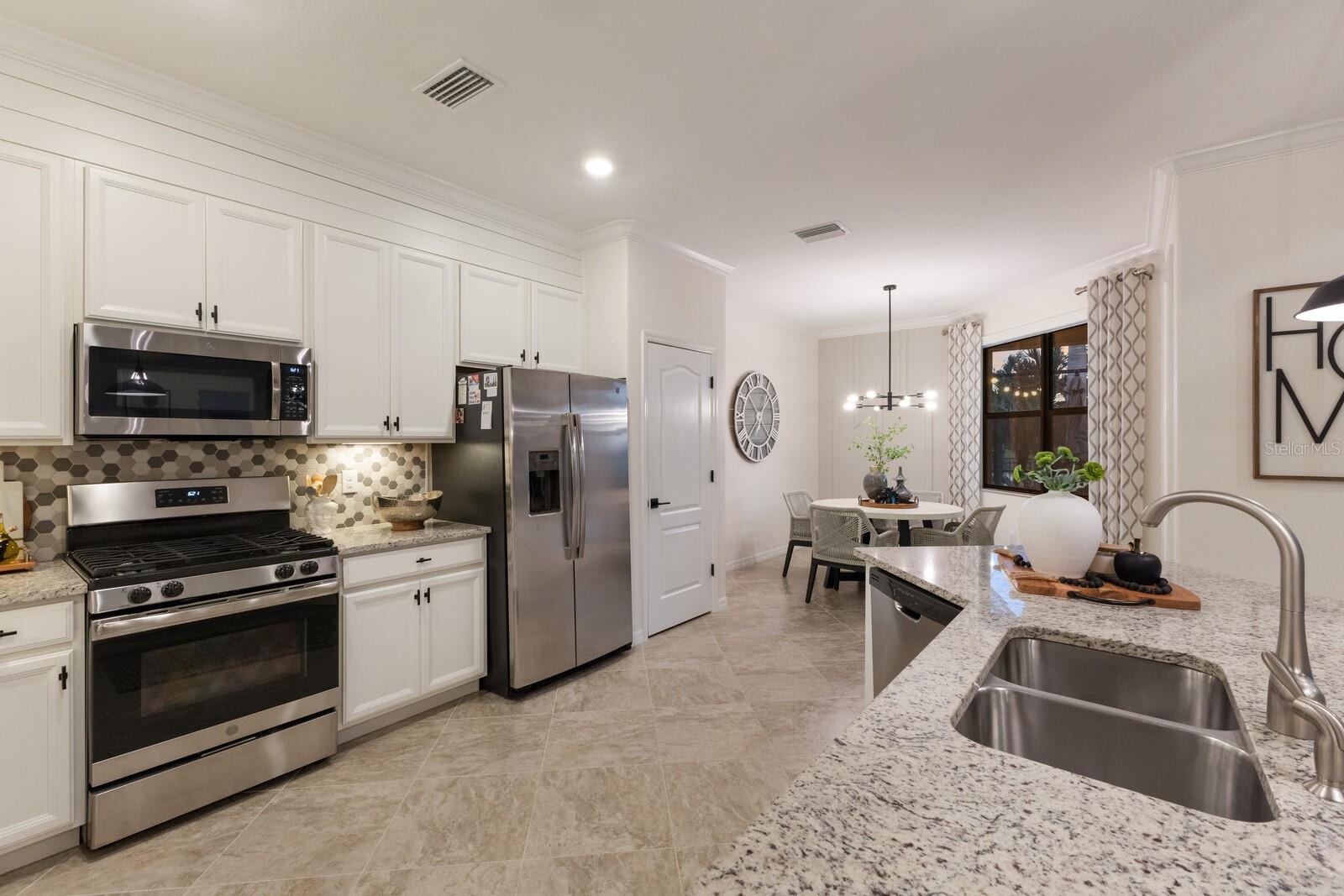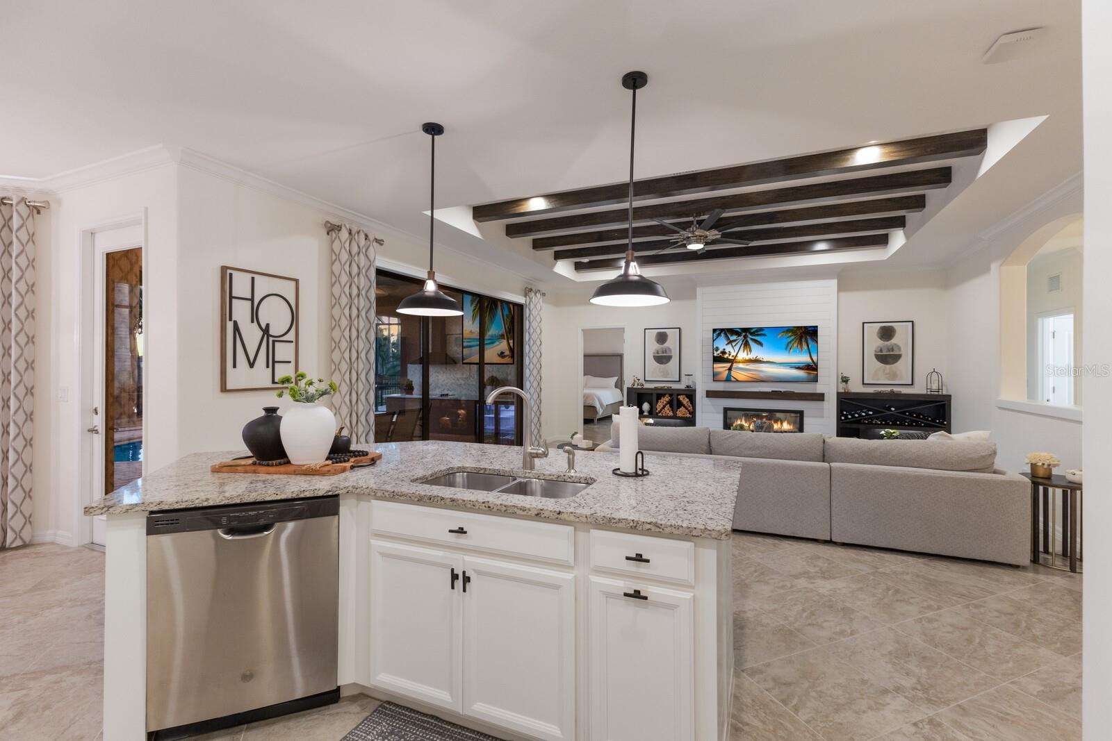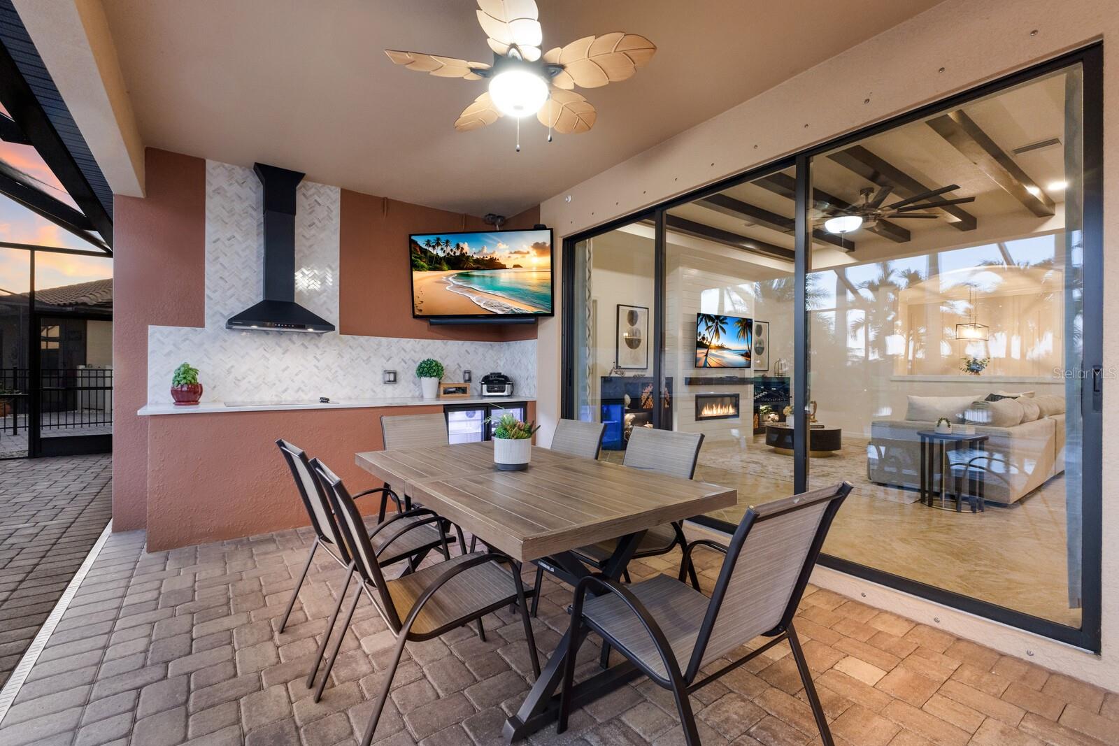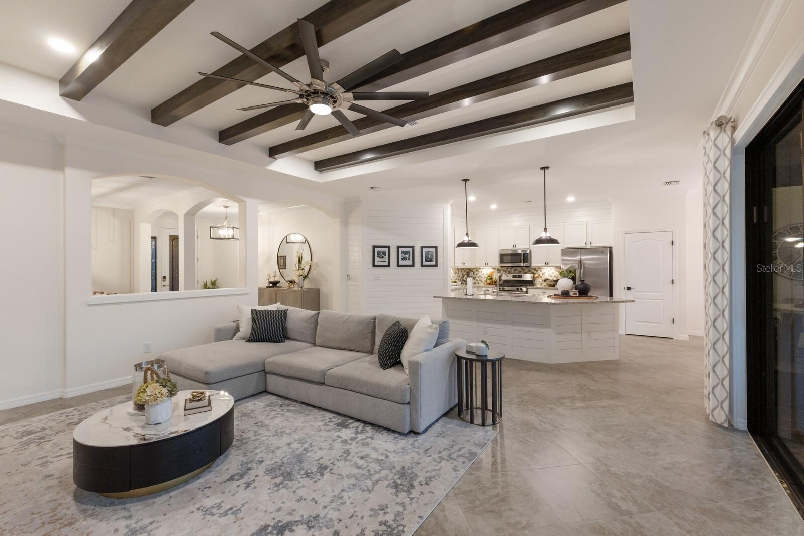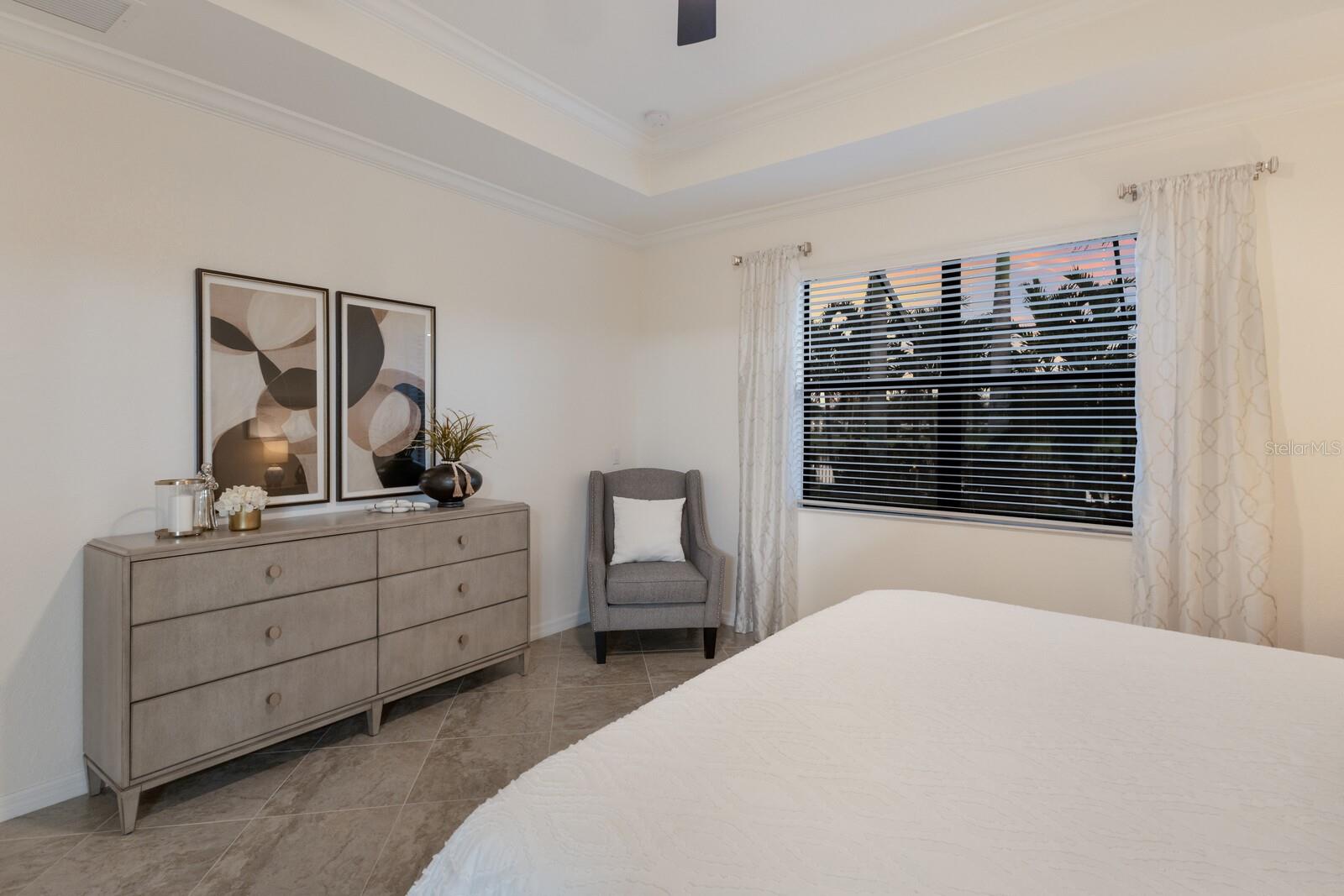 Absolutely STUNNING and FULLY FURNISHED!!! This 4 bedroom, 2 bath, 3 car garage POOL home by Lennar is nestled in the highly sought after community of Savanna in Lakewood Ranch!! This BEAUTIFUL home offers an open floor plan filled with upgrades and CUSTOM details throughout. As you step inside, you are greeted by elegant archways leading into the dining room, creating a warm and inviting ambiance. The kitchen is a chef's dream, featuring wood cabinetry with UPGRATED molding, a stylish tile backsplash, granite countertops, stainless steel appliances, and shiplap decorative wood accents. A large island with eat in space seamlessly flows into the spacious living room, where wood beams highlight the tray ceiling, and a decorative electric fireplace entertainment center provides the perfect setting for cozy movie nights. Large sliding doors open to the expansive lanai, offering breathtaking views of the pool and lake. The LUXURIOUS master bedroom features a tray ceiling, a walk in closet, and an ensuite bath complete with dual sinks, a garden tub, and a walk in tiled glass shower. For added privacy, three additional bedrooms are situated on the opposite side of the home, sharing a full bath with a tub/shower combo. The laundry room offers custom cabinetry and a sink for extra storage and convenience. Throughout the home, you'll find large tile flooring, tray ceilings, and ELEGANT crown molding. Step outside to your private outdoor oasis, where a screened in lanai with pavers surrounds a heated, saltwater pool and spa. The MODERN outdoor kitchen, complete with an electric cooktop, hood, and bar fridge, makes entertaining effortless. Enjoy serene lake views and stunning sunsets from your beautifully landscaped backyard, which features massive palm trees, rock borders, and an EXTENDED fenced in paver patio, which is perfect for children and pets to play safely. This home is a true gem in one of Lakewood Ranch's most desirable communities. Savanna offers LOW HOA resort-style amenities such as a clubhouse, swimming pool, state-of-the-art fitness center, basketball courts, playground, dog park and numerous walking paths. Lakewood Ranch is known for their A+ rated school system and is perfectly located just a short ride to downtown Sarasota, St. Pete, world class shopping, fine dining and the FAMOUS Gulf beaches! Don't wait to make this your home and begin your FLORIDA Lifestyle!