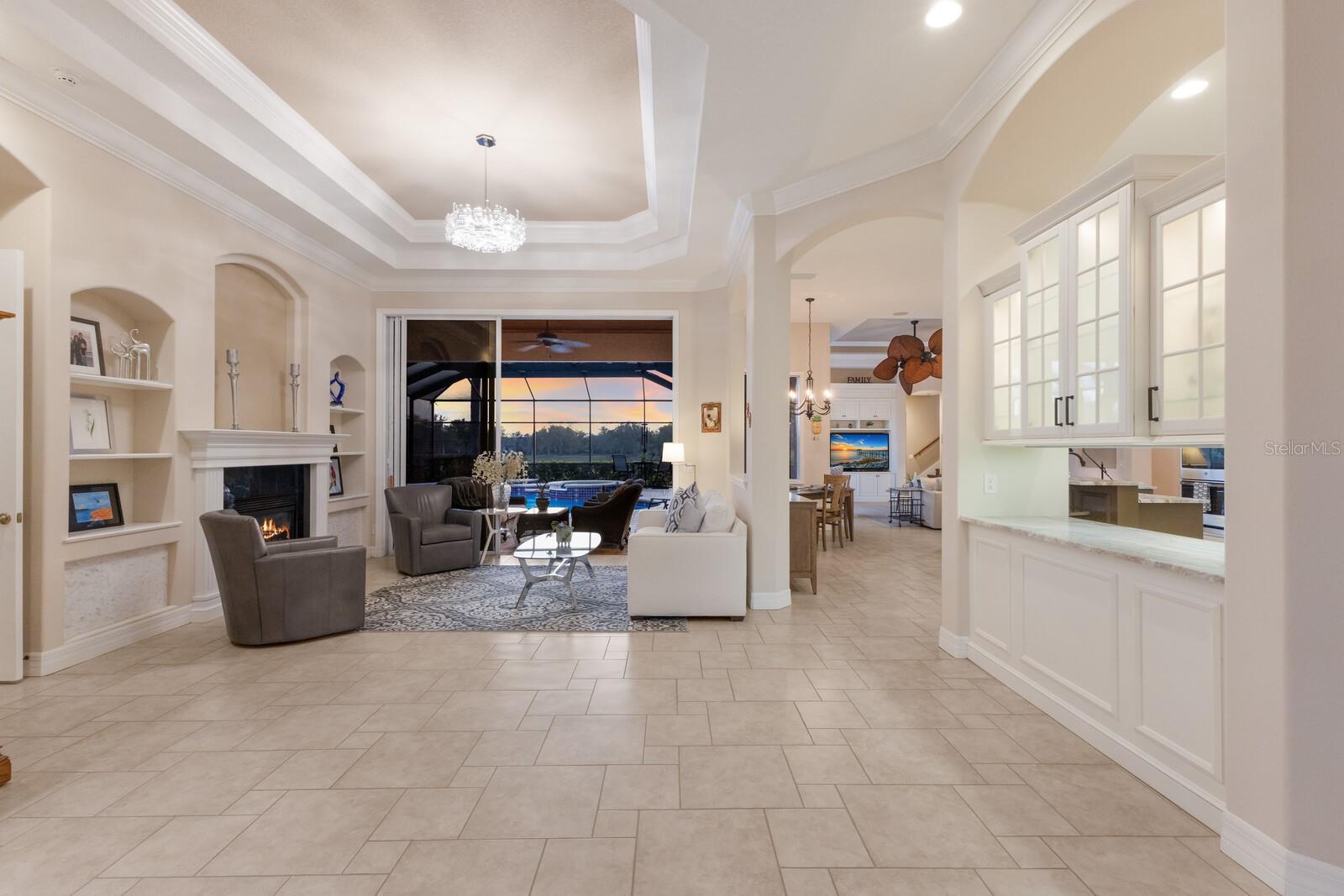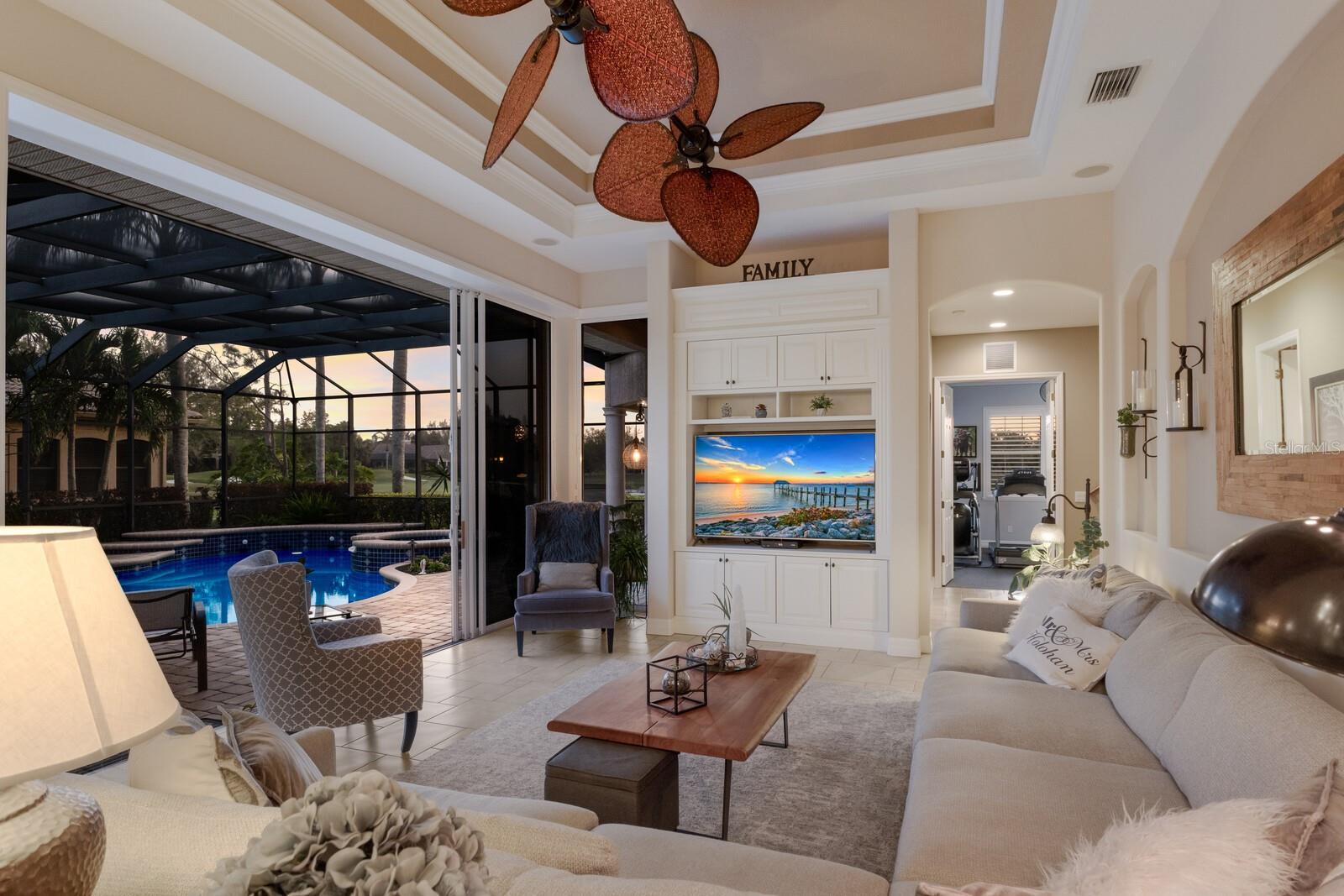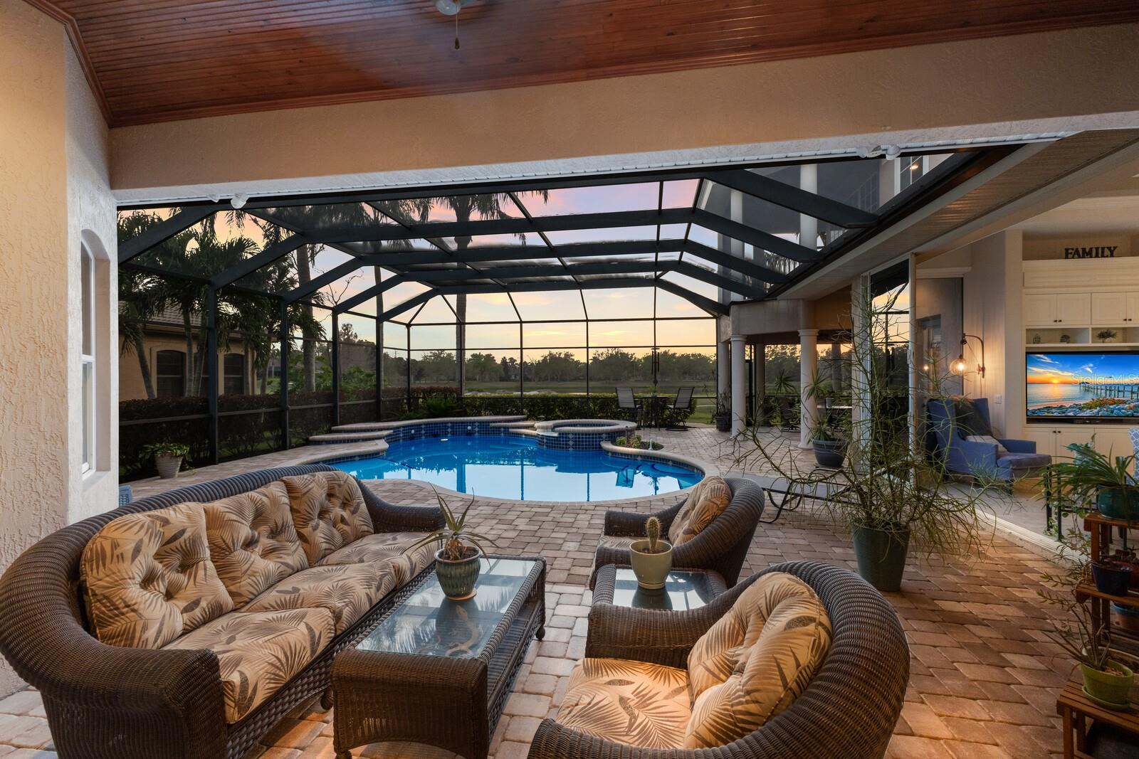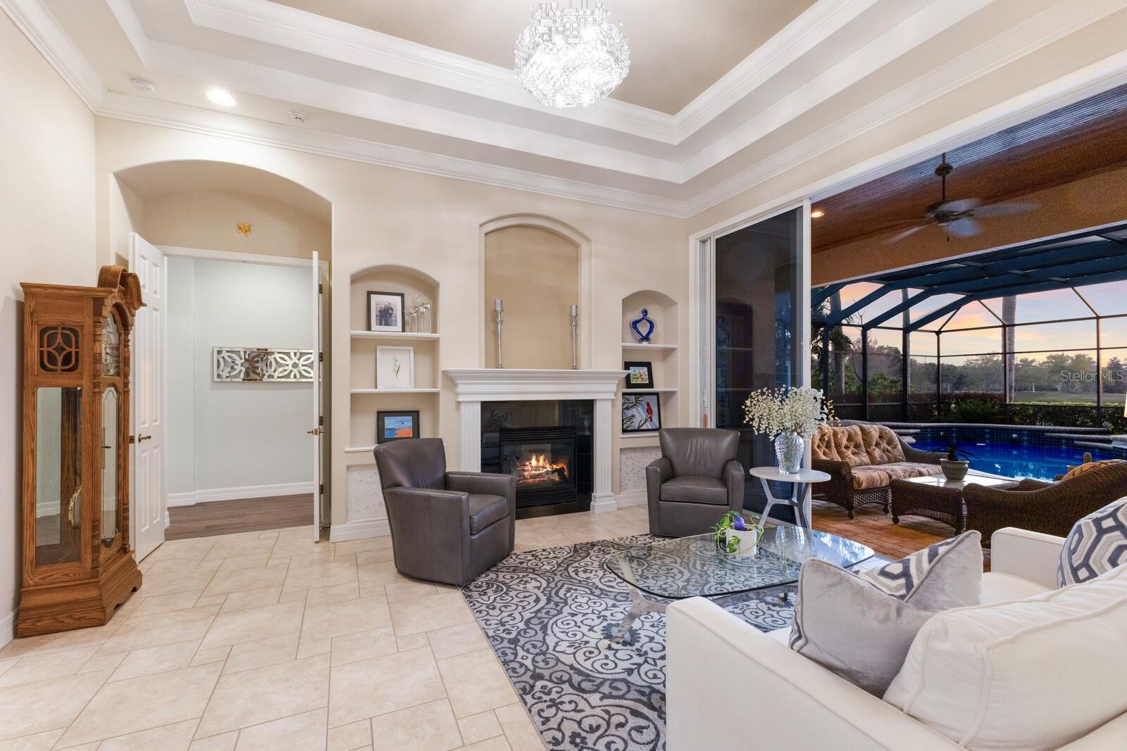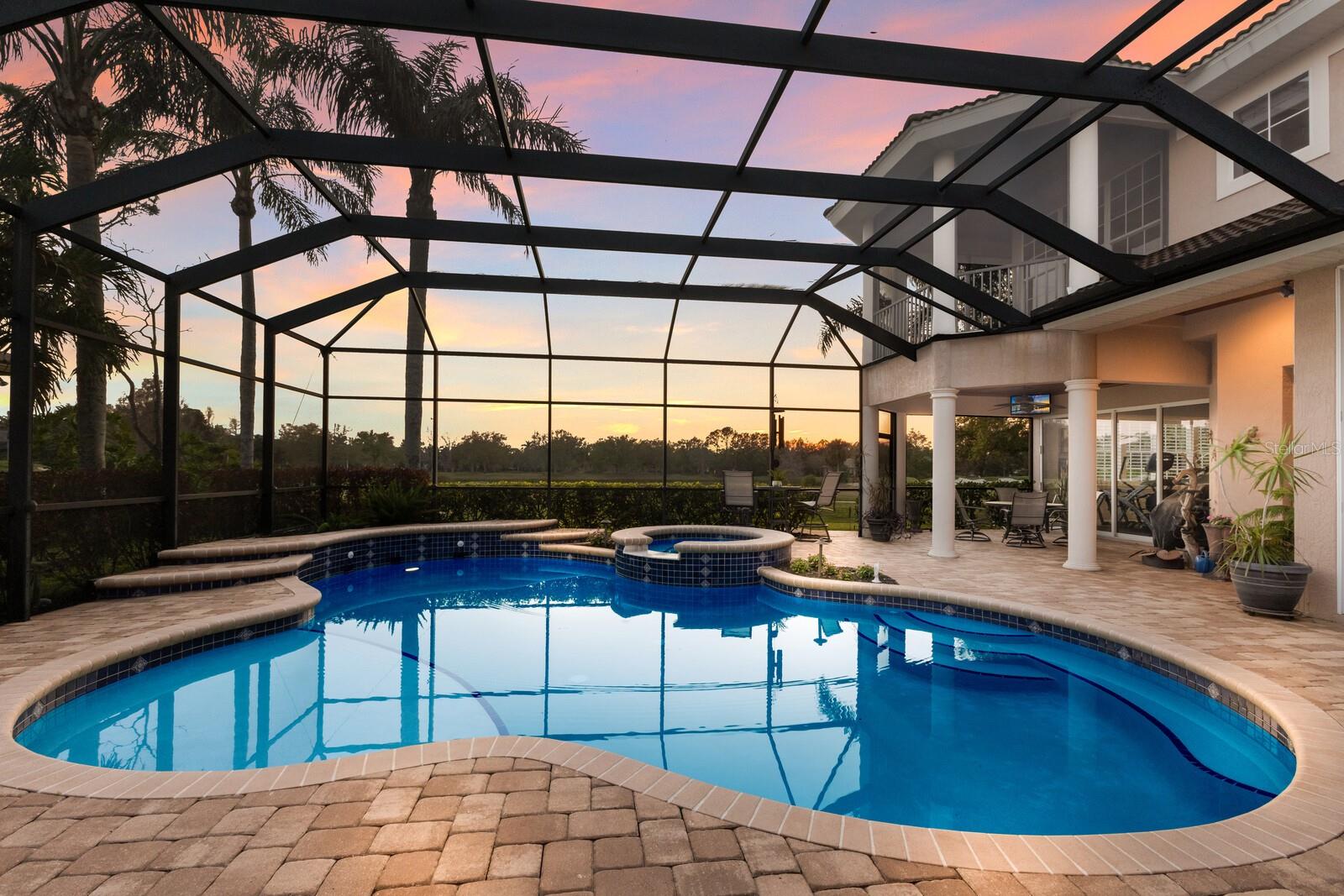 This stunning custom-built Peregrine home is perfectly positioned on one of the most sought-after homesites in Lakewood Ranch Golf & CC! Located on the Arnold Palmer designed Cypress Links #7, it offers breathtaking golf & water views. From the moment you arrive, the impressive curb appeal, circular drive & lush landscape set the stage for the elegance that awaits. Beautiful double glass doors open into a bright & welcoming foyer guiding you to the main living spaces. To the right, you'll find the formal dining area -perfect for hosting elegant dinners & to the left, a private office with French doors, hardwood floors & custom built-ins. Designed for both comfort & sophistication, the living room features a cozy fireplace, tray ceilings & a wall of sliders that draw your eye to the picturesque outdoors. A butler's pantry with ample storage seamlessly connects the dining room to the newly remodeled kitchen, offering both style & functionality. It features an abundance of solid wood cabinetry, new backsplash, stainless appliances, granite countertops, double ovens, a breakfast bar & a spacious walk-in pantry. It also includes a charming eat-in area with a large aquarium window, offering the perfect spot to enjoy a morning coffee. Off the kitchen, the great room is an inviting space for family gatherings with built-in entertainment wall, tile floors, crown moldings, tray ceilings, architectural niches & sliders that bring the tropical outdoors in! At the rear of the home, a generous sized bonus room (currently used as a home gym) provides endless possibilities & is located next to a convenient pool bath. The luxurious primary suite offers a private retreat with a serene sitting area & windows that frame the amazing views. The recently remodeled ensuite bath is a true spa-like escape, featuring double quartz vanities, a huge walk-in shower & an elegant soaking tub. There are TWO walk-in closets with extensive built-in cabinetry providing ample storage, while glass block windows fill the space with natural light. The home's 2nd & 3rd bedrooms share a beautifully remodeled Jack-and-Jill bath with dual quartz vanities, seamless glass shower doors & new fixtures. Both bedrooms exude charm with hand-scraped wood floors, built-in window seats & walk-in closets with custom storage solutions. A beautiful hardwood staircase leads to an incredible second-level bonus suite, ideal for an in-law arrangement or private guest retreat. This space features a spacious living area with blackout blinds, a wet bar with fridge, a 4th bedroom & a full bath! A large 2nd floor screened-in balcony offers a peaceful place to sip a glass of wine while overlooking the tranquil natural surroundings. Designed for Florida's coveted indoor-outdoor lifestyle, this home boasts an expansive outdoor space with 2 covered areas adorned with cypress ceilings, perfect for relaxing or dining al fresco. A stunning heated pool with sun deck & spa create the ultimate backyard oasis. Bonus of a 3-car garage offering ample storage & epoxy flooring. LWR Golf & CC offers Social, Athletic & Golf memberships which are all OPTIONAL. These include FOUR 18-hole championship courses, a state-of-the-art fitness center, a junior Olympic pool, tennis, pickleball, dining, social activities year-round & MORE! Enjoy close proximity to endless shopping, incredible restaurants, vibrant arts, easy access to I-75, top-notch healthcare, A-rated schools & our award-winning area beaches!