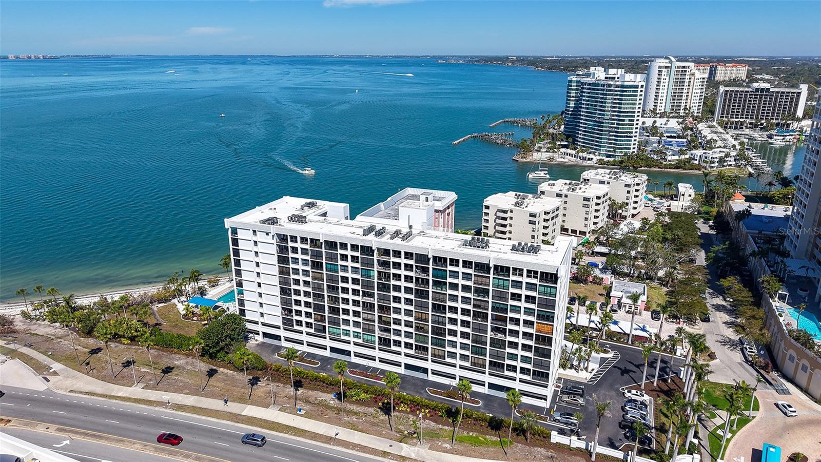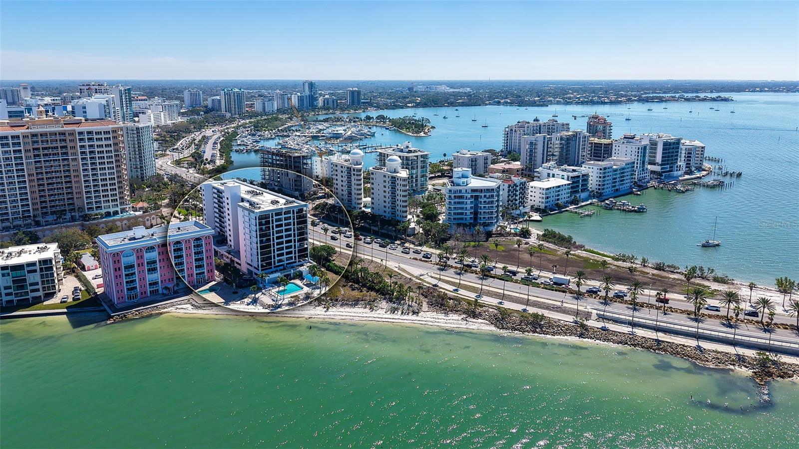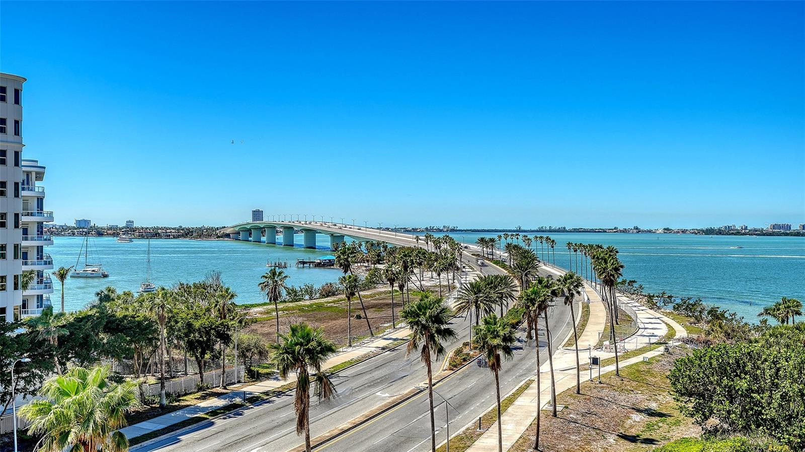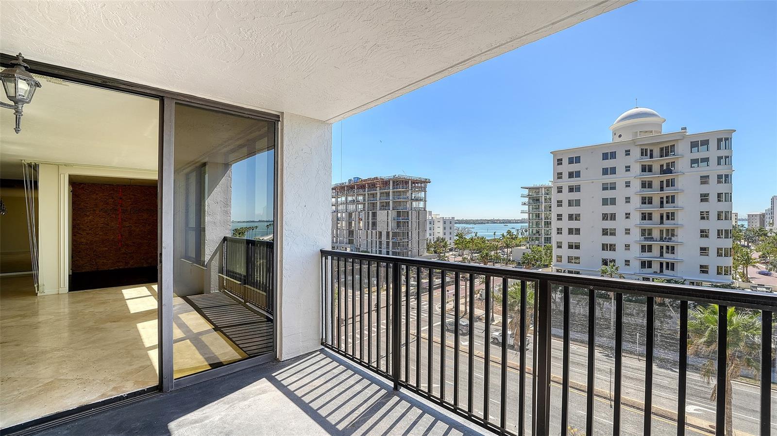 One or more photo(s) has been virtually staged. Don't miss this excellent opportunity to create your own downtown bay front home in one of the city's most valuable locations. Sunset Towers, which is named for the amazing sunsets we treasure every day, boasts a bay front saltwater pool, direct waterfrontage, a beautiful, elevated sun deck to enjoy the breezes off the bay, a private fitness center, a grilling and picnic area, kayak storage with water access and even a small beach. This fifth-floor corner unit captures one of the best locations in the building with views stretching from the waters of Sarasota Bay to the lights of the graceful arch of the Ringling Bridge and islands on the Gulf. Ready for your personal touches, this unit has marble floors, a previously redone kitchen with a pantry & stone counter, redone master and guest baths, two spacious split bedrooms, one with custom wood built-ins and a balcony. Located in the heart of downtown, residents of Sunset Towers enjoy an urban lifestyle with water and outdoor recreation, dining, theater, open air markets, art galleries, museums, boat parades, outdoor concerts, shopping and the myriad of the city's ever-changing activities at your doorstep. And Sunset Towers is a pet friendly building.