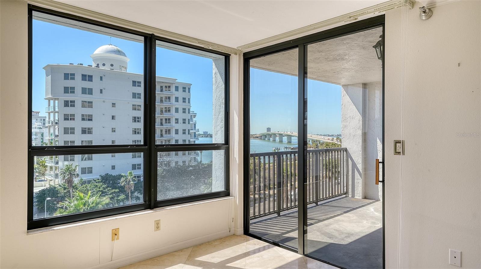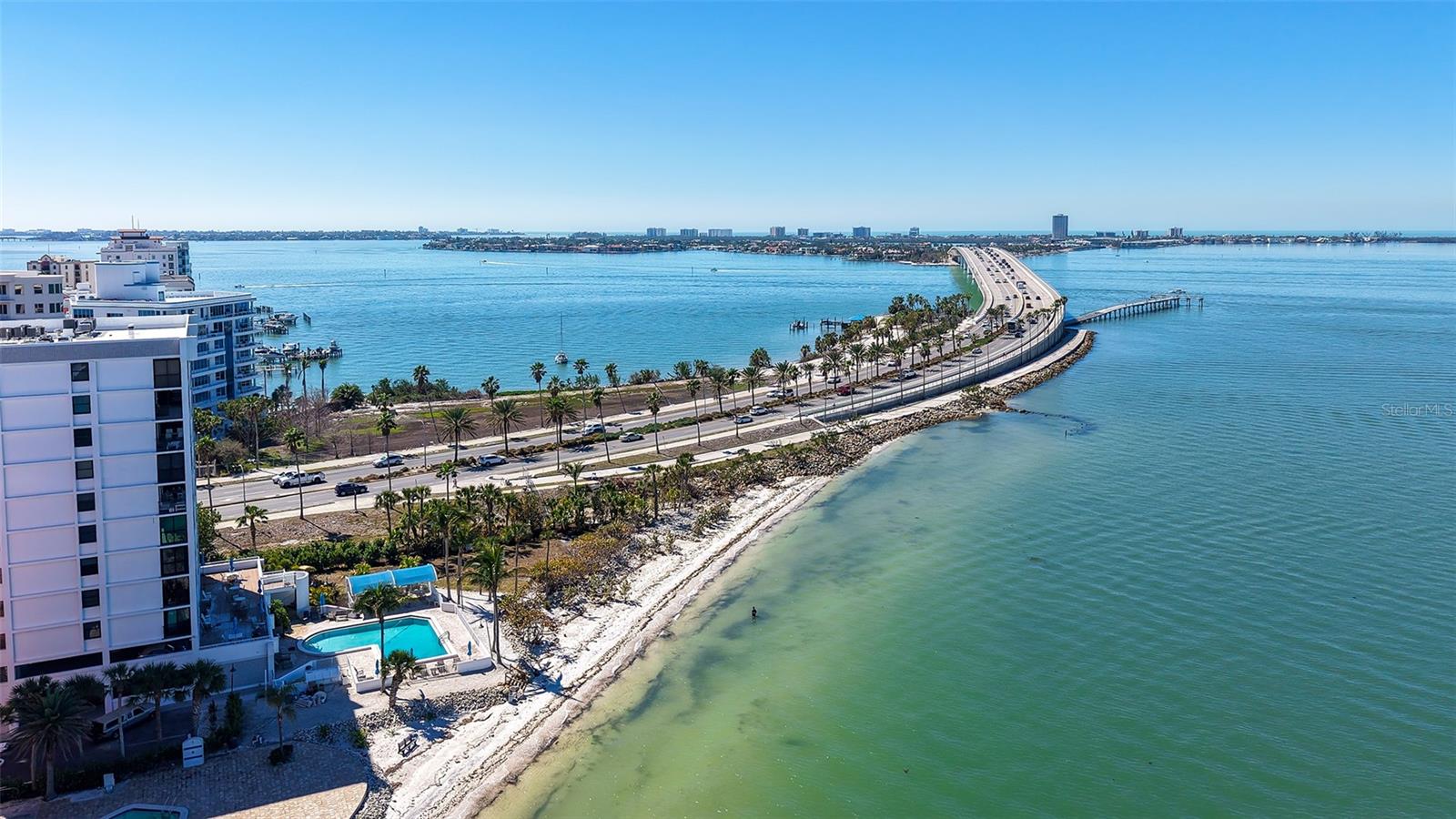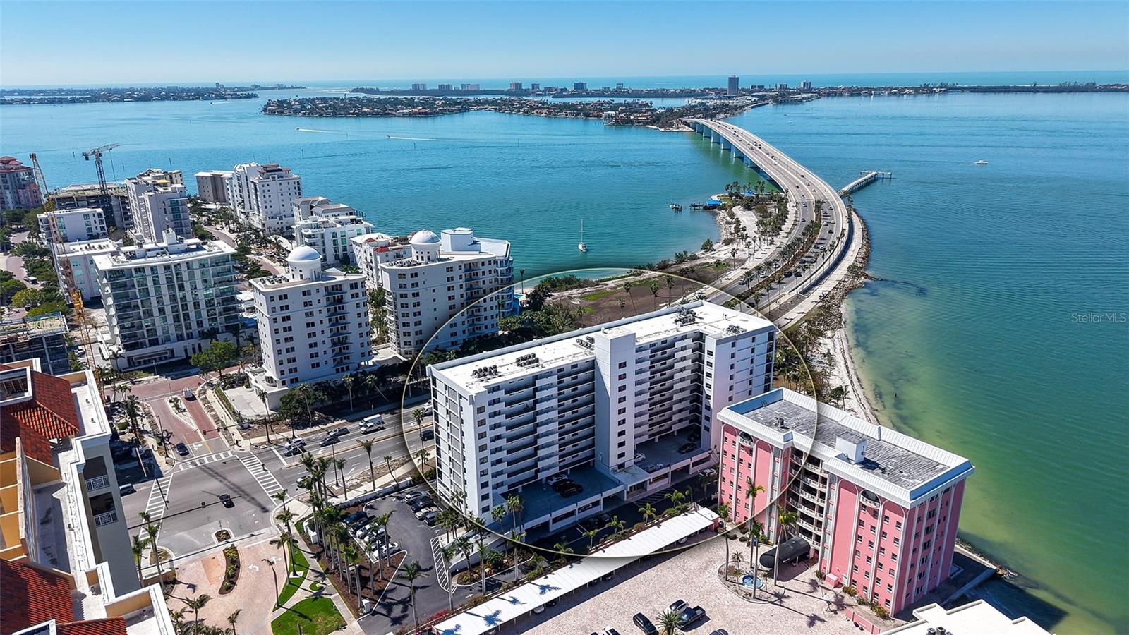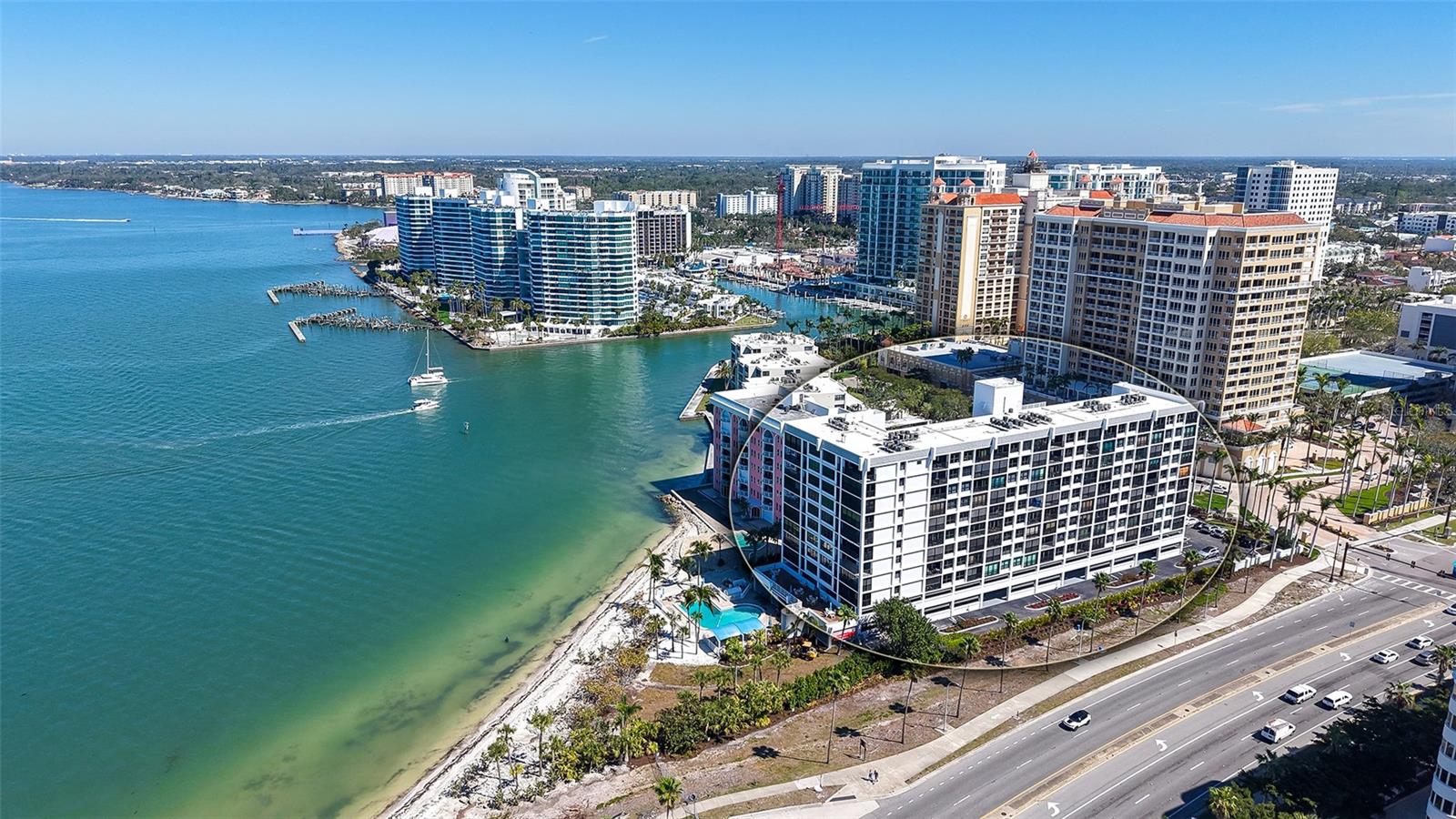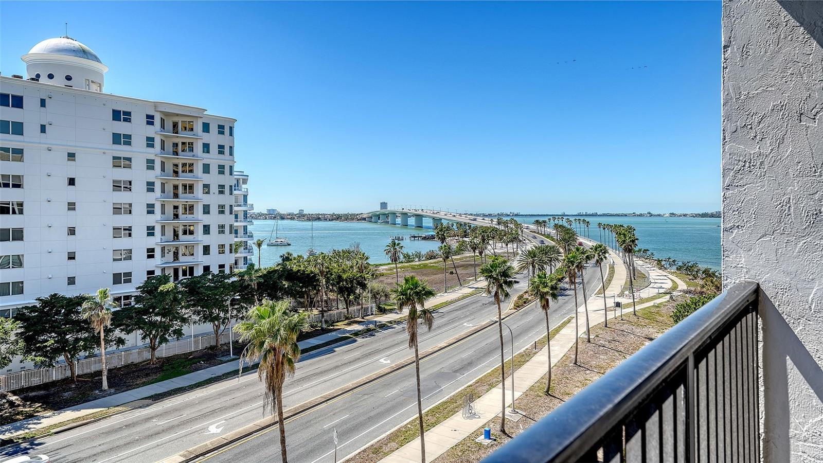 One or more photo(s) has been virtually staged. Don't miss this excellent opportunity to create your own downtown bay front home in one of the city's most valuable locations. Sunset Towers, which is named for the amazing sunsets we treasure every day, boasts a bay front saltwater pool, direct waterfrontage, a beautiful, elevated sun deck to enjoy the breezes off the bay, a private fitness center, a grilling and picnic area, kayak storage with water access and even a small beach. This fifth-floor corner unit captures one of the best locations in the building with views stretching from the waters of Sarasota Bay to the lights of the graceful arch of the Ringling Bridge and islands on the Gulf. Ready for your personal touches, this unit has marble floors, a previously redone kitchen with a pantry & stone counter, redone master and guest baths, two spacious split bedrooms, one with custom wood built-ins and a balcony. Located in the heart of downtown, residents of Sunset Towers enjoy an urban lifestyle with water and outdoor recreation, dining, theater, open air markets, art galleries, museums, boat parades, outdoor concerts, shopping and the myriad of the city's ever-changing activities at your doorstep. And Sunset Towers is a pet friendly building.