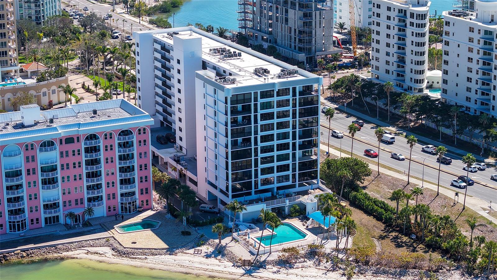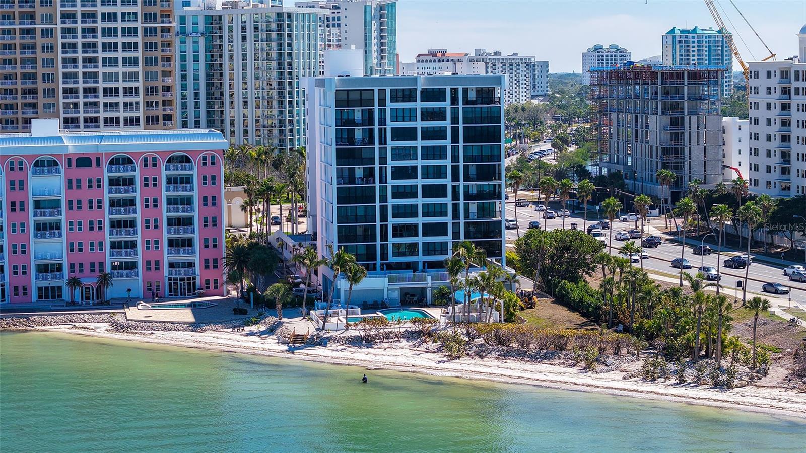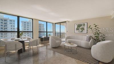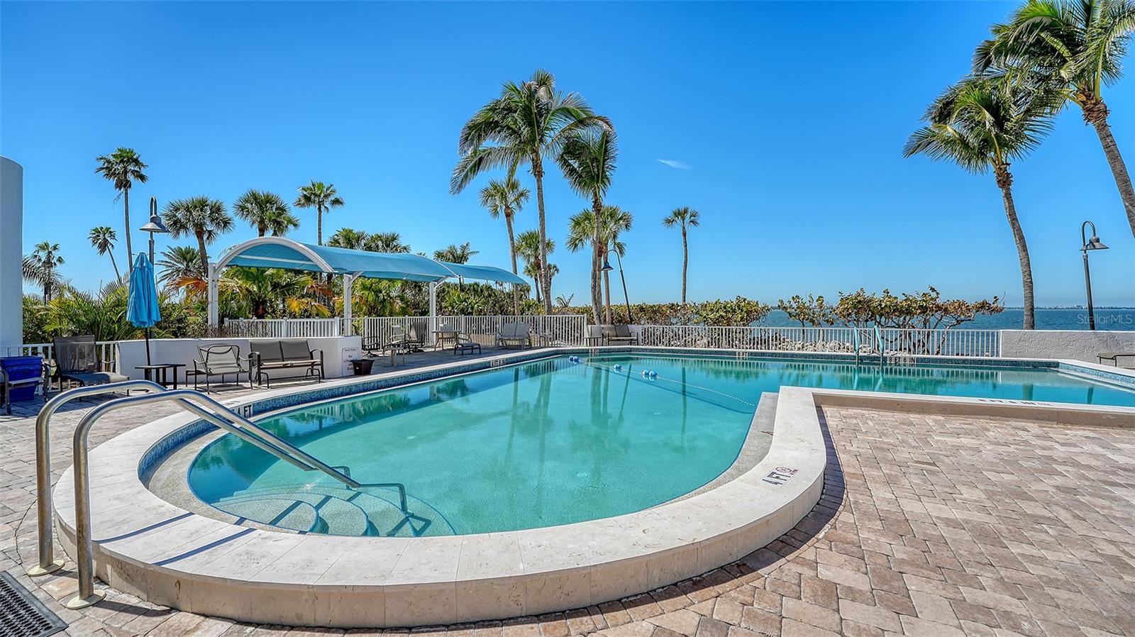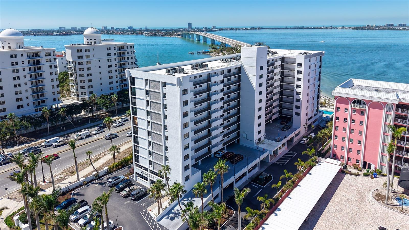 One or more photo(s) has been virtually staged. Don't miss this excellent opportunity to create your own downtown bay front home in one of the city's most valuable locations. Sunset Towers, which is named for the amazing sunsets we treasure every day, boasts a bay front saltwater pool, direct waterfrontage, a beautiful, elevated sun deck to enjoy the breezes off the bay, a private fitness center, a grilling and picnic area, kayak storage with water access and even a small beach. This fifth-floor corner unit captures one of the best locations in the building with views stretching from the waters of Sarasota Bay to the lights of the graceful arch of the Ringling Bridge and islands on the Gulf. Ready for your personal touches, this unit has marble floors, a previously redone kitchen with a pantry & stone counter, redone master and guest baths, two spacious split bedrooms, one with custom wood built-ins and a balcony. Located in the heart of downtown, residents of Sunset Towers enjoy an urban lifestyle with water and outdoor recreation, dining, theater, open air markets, art galleries, museums, boat parades, outdoor concerts, shopping and the myriad of the city's ever-changing activities at your doorstep. And Sunset Towers is a pet friendly building.