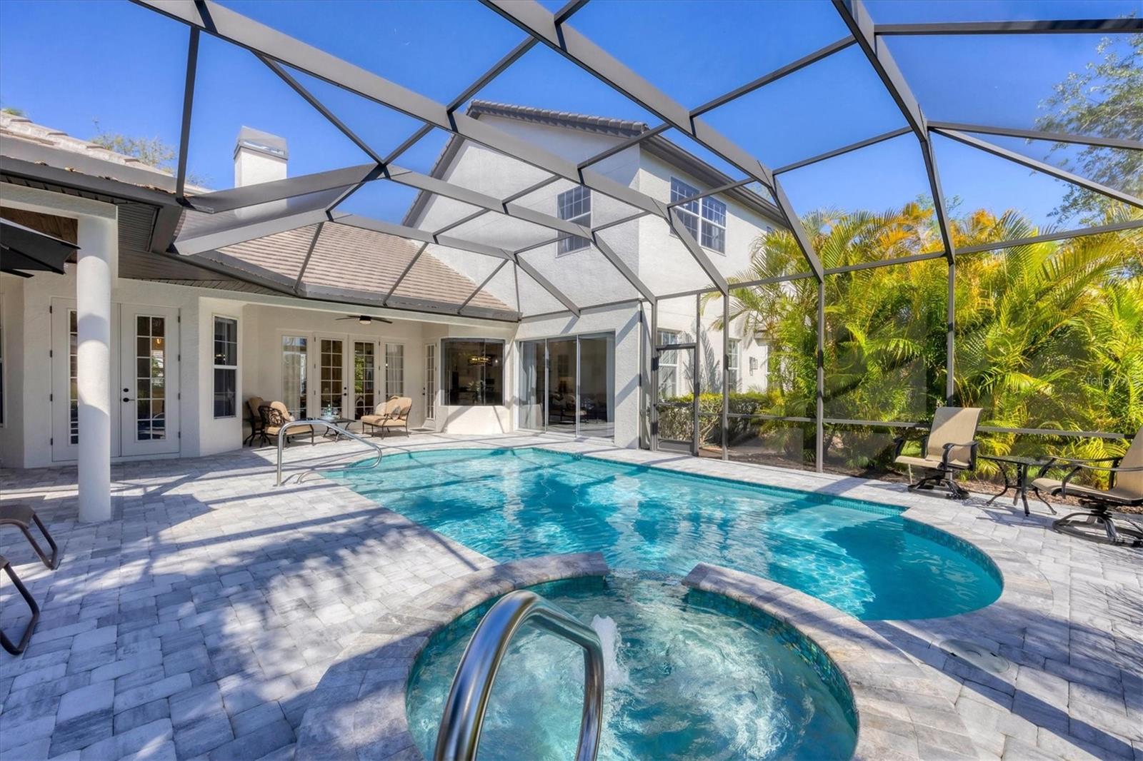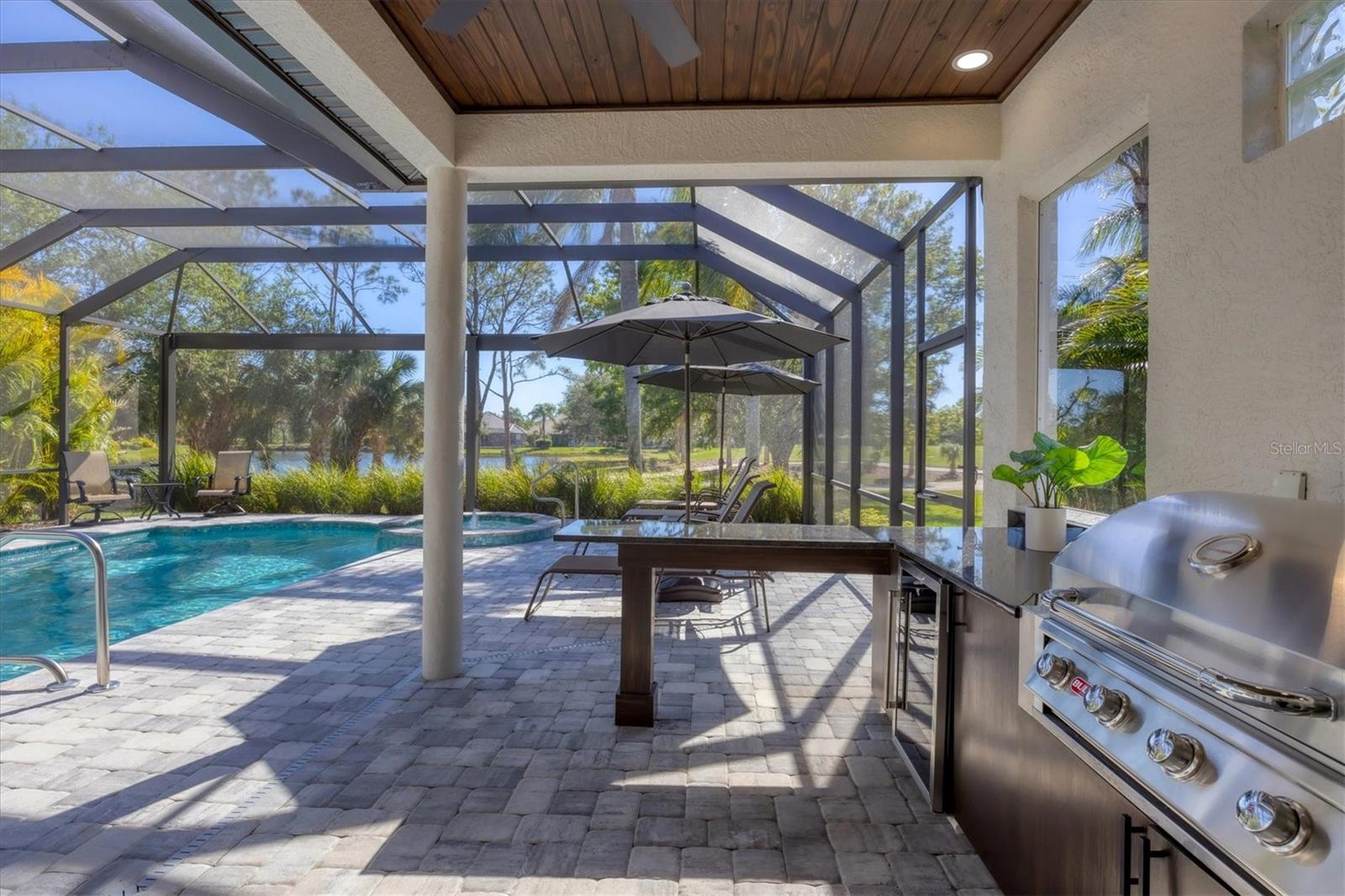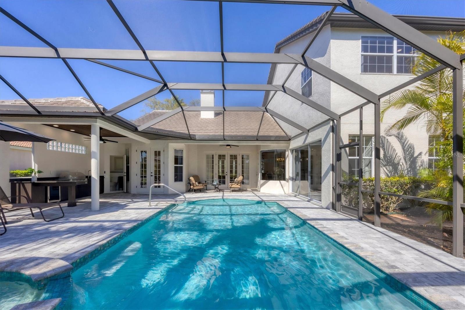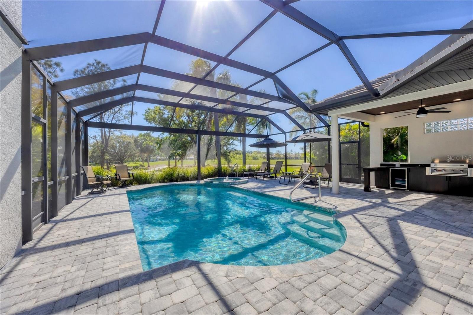 Luxury Living on the Fairway, 6540 The Masters Avenue 2-story home in Lakewood Ranch is sold furnished and ready for immediate occupancy. Nestled in the highly sought after community of Lakewood Ranch Country Club, this stunningly updated estate home offers an unparalleled blend of elegance and modern convenience. Overlooking the sixth hole of The Legacy Golf Course, this 5-bedroom, 4-bathroom home, complete with a large second floor bonus room and dedicated office with french doors, delivers breathtaking golf course views and refined indoor-outdoor living. Step inside to discover a fully renovated interior, where new engineered wood flooring flows throughout the open-concept layout on the first level. The chef's kitchen is a masterpiece, featuring new cabinetry, quartz counters, GE Monogram appliances and island with seating...perfect for entertaining. The outdoor space is a true showstopper, with a newly resurfaced and retiled pool, updated panoramic pool screens, and brand-new pavers enhancing the expansive lanai. Enjoy Florida's year-round sunshine in your new summer kitchen, ideal for al fresco dining while soaking in the picturesque golf course views. With a newer roof (2018), new electronic blinds and recent exterior and interior paint, this home is move-in ready and designed for effortless luxury. All the closets have custom built in cabinetry and primary closet has extra room for large safe. All bathrooms were updated in 2022, including the half bath in the lanai. Enjoy the front porch with matching rocking chairs for early morning coffee or evening glass of wine. The side load, 3-car garage has epoxy floor and extra storage room in a loft space above! Don't miss this rare opportunity to own an exquisite golf course retreat in one of Lakewood Ranch's most coveted communities with the low HOA fees of $150 a year! Convenience is key, located just minutes to Waterside, UTC, Interstate 75, the beautiful beaches of Sarasota and Sarasota/Bradenton airport! Hurry in and make this house your next home sweet home!