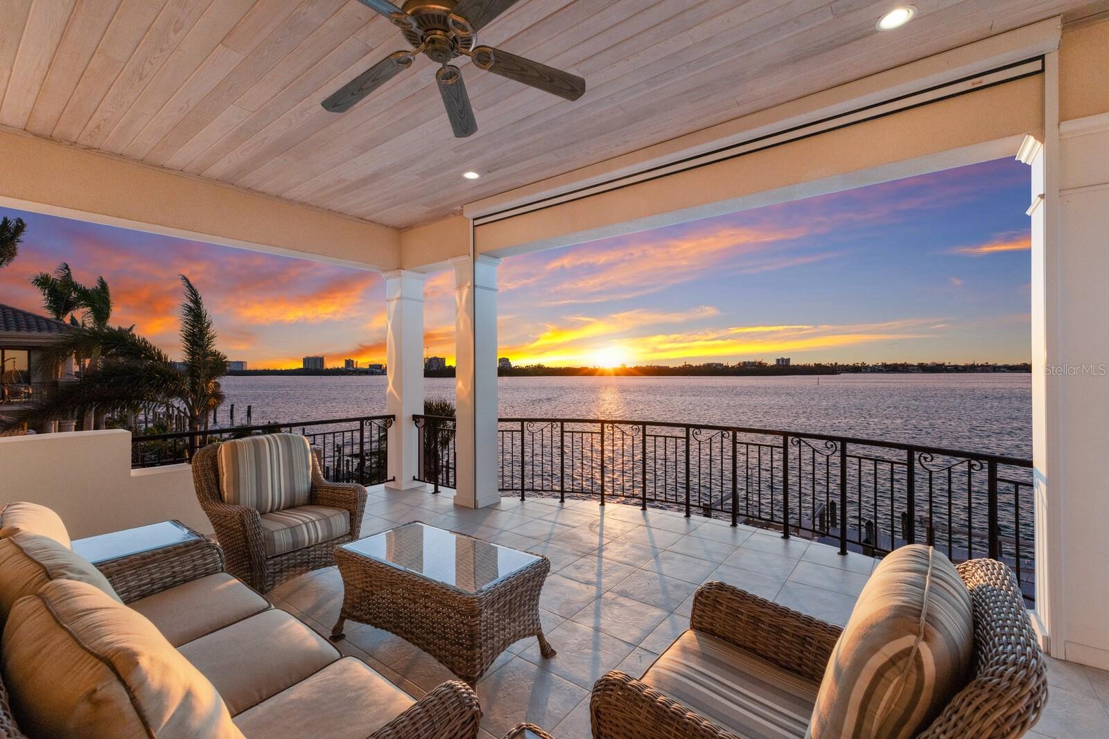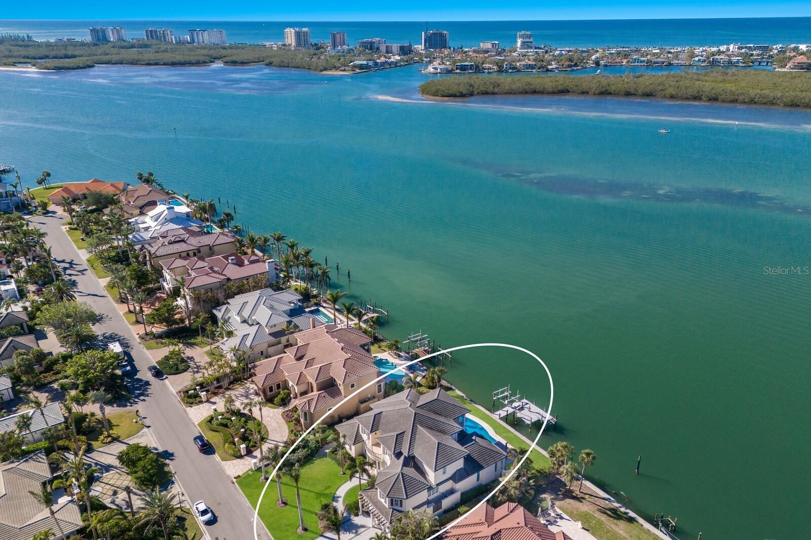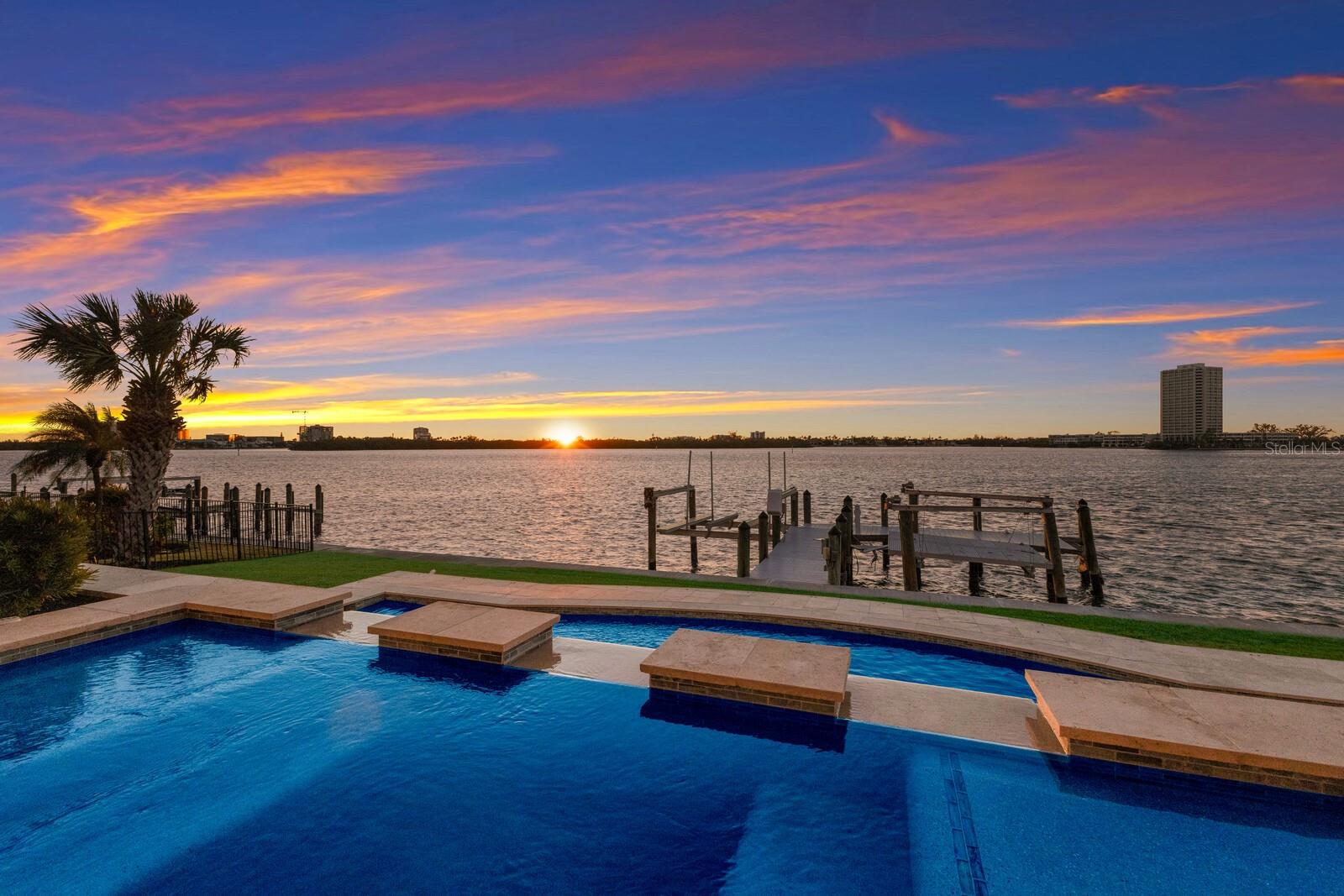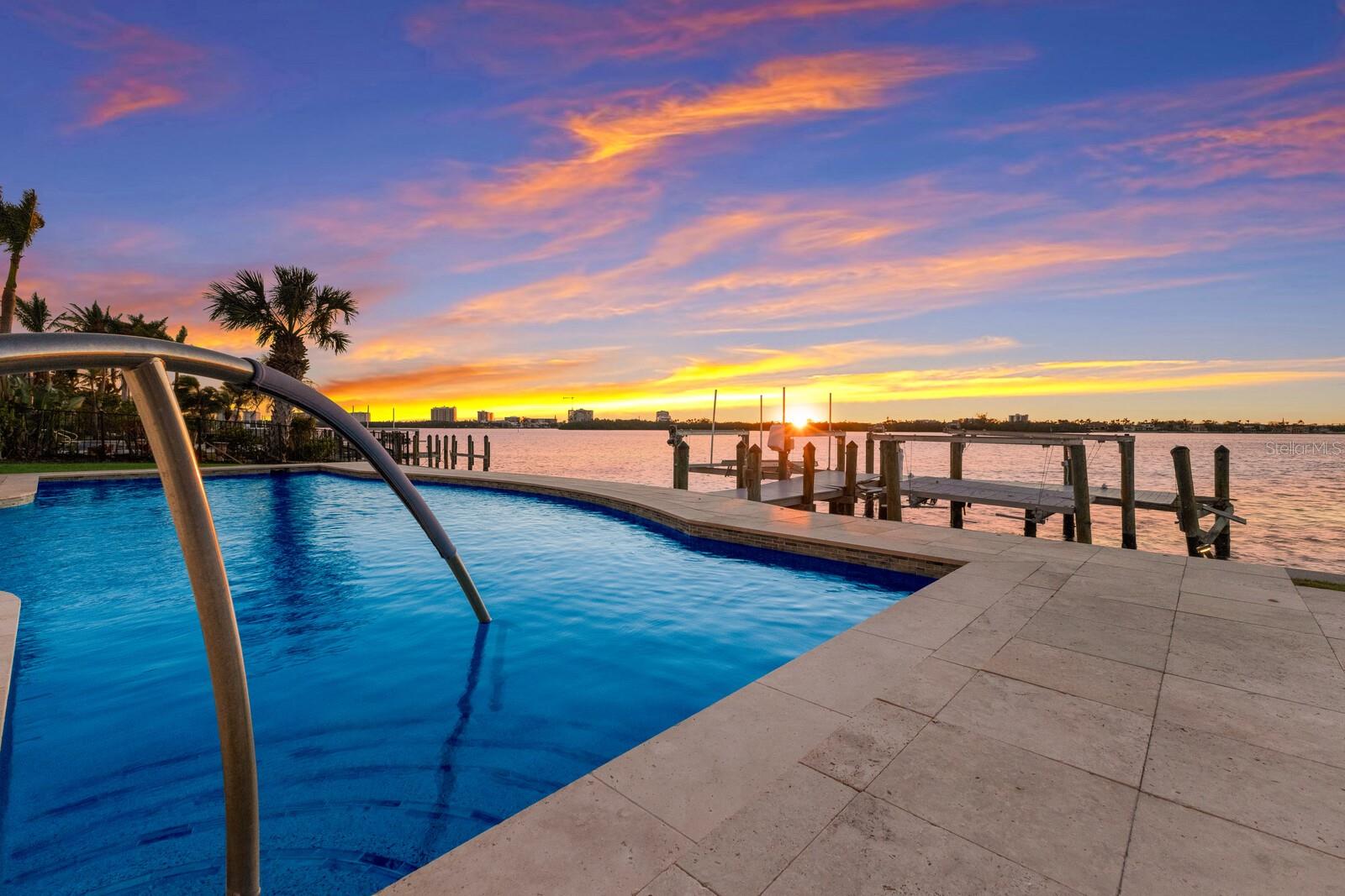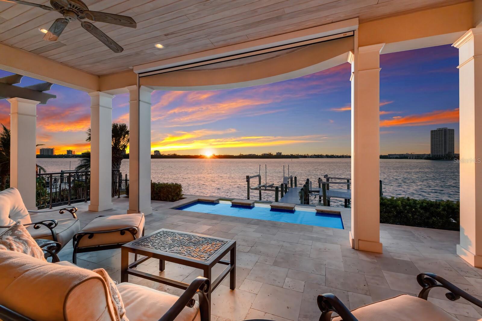 This exceptional Bayfront residence is perfectly positioned in one of Bird Key's most sought-after locations, offering breathtaking western-facing views of Sarasota Bay from a quiet cul-de-sac. Custom-built in 2017 by renowned builder Murray Homes, this home exemplifies superior craftsmanship, thoughtful design, and exquisite finishes. From the moment you arrive, this well-appointed home makes a striking impression with its manicured front lawn, lush landscaping, and impeccable curb appeal. Inside, natural light floods the space, drawing attention to the panoramic water views through expansive walls of glass. The open-concept split floor plan seamlessly blends well-defined yet flowing living areas, striking an effortless balance of comfort and elegance. The chef's kitchen, designed for both function and style, flows seamlessly into the family room and informal dining area, making it ideal for both everyday living and entertaining. A formal living room with a gas fireplace and a separate dining room add a refined touch, while the office with custom built-ins provides a peaceful workspace. The primary suite on the main level, features direct terrace access and serene Bay views. Ascending the staircase or taking the elevator to the second floor, where two guest suites with en-suite bathrooms offer comfort and privacy. A sitting area and informal dining space open onto what is arguably the most captivating part of the home--a large, west-facing terrace that showcases unrivaled waterfront views and breathtaking sunsets over Lido Key. Additional features of this custom-built home include a spacious mezzanine-level room, which has been used as a hobby space and can easily be converted into a fourth bedroom with its own bathroom and walk-in closet (image is digitally staged). The owner has remodeling plans and quotes available to share with prospective buyers. There is also a large dedicated internal storage room that can be utilized as a second office, playroom, gym, or art studio. Unexpected in size, the large laundry room offers incredible versatility and has been used as a sewing room, office, and laundry combination. Designed for Sarasota's signature indoor-outdoor lifestyle, the exterior living spaces are equally impressive. A modern saltwater pool with a spillover hot tub takes center stage, surrounded by ample covered seating and lounging areas perfect for relaxation. The outdoor kitchen provides an ideal setting for entertaining, while the private dock--complete with an 8,000 lb boat lift, a kayak lift, and a newer seawall--offers direct access to Sarasota Bay. Throughout the home, high-quality oak wood flooring, notable Level 5 wall finishes, and a home generator with automatic switchover reflect the meticulous attention to detail. An oversized double-car garage provides convenient elevator access to all four levels. This is a rare opportunity to own a waterfront home built to the highest standards, offering the advantage of a 12-foot elevation while being only eight years old. Ideally located just minutes from Lido Beach, St. Armands Circle, and downtown Sarasota, Bird Key offers an unparalleled lifestyle of convenience and exclusivity. The Bird Key Yacht Club is also undergoing a complete rebuild, set to become one of Sarasota's premier social, tennis, and boating clubs upon its anticipated completion in 2026.
