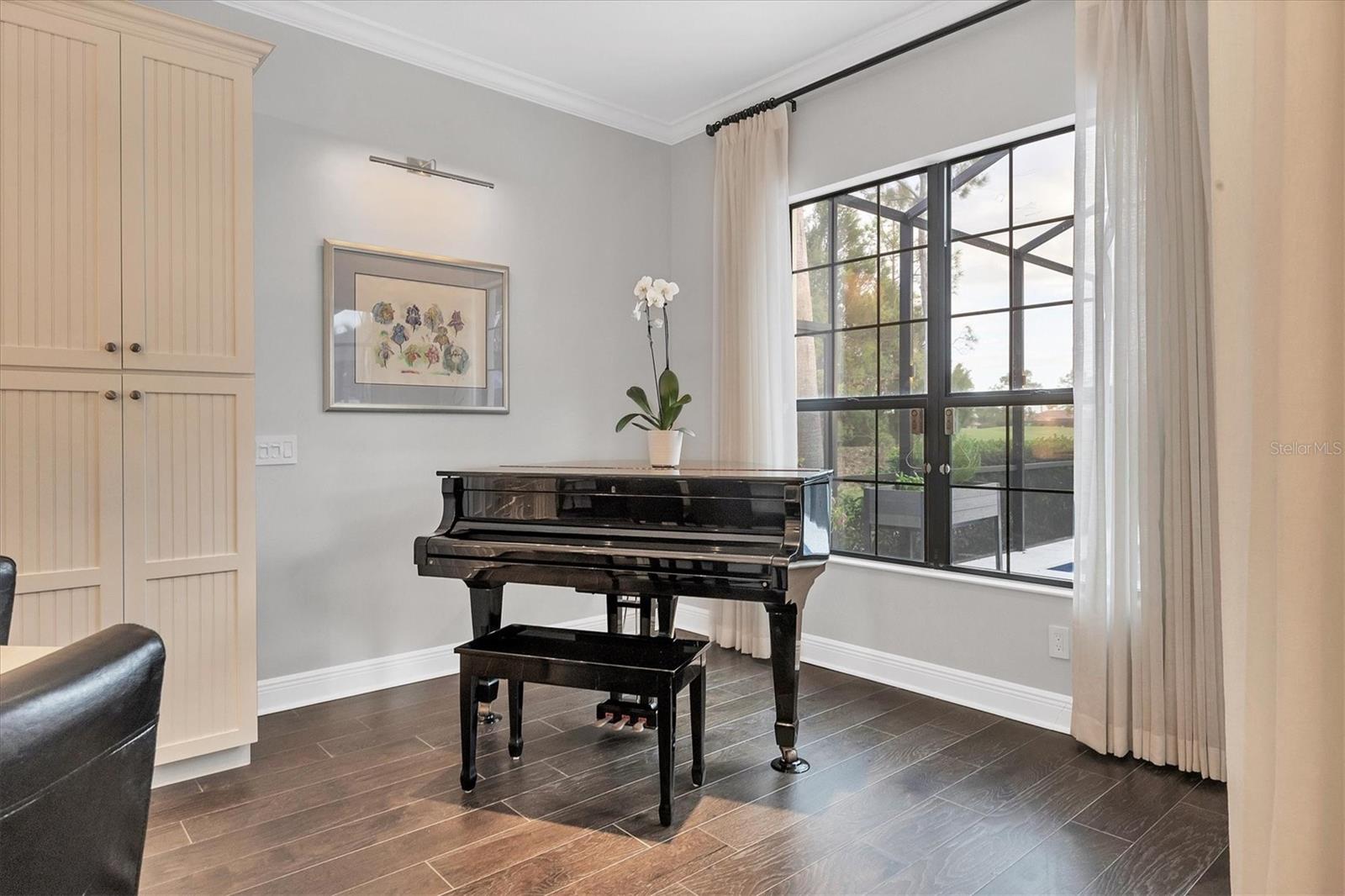 Majestically overlooking the sixth fairway of the esteemed Royal Lakes Golf Course, this exceptional three-bedroom, three-bath plus den residence offers panoramic views that seamlessly blend lush greenery with serene tranquility adjacent to a non-buildable homesite offering the ultimate in privacy. Upon entering through grand double glass doors, one is immediately enveloped in an ambiance of elegance and warmth. Rich wood flooring, intricate crown molding and soaring tray ceilings adorned with designer fixtures create an inviting atmosphere. The expansive great room features a discreetly integrated entertainment center within custom cabinetry, enhancing functionality and aesthetic appeal. A well-appointed wet bar, complete with a wine refrigerator, dedicated wine storage and sink, stands ready to facilitate gracious entertaining. The open-concept kitchen is a culinary masterpiece, boasting 42-inch custom cabinetry, premium stainless steel appliances, including a JennAir refrigerator, a gas cooktop, double convection ovens, and a sprawling 9-by-5-foot central island ideal for meal preparation and casual dining. Adjacent, the sunlit breakfast nook offers a serene space to enjoy morning fare while overlooking the picturesque landscape. The primary suite serves as a private sanctuary, featuring double walk-in closets meticulously designed by California Closets, complete with a wall safe and locking drawers for added security. The spa-inspired en-suite bath showcases split vanities, a spacious walk-in shower and exquisite tile work. Two additional guest suites provide comfort and privacy, each thoughtfully designed with ample storage and en-suite facilities. A versatile den offers flexibility to serve as a home office or library, catering to various lifestyle needs. Expansive sliding doors reveal a breathtaking lanai, where tongue-and-groove wood ceiling detailing adds warmth and character. The outdoor kitchen is a chef's delight, equipped with a large gas grill, glass-front refrigerator, full-sized oven and stainless steel backsplash, ideal for alfresco dining. The recently expanded 25-by-12-foot heated saltwater pool and spa area, adorned with travertine decking, variable LED lighting and an auto-filler system, offers an idyllic setting for relaxation and entertainment, all while overlooking the tranquil golf course. Additional features include three-car garage equipped with a 220-volt EV charging system, Smart Home NEST thermostats to ensure optimal climate control and energy efficiency. Both interior and exterior have been repainted, complemented by enhanced landscaping and lighting. Residents of Country Club East enjoy access to a wealth of amenities, including The Retreat with lap pool, walking paths, a dog park and two additional resort-style pools. For an optional and additional fee, residents can enjoy a private membership that includes four championship golf courses, Cypress Links, King's Dunes, Legacy and Royal Lakes, clubhouse with dining and bar services, fitness center and spa services. Country Club East is conveniently near top-rated schools, fine dining, boutique shopping and cultural attractions. This extraordinary estate offers a harmonious blend of opulence, comfort and unparalleled views, presenting a rare opportunity to experience the quintessential Florida lifestyle. Schedule your private tour today to fully appreciate the exceptional craftsmanship and unique features of this remarkable home.
