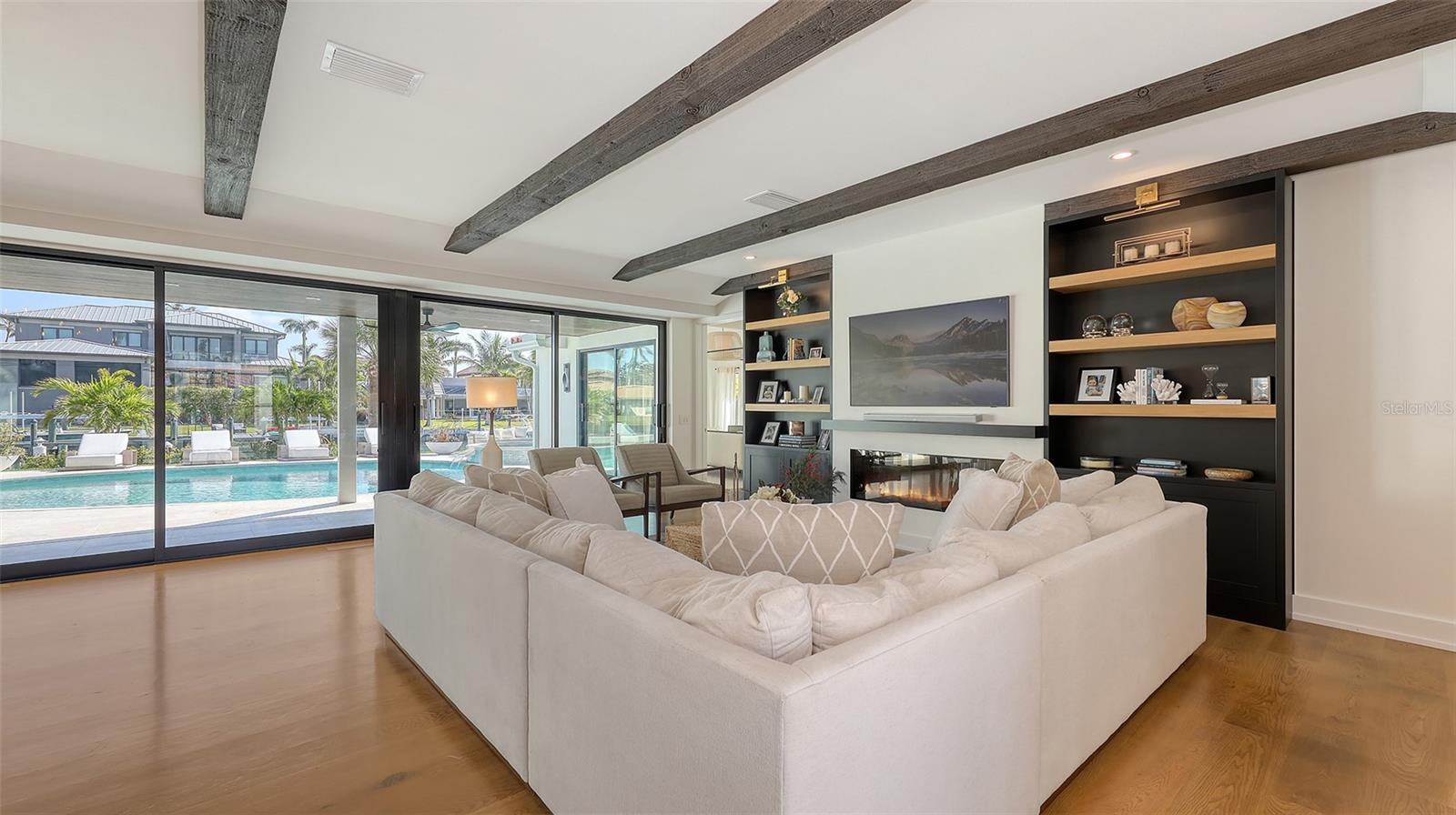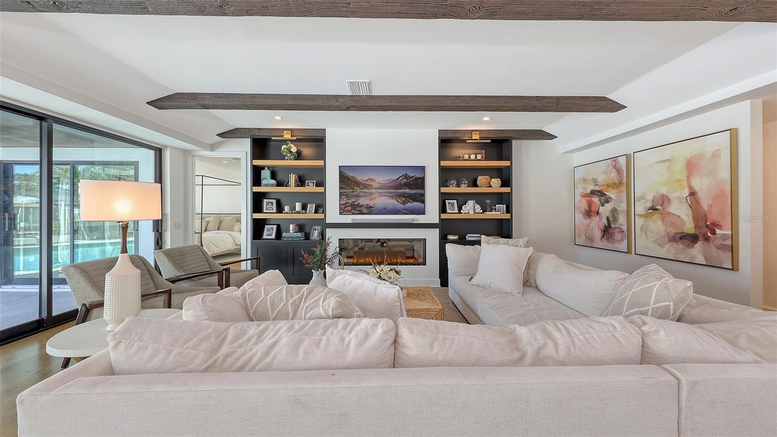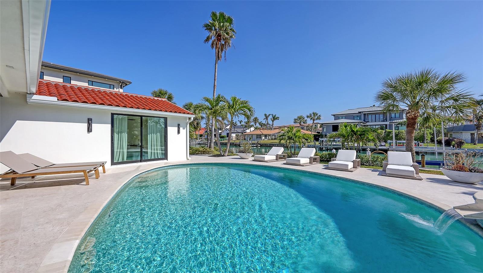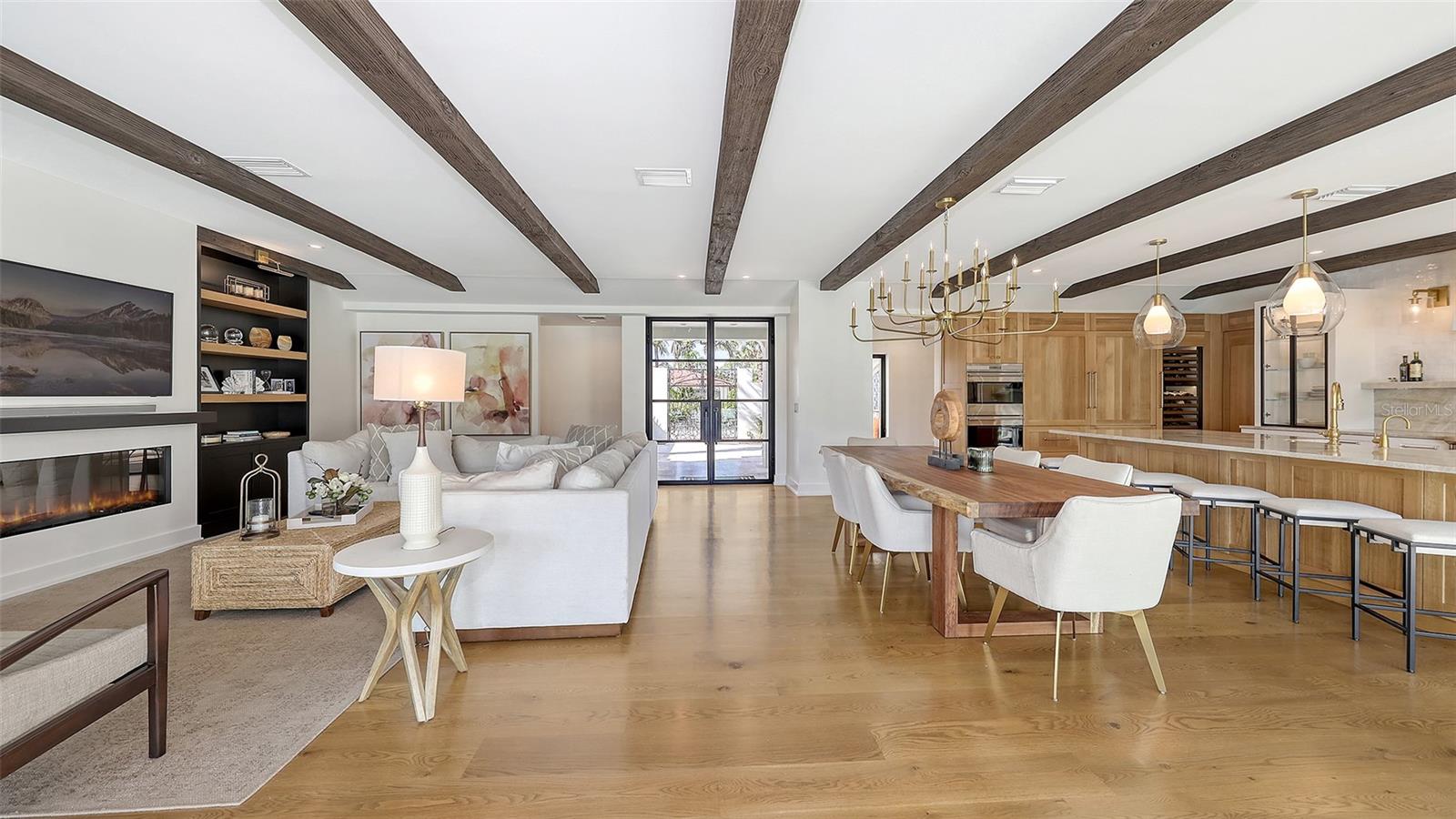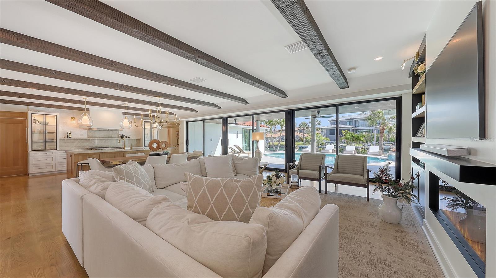 Tropical Florida living is epitomized by glamorous finishes, superior comfort and exceptional quality throughout this stunningly renovated residence. Once inside, an updated focal wall in the great room features custom white oak shelves and an electric fireplace creating a dramatic first impression. Fresh paint, custom wood beams, all new imported Mirage wood floors, and stunning new lighting enhance this flowing floor plan, where natural light cascades over spacious rooms designed for gorgeous entertaining and everyday moments. A defining focal point, the gourmet kitchen features white oak accents, updated quartzite countertops, a stunning Wolf range, Wolf double ovens and a Sub Zero wine fridge. A custom door assembled to match the cabinetry opens from the kitchen into a spacious pantry and laundry room. Perfectly detailed, the primary bedroom is a haven of serenity with a newly-tiled designer bathroom and easy access to the lanai for sipping your morning latte. The resort-worthy pool area will transport you to a paradise of relaxation, with ample new space for sun lounging. Completing this amazing property is a new tile roof, new ES impact rated sliding glass doors, a 2-car garage with updated door, opener and Epoxy flooring, new landscaping, an updated seawall, and a well water system upgraded with sprinklers. This home is truly like new, and presents a lifestyle without compare just moments from downtown Sarasota and St. Armands.