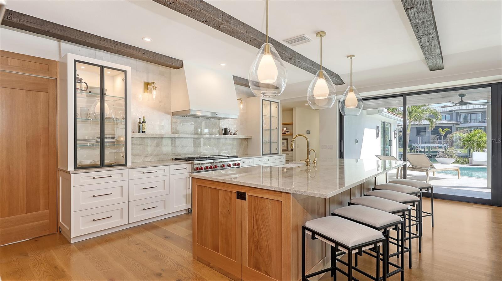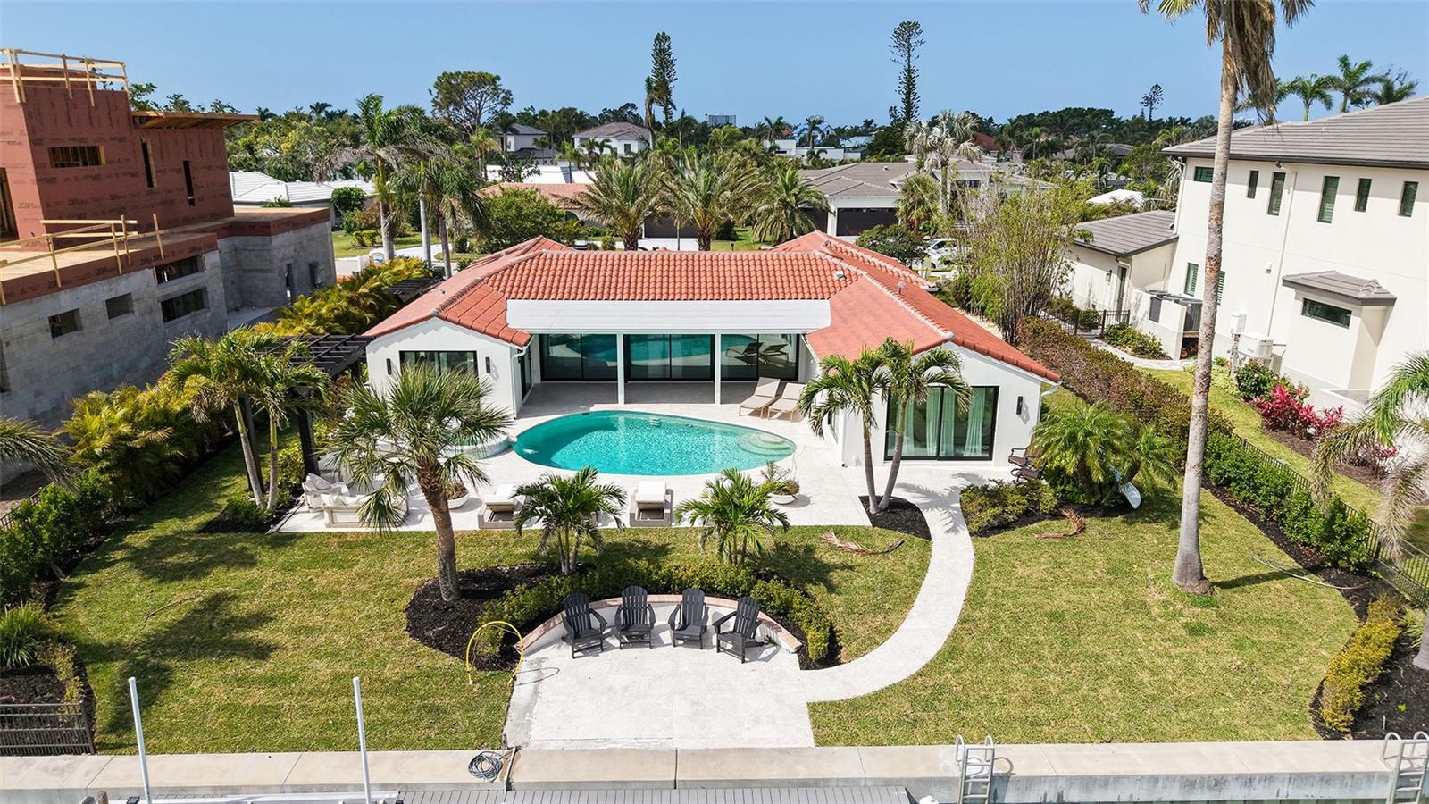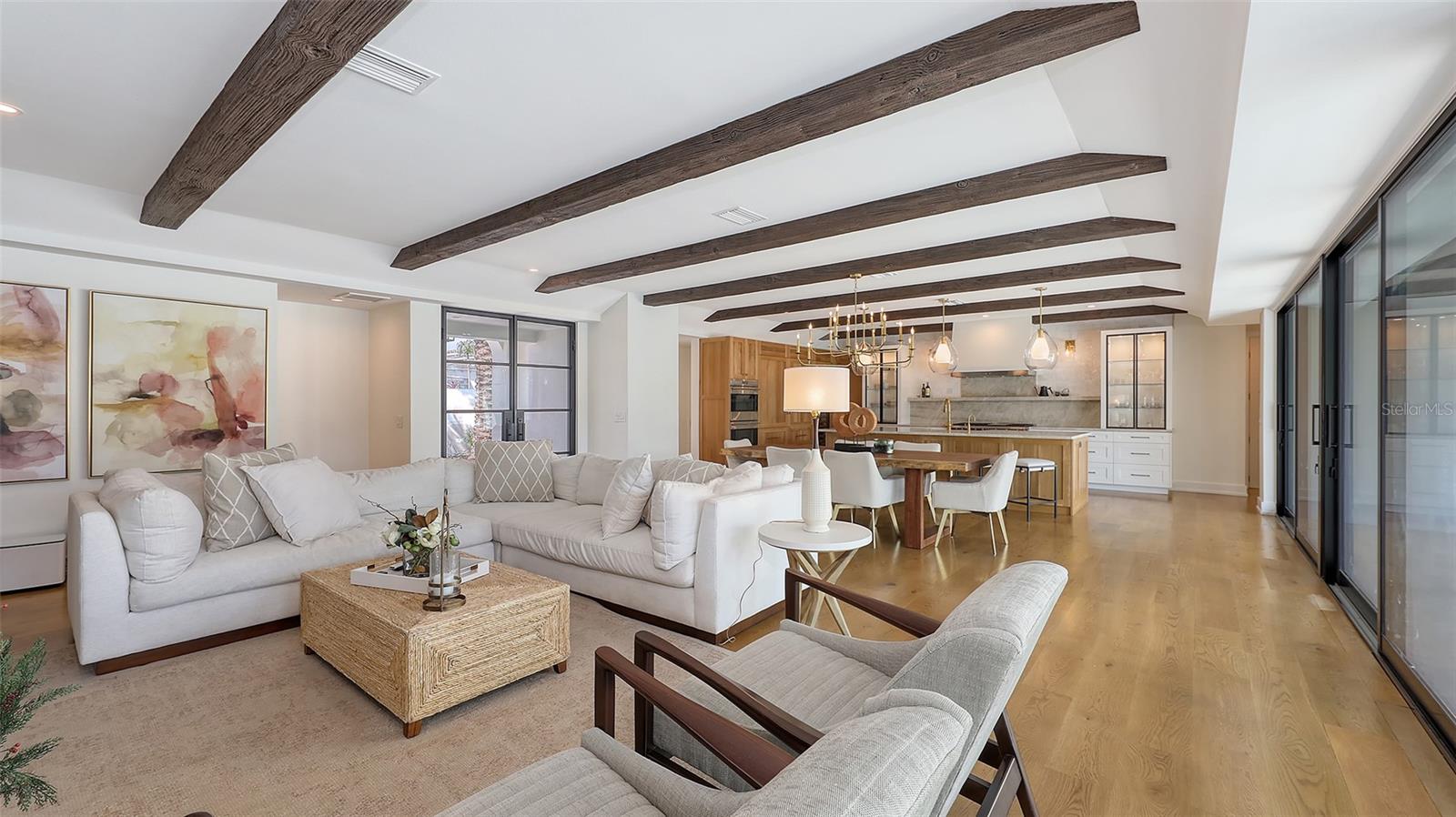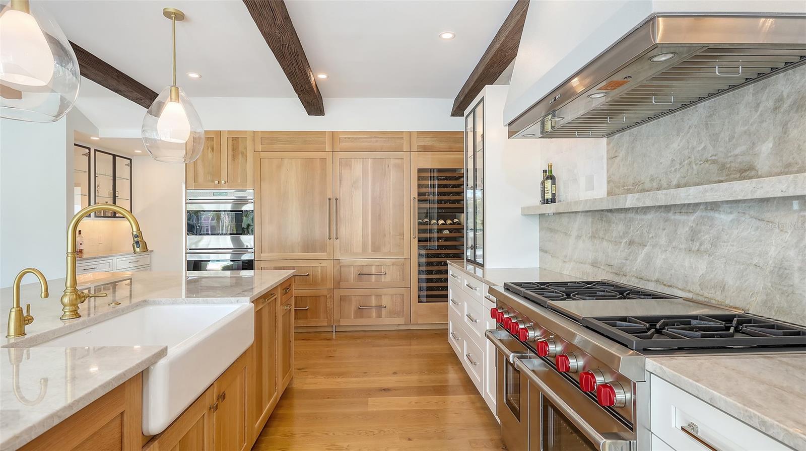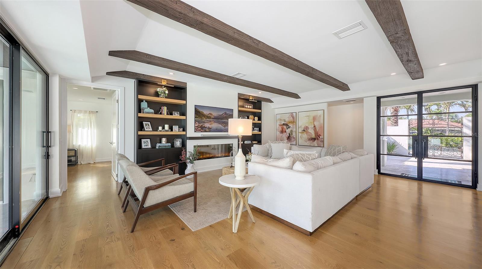 Tropical Florida living is epitomized by glamorous finishes, superior comfort and exceptional quality throughout this stunningly renovated residence. Once inside, an updated focal wall in the great room features custom white oak shelves and an electric fireplace creating a dramatic first impression. Fresh paint, custom wood beams, all new imported Mirage wood floors, and stunning new lighting enhance this flowing floor plan, where natural light cascades over spacious rooms designed for gorgeous entertaining and everyday moments. A defining focal point, the gourmet kitchen features white oak accents, updated quartzite countertops, a stunning Wolf range, Wolf double ovens and a Sub Zero wine fridge. A custom door assembled to match the cabinetry opens from the kitchen into a spacious pantry and laundry room. Perfectly detailed, the primary bedroom is a haven of serenity with a newly-tiled designer bathroom and easy access to the lanai for sipping your morning latte. The resort-worthy pool area will transport you to a paradise of relaxation, with ample new space for sun lounging. Completing this amazing property is a new tile roof, new ES impact rated sliding glass doors, a 2-car garage with updated door, opener and Epoxy flooring, new landscaping, an updated seawall, and a well water system upgraded with sprinklers. This home is truly like new, and presents a lifestyle without compare just moments from downtown Sarasota and St. Armands.