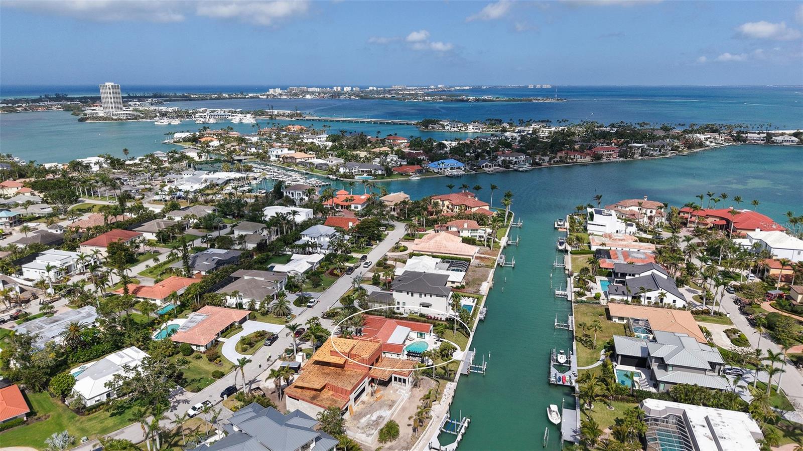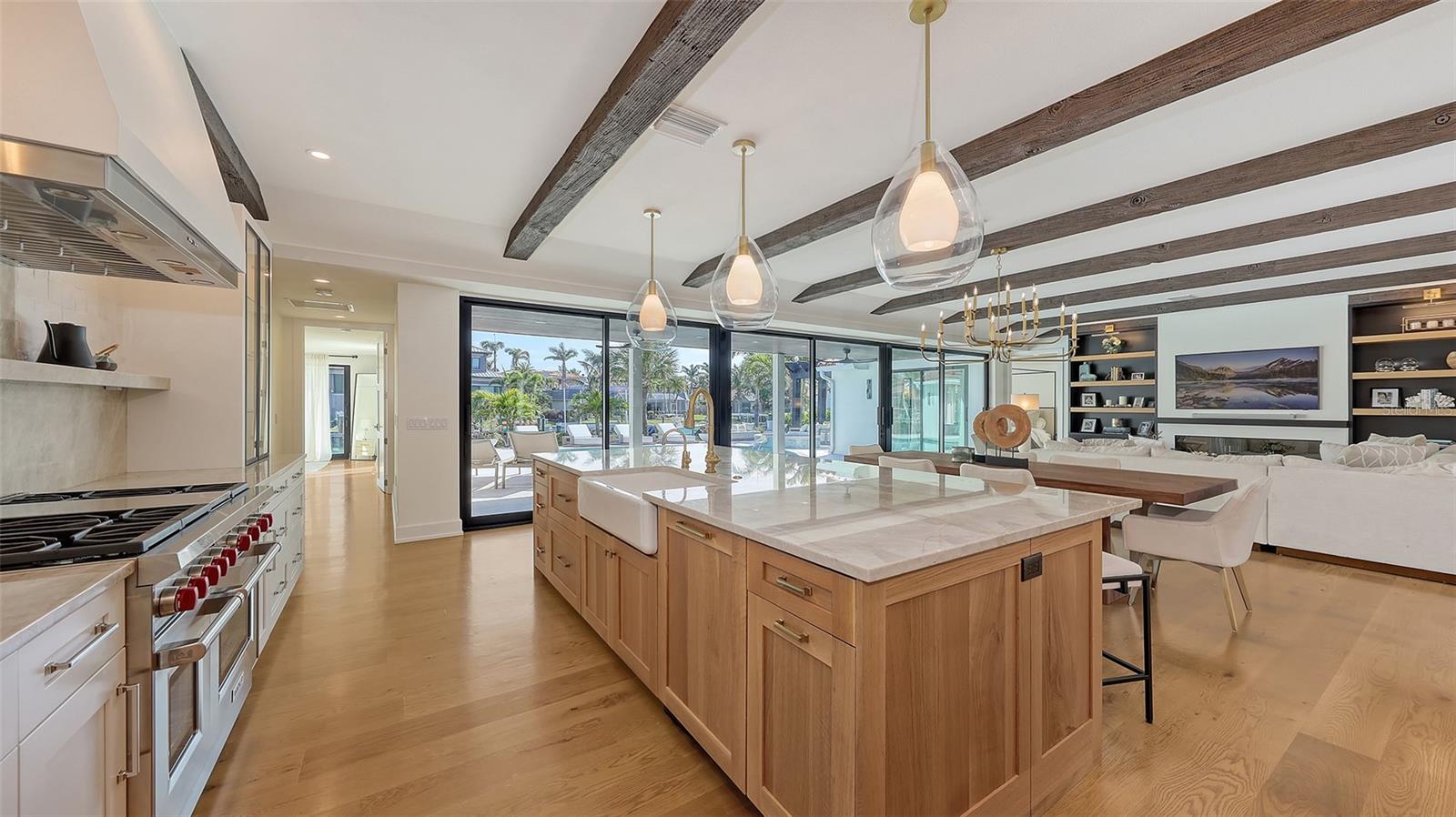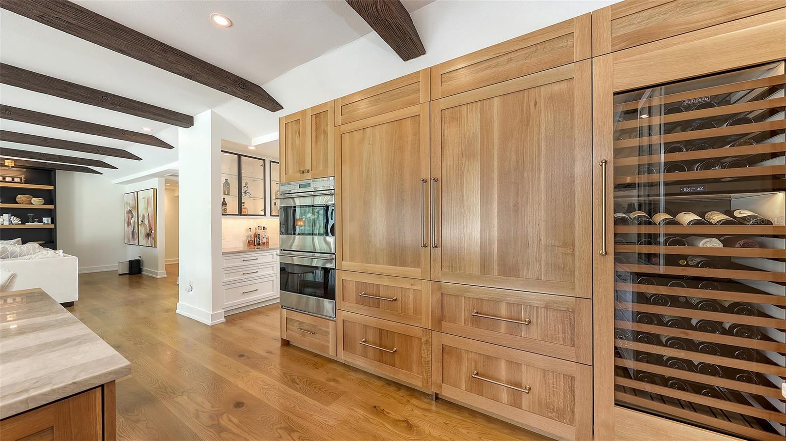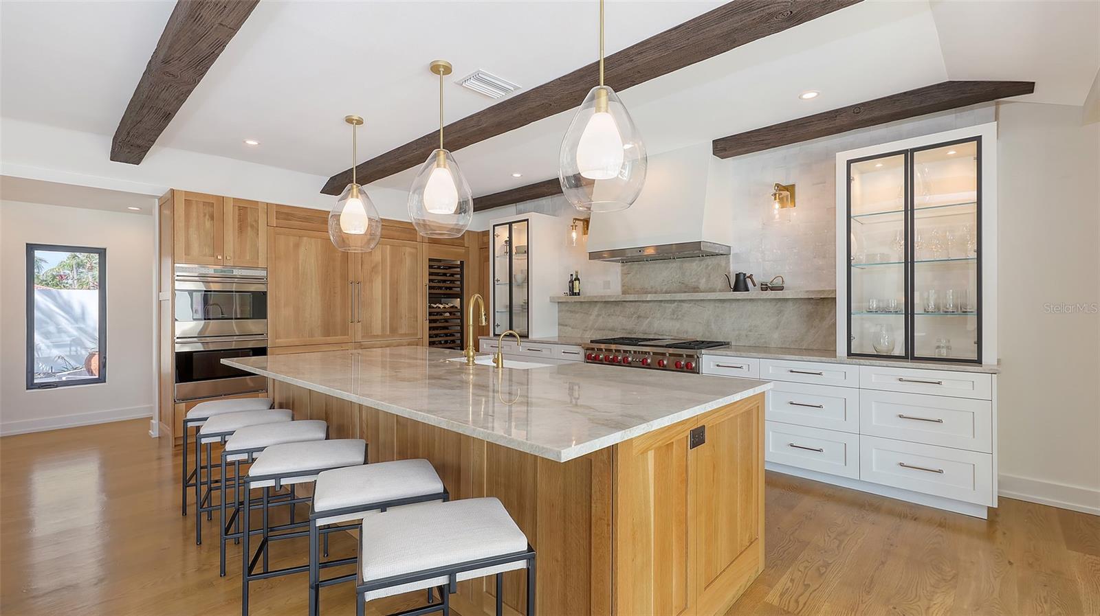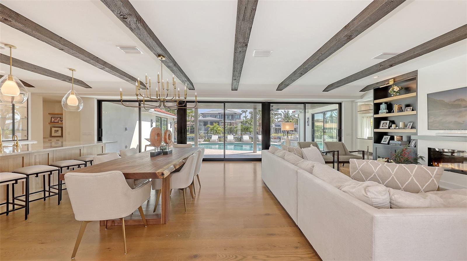 Tropical Florida living is epitomized by glamorous finishes, superior comfort and exceptional quality throughout this stunningly renovated residence. Once inside, an updated focal wall in the great room features custom white oak shelves and an electric fireplace creating a dramatic first impression. Fresh paint, custom wood beams, all new imported Mirage wood floors, and stunning new lighting enhance this flowing floor plan, where natural light cascades over spacious rooms designed for gorgeous entertaining and everyday moments. A defining focal point, the gourmet kitchen features white oak accents, updated quartzite countertops, a stunning Wolf range, Wolf double ovens and a Sub Zero wine fridge. A custom door assembled to match the cabinetry opens from the kitchen into a spacious pantry and laundry room. Perfectly detailed, the primary bedroom is a haven of serenity with a newly-tiled designer bathroom and easy access to the lanai for sipping your morning latte. The resort-worthy pool area will transport you to a paradise of relaxation, with ample new space for sun lounging. Completing this amazing property is a new tile roof, new ES impact rated sliding glass doors, a 2-car garage with updated door, opener and Epoxy flooring, new landscaping, an updated seawall, and a well water system upgraded with sprinklers. This home is truly like new, and presents a lifestyle without compare just moments from downtown Sarasota and St. Armands.