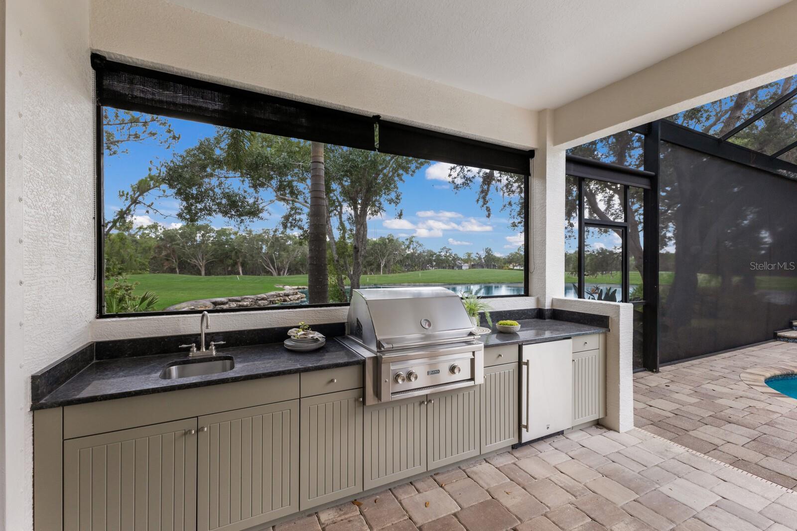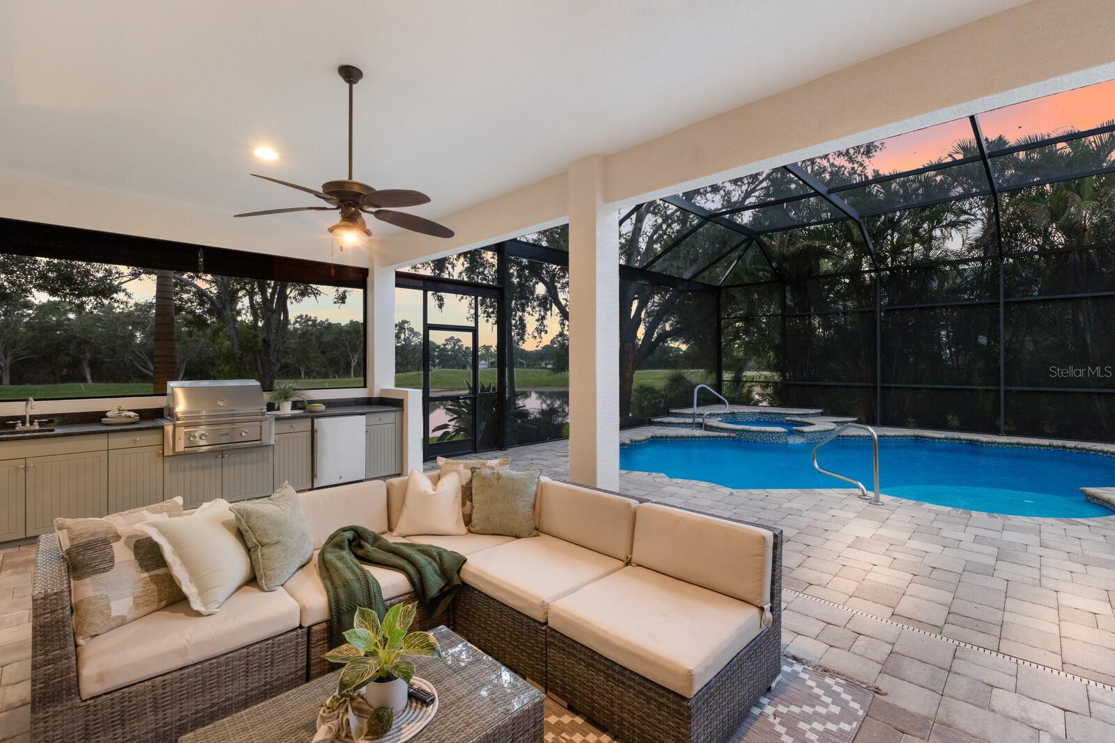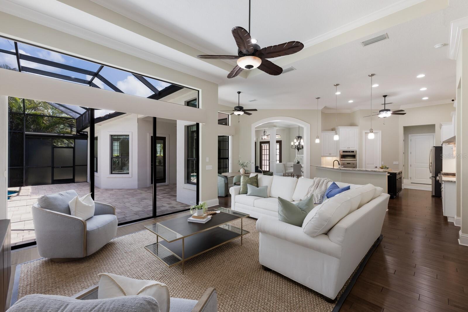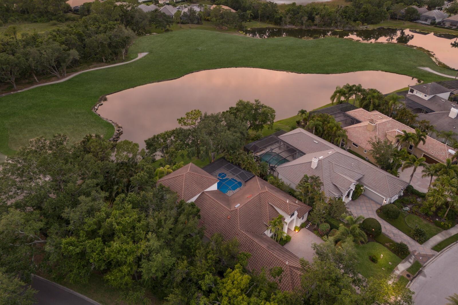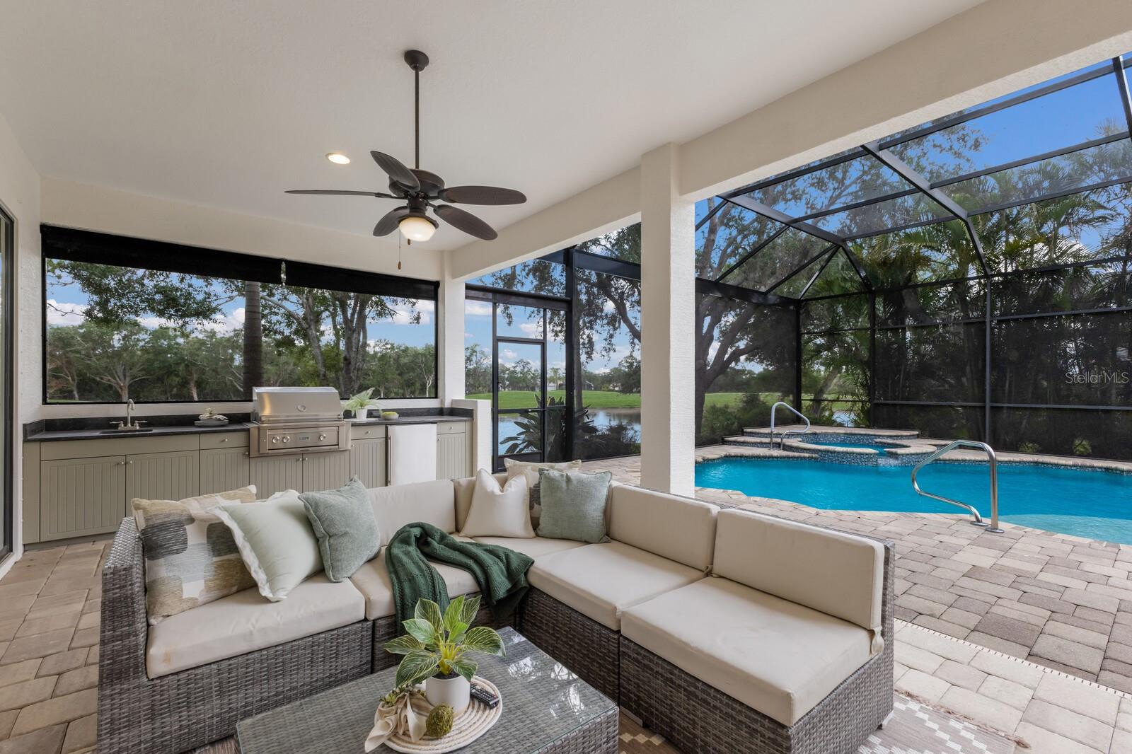 Savor one of the most breathtaking lake, golf, and preserve settings in Lakewood Ranch from this beautifully appointed Westover II model nestled in a serene, private setting on the King's Dunes golf course in The Country Club. The light and bright 3,885 square foot residence custom built by Neal Signature Homes boasts westerly views showcasing perfectly proportioned spaces, exceptional design, newly painted interior and exterior, volume ceilings, engineered wood flooring, and stunning sunsets nightly. The recently installed new panoramic screened lanai cage further accentuates the outdoor living experience, along with the heated pebble tec pool/spa with sun shelf, two separate covered areas, gas fireplace and an outdoor Summer kitchen. The surrounding vistas bring the unmatched optic experience indoors seamlessly via sliding glass doors and a plethora of transom windows, with architectural details and designer touches throughout, including tray ceilings, crown moldings, and trimmings at every turn. An invitingly large great room open to the kitchen where form, function and design reigns cohesively with sprawling granite counters, wood cabinetry, high performance appliances, breakfast bar, a walk-in pantry, and a breakfast nook area adorned with the surrounding views beyond. Off the kitchen is a butler's pantry with a wine fridge connecting to a lovely formal dining area and equally elegant living room infused with natural light.Unwind in the owner's retreat positioned on its own private wing on the main level, offering two walk-in customized closets and a luxuriously appointed spa-like bath with separate vanity stations, stand-alone shower, and a free-standing soaking tub. Family and overnight visitors alike will be right at home with the three additional guest rooms , two on the main level anchored by a full bath, while a third guest room is located upstairs off the home's fourth full bath. On the upper level, there is also an expansive bonus room offering multiple flex living space options boasting some of the most incredible golf views in Lakewood Ranch.Other notable highlights of this all-encompassing 5,351 square foot four bedroom four full bath maintenance free residence includes a perfectly located main level office/den at the rear of the residence with picturesque views just off the pool bath, a generously sized laundry room with sink and cabinetry, hurricane shutters, and an oversized 3-car garage. Within the #1 top-selling master-planned community known for its vibrant lifestyle, dining, shopping, A-rated schools and non-mandatory membership opportunities to become a member of Lakewood Ranch Golf & Country Club, which include four 18-hole championship golf courses, tennis, state-of-the-art Fitness center, clubhouses, junior Olympic-sized pool, pickleball and more.