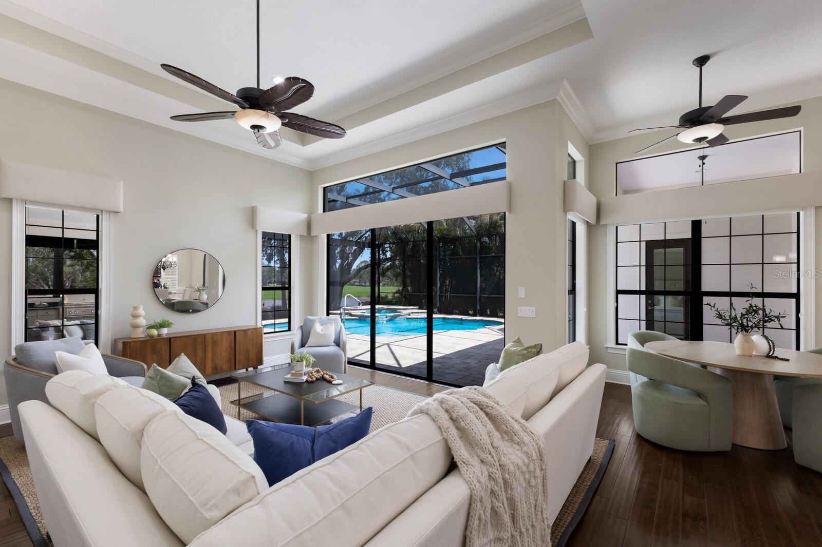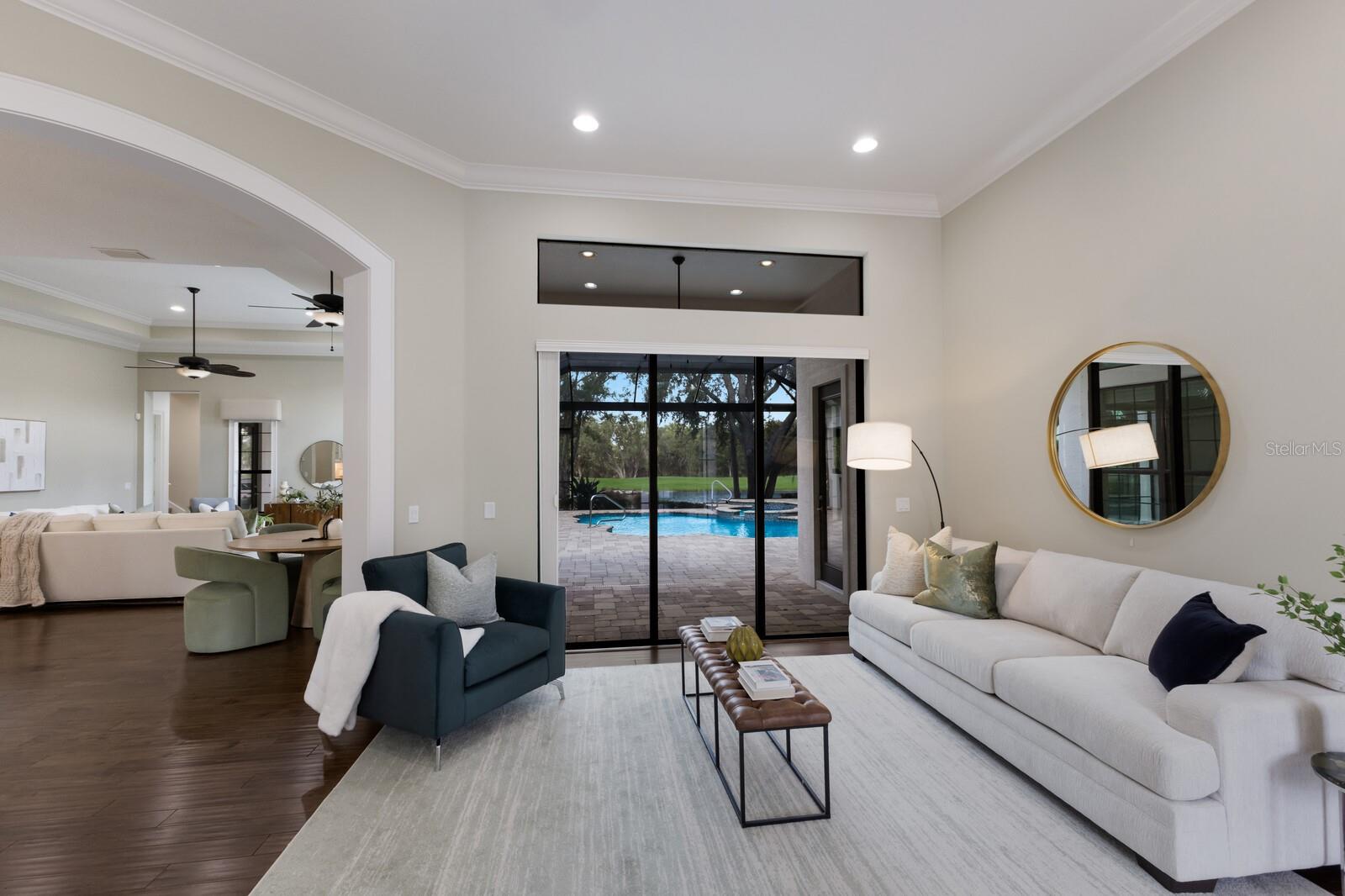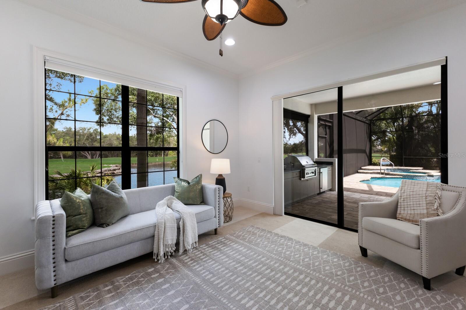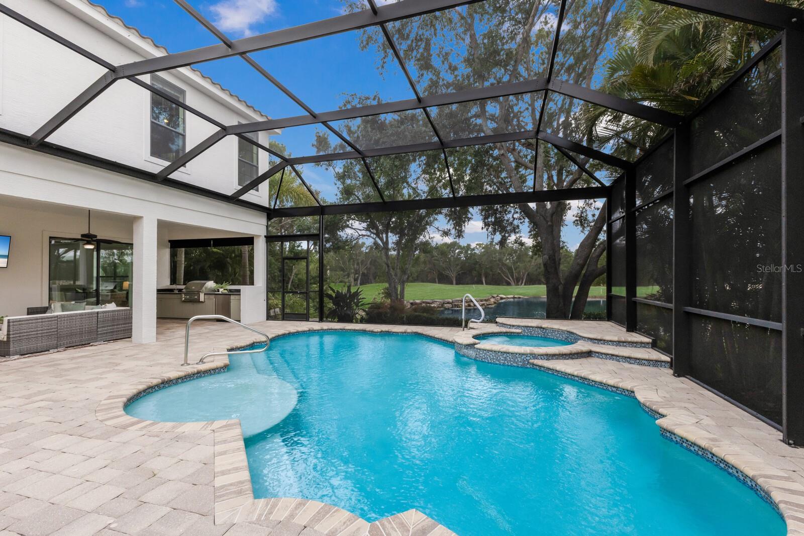 Savor one of the most breathtaking lake, golf, and preserve settings in Lakewood Ranch from this beautifully appointed Westover II model nestled in a serene, private setting on the King's Dunes golf course in The Country Club. The light and bright 3,885 square foot residence custom built by Neal Signature Homes boasts westerly views showcasing perfectly proportioned spaces, exceptional design, newly painted interior and exterior, volume ceilings, engineered wood flooring, and stunning sunsets nightly. The recently installed new panoramic screened lanai cage further accentuates the outdoor living experience, along with the heated pebble tec pool/spa with sun shelf, two separate covered areas, gas fireplace and an outdoor Summer kitchen. The surrounding vistas bring the unmatched optic experience indoors seamlessly via sliding glass doors and a plethora of transom windows, with architectural details and designer touches throughout, including tray ceilings, crown moldings, and trimmings at every turn. An invitingly large great room open to the kitchen where form, function and design reigns cohesively with sprawling granite counters, wood cabinetry, high performance appliances, breakfast bar, a walk-in pantry, and a breakfast nook area adorned with the surrounding views beyond. Off the kitchen is a butler's pantry with a wine fridge connecting to a lovely formal dining area and equally elegant living room infused with natural light.Unwind in the owner's retreat positioned on its own private wing on the main level, offering two walk-in customized closets and a luxuriously appointed spa-like bath with separate vanity stations, stand-alone shower, and a free-standing soaking tub. Family and overnight visitors alike will be right at home with the three additional guest rooms , two on the main level anchored by a full bath, while a third guest room is located upstairs off the home's fourth full bath. On the upper level, there is also an expansive bonus room offering multiple flex living space options boasting some of the most incredible golf views in Lakewood Ranch.Other notable highlights of this all-encompassing 5,351 square foot four bedroom four full bath maintenance free residence includes a perfectly located main level office/den at the rear of the residence with picturesque views just off the pool bath, a generously sized laundry room with sink and cabinetry, hurricane shutters, and an oversized 3-car garage. Within the #1 top-selling master-planned community known for its vibrant lifestyle, dining, shopping, A-rated schools and non-mandatory membership opportunities to become a member of Lakewood Ranch Golf & Country Club, which include four 18-hole championship golf courses, tennis, state-of-the-art Fitness center, clubhouses, junior Olympic-sized pool, pickleball and more.