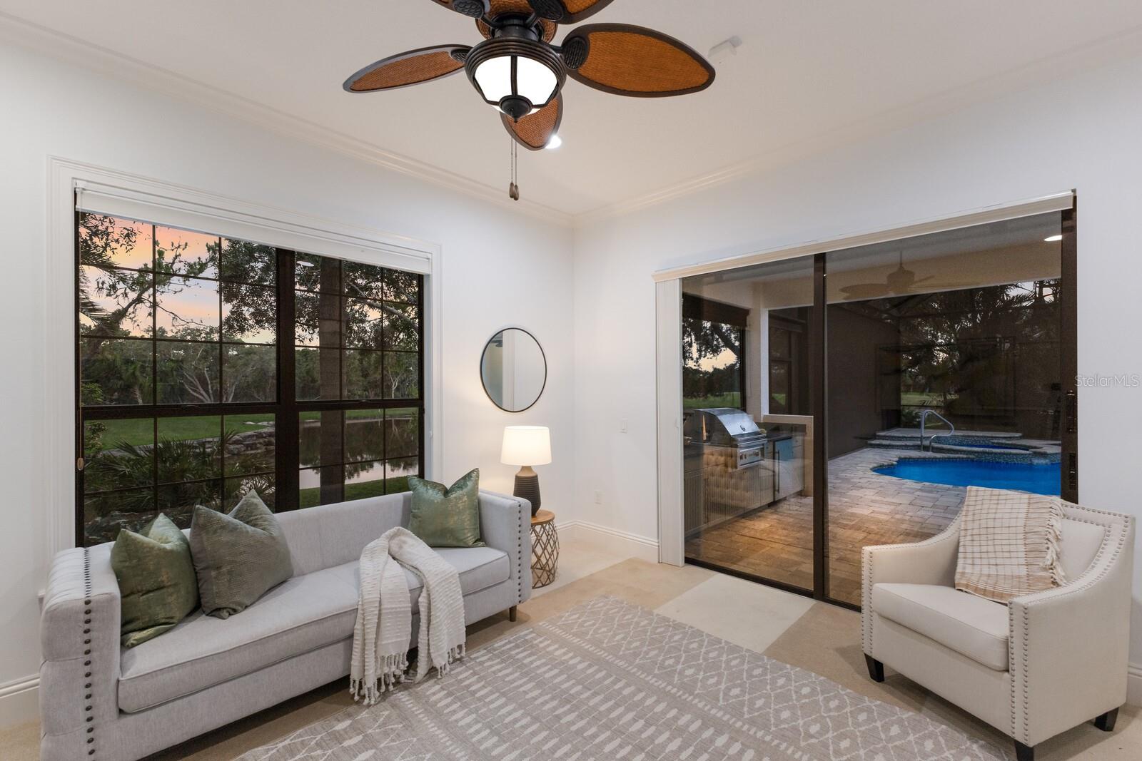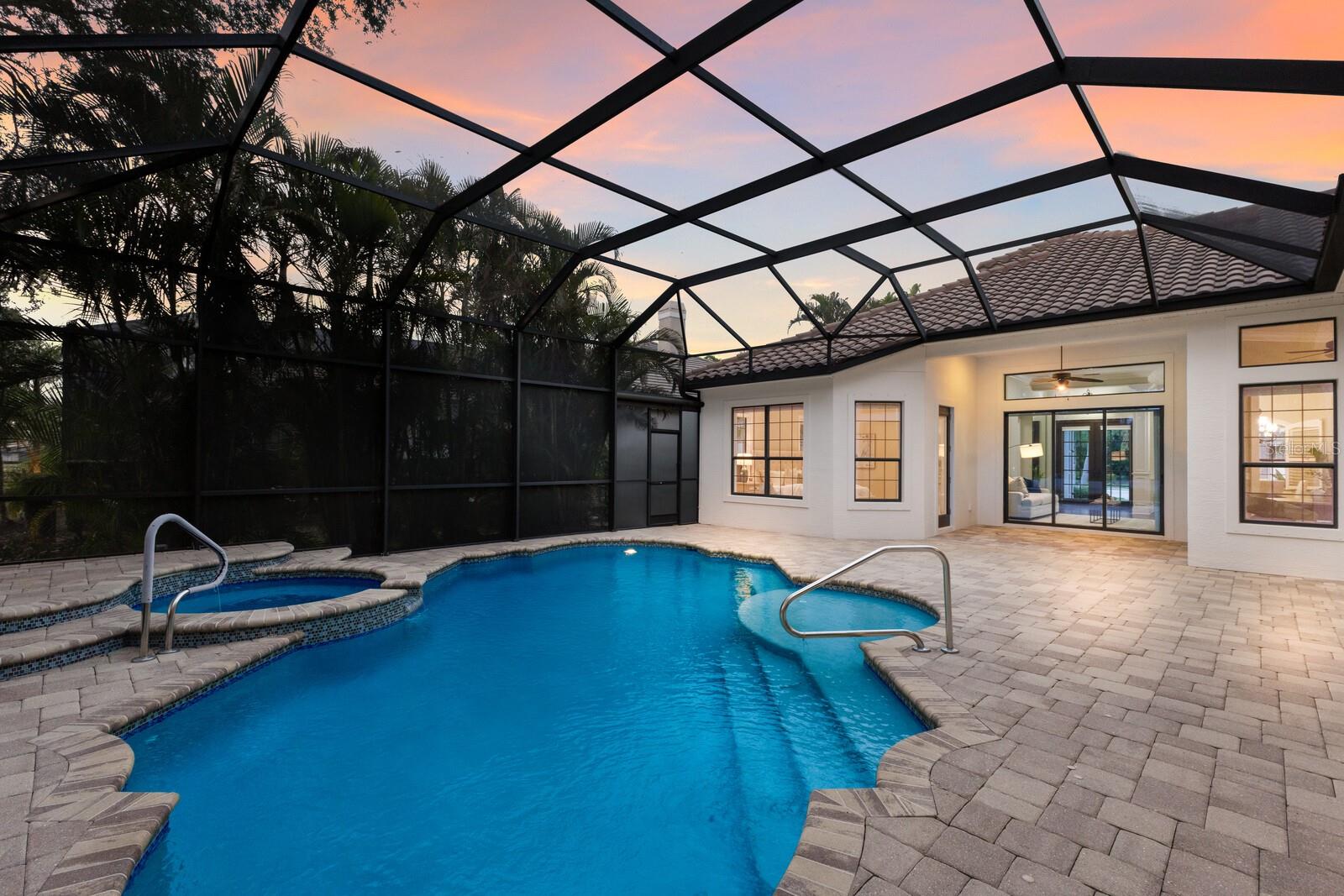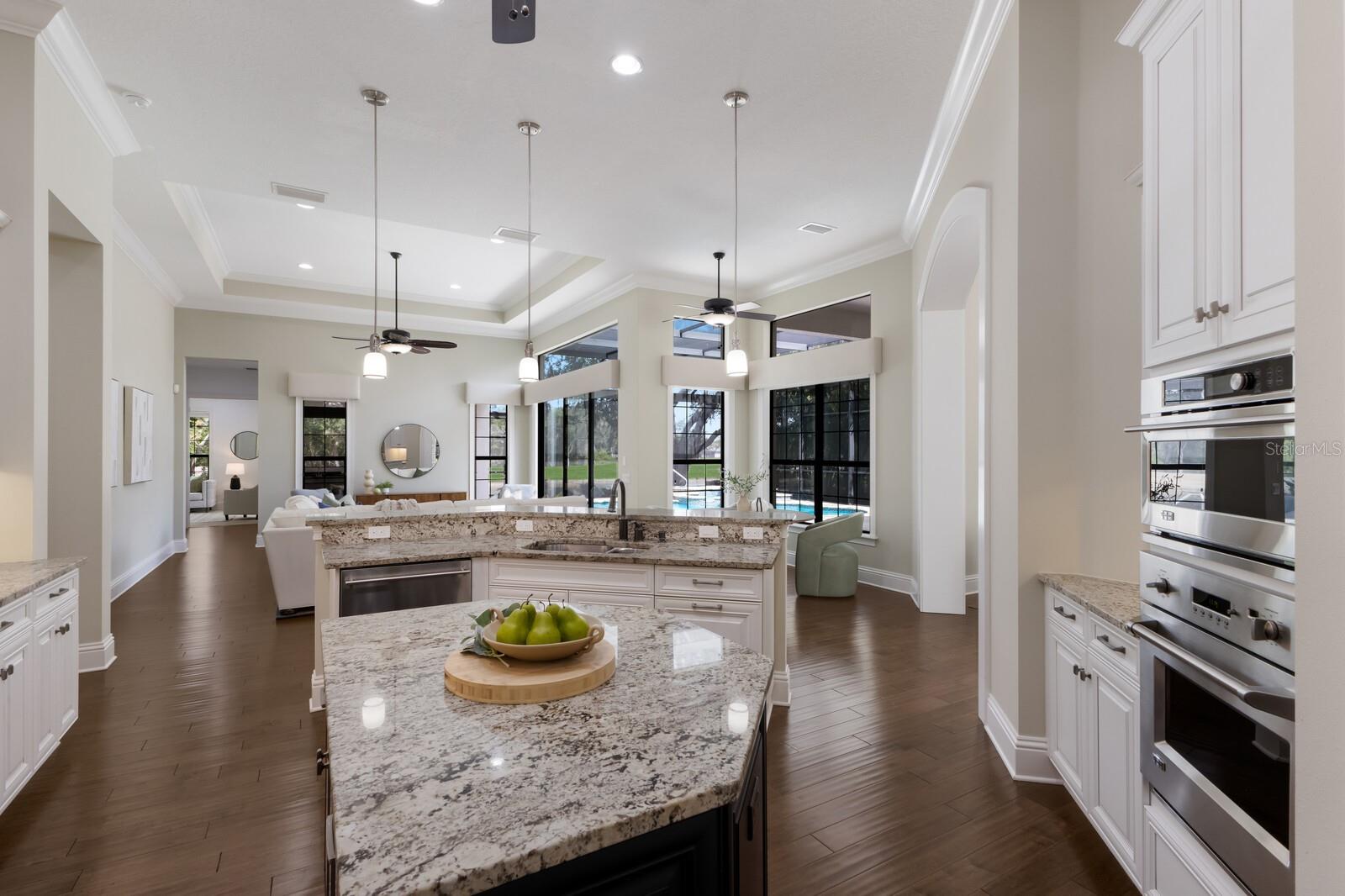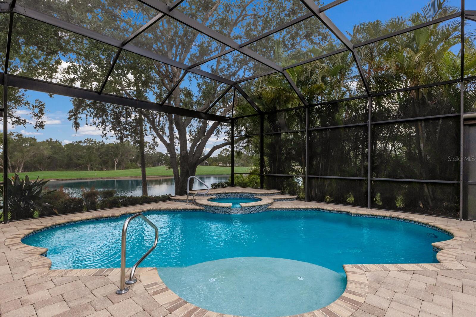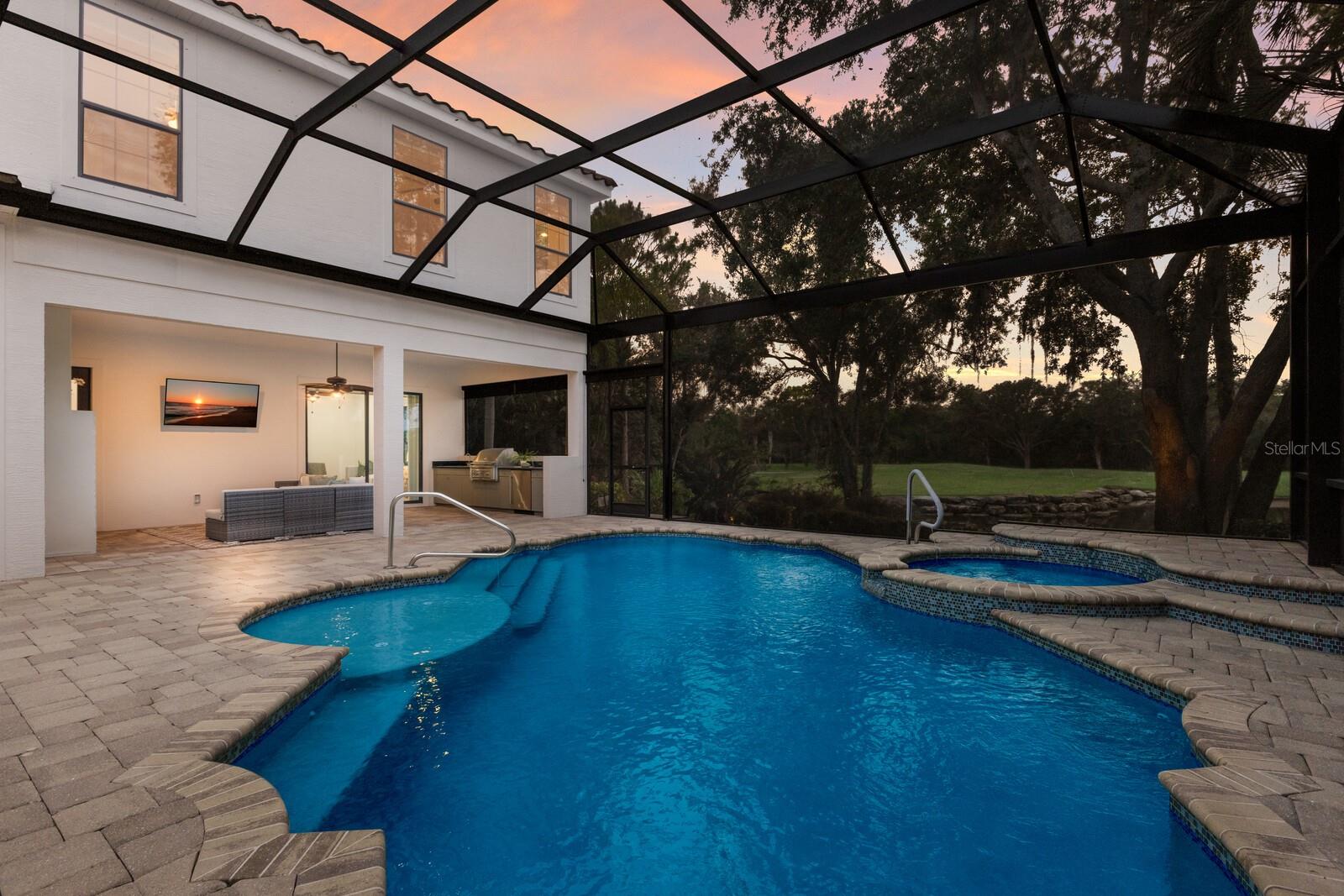 Savor one of the most breathtaking lake, golf, and preserve settings in Lakewood Ranch from this beautifully appointed Westover II model nestled in a serene, private setting on the King's Dunes golf course in The Country Club. The light and bright 3,885 square foot residence custom built by Neal Signature Homes boasts westerly views showcasing perfectly proportioned spaces, exceptional design, newly painted interior and exterior, volume ceilings, engineered wood flooring, and stunning sunsets nightly. The recently installed new panoramic screened lanai cage further accentuates the outdoor living experience, along with the heated pebble tec pool/spa with sun shelf, two separate covered areas, gas fireplace and an outdoor Summer kitchen. The surrounding vistas bring the unmatched optic experience indoors seamlessly via sliding glass doors and a plethora of transom windows, with architectural details and designer touches throughout, including tray ceilings, crown moldings, and trimmings at every turn. An invitingly large great room open to the kitchen where form, function and design reigns cohesively with sprawling granite counters, wood cabinetry, high performance appliances, breakfast bar, a walk-in pantry, and a breakfast nook area adorned with the surrounding views beyond. Off the kitchen is a butler's pantry with a wine fridge connecting to a lovely formal dining area and equally elegant living room infused with natural light.Unwind in the owner's retreat positioned on its own private wing on the main level, offering two walk-in customized closets and a luxuriously appointed spa-like bath with separate vanity stations, stand-alone shower, and a free-standing soaking tub. Family and overnight visitors alike will be right at home with the three additional guest rooms , two on the main level anchored by a full bath, while a third guest room is located upstairs off the home's fourth full bath. On the upper level, there is also an expansive bonus room offering multiple flex living space options boasting some of the most incredible golf views in Lakewood Ranch.Other notable highlights of this all-encompassing 5,351 square foot four bedroom four full bath maintenance free residence includes a perfectly located main level office/den at the rear of the residence with picturesque views just off the pool bath, a generously sized laundry room with sink and cabinetry, hurricane shutters, and an oversized 3-car garage. Within the #1 top-selling master-planned community known for its vibrant lifestyle, dining, shopping, A-rated schools and non-mandatory membership opportunities to become a member of Lakewood Ranch Golf & Country Club, which include four 18-hole championship golf courses, tennis, state-of-the-art Fitness center, clubhouses, junior Olympic-sized pool, pickleball and more.