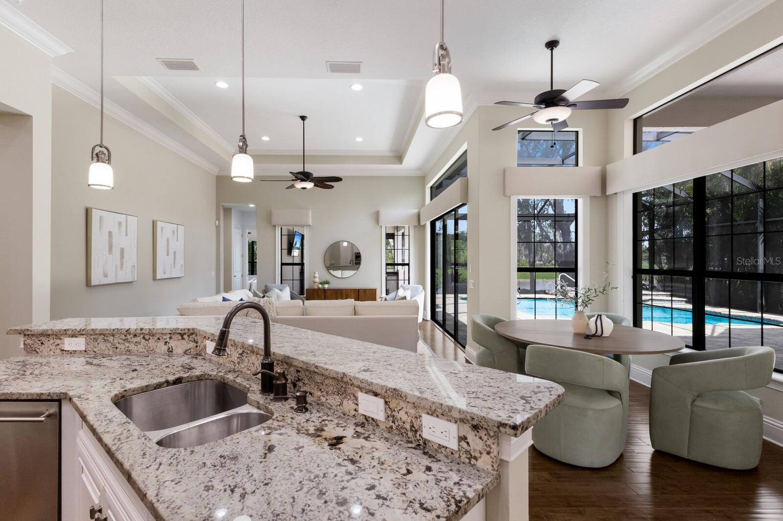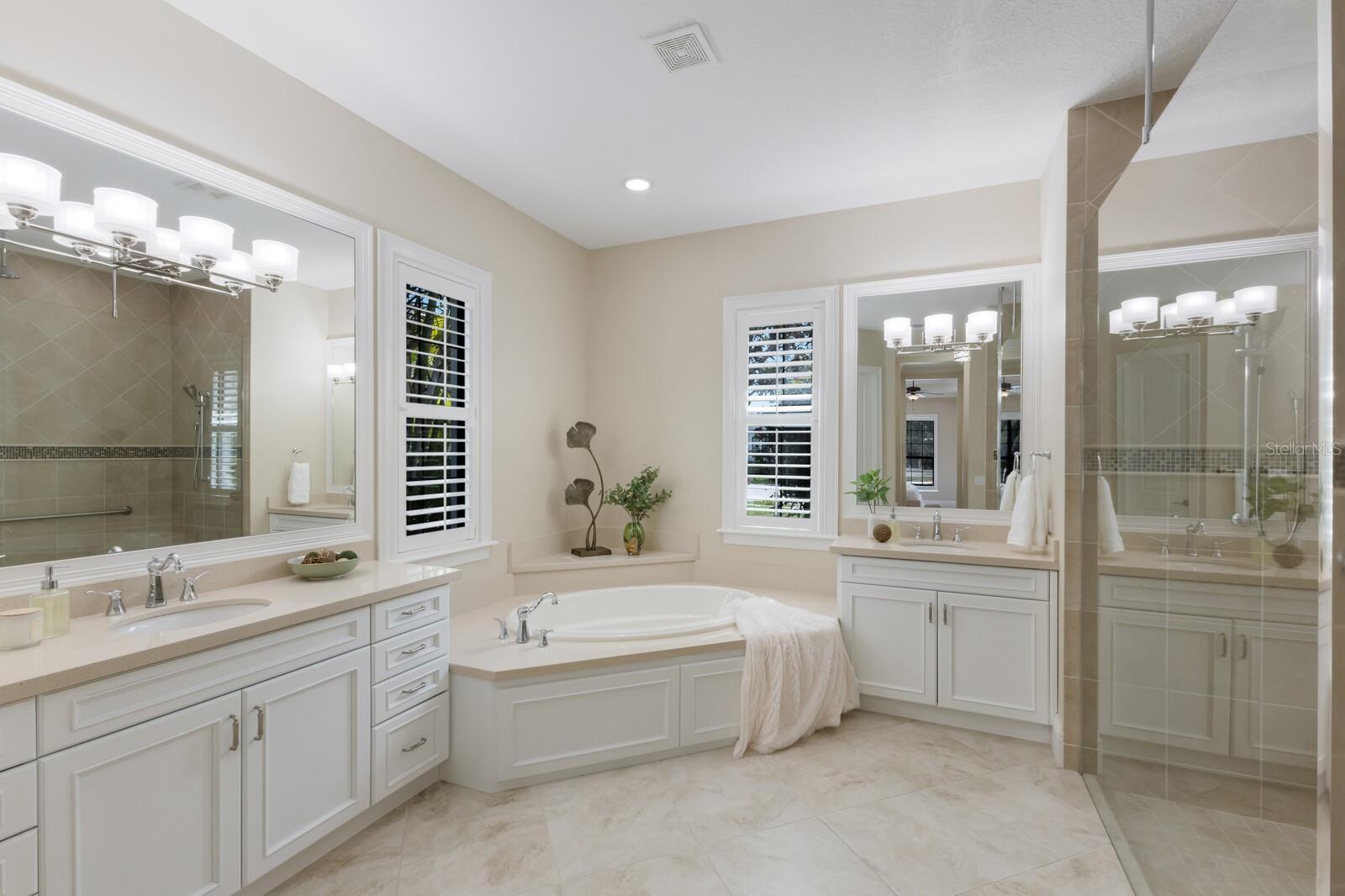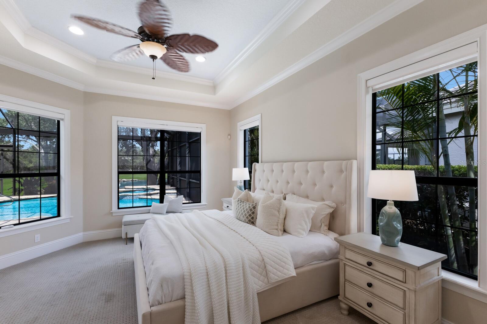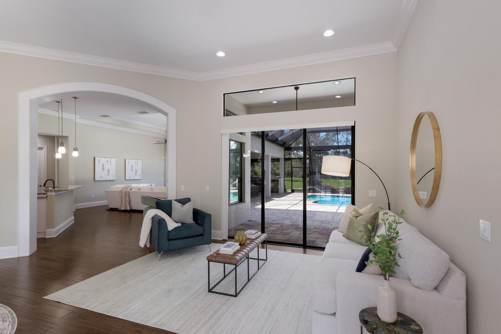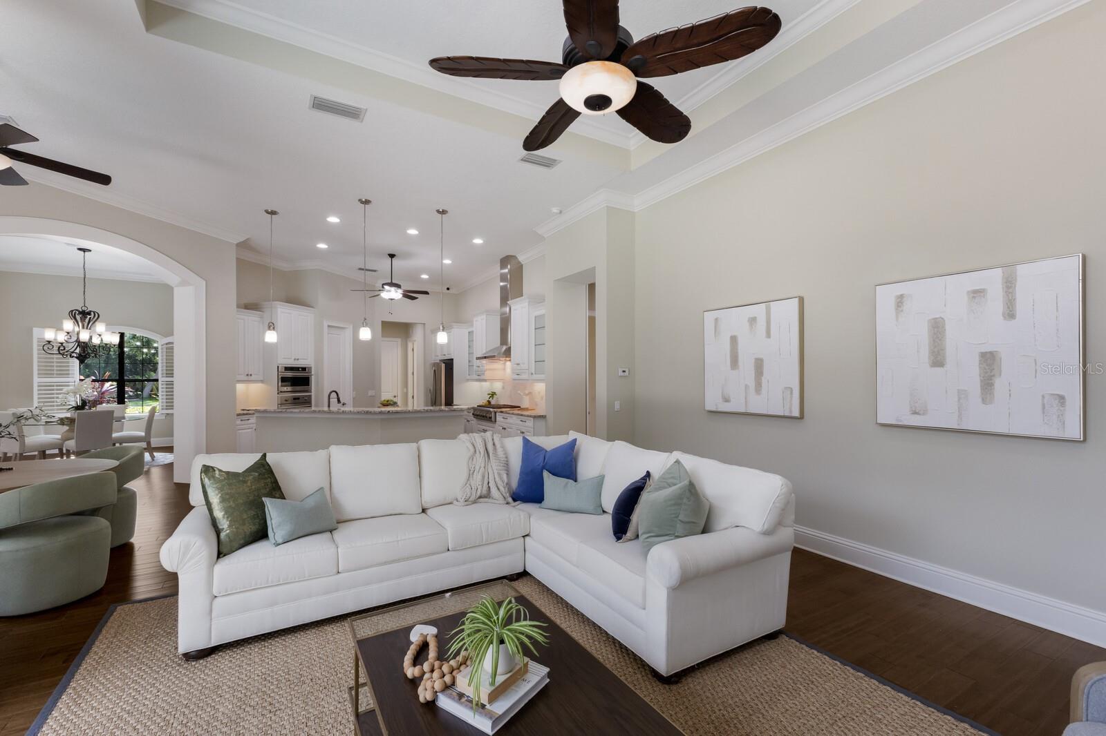 Savor one of the most breathtaking lake, golf, and preserve settings in Lakewood Ranch from this beautifully appointed Westover II model nestled in a serene, private setting on the King's Dunes golf course in The Country Club. The light and bright 3,885 square foot residence custom built by Neal Signature Homes boasts westerly views showcasing perfectly proportioned spaces, exceptional design, newly painted interior and exterior, volume ceilings, engineered wood flooring, and stunning sunsets nightly. The recently installed new panoramic screened lanai cage further accentuates the outdoor living experience, along with the heated pebble tec pool/spa with sun shelf, two separate covered areas, gas fireplace and an outdoor Summer kitchen. The surrounding vistas bring the unmatched optic experience indoors seamlessly via sliding glass doors and a plethora of transom windows, with architectural details and designer touches throughout, including tray ceilings, crown moldings, and trimmings at every turn. An invitingly large great room open to the kitchen where form, function and design reigns cohesively with sprawling granite counters, wood cabinetry, high performance appliances, breakfast bar, a walk-in pantry, and a breakfast nook area adorned with the surrounding views beyond. Off the kitchen is a butler's pantry with a wine fridge connecting to a lovely formal dining area and equally elegant living room infused with natural light.Unwind in the owner's retreat positioned on its own private wing on the main level, offering two walk-in customized closets and a luxuriously appointed spa-like bath with separate vanity stations, stand-alone shower, and a free-standing soaking tub. Family and overnight visitors alike will be right at home with the three additional guest rooms , two on the main level anchored by a full bath, while a third guest room is located upstairs off the home's fourth full bath. On the upper level, there is also an expansive bonus room offering multiple flex living space options boasting some of the most incredible golf views in Lakewood Ranch.Other notable highlights of this all-encompassing 5,351 square foot four bedroom four full bath maintenance free residence includes a perfectly located main level office/den at the rear of the residence with picturesque views just off the pool bath, a generously sized laundry room with sink and cabinetry, hurricane shutters, and an oversized 3-car garage. Within the #1 top-selling master-planned community known for its vibrant lifestyle, dining, shopping, A-rated schools and non-mandatory membership opportunities to become a member of Lakewood Ranch Golf & Country Club, which include four 18-hole championship golf courses, tennis, state-of-the-art Fitness center, clubhouses, junior Olympic-sized pool, pickleball and more.