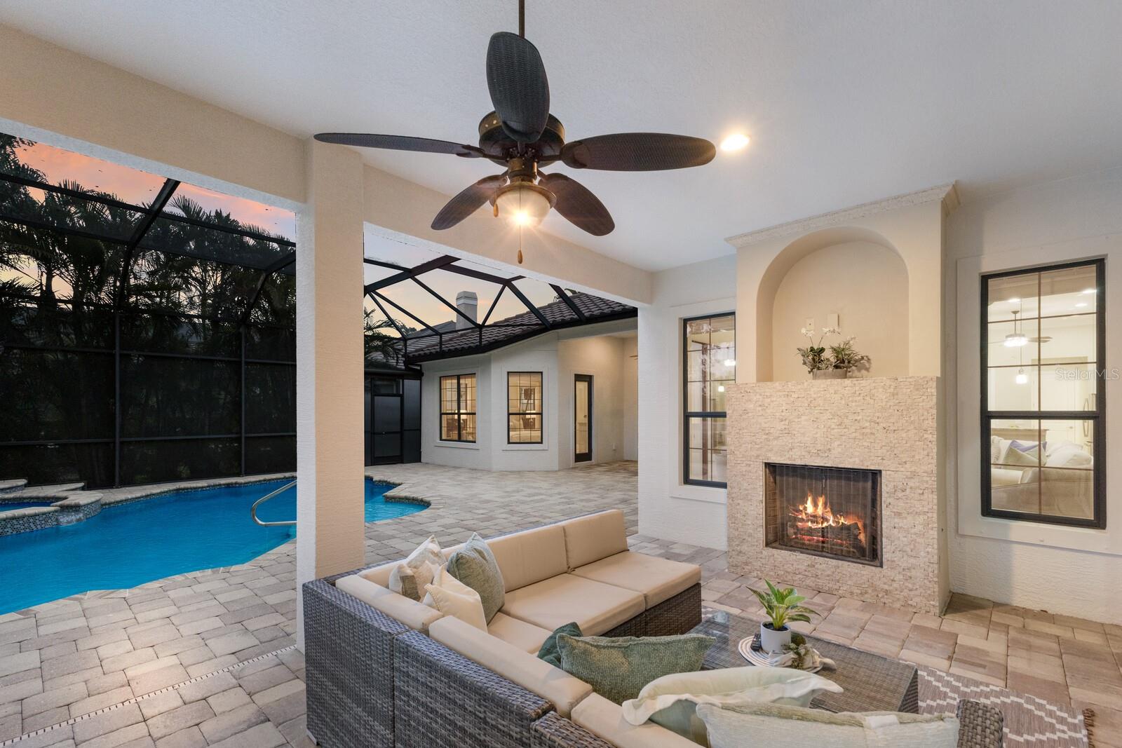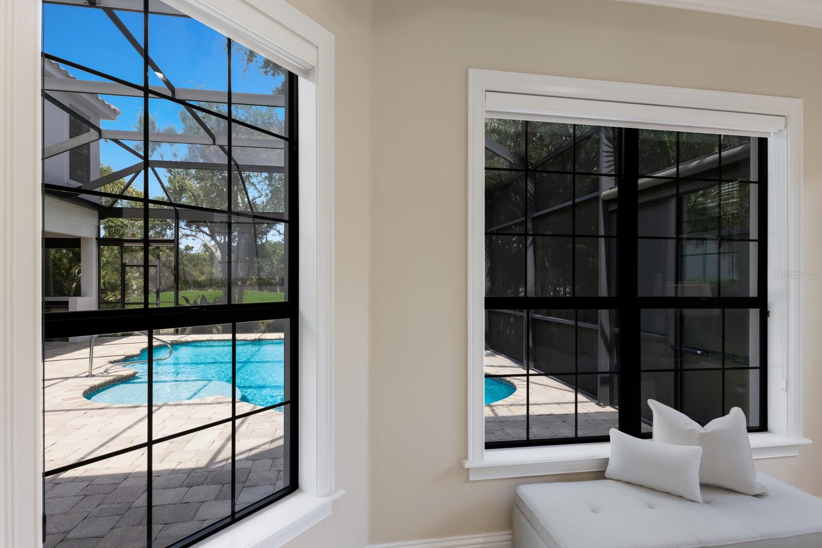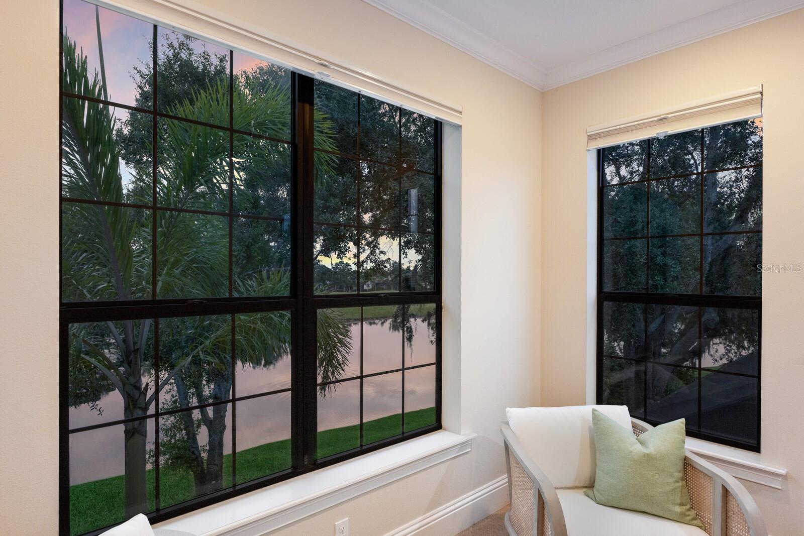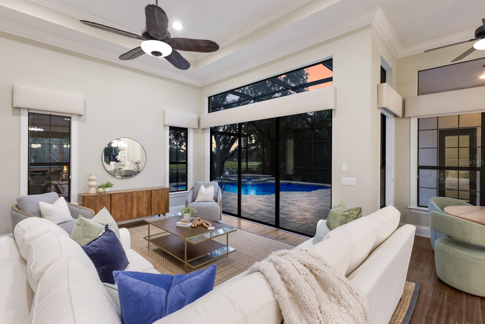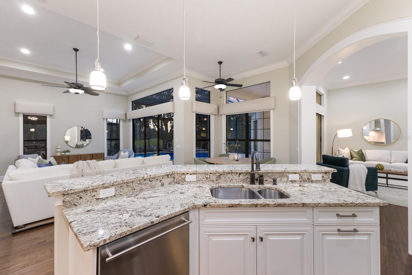 Savor one of the most breathtaking lake, golf, and preserve settings in Lakewood Ranch from this beautifully appointed Westover II model nestled in a serene, private setting on the King's Dunes golf course in The Country Club. The light and bright 3,885 square foot residence custom built by Neal Signature Homes boasts westerly views showcasing perfectly proportioned spaces, exceptional design, newly painted interior and exterior, volume ceilings, engineered wood flooring, and stunning sunsets nightly. The recently installed new panoramic screened lanai cage further accentuates the outdoor living experience, along with the heated pebble tec pool/spa with sun shelf, two separate covered areas, gas fireplace and an outdoor Summer kitchen. The surrounding vistas bring the unmatched optic experience indoors seamlessly via sliding glass doors and a plethora of transom windows, with architectural details and designer touches throughout, including tray ceilings, crown moldings, and trimmings at every turn. An invitingly large great room open to the kitchen where form, function and design reigns cohesively with sprawling granite counters, wood cabinetry, high performance appliances, breakfast bar, a walk-in pantry, and a breakfast nook area adorned with the surrounding views beyond. Off the kitchen is a butler's pantry with a wine fridge connecting to a lovely formal dining area and equally elegant living room infused with natural light.Unwind in the owner's retreat positioned on its own private wing on the main level, offering two walk-in customized closets and a luxuriously appointed spa-like bath with separate vanity stations, stand-alone shower, and a free-standing soaking tub. Family and overnight visitors alike will be right at home with the three additional guest rooms , two on the main level anchored by a full bath, while a third guest room is located upstairs off the home's fourth full bath. On the upper level, there is also an expansive bonus room offering multiple flex living space options boasting some of the most incredible golf views in Lakewood Ranch.Other notable highlights of this all-encompassing 5,351 square foot four bedroom four full bath maintenance free residence includes a perfectly located main level office/den at the rear of the residence with picturesque views just off the pool bath, a generously sized laundry room with sink and cabinetry, hurricane shutters, and an oversized 3-car garage. Within the #1 top-selling master-planned community known for its vibrant lifestyle, dining, shopping, A-rated schools and non-mandatory membership opportunities to become a member of Lakewood Ranch Golf & Country Club, which include four 18-hole championship golf courses, tennis, state-of-the-art Fitness center, clubhouses, junior Olympic-sized pool, pickleball and more.