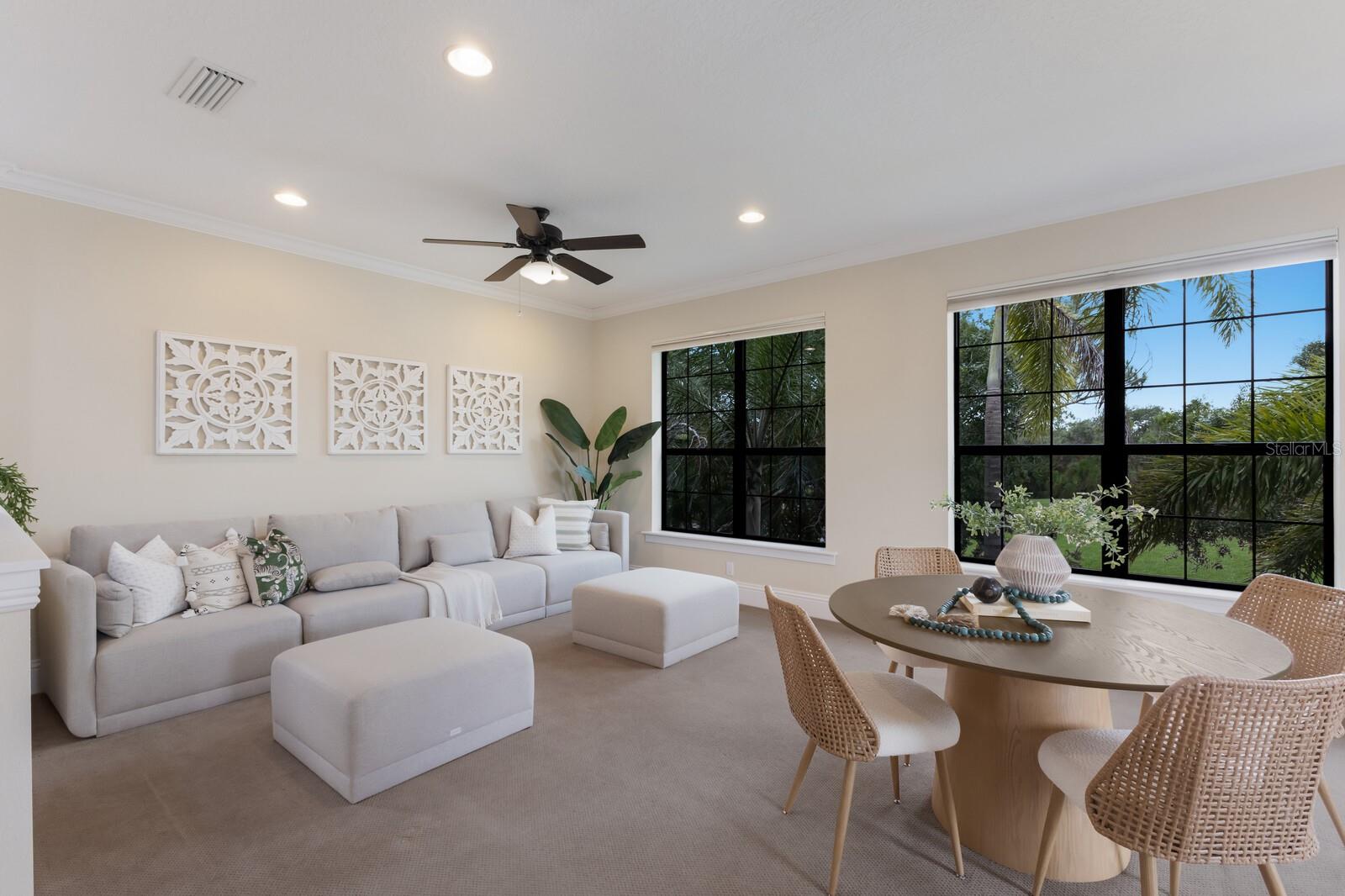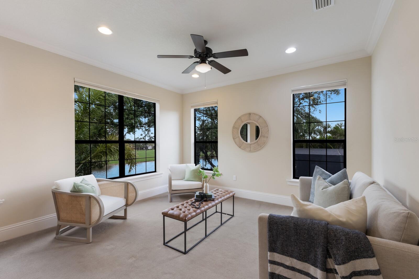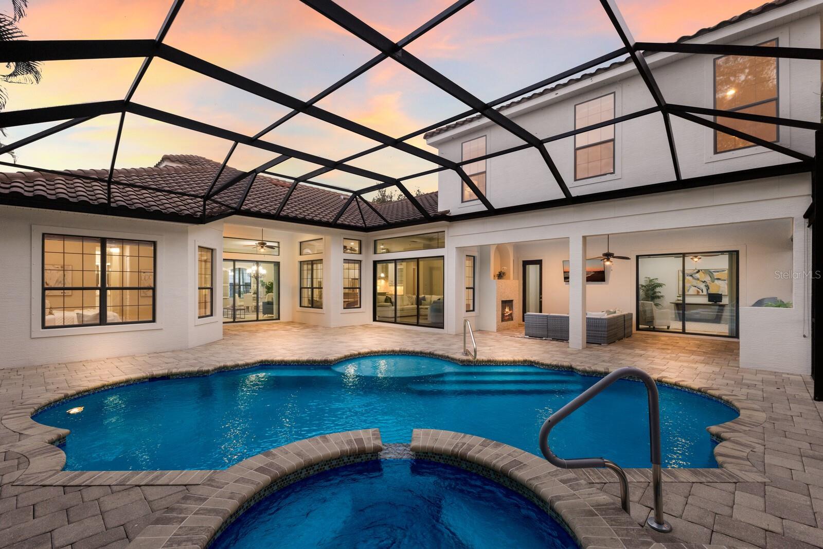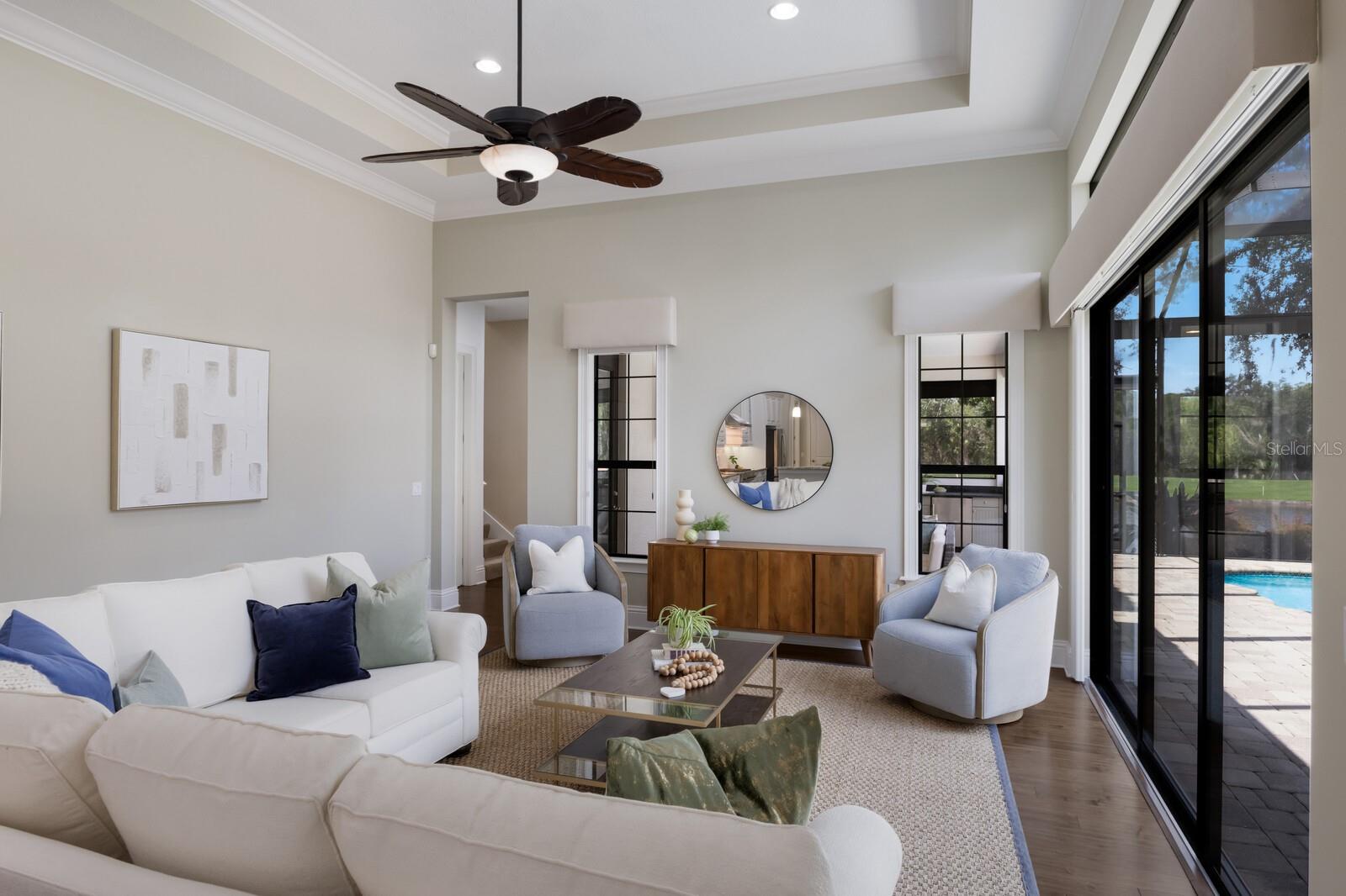 Savor one of the most breathtaking lake, golf, and preserve settings in Lakewood Ranch from this beautifully appointed Westover II model nestled in a serene, private setting on the King's Dunes golf course in The Country Club. The light and bright 3,885 square foot residence custom built by Neal Signature Homes boasts westerly views showcasing perfectly proportioned spaces, exceptional design, newly painted interior and exterior, volume ceilings, engineered wood flooring, and stunning sunsets nightly. The recently installed new panoramic screened lanai cage further accentuates the outdoor living experience, along with the heated pebble tec pool/spa with sun shelf, two separate covered areas, gas fireplace and an outdoor Summer kitchen. The surrounding vistas bring the unmatched optic experience indoors seamlessly via sliding glass doors and a plethora of transom windows, with architectural details and designer touches throughout, including tray ceilings, crown moldings, and trimmings at every turn. An invitingly large great room open to the kitchen where form, function and design reigns cohesively with sprawling granite counters, wood cabinetry, high performance appliances, breakfast bar, a walk-in pantry, and a breakfast nook area adorned with the surrounding views beyond. Off the kitchen is a butler's pantry with a wine fridge connecting to a lovely formal dining area and equally elegant living room infused with natural light.Unwind in the owner's retreat positioned on its own private wing on the main level, offering two walk-in customized closets and a luxuriously appointed spa-like bath with separate vanity stations, stand-alone shower, and a free-standing soaking tub. Family and overnight visitors alike will be right at home with the three additional guest rooms , two on the main level anchored by a full bath, while a third guest room is located upstairs off the home's fourth full bath. On the upper level, there is also an expansive bonus room offering multiple flex living space options boasting some of the most incredible golf views in Lakewood Ranch.Other notable highlights of this all-encompassing 5,351 square foot four bedroom four full bath maintenance free residence includes a perfectly located main level office/den at the rear of the residence with picturesque views just off the pool bath, a generously sized laundry room with sink and cabinetry, hurricane shutters, and an oversized 3-car garage. Within the #1 top-selling master-planned community known for its vibrant lifestyle, dining, shopping, A-rated schools and non-mandatory membership opportunities to become a member of Lakewood Ranch Golf & Country Club, which include four 18-hole championship golf courses, tennis, state-of-the-art Fitness center, clubhouses, junior Olympic-sized pool, pickleball and more.