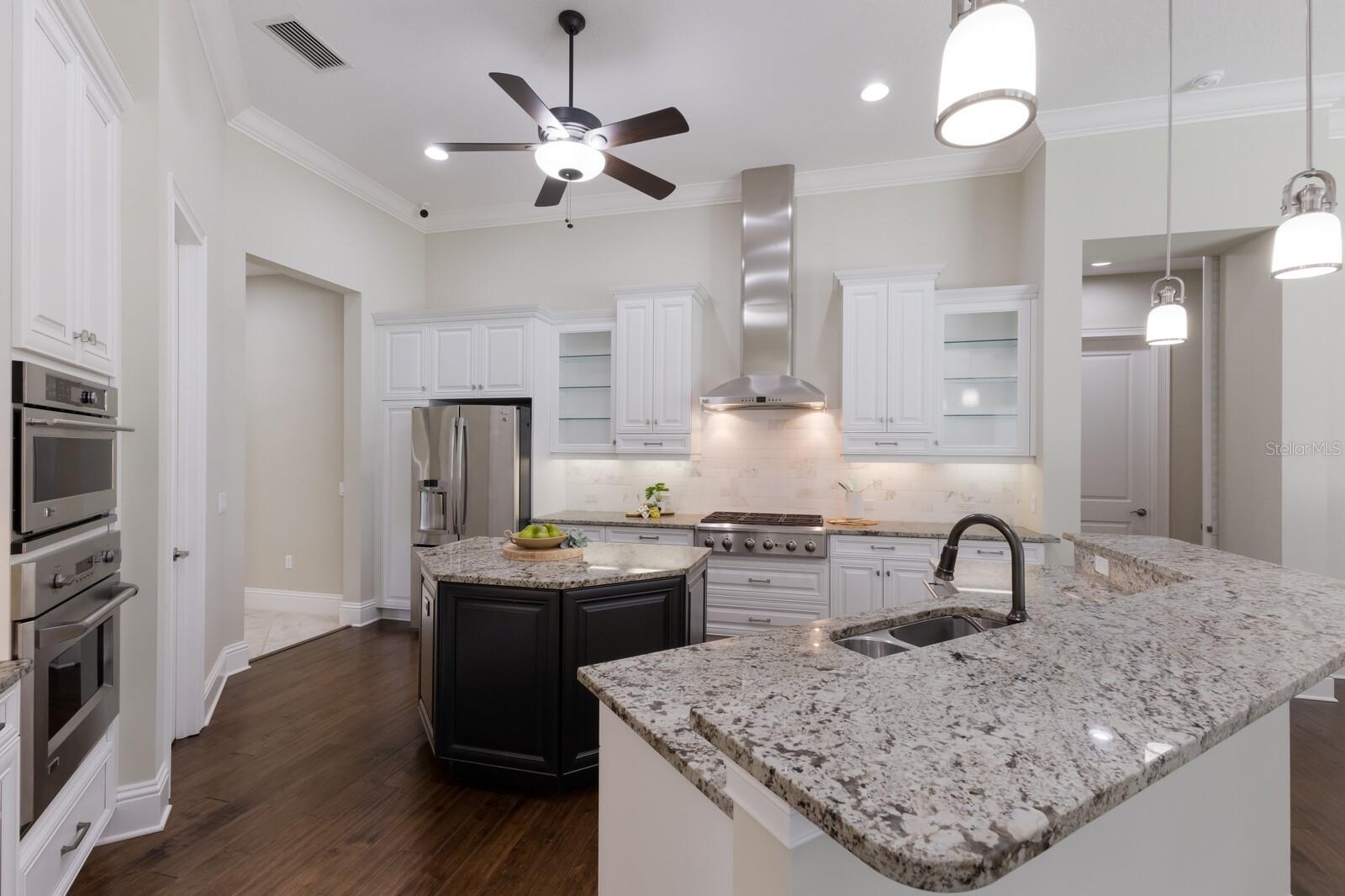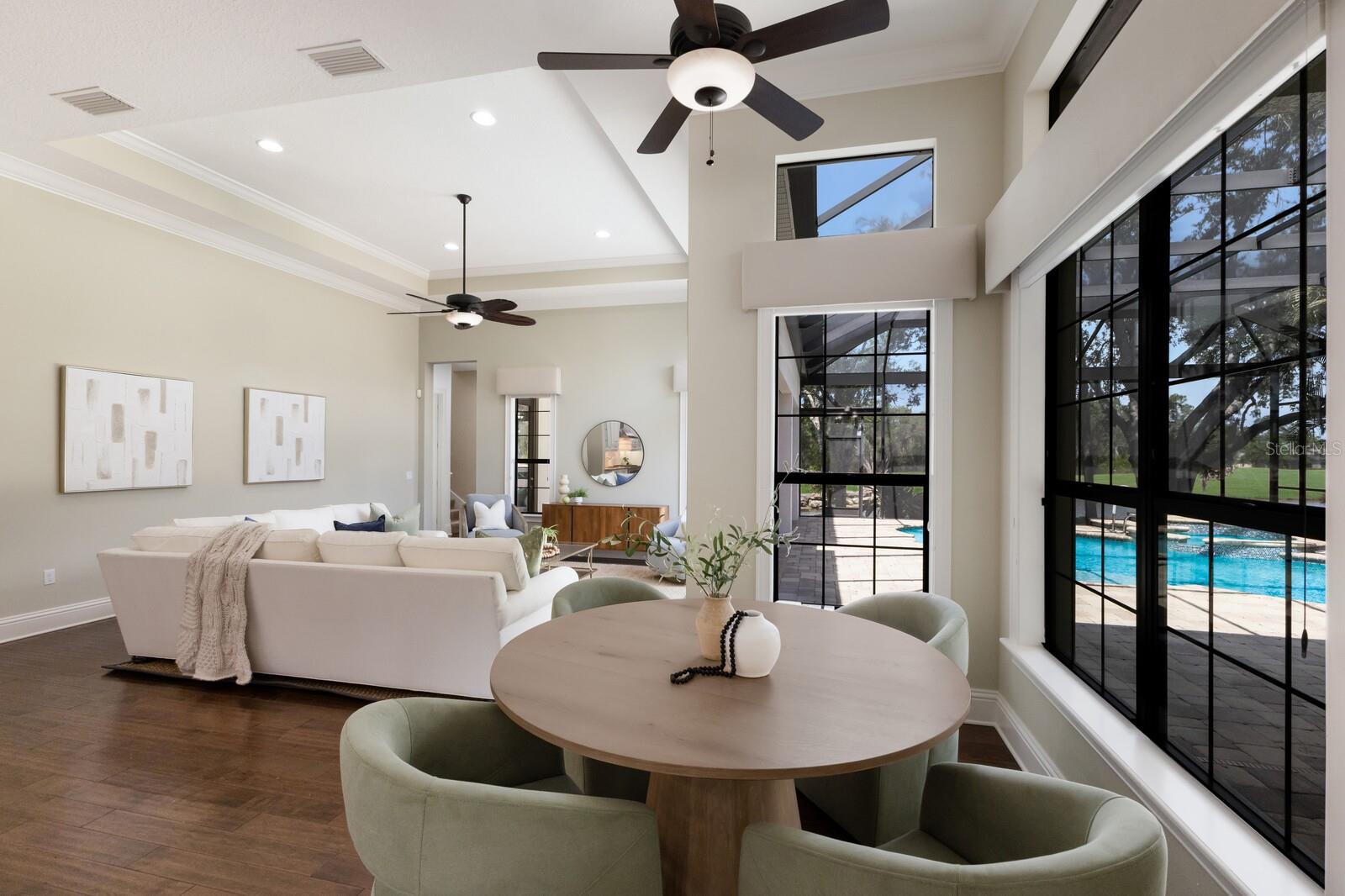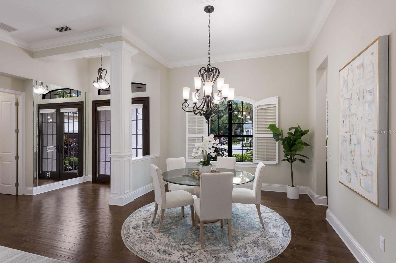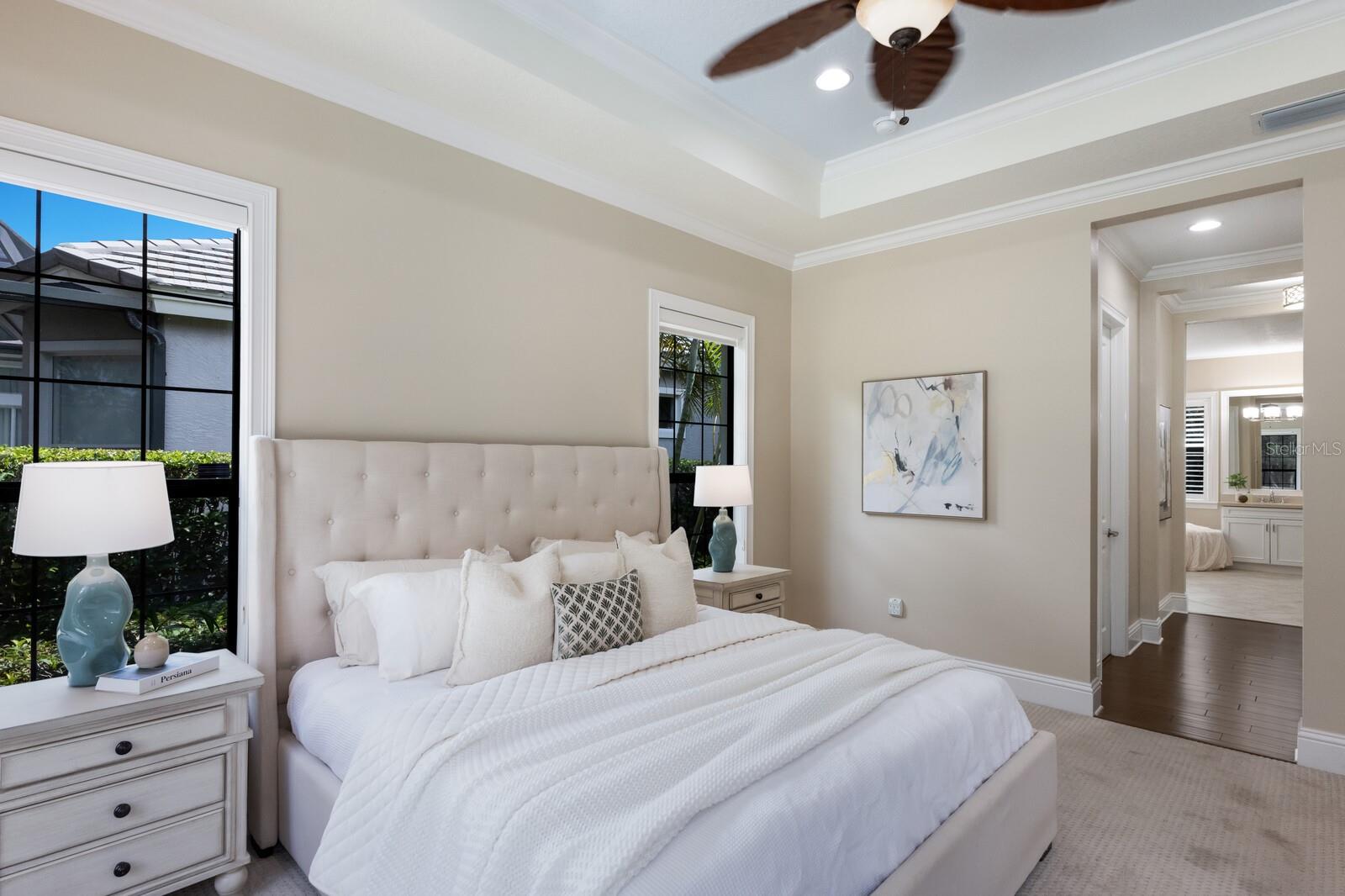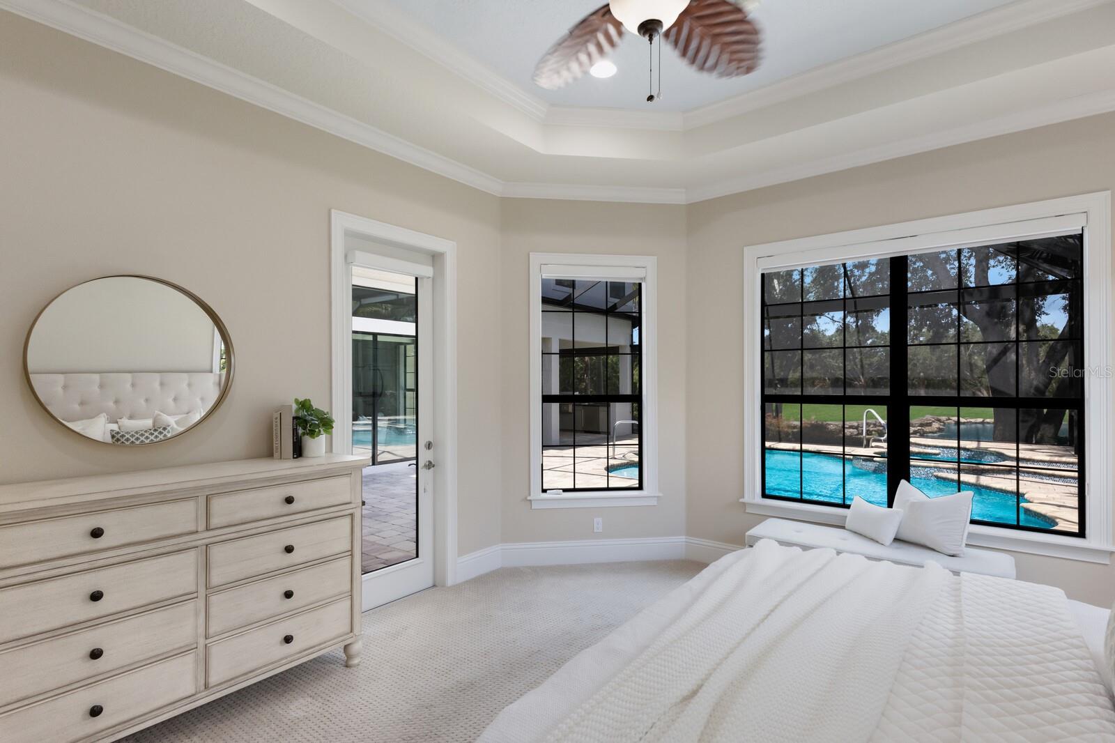 Savor one of the most breathtaking lake, golf, and preserve settings in Lakewood Ranch from this beautifully appointed Westover II model nestled in a serene, private setting on the King's Dunes golf course in The Country Club. The light and bright 3,885 square foot residence custom built by Neal Signature Homes boasts westerly views showcasing perfectly proportioned spaces, exceptional design, newly painted interior and exterior, volume ceilings, engineered wood flooring, and stunning sunsets nightly. The recently installed new panoramic screened lanai cage further accentuates the outdoor living experience, along with the heated pebble tec pool/spa with sun shelf, two separate covered areas, gas fireplace and an outdoor Summer kitchen. The surrounding vistas bring the unmatched optic experience indoors seamlessly via sliding glass doors and a plethora of transom windows, with architectural details and designer touches throughout, including tray ceilings, crown moldings, and trimmings at every turn. An invitingly large great room open to the kitchen where form, function and design reigns cohesively with sprawling granite counters, wood cabinetry, high performance appliances, breakfast bar, a walk-in pantry, and a breakfast nook area adorned with the surrounding views beyond. Off the kitchen is a butler's pantry with a wine fridge connecting to a lovely formal dining area and equally elegant living room infused with natural light.Unwind in the owner's retreat positioned on its own private wing on the main level, offering two walk-in customized closets and a luxuriously appointed spa-like bath with separate vanity stations, stand-alone shower, and a free-standing soaking tub. Family and overnight visitors alike will be right at home with the three additional guest rooms , two on the main level anchored by a full bath, while a third guest room is located upstairs off the home's fourth full bath. On the upper level, there is also an expansive bonus room offering multiple flex living space options boasting some of the most incredible golf views in Lakewood Ranch.Other notable highlights of this all-encompassing 5,351 square foot four bedroom four full bath maintenance free residence includes a perfectly located main level office/den at the rear of the residence with picturesque views just off the pool bath, a generously sized laundry room with sink and cabinetry, hurricane shutters, and an oversized 3-car garage. Within the #1 top-selling master-planned community known for its vibrant lifestyle, dining, shopping, A-rated schools and non-mandatory membership opportunities to become a member of Lakewood Ranch Golf & Country Club, which include four 18-hole championship golf courses, tennis, state-of-the-art Fitness center, clubhouses, junior Olympic-sized pool, pickleball and more.
