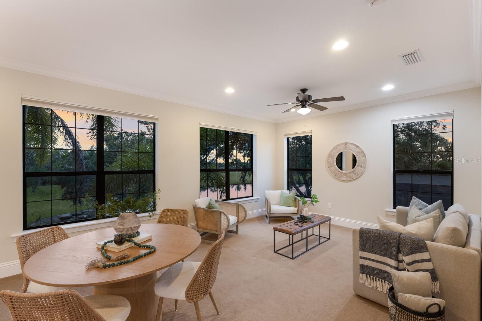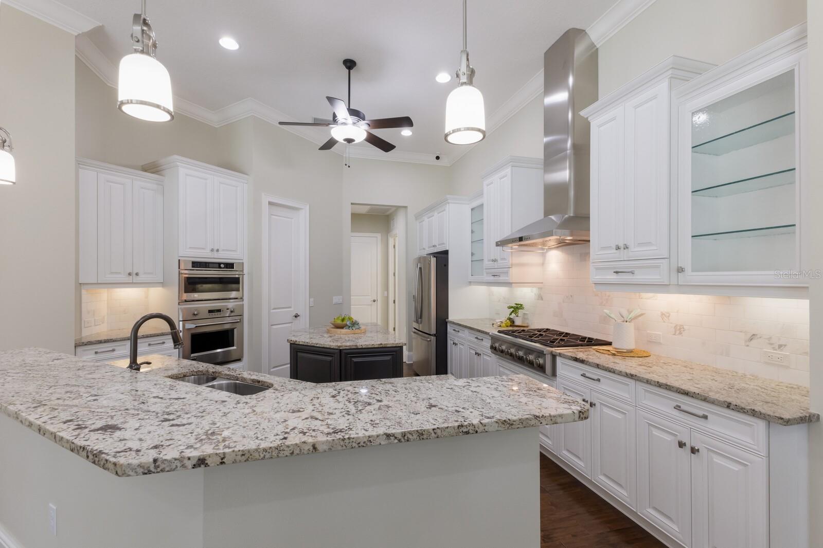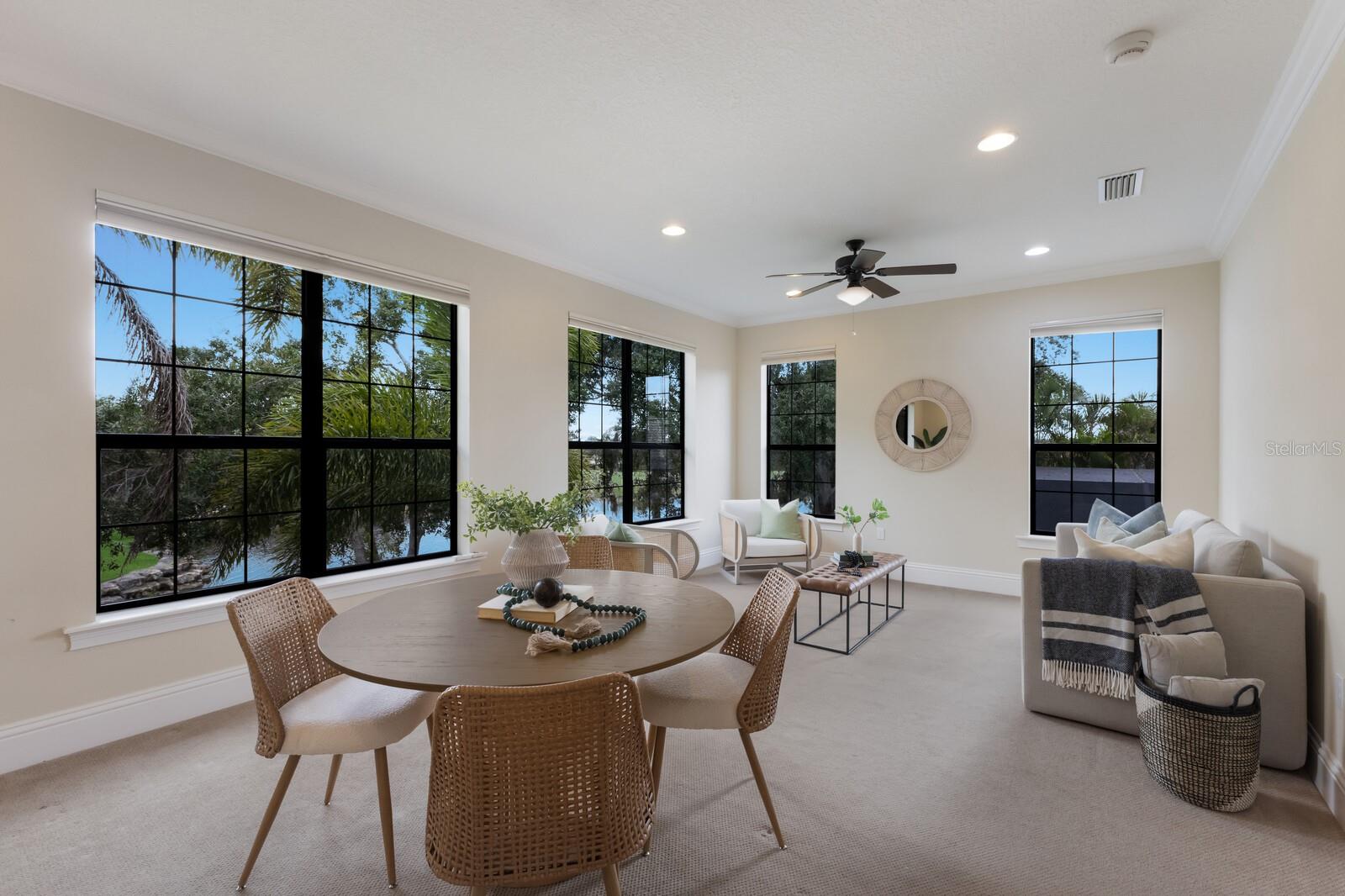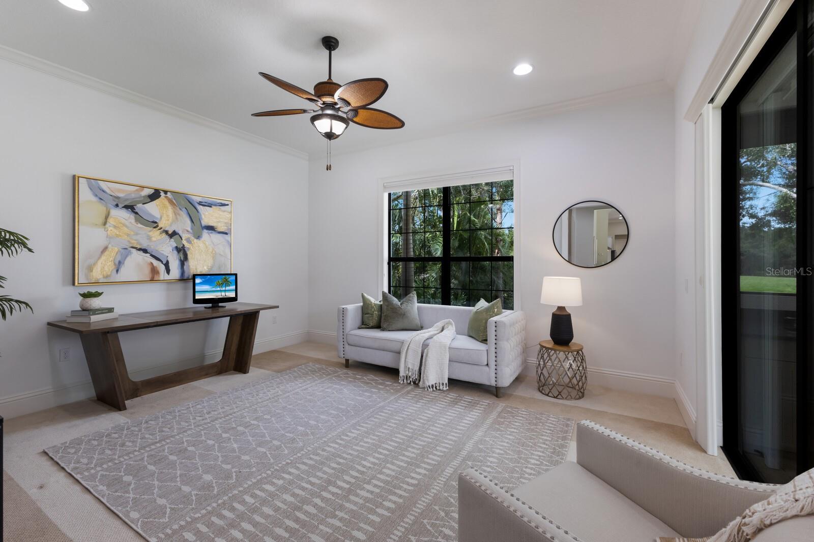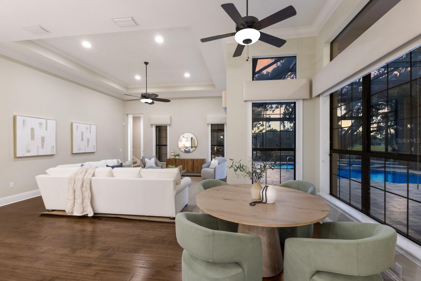 Savor one of the most breathtaking lake, golf, and preserve settings in Lakewood Ranch from this beautifully appointed Westover II model nestled in a serene, private setting on the King's Dunes golf course in The Country Club. The light and bright 3,885 square foot residence custom built by Neal Signature Homes boasts westerly views showcasing perfectly proportioned spaces, exceptional design, newly painted interior and exterior, volume ceilings, engineered wood flooring, and stunning sunsets nightly. The recently installed new panoramic screened lanai cage further accentuates the outdoor living experience, along with the heated pebble tec pool/spa with sun shelf, two separate covered areas, gas fireplace and an outdoor Summer kitchen. The surrounding vistas bring the unmatched optic experience indoors seamlessly via sliding glass doors and a plethora of transom windows, with architectural details and designer touches throughout, including tray ceilings, crown moldings, and trimmings at every turn. An invitingly large great room open to the kitchen where form, function and design reigns cohesively with sprawling granite counters, wood cabinetry, high performance appliances, breakfast bar, a walk-in pantry, and a breakfast nook area adorned with the surrounding views beyond. Off the kitchen is a butler's pantry with a wine fridge connecting to a lovely formal dining area and equally elegant living room infused with natural light.Unwind in the owner's retreat positioned on its own private wing on the main level, offering two walk-in customized closets and a luxuriously appointed spa-like bath with separate vanity stations, stand-alone shower, and a free-standing soaking tub. Family and overnight visitors alike will be right at home with the three additional guest rooms , two on the main level anchored by a full bath, while a third guest room is located upstairs off the home's fourth full bath. On the upper level, there is also an expansive bonus room offering multiple flex living space options boasting some of the most incredible golf views in Lakewood Ranch.Other notable highlights of this all-encompassing 5,351 square foot four bedroom four full bath maintenance free residence includes a perfectly located main level office/den at the rear of the residence with picturesque views just off the pool bath, a generously sized laundry room with sink and cabinetry, hurricane shutters, and an oversized 3-car garage. Within the #1 top-selling master-planned community known for its vibrant lifestyle, dining, shopping, A-rated schools and non-mandatory membership opportunities to become a member of Lakewood Ranch Golf & Country Club, which include four 18-hole championship golf courses, tennis, state-of-the-art Fitness center, clubhouses, junior Olympic-sized pool, pickleball and more.