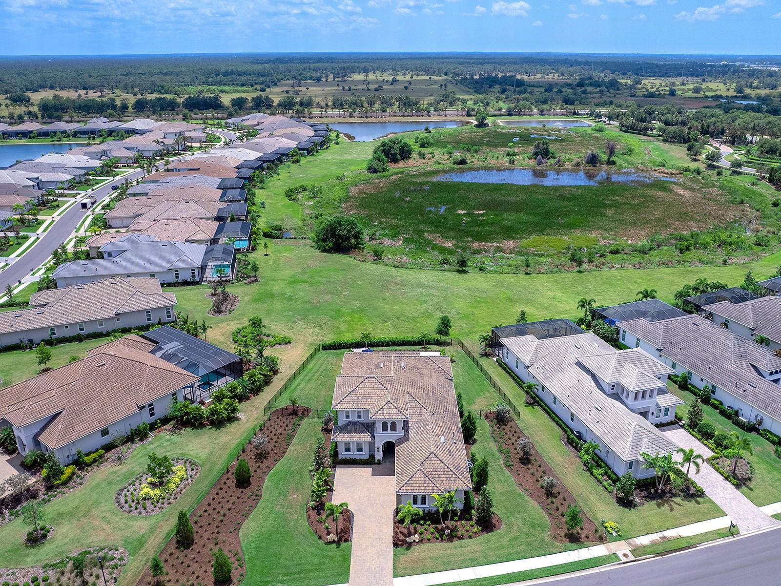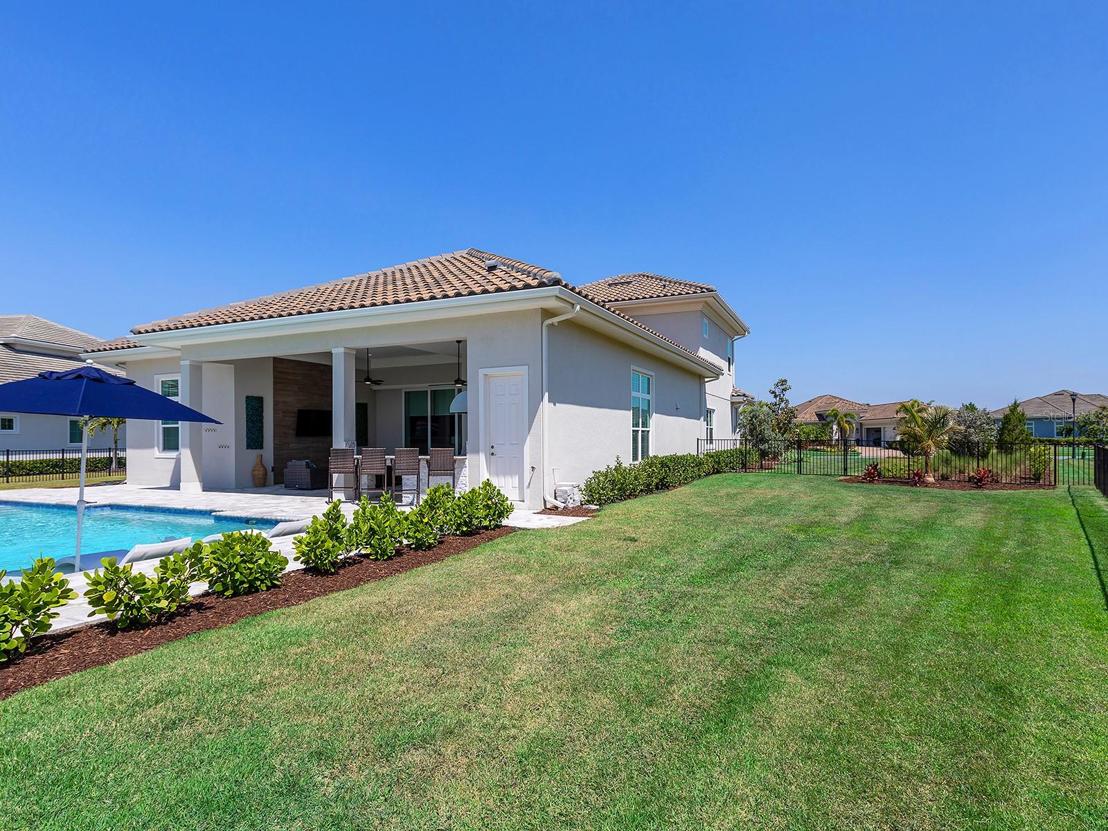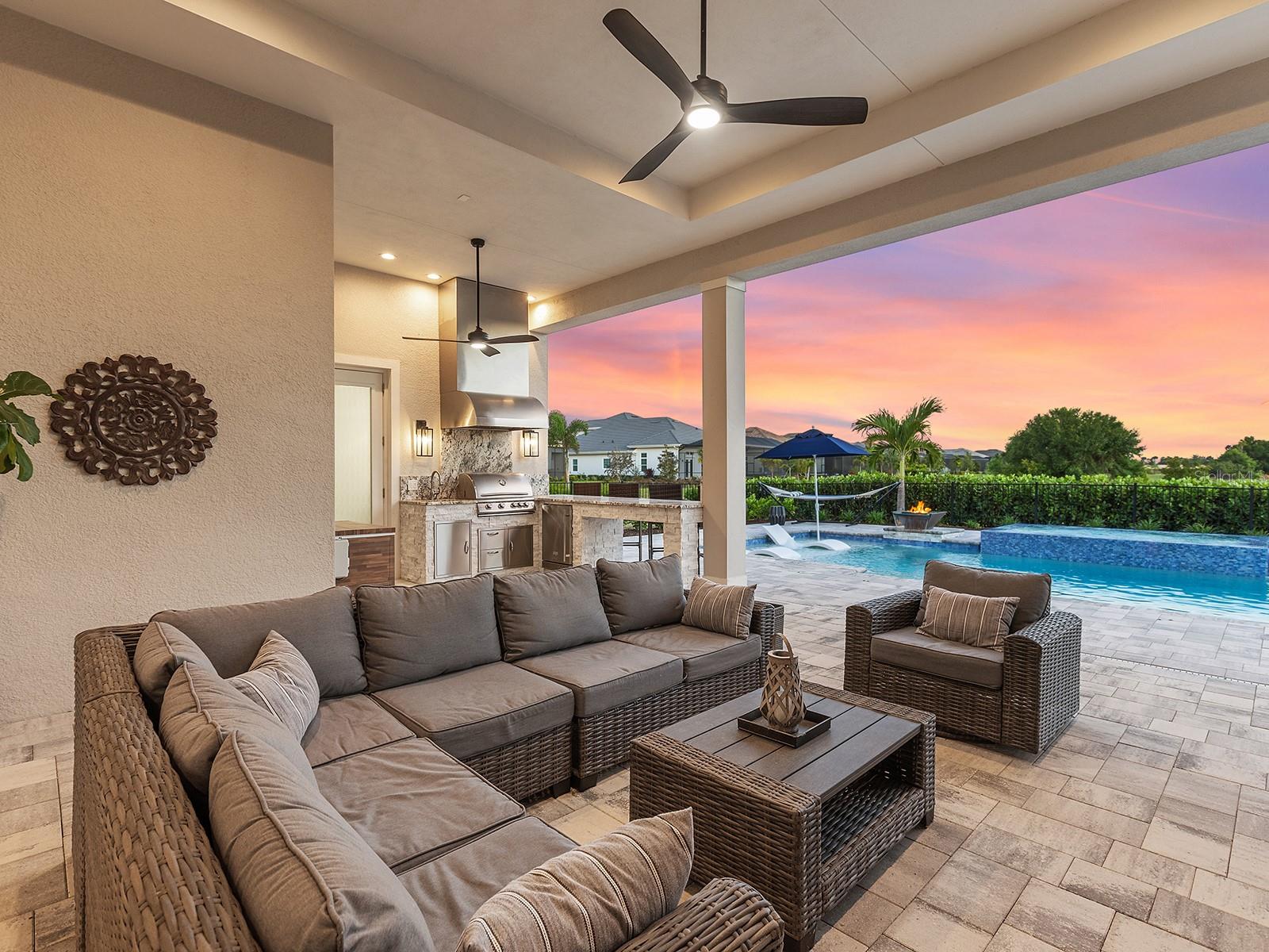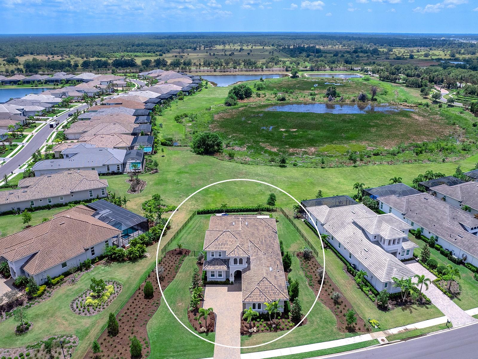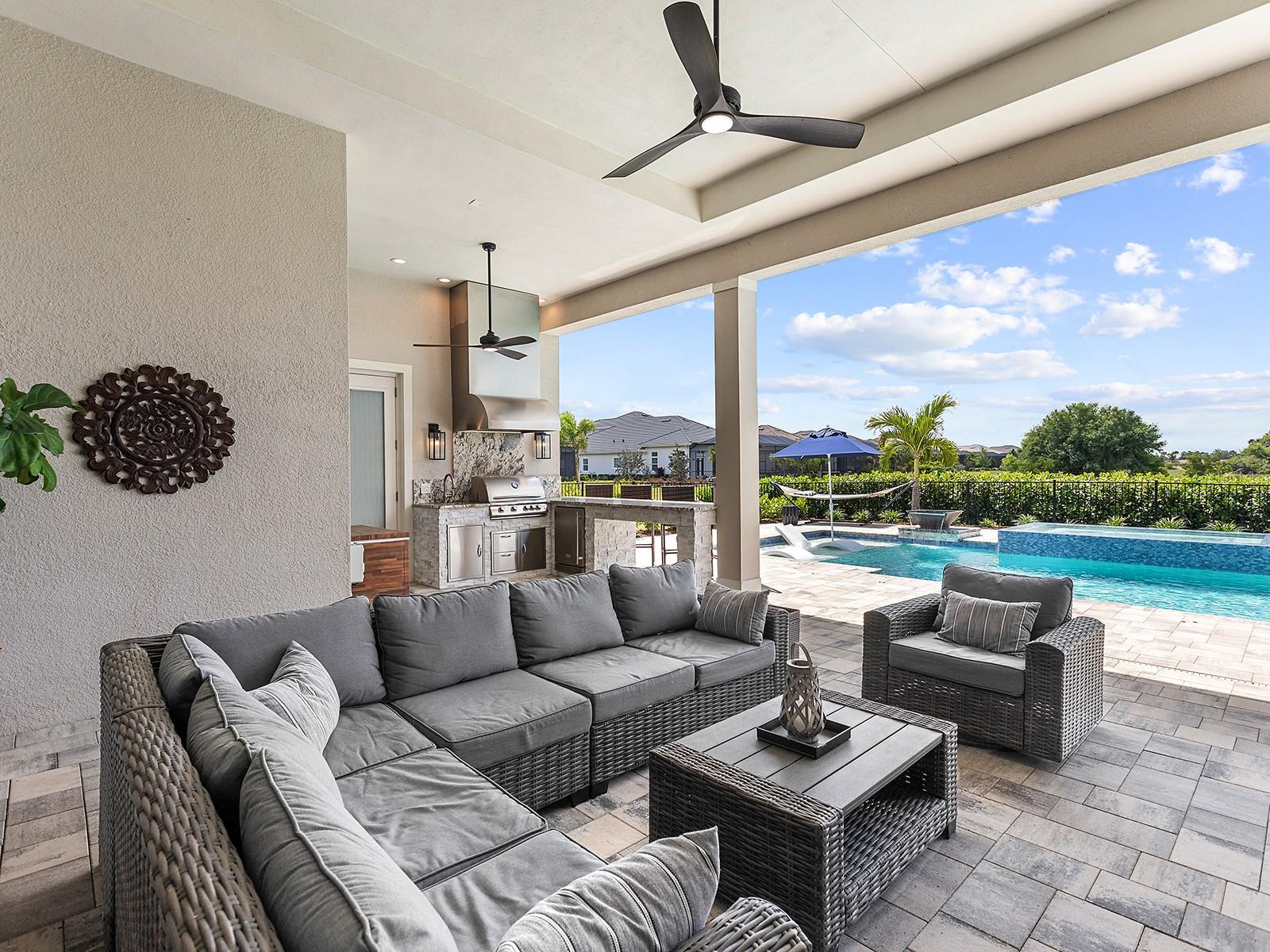 This is an exceptional residence tucked within the gates of Lakewood Ranch's exclusive community, The Lake Club. With its elegant Eaton Grand III floor plan, this 2021-built estate offers effortless luxury. The home's stately curb appeal sets the tone from the moment you arrive, with a side-load three-car garage, oversized paver driveway and manicured landscaping. Step through the front door into a soaring foyer adorned with accent trim, crown molding and a designer chandelier. Throughout the home, rich engineered hardwood flooring, plantation shutters, and sophisticated finishes speak to the care and detail poured into every room. The great room is an expansive space framed by a wallpaper accent wall and a striking linear fireplace with herringbone shiplap and a wood mantel. Pocketing sliders disappear to connect indoor-outdoor living. The kitchen boasts stainless steel KitchenAid appliances, including a five-burner gas cooktop with a statement hood and built-in oven and microwave/convection, granite countertops, stone backsplash and abundant cabinetry with under-cabinet lighting. A generous pantry cabinet, a lazy Susan corner cabinet, and an oversized island create ease for daily routines and entertaining. Just off the kitchen, the dining area is flooded with natural light from two large windows and elevated by a designer chandelier. Secluded in its own wing, the primary suite is a private retreat featuring an alcove entry, shiplap accent walls, a sitting area and two custom walk-in closets with thoughtful built-ins. The en-suite bath is complete with dual vanities, a soaking tub, a walk-in shower and a private water closet. Three additional bedrooms provide comfort and flexibility. One guest suite includes a private bath, while two more share a full bath in a cleverly designed pocketed guest wing. A quiet office, accessible through French doors, offers the perfect space for a home office or library. Upstairs, the loft offers versatile bonus space while an adjacent fitness room, or potential fourth bedroom, features three large windows and a spacious closet. A full bath with quartz-topped vanity and tub/shower completes the upper level. Step out to the lanai and enjoy a covered seating area centered around a custom media wall. The fully equipped summer kitchen includes a built-in Blaze grill, sink, mini refrigerator and granite countertops. The saltwater pool and spa await with blue tile accents, LED lighting, waterfall bowls with fire features and a sun shelf. A dedicated pool bath with quartz vanity and tile floors adds ease, and the included sauna invites relaxation. A brand new pool and lanai screen was installed July 2025. The fenced yard, bordered by mature landscaping, creates peace of mind for pets or children. Additional features include a well-appointed laundry room with granite counters and ample cabinetry, a large storage space under the stairs and a spacious three-car garage. In The Lake Club, residents enjoy access to a wealth of amenities, including two resort-style heated pools, a recently renovated clubhouse with fine dining and bar area, a fitness center, spa, tennis courts, pickleball, a playground, dog park, and services of a full-time concierge and activities director. Additionally, residents are near The Mall at UTC, LWR Main Street, Waterside Place and dining options. Experience luxury living in this home, where every detail has been carefully considered to provide the ultimate Lakewood Ranch lifestyle.