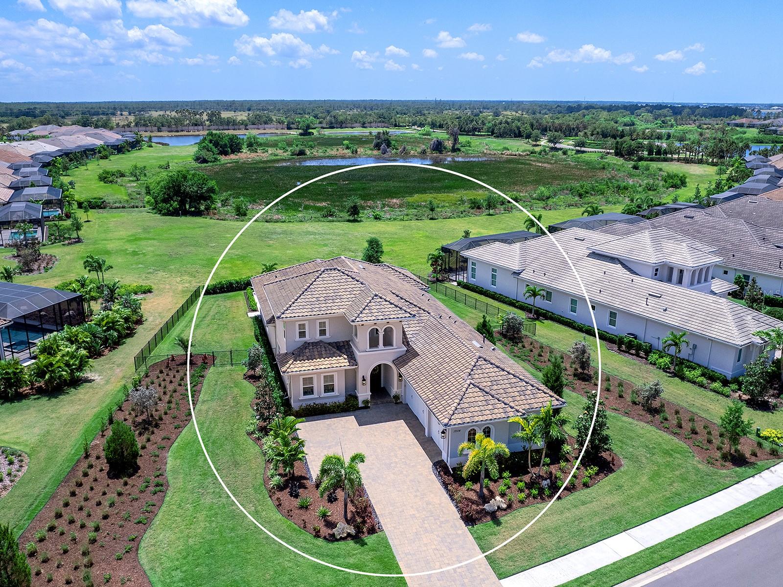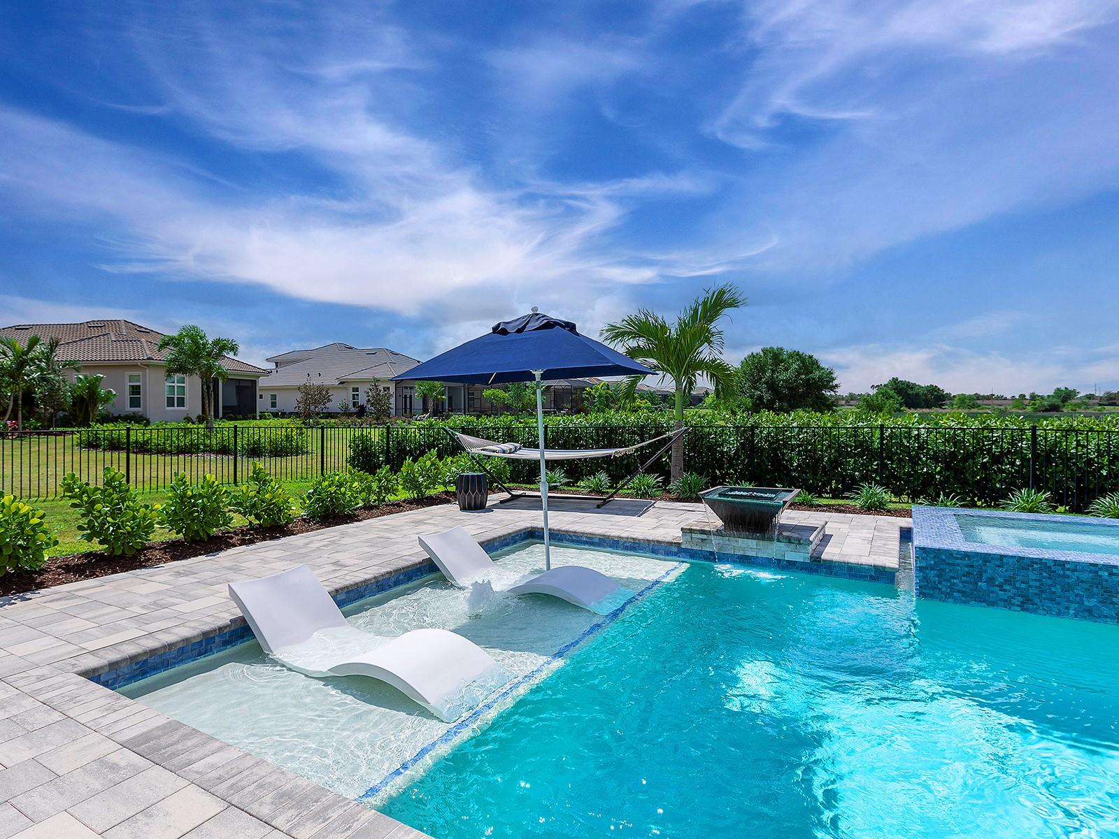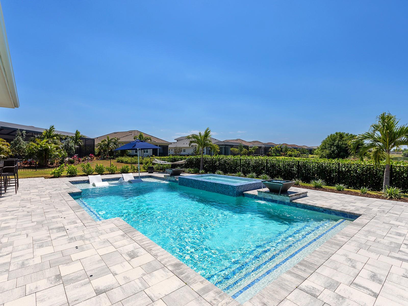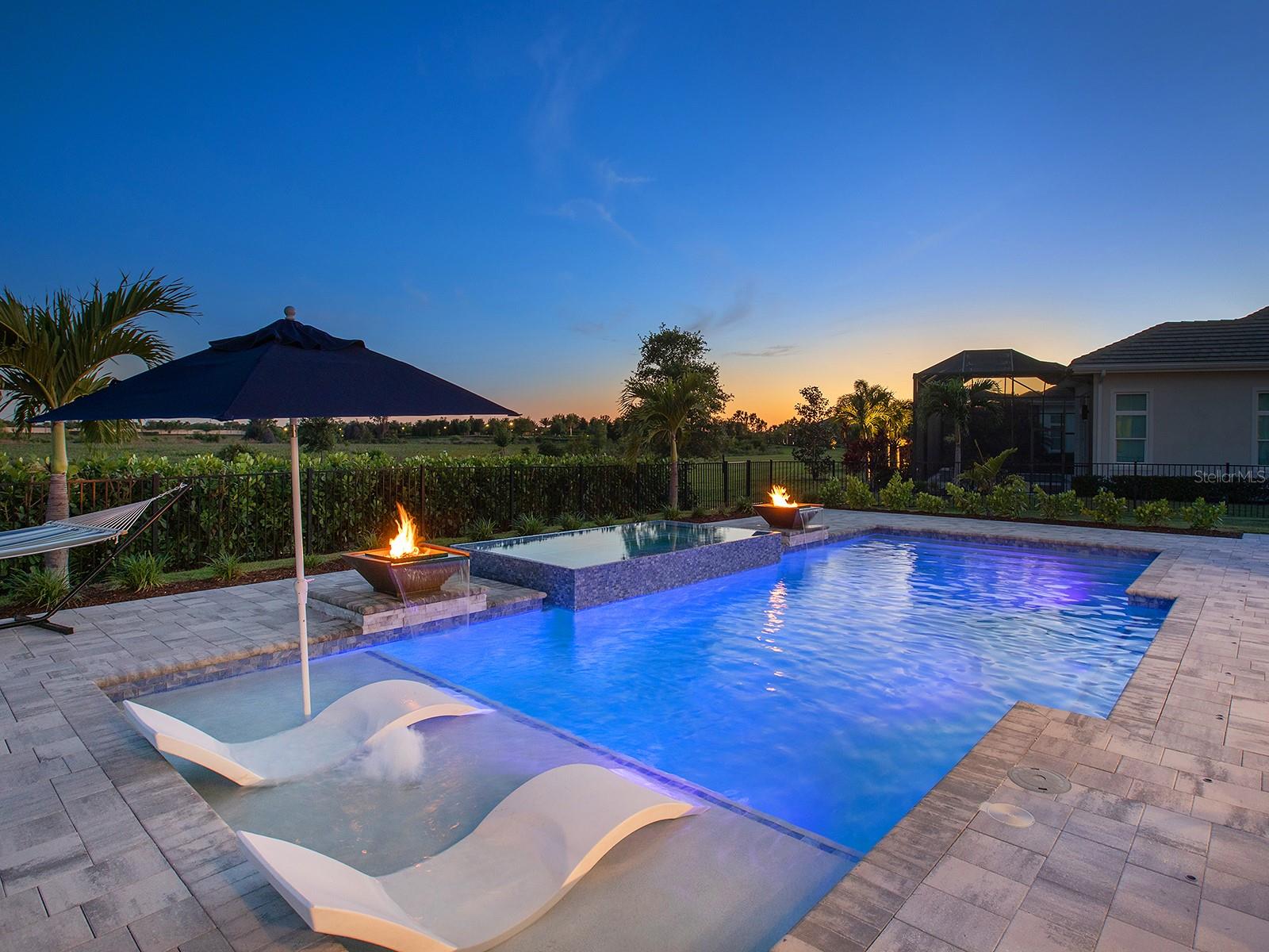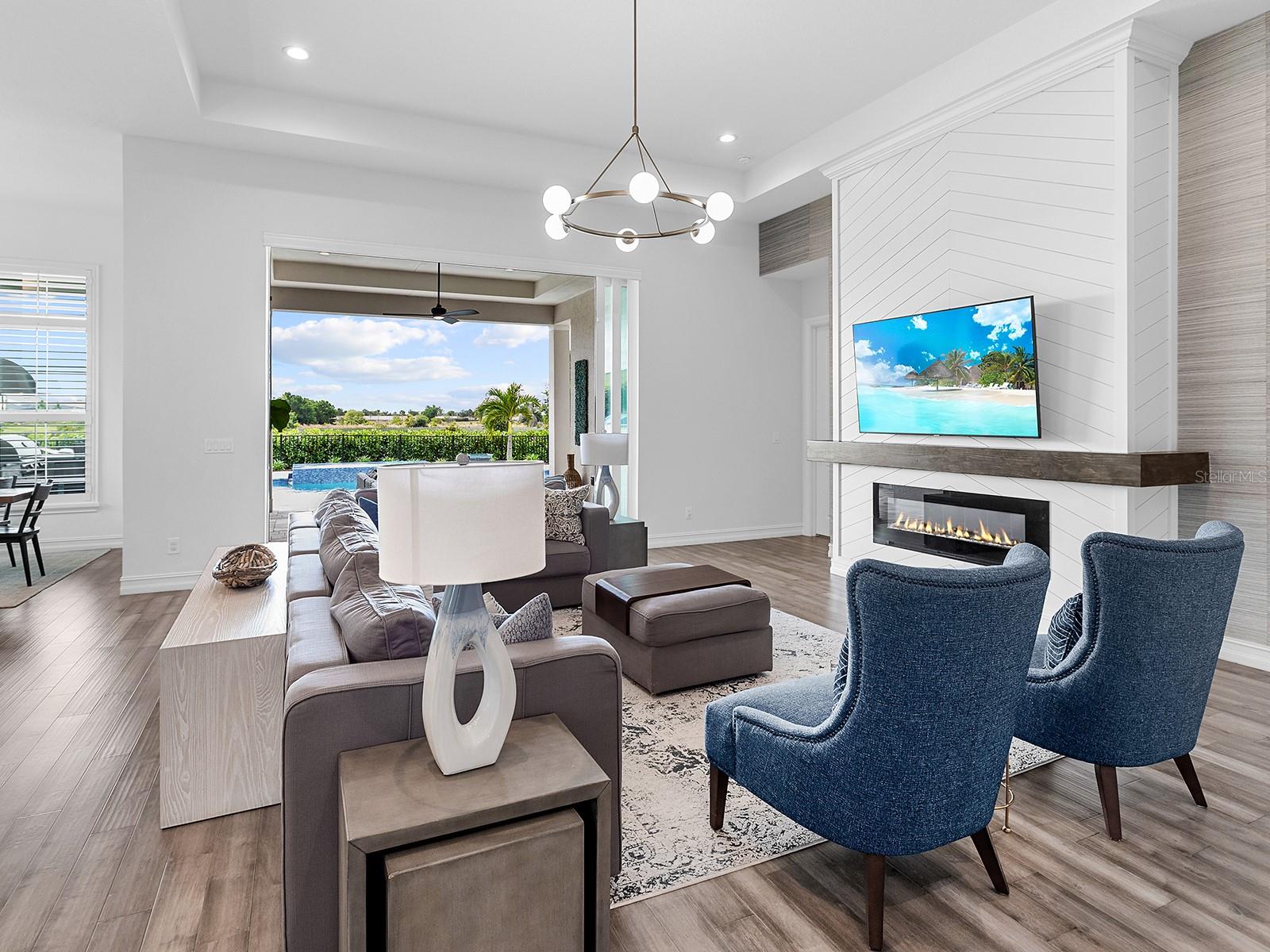 This is an exceptional residence tucked within the gates of Lakewood Ranch's exclusive community, The Lake Club. With its elegant Eaton Grand III floor plan, this 2021-built estate offers effortless luxury. The home's stately curb appeal sets the tone from the moment you arrive, with a side-load three-car garage, oversized paver driveway and manicured landscaping. Step through the front door into a soaring foyer adorned with accent trim, crown molding and a designer chandelier. Throughout the home, rich engineered hardwood flooring, plantation shutters, and sophisticated finishes speak to the care and detail poured into every room. The great room is an expansive space framed by a wallpaper accent wall and a striking linear fireplace with herringbone shiplap and a wood mantel. Pocketing sliders disappear to connect indoor-outdoor living. The kitchen boasts stainless steel KitchenAid appliances, including a five-burner gas cooktop with a statement hood and built-in oven and microwave/convection, granite countertops, stone backsplash and abundant cabinetry with under-cabinet lighting. A generous pantry cabinet, a lazy Susan corner cabinet, and an oversized island create ease for daily routines and entertaining. Just off the kitchen, the dining area is flooded with natural light from two large windows and elevated by a designer chandelier. Secluded in its own wing, the primary suite is a private retreat featuring an alcove entry, shiplap accent walls, a sitting area and two custom walk-in closets with thoughtful built-ins. The en-suite bath is complete with dual vanities, a soaking tub, a walk-in shower and a private water closet. Three additional bedrooms provide comfort and flexibility. One guest suite includes a private bath, while two more share a full bath in a cleverly designed pocketed guest wing. A quiet office, accessible through French doors, offers the perfect space for a home office or library. Upstairs, the loft offers versatile bonus space while an adjacent fitness room, or potential fourth bedroom, features three large windows and a spacious closet. A full bath with quartz-topped vanity and tub/shower completes the upper level. Step out to the lanai and enjoy a covered seating area centered around a custom media wall. The fully equipped summer kitchen includes a built-in Blaze grill, sink, mini refrigerator and granite countertops. The saltwater pool and spa await with blue tile accents, LED lighting, waterfall bowls with fire features and a sun shelf. A dedicated pool bath with quartz vanity and tile floors adds ease, and the included sauna invites relaxation. A brand new pool and lanai screen was installed July 2025. The fenced yard, bordered by mature landscaping, creates peace of mind for pets or children. Additional features include a well-appointed laundry room with granite counters and ample cabinetry, a large storage space under the stairs and a spacious three-car garage. In The Lake Club, residents enjoy access to a wealth of amenities, including two resort-style heated pools, a recently renovated clubhouse with fine dining and bar area, a fitness center, spa, tennis courts, pickleball, a playground, dog park, and services of a full-time concierge and activities director. Additionally, residents are near The Mall at UTC, LWR Main Street, Waterside Place and dining options. Experience luxury living in this home, where every detail has been carefully considered to provide the ultimate Lakewood Ranch lifestyle.