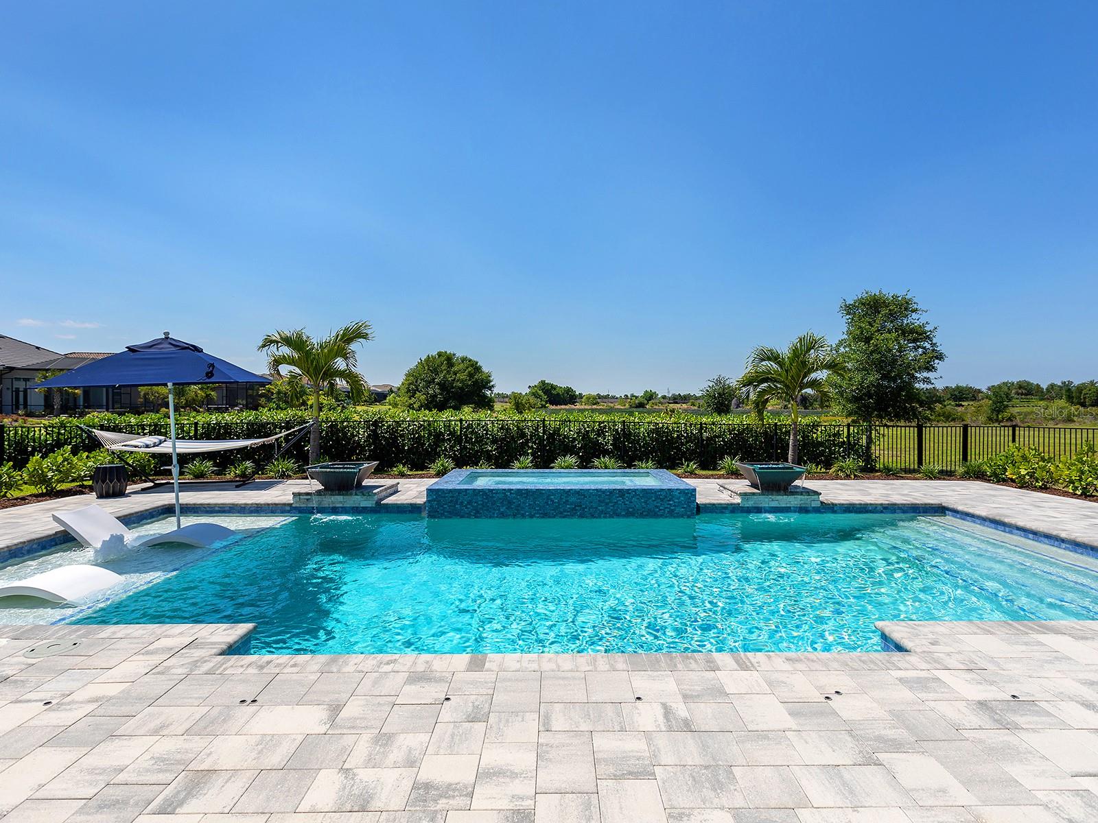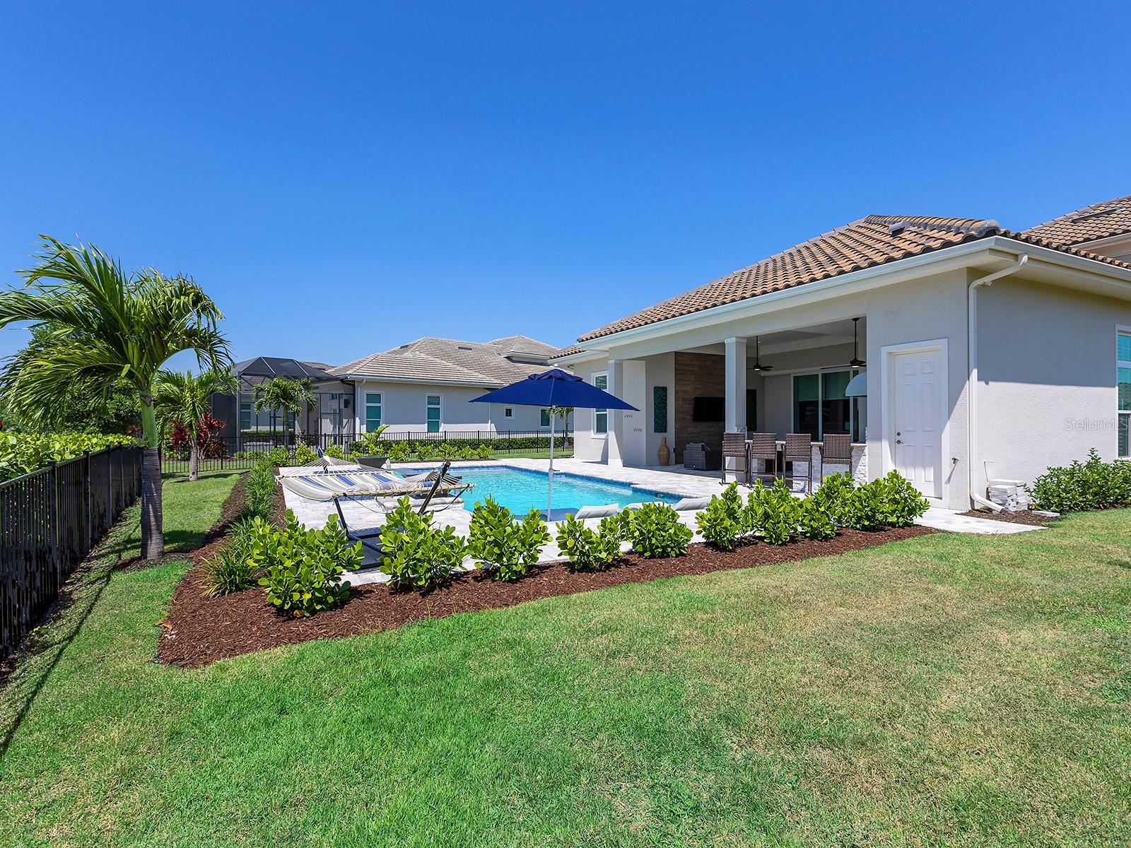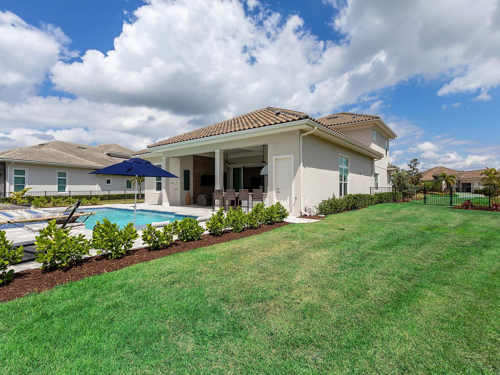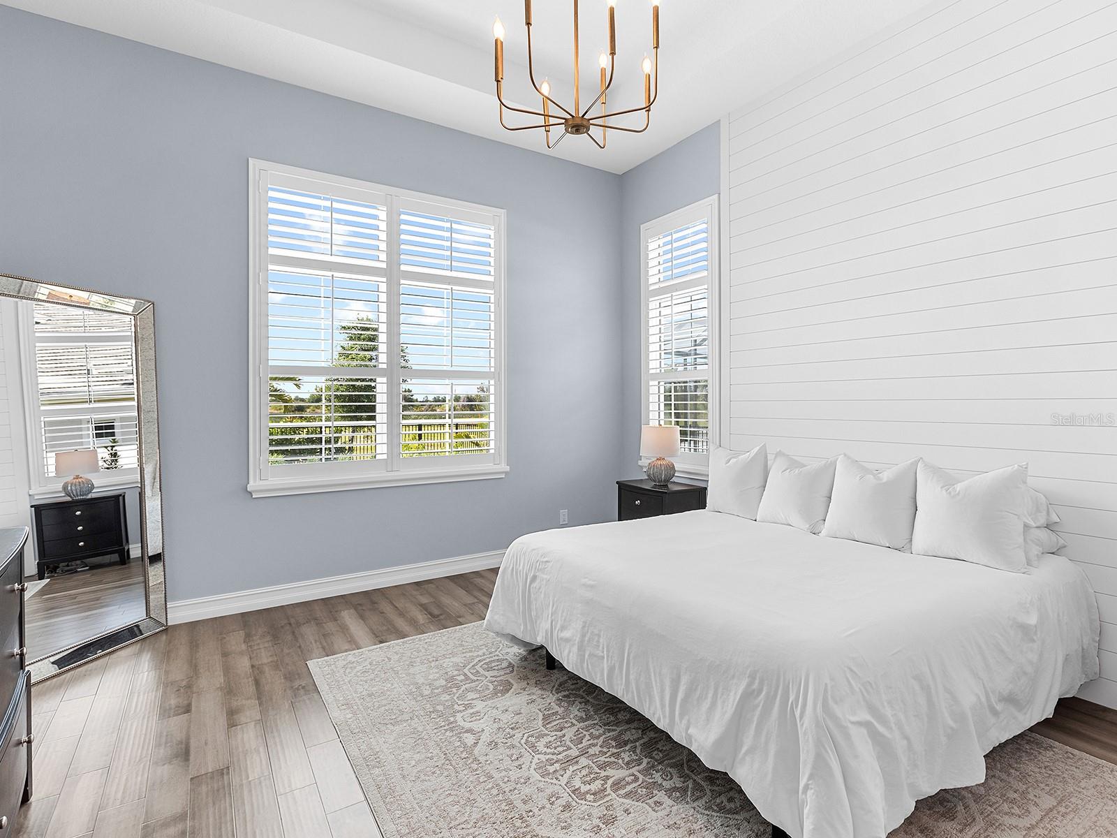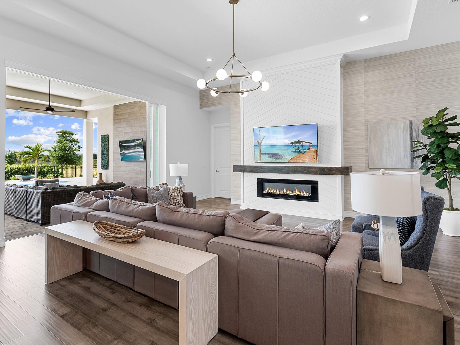 This is an exceptional residence tucked within the gates of Lakewood Ranch's exclusive community, The Lake Club. With its elegant Eaton Grand III floor plan, this 2021-built estate offers effortless luxury. The home's stately curb appeal sets the tone from the moment you arrive, with a side-load three-car garage, oversized paver driveway and manicured landscaping. Step through the front door into a soaring foyer adorned with accent trim, crown molding and a designer chandelier. Throughout the home, rich engineered hardwood flooring, plantation shutters, and sophisticated finishes speak to the care and detail poured into every room. The great room is an expansive space framed by a wallpaper accent wall and a striking linear fireplace with herringbone shiplap and a wood mantel. Pocketing sliders disappear to connect indoor-outdoor living. The kitchen boasts stainless steel KitchenAid appliances, including a five-burner gas cooktop with a statement hood and built-in oven and microwave/convection, granite countertops, stone backsplash and abundant cabinetry with under-cabinet lighting. A generous pantry cabinet, a lazy Susan corner cabinet, and an oversized island create ease for daily routines and entertaining. Just off the kitchen, the dining area is flooded with natural light from two large windows and elevated by a designer chandelier. Secluded in its own wing, the primary suite is a private retreat featuring an alcove entry, shiplap accent walls, a sitting area and two custom walk-in closets with thoughtful built-ins. The en-suite bath is complete with dual vanities, a soaking tub, a walk-in shower and a private water closet. Three additional bedrooms provide comfort and flexibility. One guest suite includes a private bath, while two more share a full bath in a cleverly designed pocketed guest wing. A quiet office, accessible through French doors, offers the perfect space for a home office or library. Upstairs, the loft offers versatile bonus space while an adjacent fitness room, or potential fourth bedroom, features three large windows and a spacious closet. A full bath with quartz-topped vanity and tub/shower completes the upper level. Step out to the lanai and enjoy a covered seating area centered around a custom media wall. The fully equipped summer kitchen includes a built-in Blaze grill, sink, mini refrigerator and granite countertops. The saltwater pool and spa await with blue tile accents, LED lighting, waterfall bowls with fire features and a sun shelf. A dedicated pool bath with quartz vanity and tile floors adds ease, and the included sauna invites relaxation. A brand new pool and lanai screen was installed July 2025. The fenced yard, bordered by mature landscaping, creates peace of mind for pets or children. Additional features include a well-appointed laundry room with granite counters and ample cabinetry, a large storage space under the stairs and a spacious three-car garage. In The Lake Club, residents enjoy access to a wealth of amenities, including two resort-style heated pools, a recently renovated clubhouse with fine dining and bar area, a fitness center, spa, tennis courts, pickleball, a playground, dog park, and services of a full-time concierge and activities director. Additionally, residents are near The Mall at UTC, LWR Main Street, Waterside Place and dining options. Experience luxury living in this home, where every detail has been carefully considered to provide the ultimate Lakewood Ranch lifestyle.