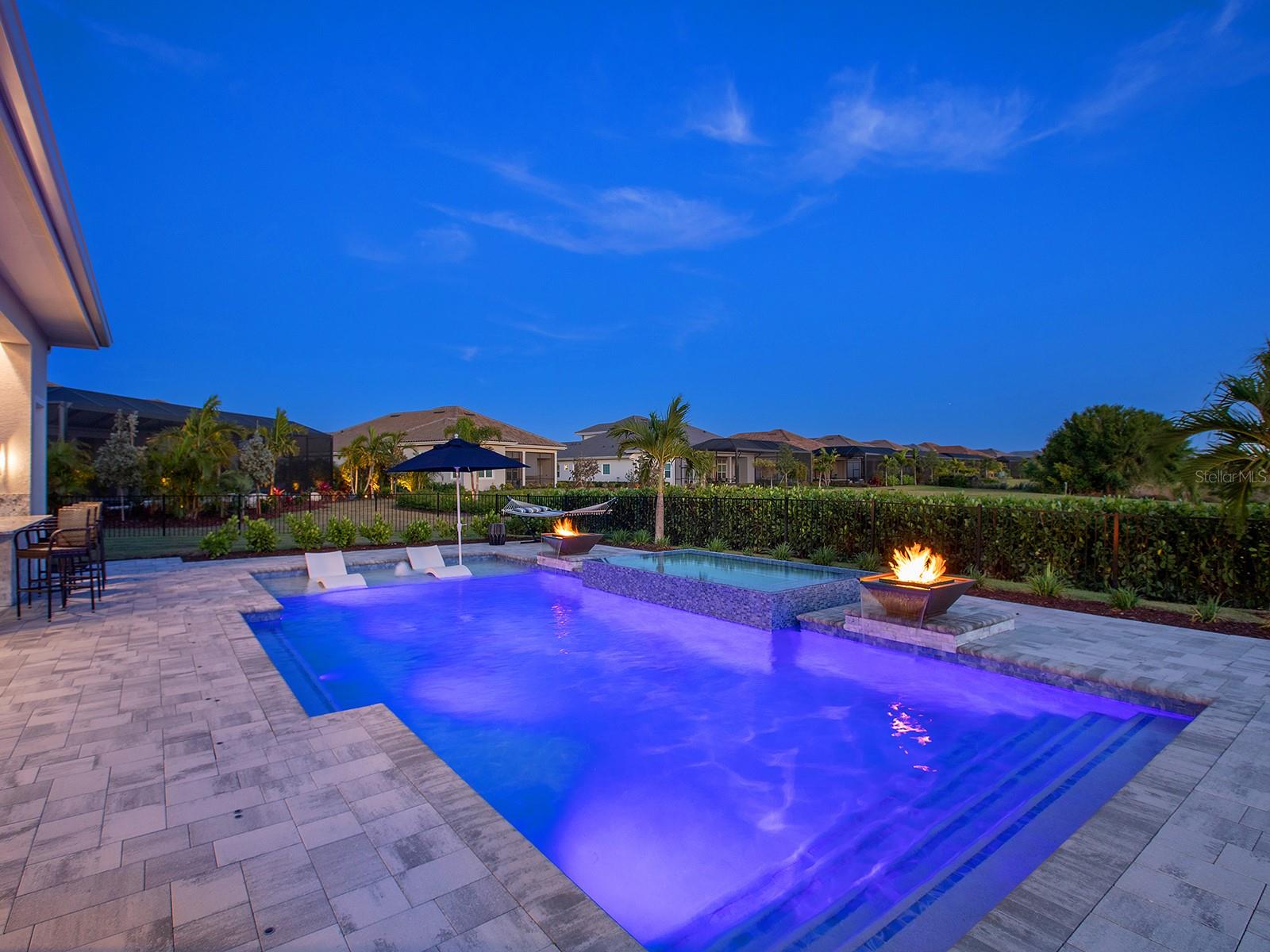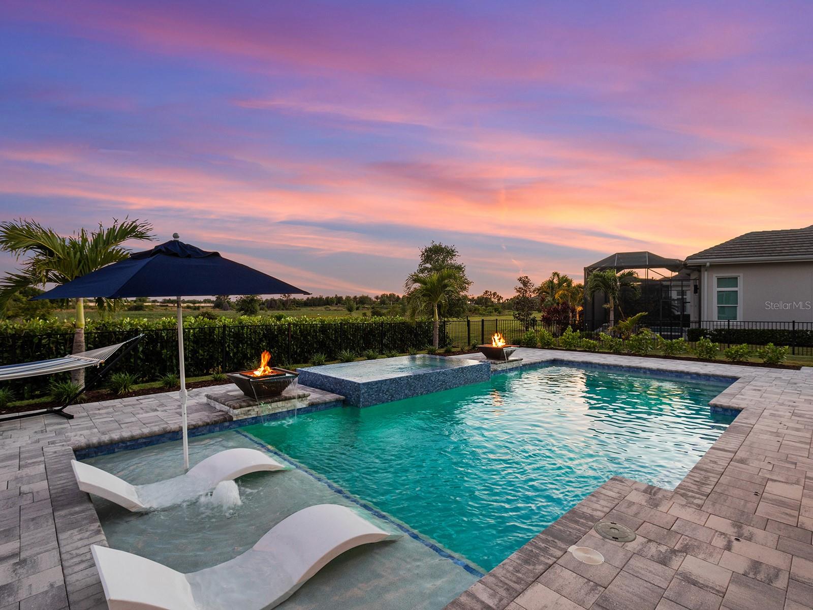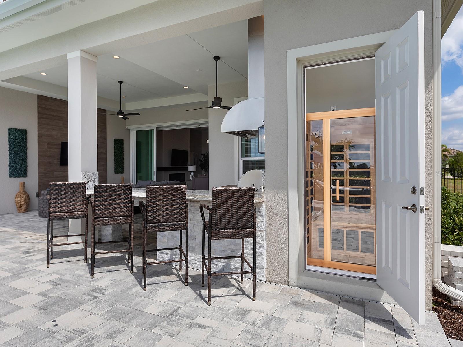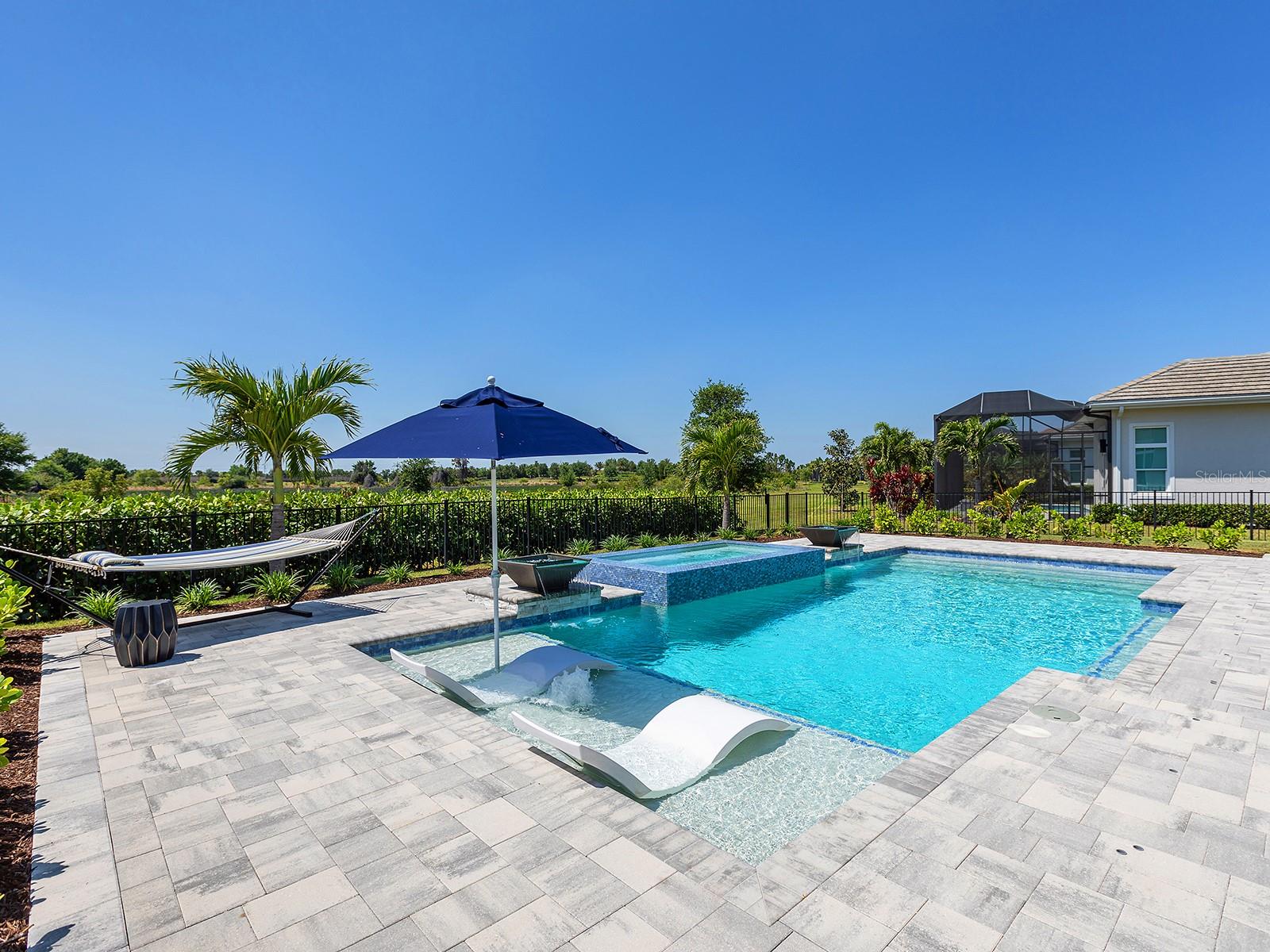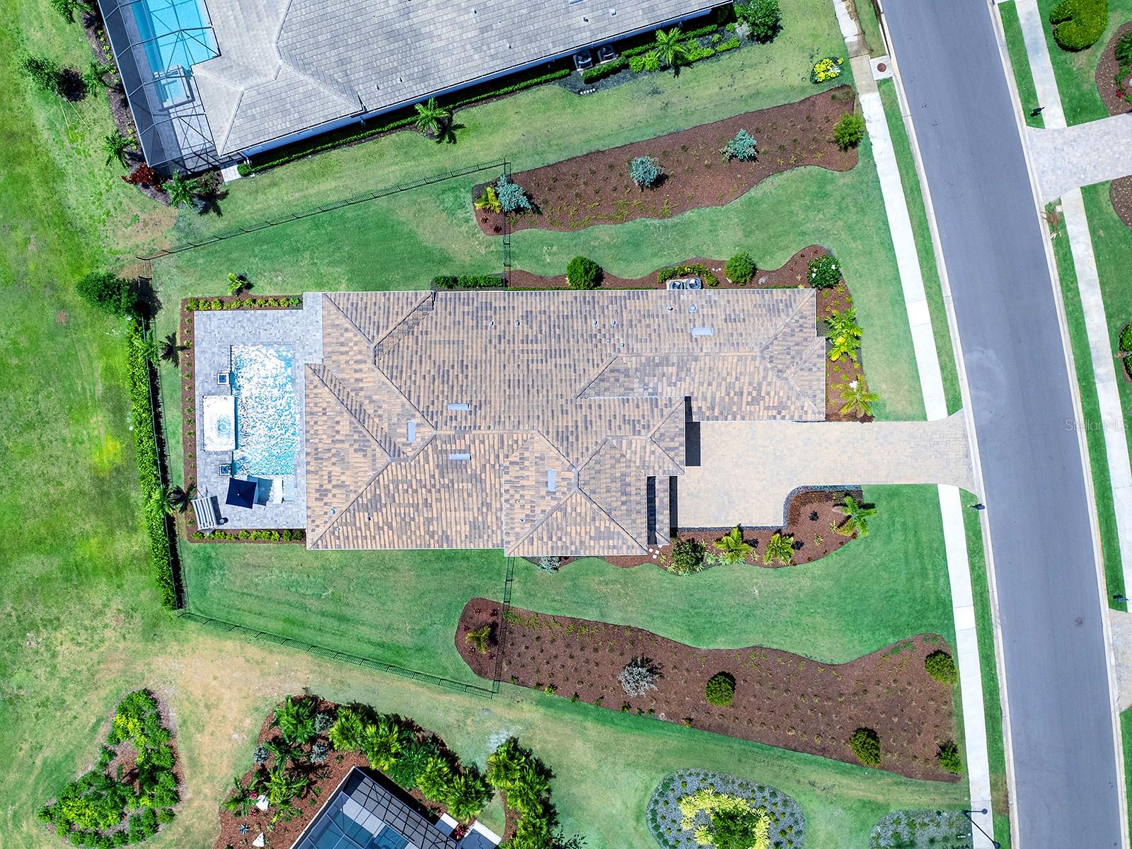 This is an exceptional residence tucked within the gates of Lakewood Ranch's exclusive community, The Lake Club. With its elegant Eaton Grand III floor plan, this 2021-built estate offers effortless luxury. The home's stately curb appeal sets the tone from the moment you arrive, with a side-load three-car garage, oversized paver driveway and manicured landscaping. Step through the front door into a soaring foyer adorned with accent trim, crown molding and a designer chandelier. Throughout the home, rich engineered hardwood flooring, plantation shutters, and sophisticated finishes speak to the care and detail poured into every room. The great room is an expansive space framed by a wallpaper accent wall and a striking linear fireplace with herringbone shiplap and a wood mantel. Pocketing sliders disappear to connect indoor-outdoor living. The kitchen boasts stainless steel KitchenAid appliances, including a five-burner gas cooktop with a statement hood and built-in oven and microwave/convection, granite countertops, stone backsplash and abundant cabinetry with under-cabinet lighting. A generous pantry cabinet, a lazy Susan corner cabinet, and an oversized island create ease for daily routines and entertaining. Just off the kitchen, the dining area is flooded with natural light from two large windows and elevated by a designer chandelier. Secluded in its own wing, the primary suite is a private retreat featuring an alcove entry, shiplap accent walls, a sitting area and two custom walk-in closets with thoughtful built-ins. The en-suite bath is complete with dual vanities, a soaking tub, a walk-in shower and a private water closet. Three additional bedrooms provide comfort and flexibility. One guest suite includes a private bath, while two more share a full bath in a cleverly designed pocketed guest wing. A quiet office, accessible through French doors, offers the perfect space for a home office or library. Upstairs, the loft offers versatile bonus space while an adjacent fitness room, or potential fourth bedroom, features three large windows and a spacious closet. A full bath with quartz-topped vanity and tub/shower completes the upper level. Step out to the lanai and enjoy a covered seating area centered around a custom media wall. The fully equipped summer kitchen includes a built-in Blaze grill, sink, mini refrigerator and granite countertops. The saltwater pool and spa await with blue tile accents, LED lighting, waterfall bowls with fire features and a sun shelf. A dedicated pool bath with quartz vanity and tile floors adds ease, and the included sauna invites relaxation. A brand new pool and lanai screen was installed July 2025. The fenced yard, bordered by mature landscaping, creates peace of mind for pets or children. Additional features include a well-appointed laundry room with granite counters and ample cabinetry, a large storage space under the stairs and a spacious three-car garage. In The Lake Club, residents enjoy access to a wealth of amenities, including two resort-style heated pools, a recently renovated clubhouse with fine dining and bar area, a fitness center, spa, tennis courts, pickleball, a playground, dog park, and services of a full-time concierge and activities director. Additionally, residents are near The Mall at UTC, LWR Main Street, Waterside Place and dining options. Experience luxury living in this home, where every detail has been carefully considered to provide the ultimate Lakewood Ranch lifestyle.