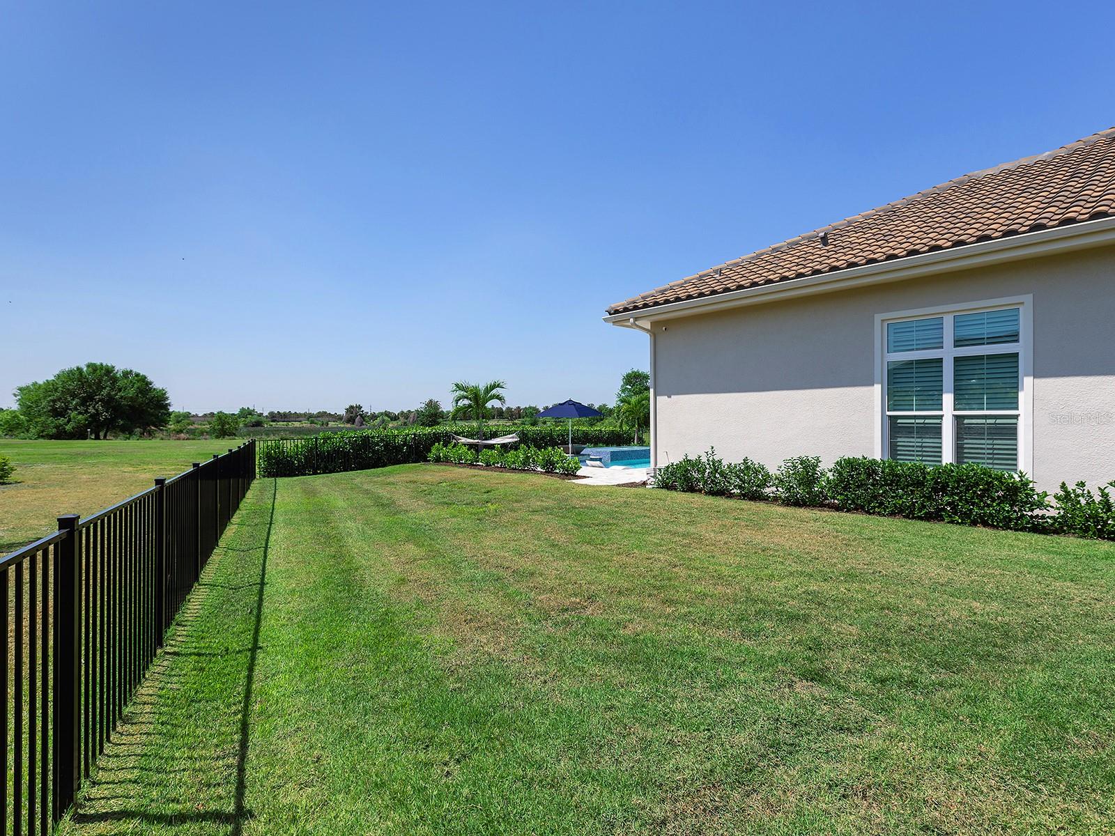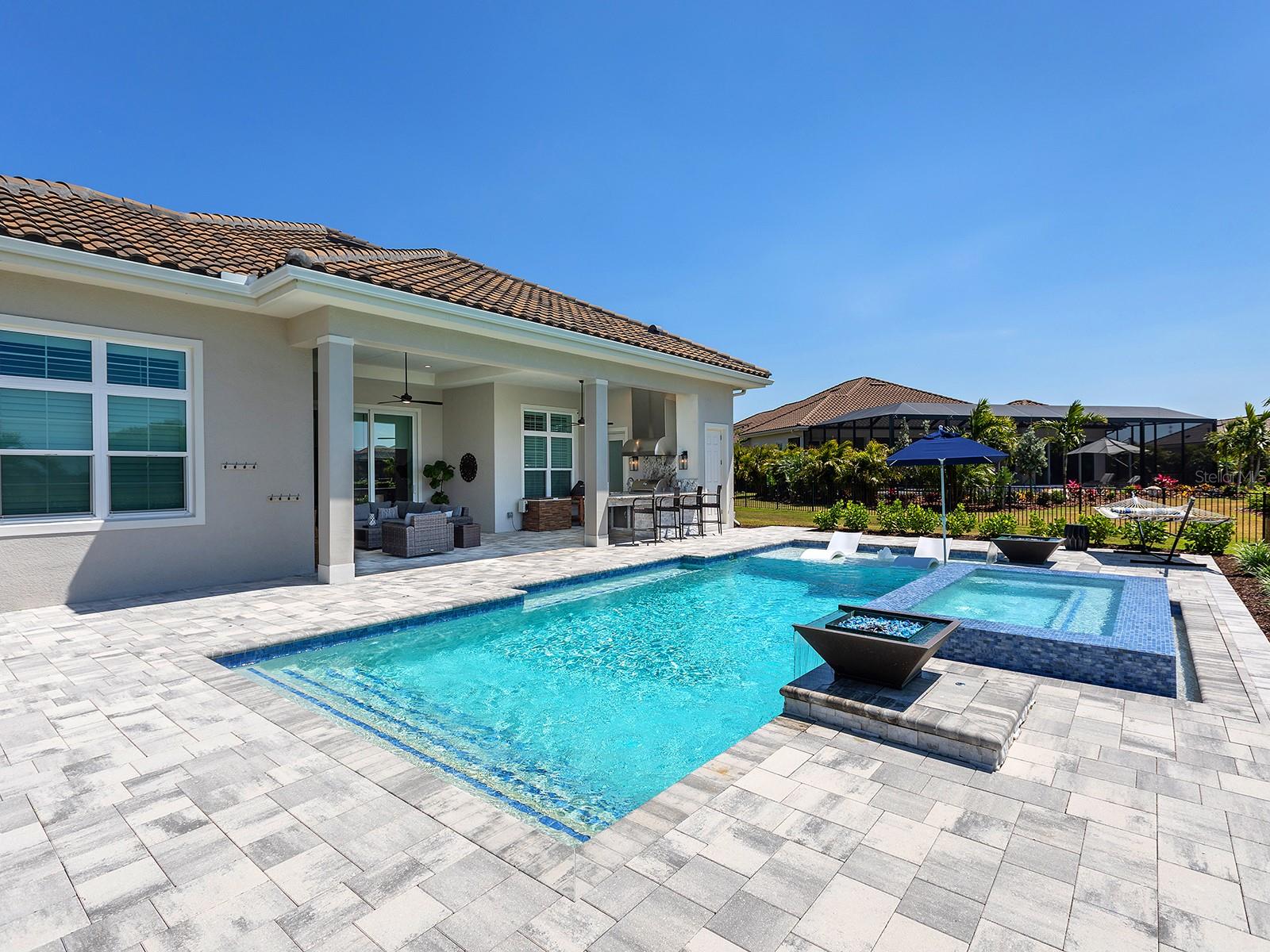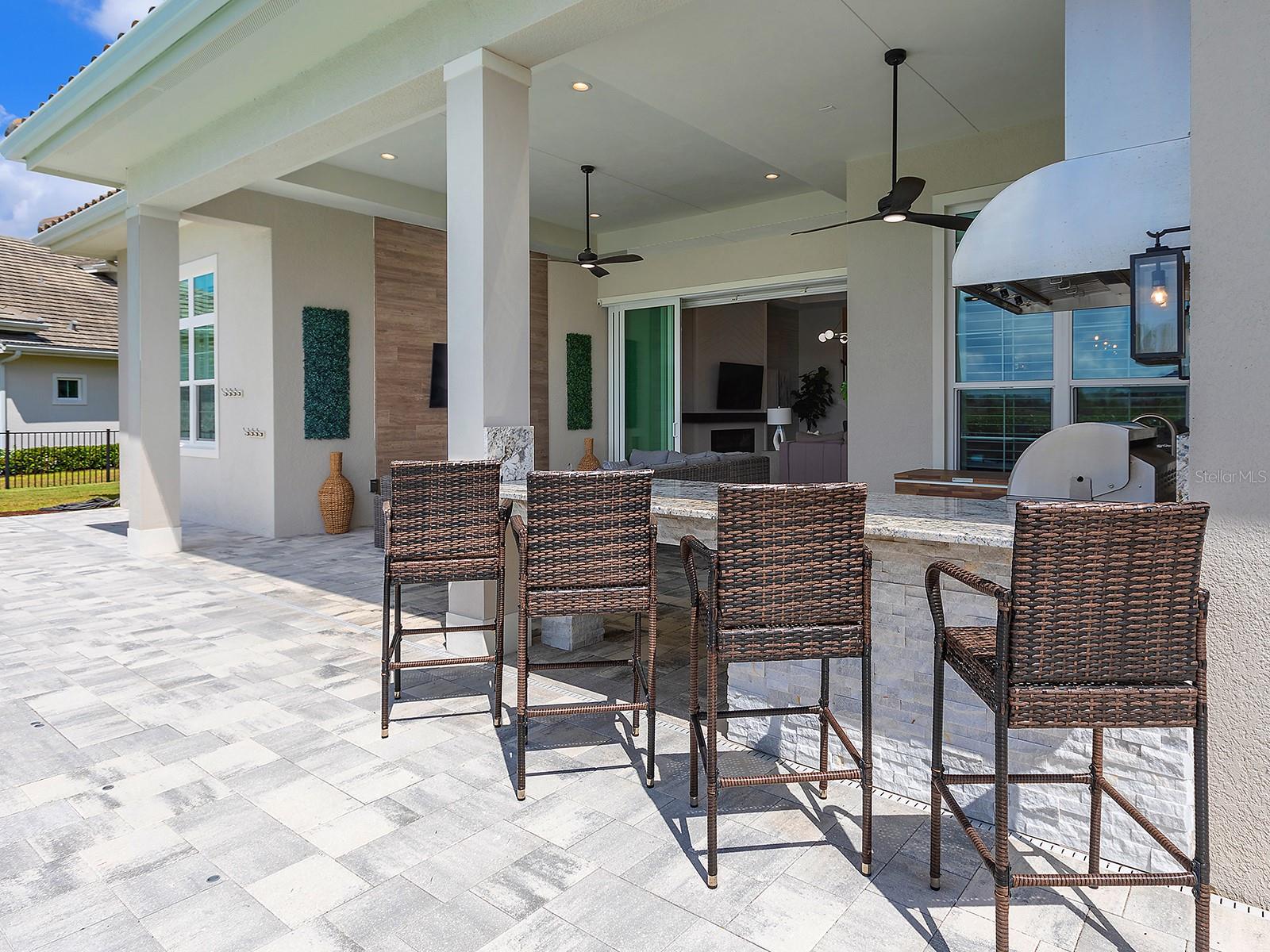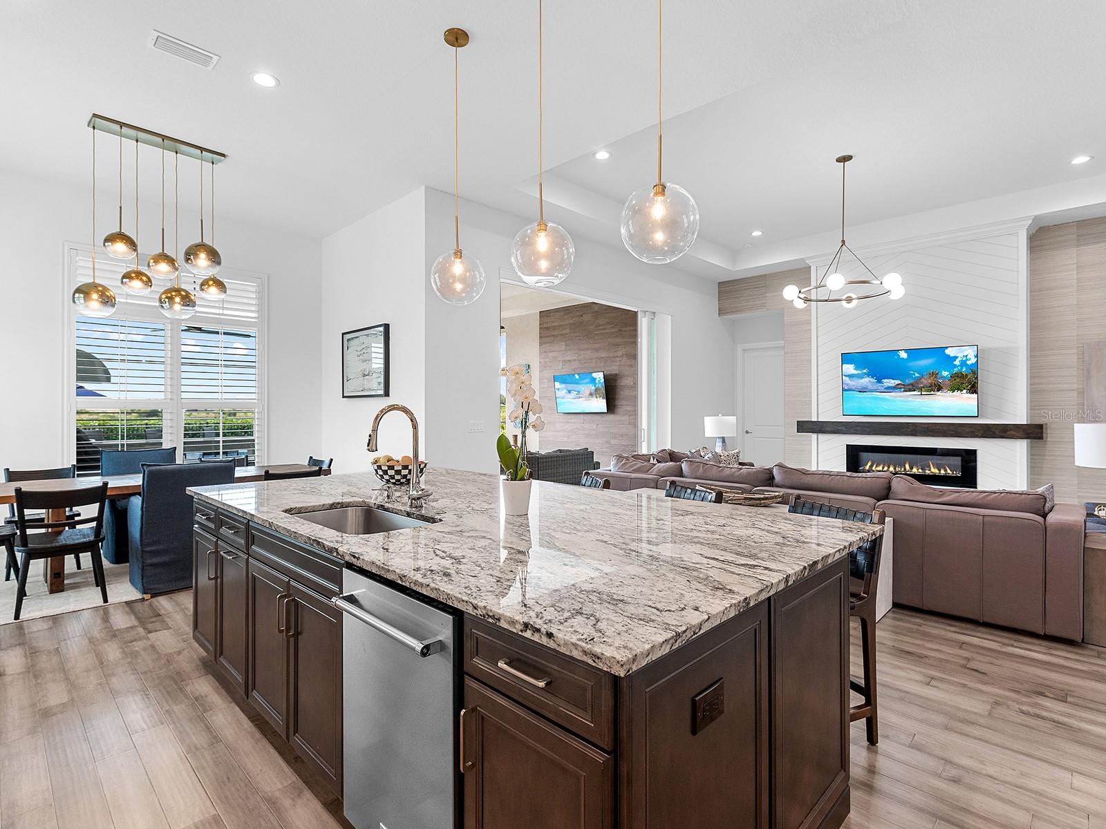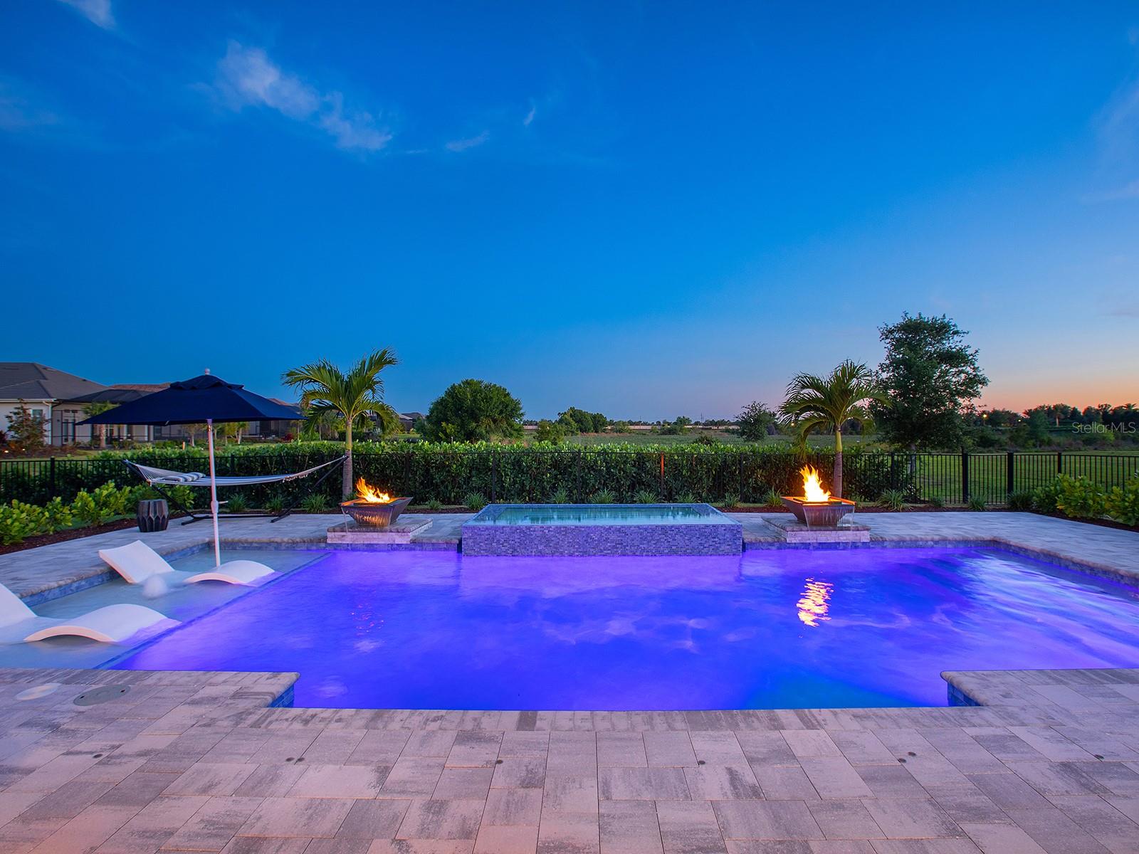 This is an exceptional residence tucked within the gates of Lakewood Ranch's exclusive community, The Lake Club. With its elegant Eaton Grand III floor plan, this 2021-built estate offers effortless luxury. The home's stately curb appeal sets the tone from the moment you arrive, with a side-load three-car garage, oversized paver driveway and manicured landscaping. Step through the front door into a soaring foyer adorned with accent trim, crown molding and a designer chandelier. Throughout the home, rich engineered hardwood flooring, plantation shutters, and sophisticated finishes speak to the care and detail poured into every room. The great room is an expansive space framed by a wallpaper accent wall and a striking linear fireplace with herringbone shiplap and a wood mantel. Pocketing sliders disappear to connect indoor-outdoor living. The kitchen boasts stainless steel KitchenAid appliances, including a five-burner gas cooktop with a statement hood and built-in oven and microwave/convection, granite countertops, stone backsplash and abundant cabinetry with under-cabinet lighting. A generous pantry cabinet, a lazy Susan corner cabinet, and an oversized island create ease for daily routines and entertaining. Just off the kitchen, the dining area is flooded with natural light from two large windows and elevated by a designer chandelier. Secluded in its own wing, the primary suite is a private retreat featuring an alcove entry, shiplap accent walls, a sitting area and two custom walk-in closets with thoughtful built-ins. The en-suite bath is complete with dual vanities, a soaking tub, a walk-in shower and a private water closet. Three additional bedrooms provide comfort and flexibility. One guest suite includes a private bath, while two more share a full bath in a cleverly designed pocketed guest wing. A quiet office, accessible through French doors, offers the perfect space for a home office or library. Upstairs, the loft offers versatile bonus space while an adjacent fitness room, or potential fourth bedroom, features three large windows and a spacious closet. A full bath with quartz-topped vanity and tub/shower completes the upper level. Step out to the lanai and enjoy a covered seating area centered around a custom media wall. The fully equipped summer kitchen includes a built-in Blaze grill, sink, mini refrigerator and granite countertops. The saltwater pool and spa await with blue tile accents, LED lighting, waterfall bowls with fire features and a sun shelf. A dedicated pool bath with quartz vanity and tile floors adds ease, and the included sauna invites relaxation. A brand new pool and lanai screen was installed July 2025. The fenced yard, bordered by mature landscaping, creates peace of mind for pets or children. Additional features include a well-appointed laundry room with granite counters and ample cabinetry, a large storage space under the stairs and a spacious three-car garage. In The Lake Club, residents enjoy access to a wealth of amenities, including two resort-style heated pools, a recently renovated clubhouse with fine dining and bar area, a fitness center, spa, tennis courts, pickleball, a playground, dog park, and services of a full-time concierge and activities director. Additionally, residents are near The Mall at UTC, LWR Main Street, Waterside Place and dining options. Experience luxury living in this home, where every detail has been carefully considered to provide the ultimate Lakewood Ranch lifestyle.